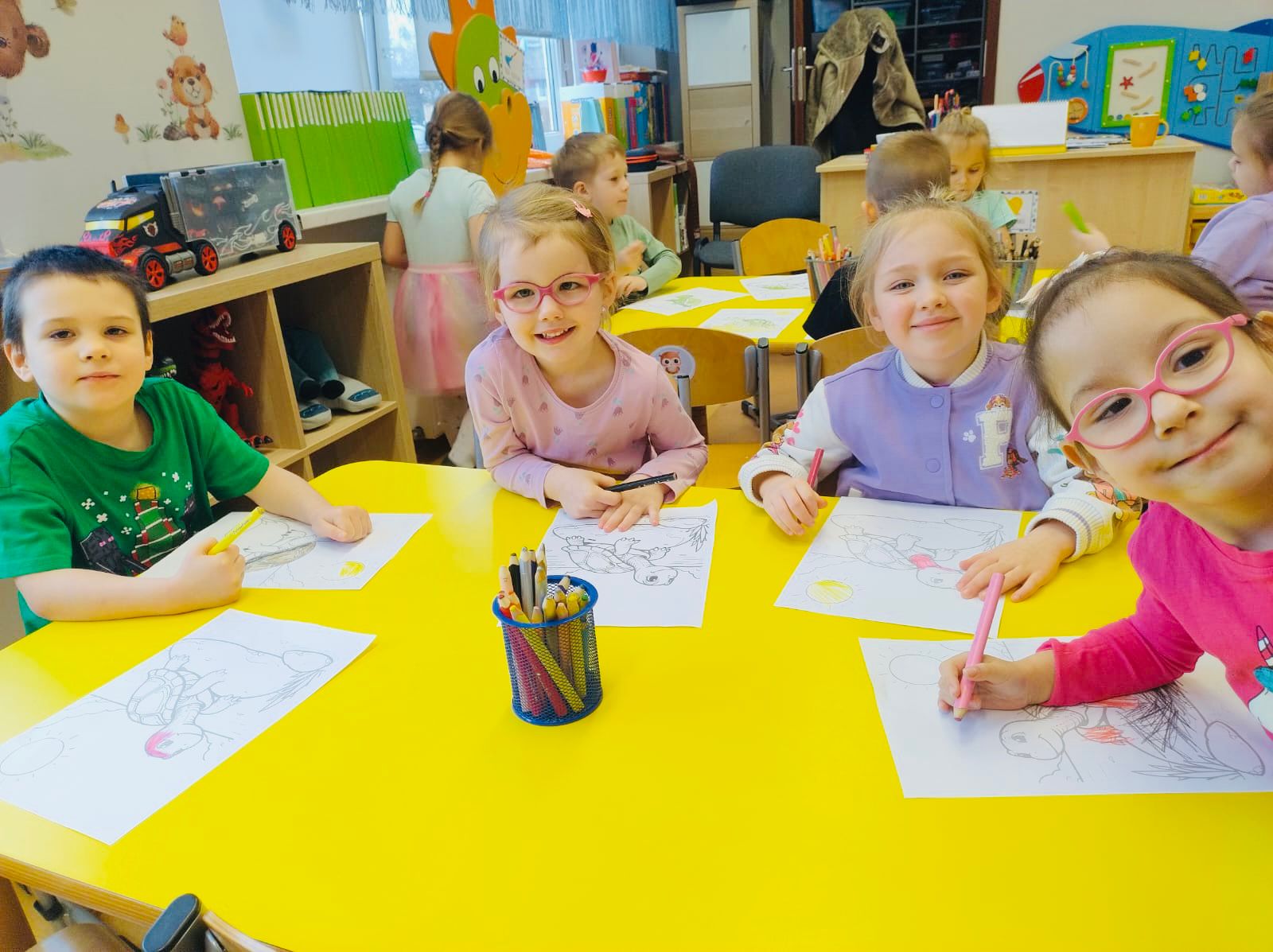 Dziś dzieci z gr. XI i XII uczestniczyły w niezwykle interesującym spotkaniu. Co sprawiło, że akurat ten czas okazał się tak nietuzinkowy? Goście! Tata naszego Antosia postanowił pochwalić się nam swoją niesamowitą pasją, którą są żółwie. Ma ich aż 7! Te, które przyjechały z nim do naszego przedszkola okazały się bardzo ciekawskie i towarzyskie, a swoje korzenie mają w najdalszych zakątkach Ziemi, m.in. w Indiach. Pan Damian opowiedział przedszkolakom, jak opiekuje się żółwiami, gdzie na co dzień mieszkają, co jedzą, czy wolą środowisko lądowe, czy wodne i dlaczego w terrarium mają lampy. Te i wiele innych ciekawostek wzbogaciły wiedzę dzieci o otaczającym nas świecie, a przy okazji przedszkolaki doświadczyły prawdziwej lekcji empatii do żywych stworzeń. Serdecznie dziękujemy Panu Damianowi za zorganizowanie nam niezapomnianych zajęć.