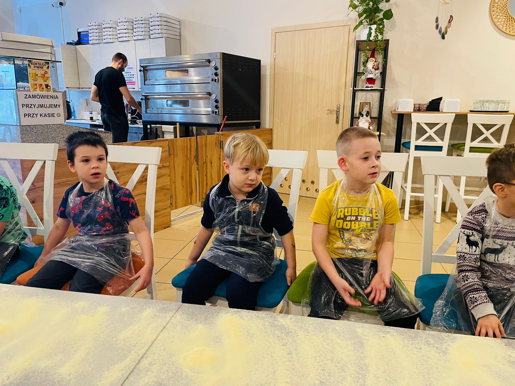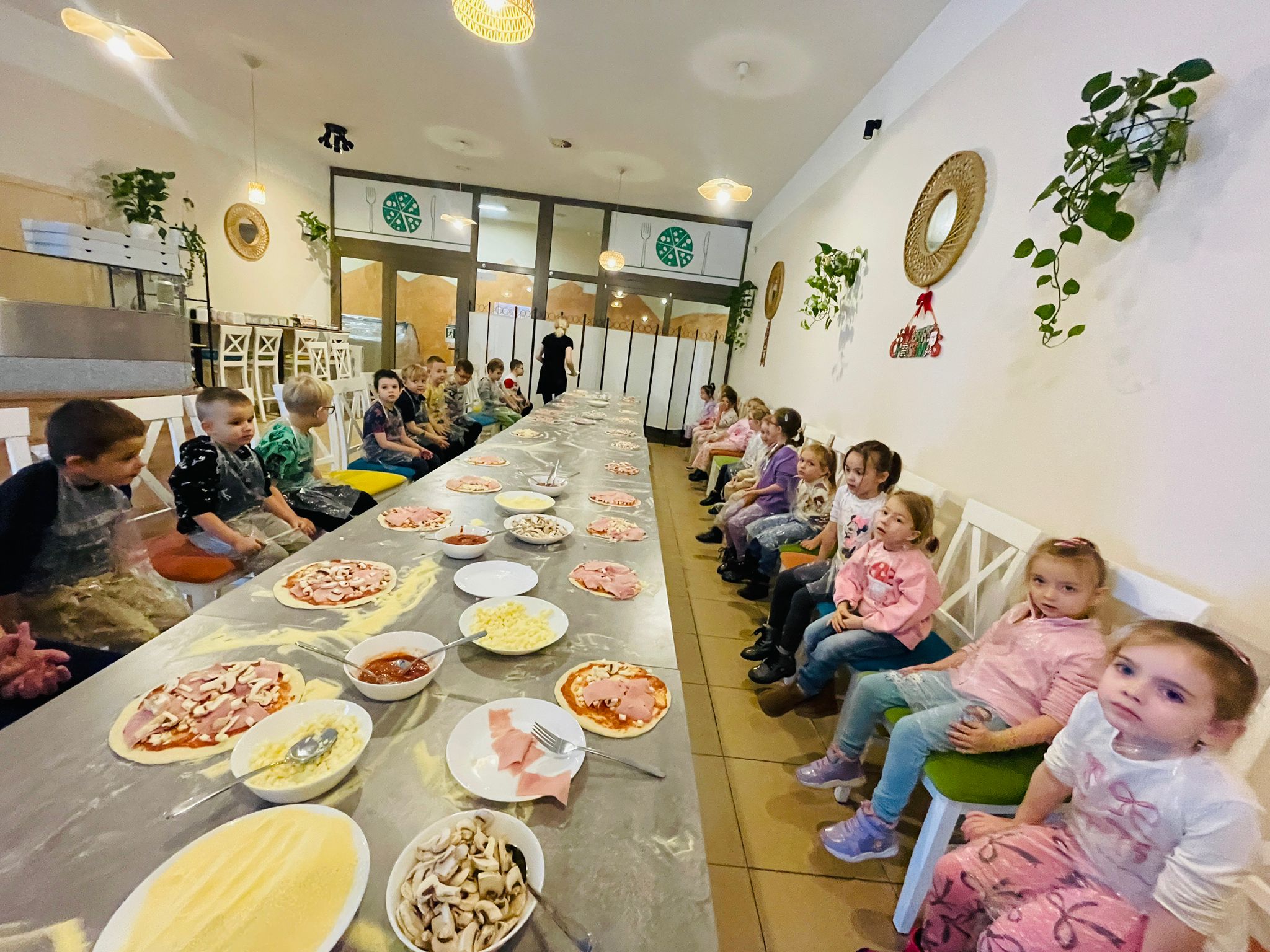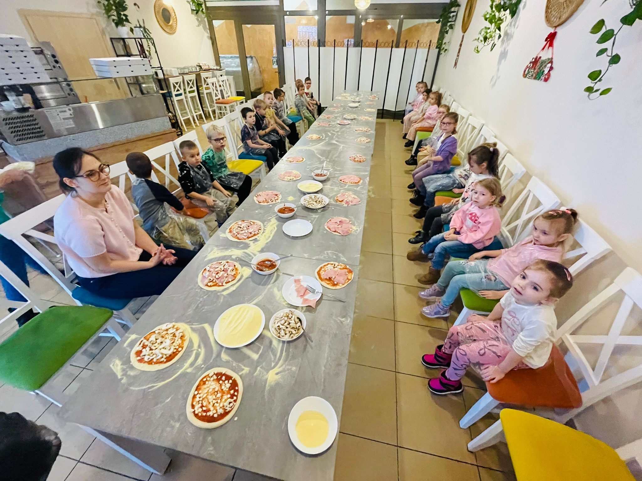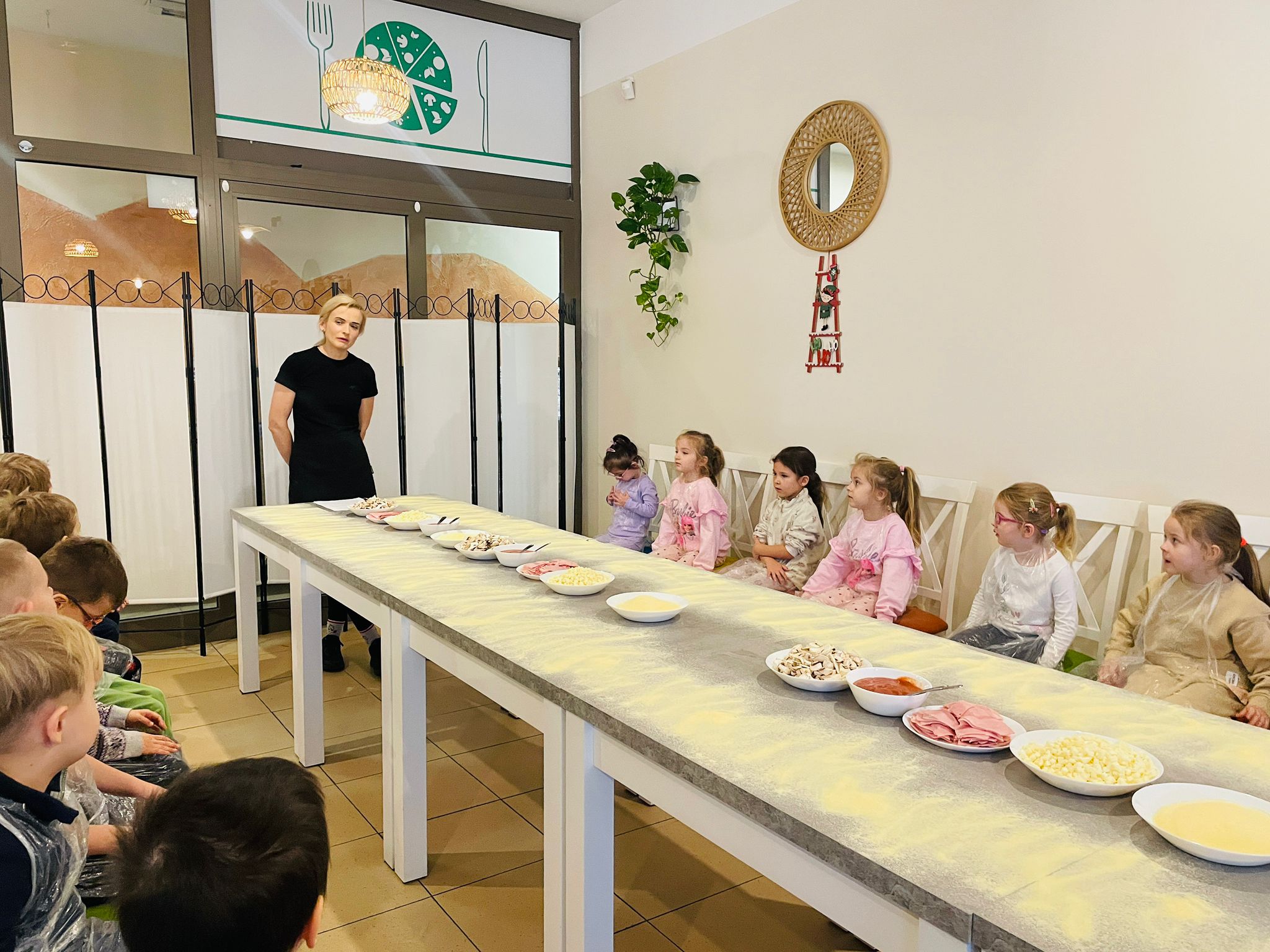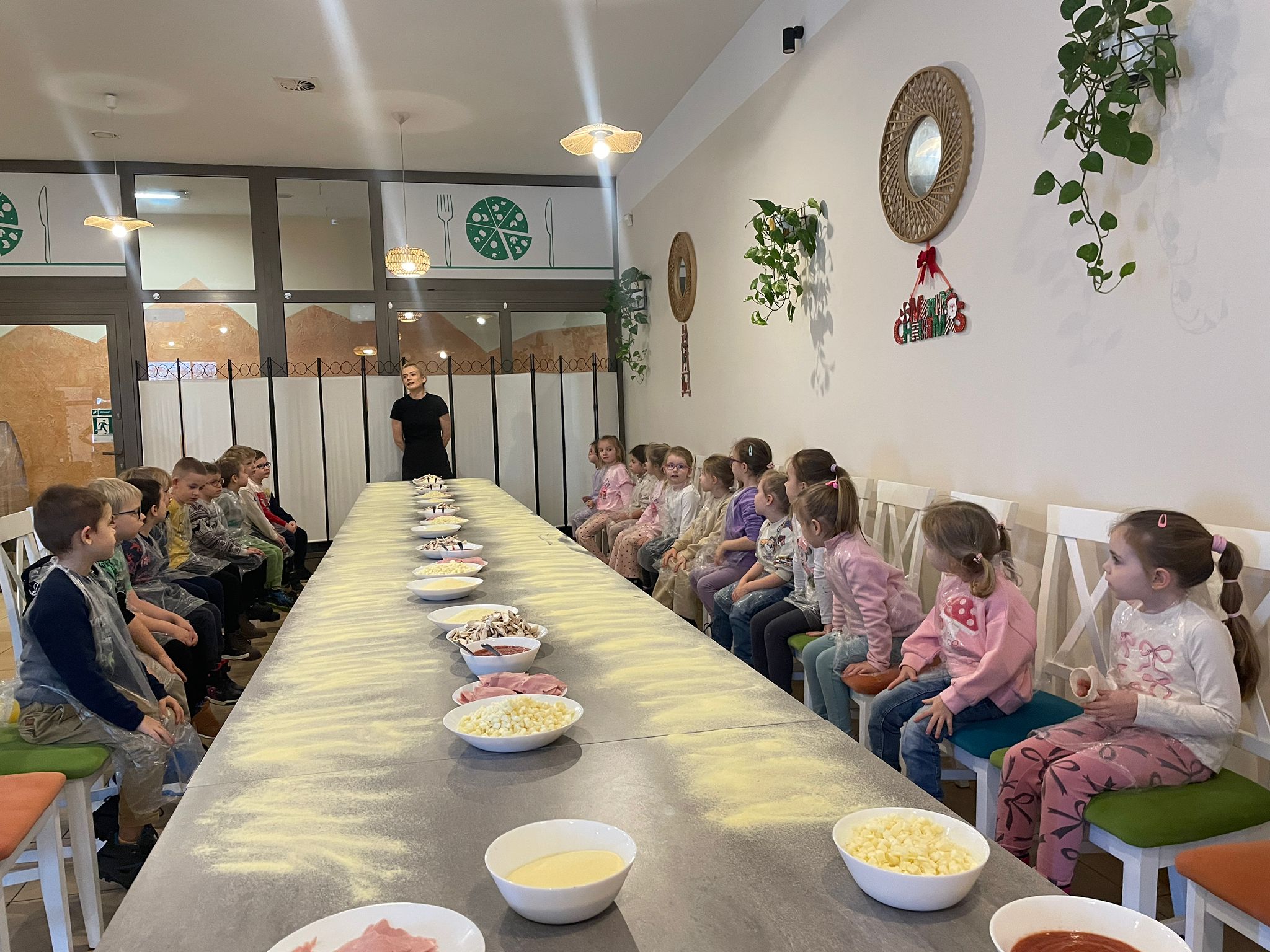Kolejne kulinarne przygody za nami. Przedszkolaki z gr. XI miały okazję uczestniczyć w warsztatach z robienia pizzy organizowanych w pobliskiej Restauracji "Osiedlowa". Na początku szefowa kuchni- p. Ania, przybliżyła dzieciom historię pizzy. Następnie do akcji wkroczył p. Oliwer- pizzerman, który pokazał dzieciom, jak przejść do części praktycznej. Chłopcy i dziewczynki samodzielnie sypali mąkę, wyrabiali ciasto, a na koniec dodawali ulubione smakołyki. Po wypieczeniu pizzy w specjalnym piecu przyszedł czas na pałaszowanie. Dzieci pracowały z niezwykłym zaangażowaniem, a czekając na wypiek zaśpiewały pracownikom restauracji świąteczną piosenkę. To był niezwykle miły czas.
