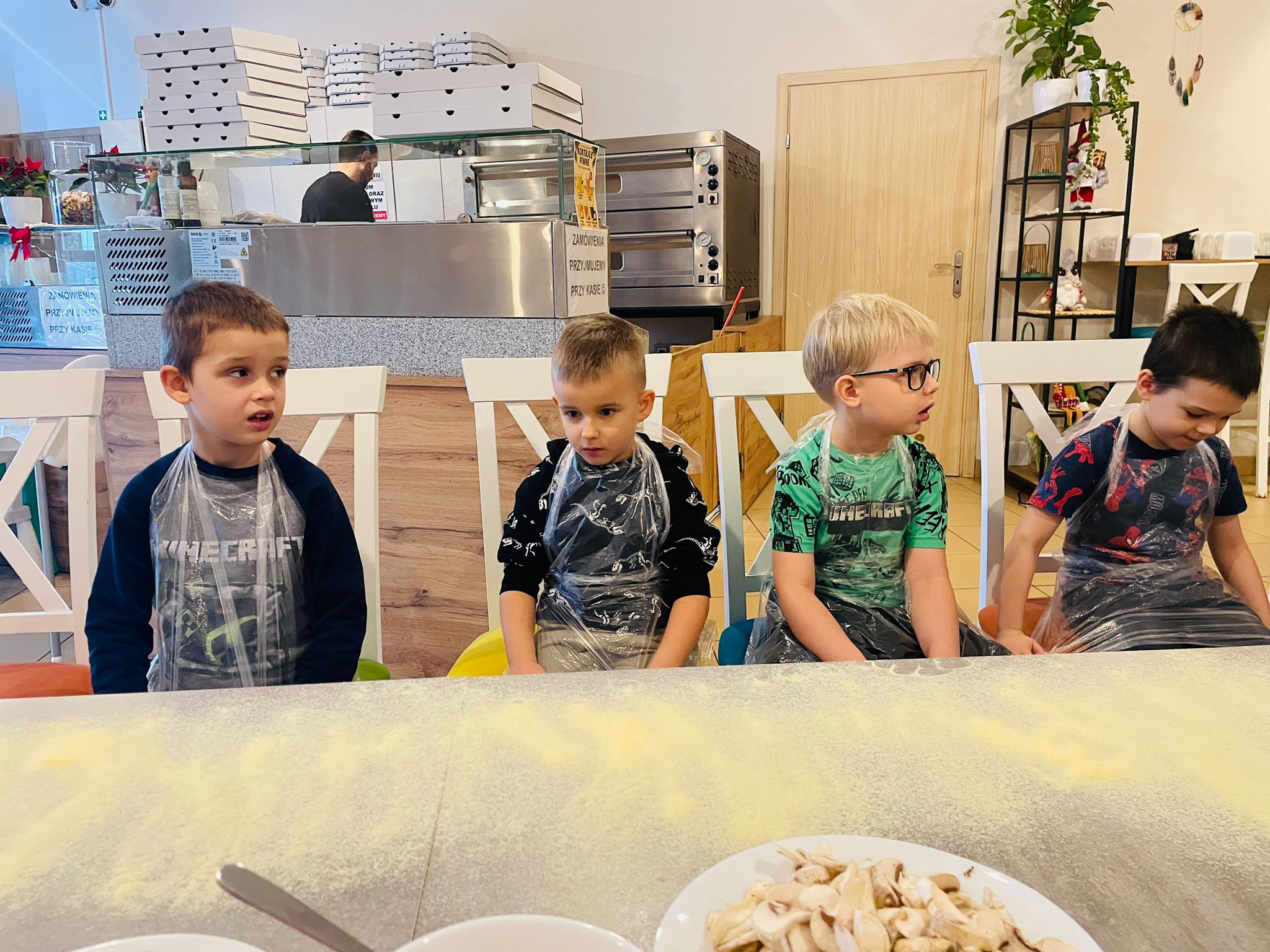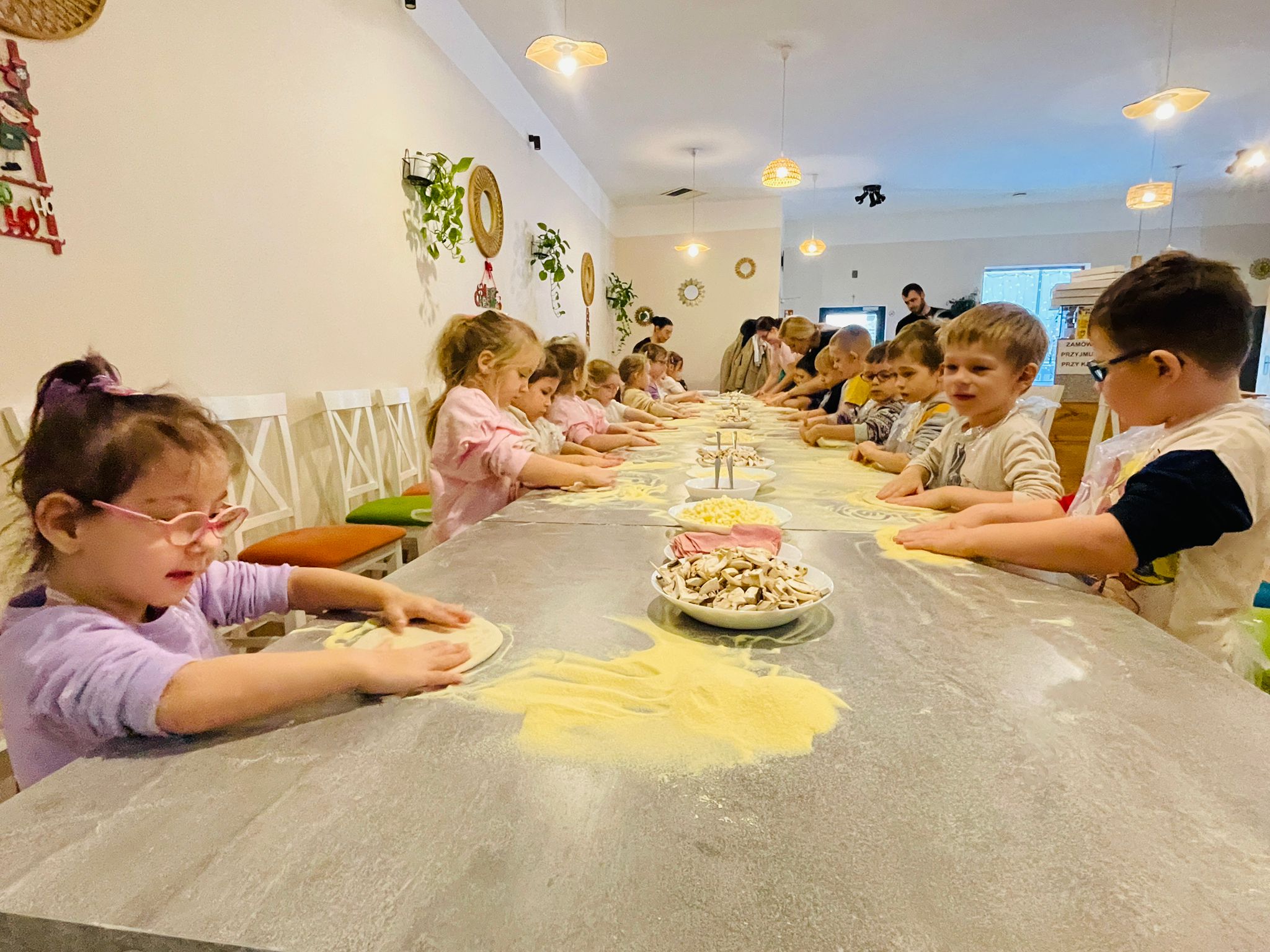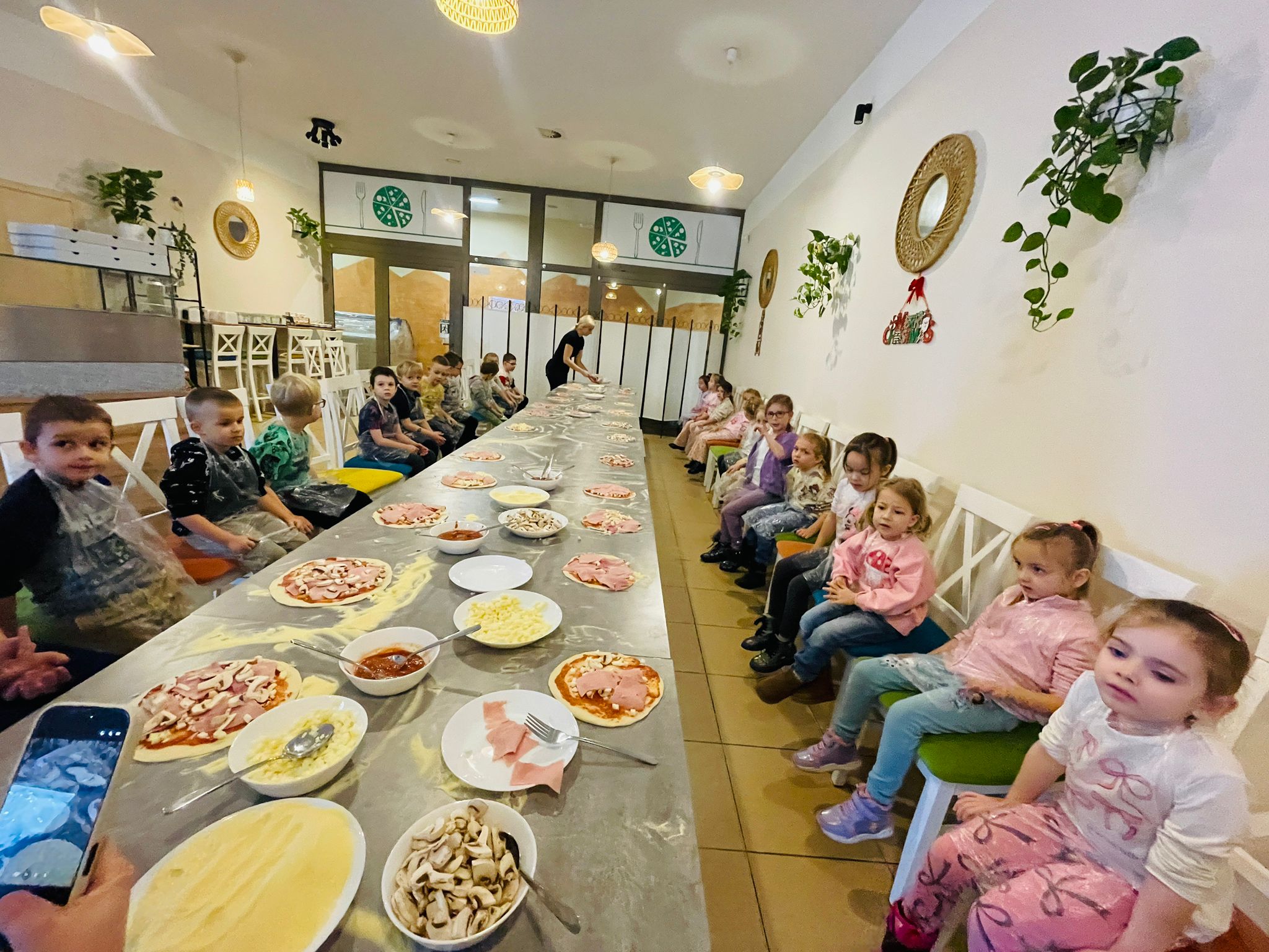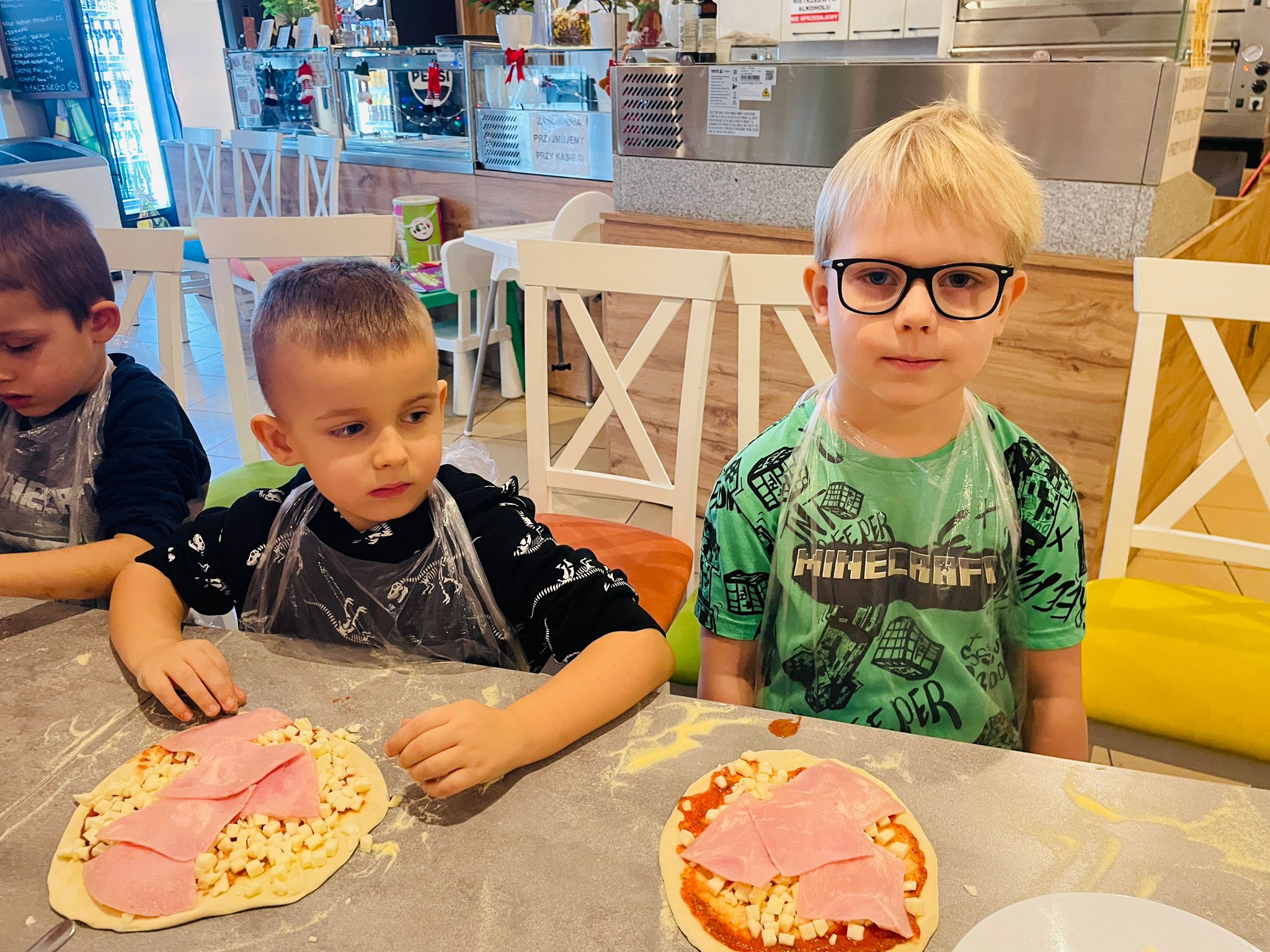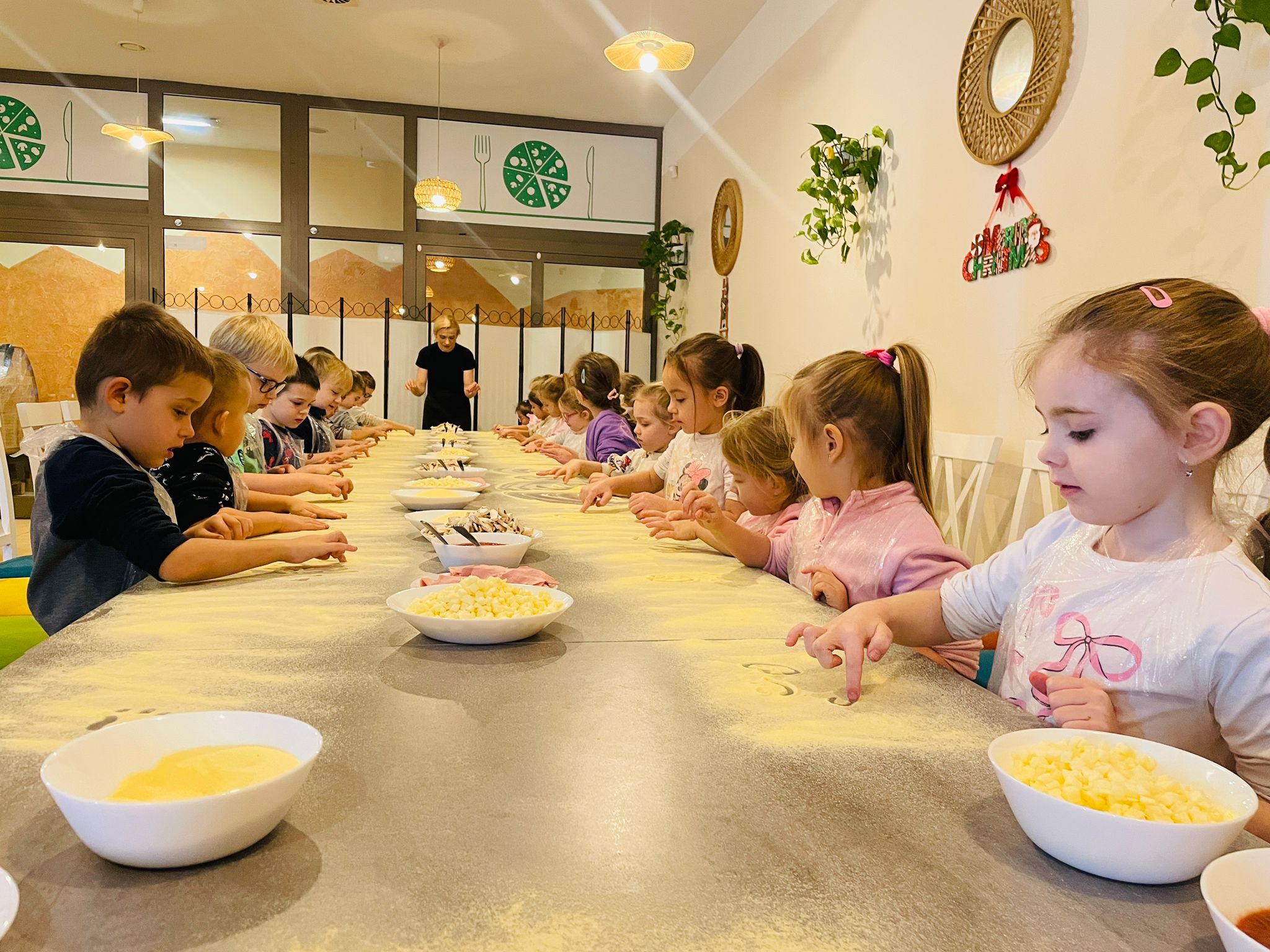 Kolejne kulinarne przygody za nami. Przedszkolaki z gr. XI miały okazję uczestniczyć w warsztatach z robienia pizzy organizowanych w pobliskiej Restauracji "Osiedlowa". Na początku szefowa kuchni- p. Ania, przybliżyła dzieciom historię pizzy. Następnie do akcji wkroczył p. Oliwer- pizzerman, który pokazał dzieciom, jak przejść do części praktycznej. Chłopcy i dziewczynki samodzielnie sypali mąkę, wyrabiali ciasto, a na koniec dodawali ulubione smakołyki. Po wypieczeniu pizzy w specjalnym piecu przyszedł czas na pałaszowanie. Dzieci pracowały z niezwykłym zaangażowaniem, a czekając na wypiek zaśpiewały pracownikom restauracji świąteczną piosenkę. To był niezwykle miły czas.
