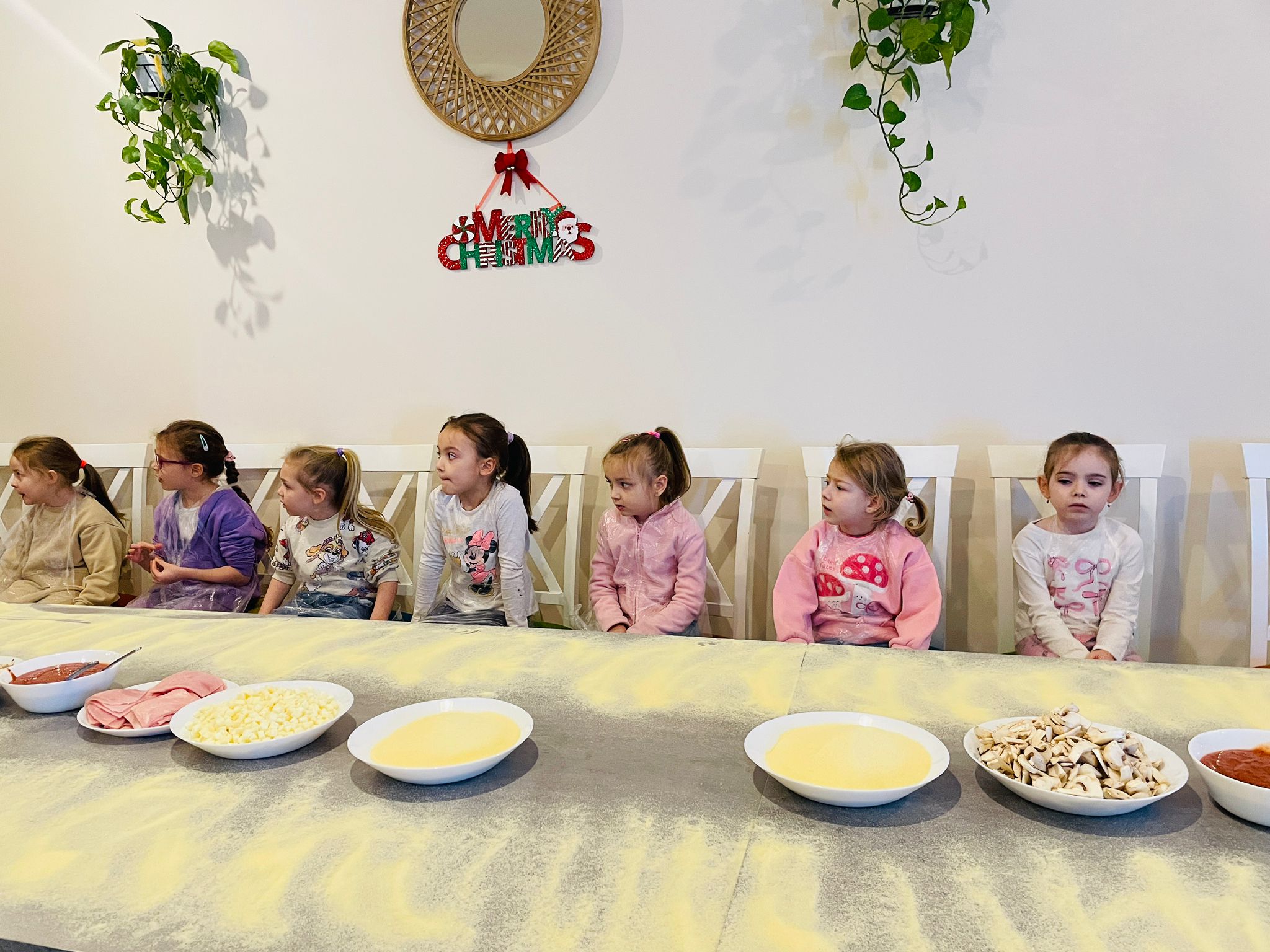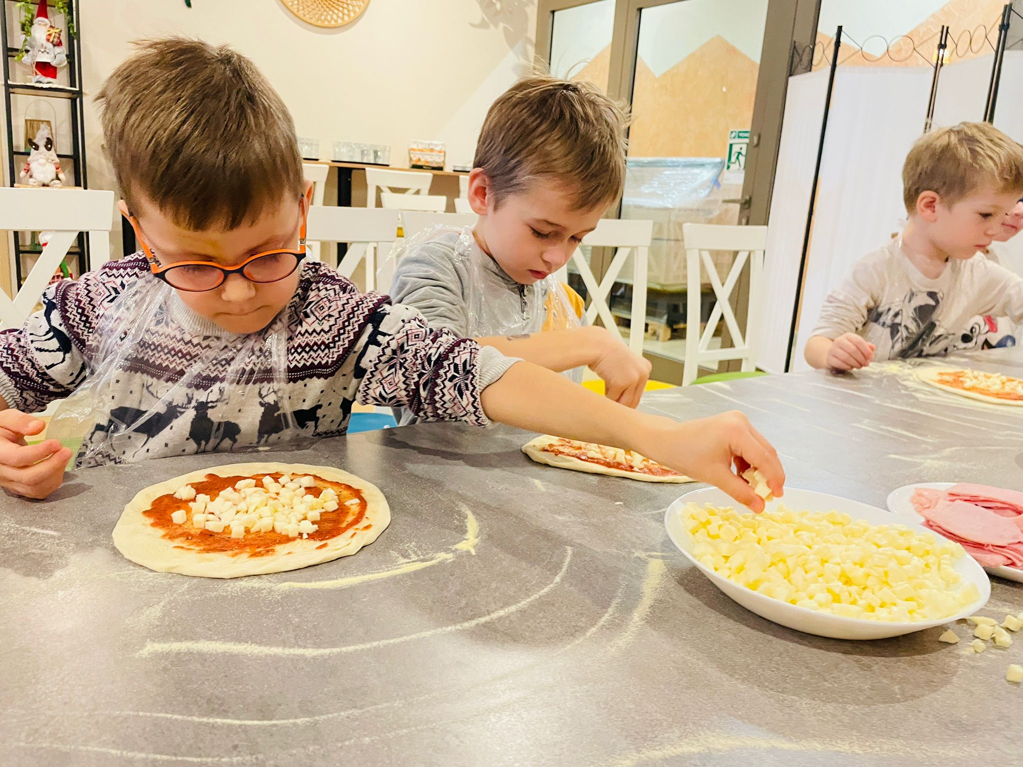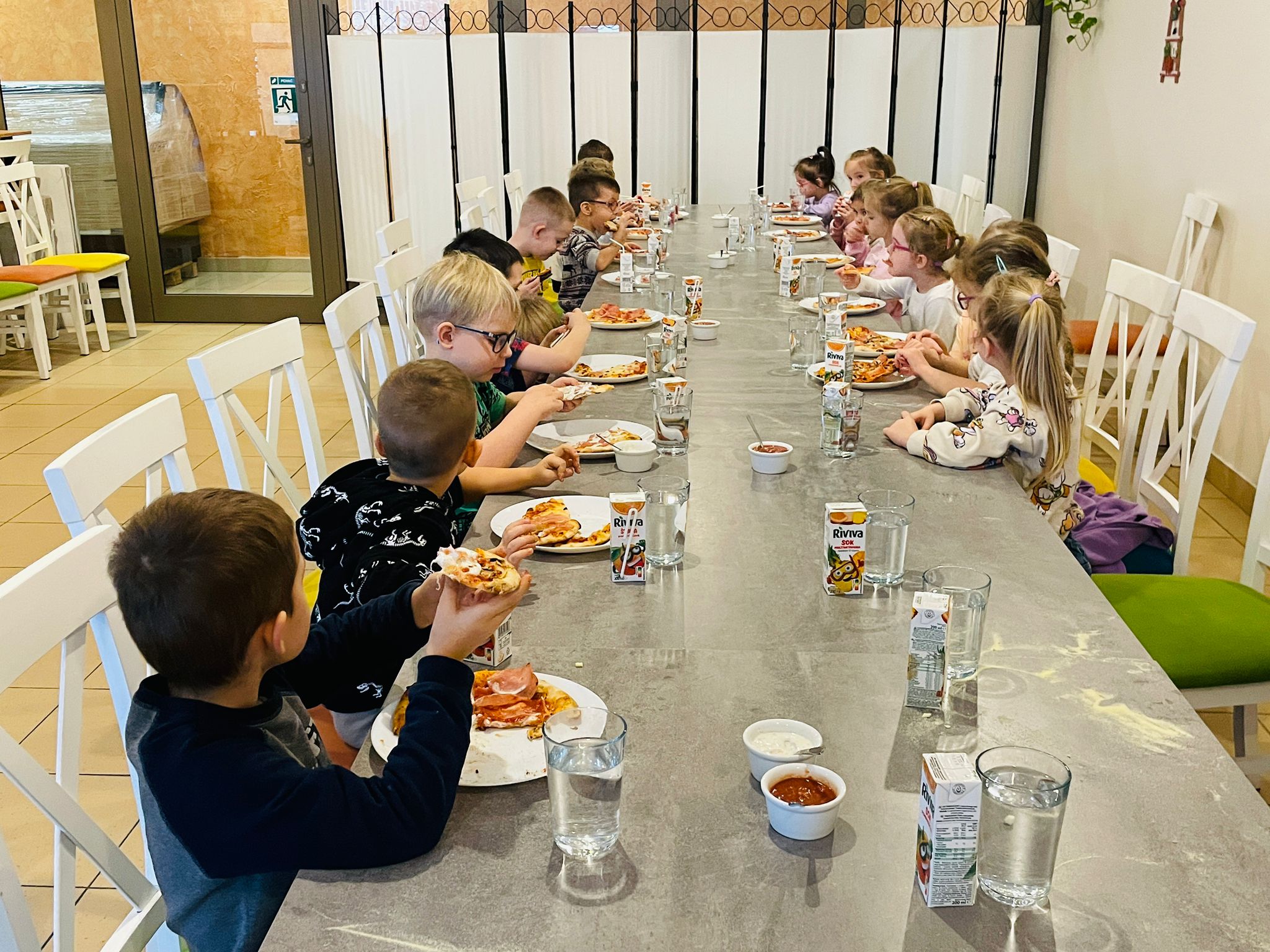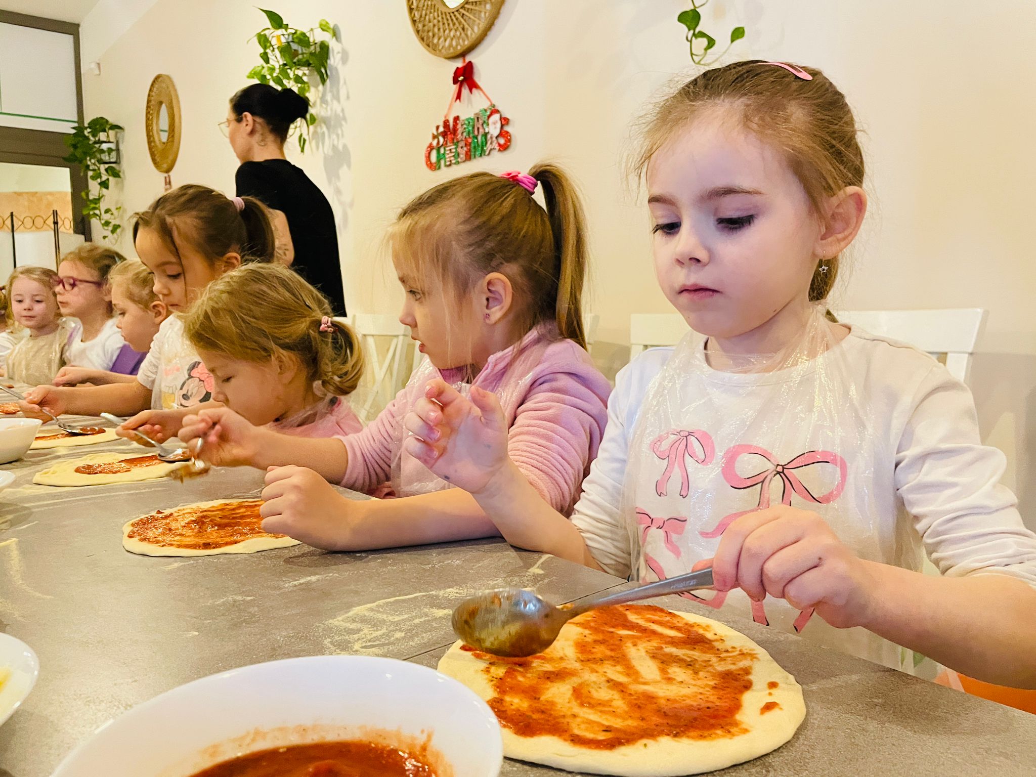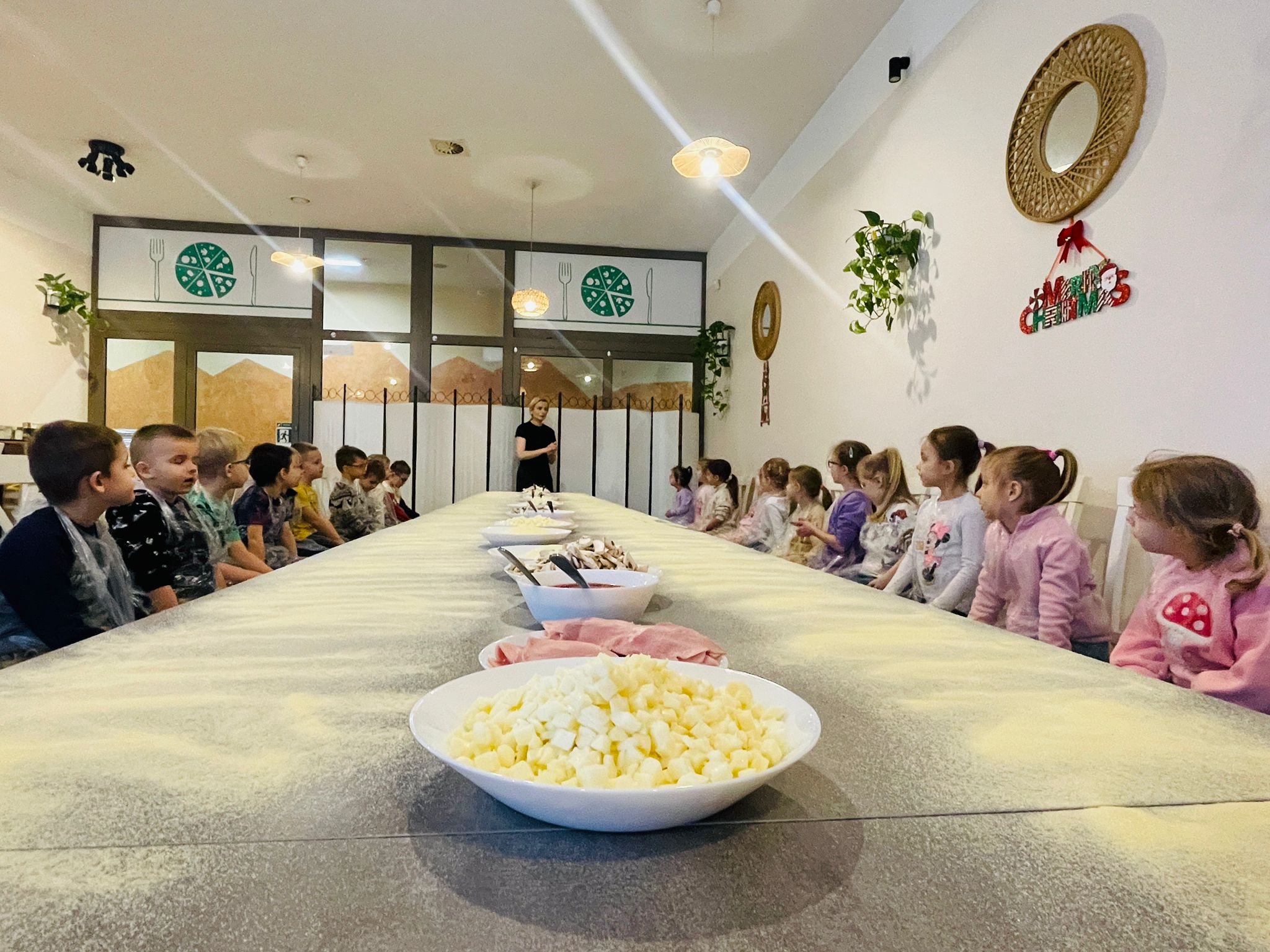 Kolejne kulinarne przygody za nami. Przedszkolaki z gr. XI miały okazję uczestniczyć w warsztatach z robienia pizzy organizowanych w pobliskiej Restauracji "Osiedlowa". Na początku szefowa kuchni- p. Ania, przybliżyła dzieciom historię pizzy. Następnie do akcji wkroczył p. Oliwer- pizzerman, który pokazał dzieciom, jak przejść do części praktycznej. Chłopcy i dziewczynki samodzielnie sypali mąkę, wyrabiali ciasto, a na koniec dodawali ulubione smakołyki. Po wypieczeniu pizzy w specjalnym piecu przyszedł czas na pałaszowanie. Dzieci pracowały z niezwykłym zaangażowaniem, a czekając na wypiek zaśpiewały pracownikom restauracji świąteczną piosenkę. To był niezwykle miły czas.