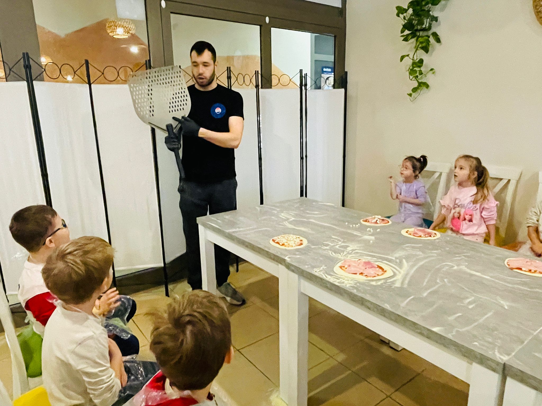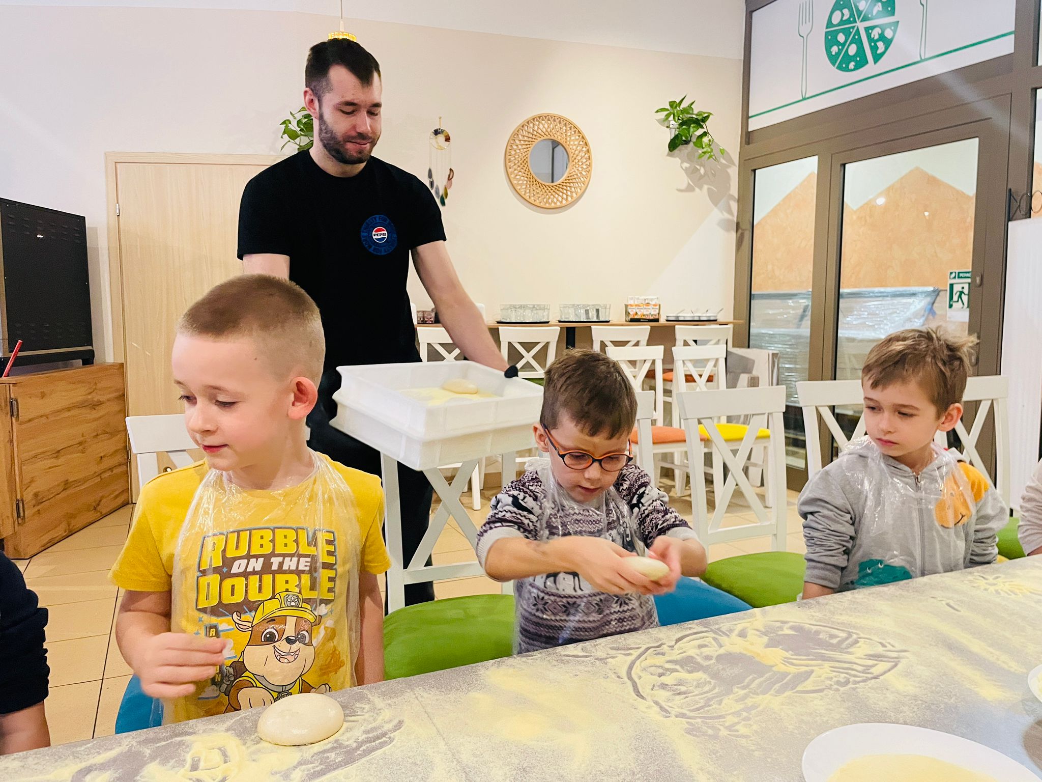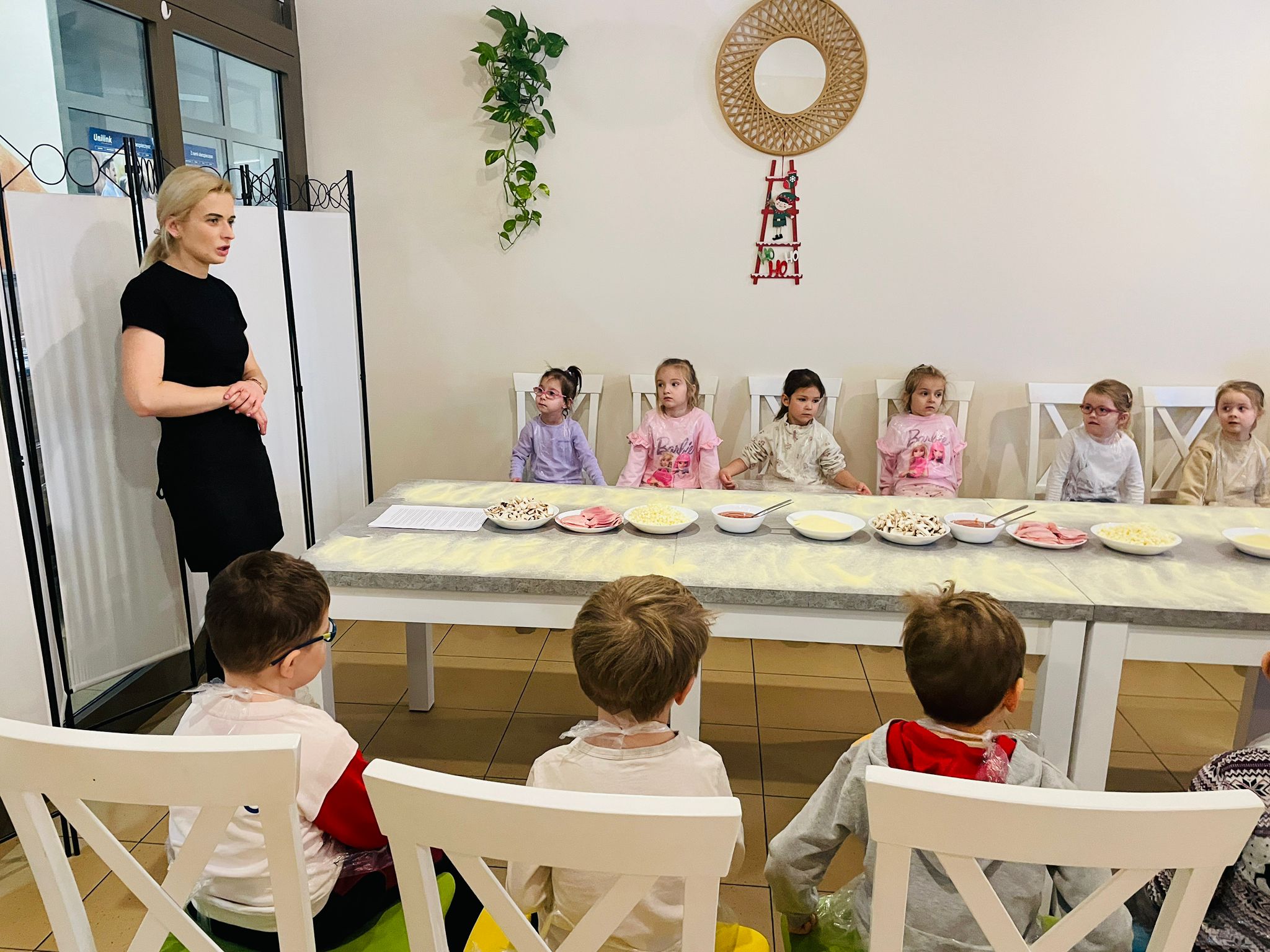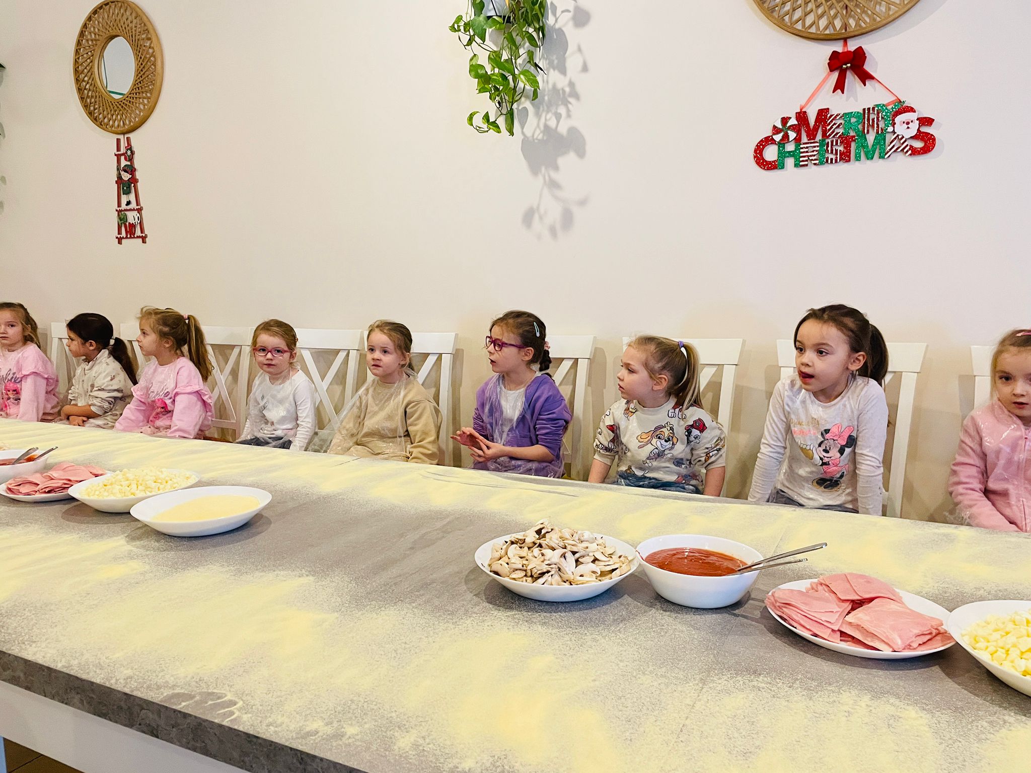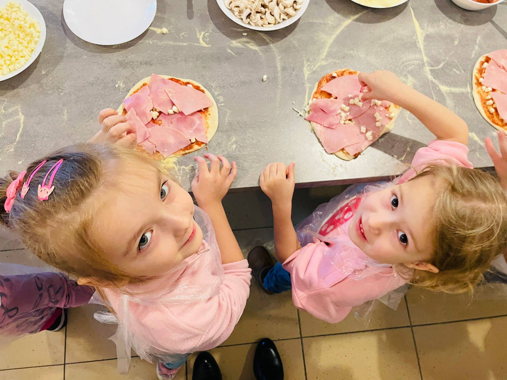 Kolejne kulinarne przygody za nami. Przedszkolaki z gr. XI miały okazję uczestniczyć w warsztatach z robienia pizzy organizowanych w pobliskiej Restauracji "Osiedlowa". Na początku szefowa kuchni- p. Ania, przybliżyła dzieciom historię pizzy. Następnie do akcji wkroczył p. Oliwer- pizzerman, który pokazał dzieciom, jak przejść do części praktycznej. Chłopcy i dziewczynki samodzielnie sypali mąkę, wyrabiali ciasto, a na koniec dodawali ulubione smakołyki. Po wypieczeniu pizzy w specjalnym piecu przyszedł czas na pałaszowanie. Dzieci pracowały z niezwykłym zaangażowaniem, a czekając na wypiek zaśpiewały pracownikom restauracji świąteczną piosenkę. To był niezwykle miły czas.