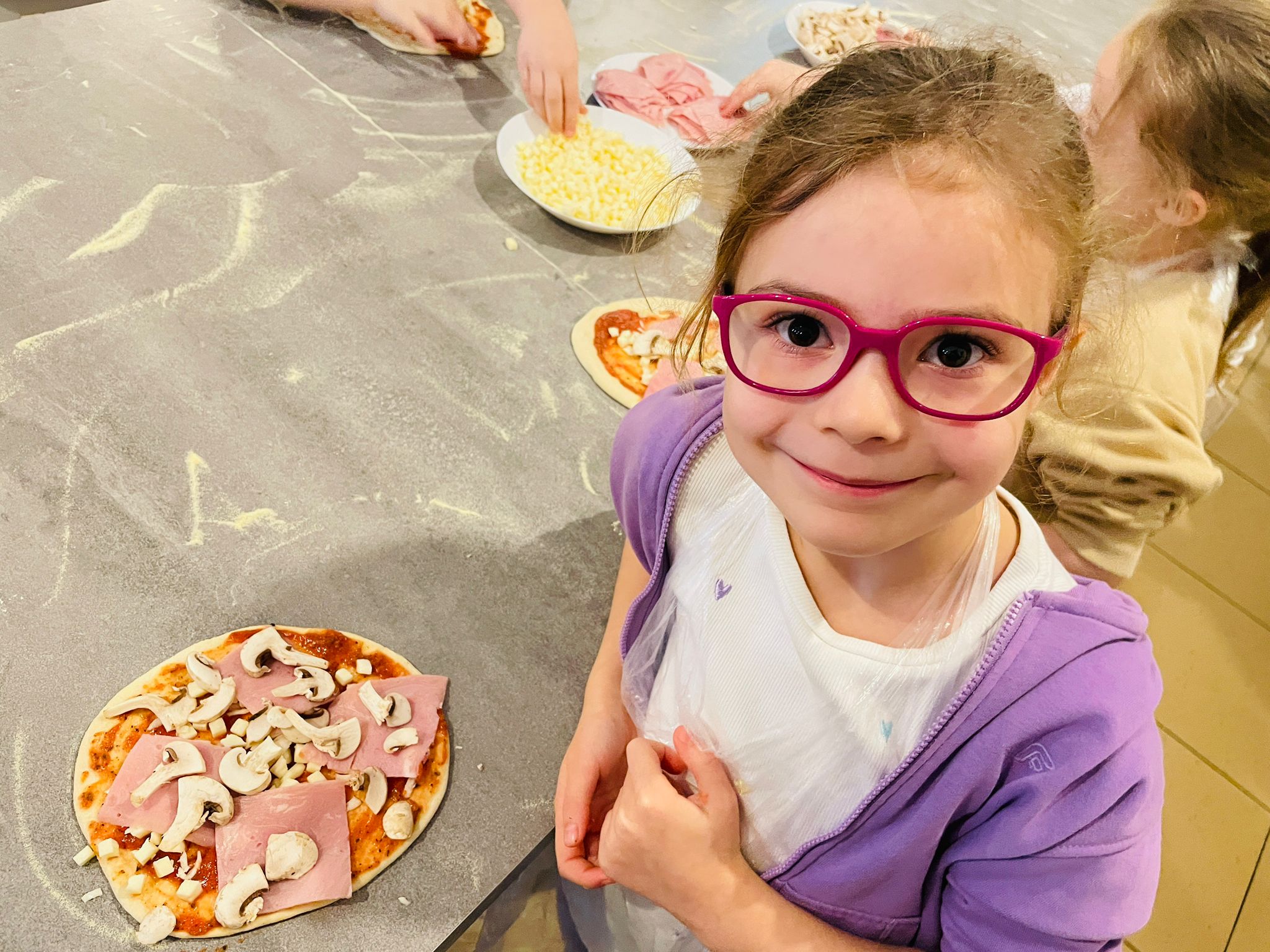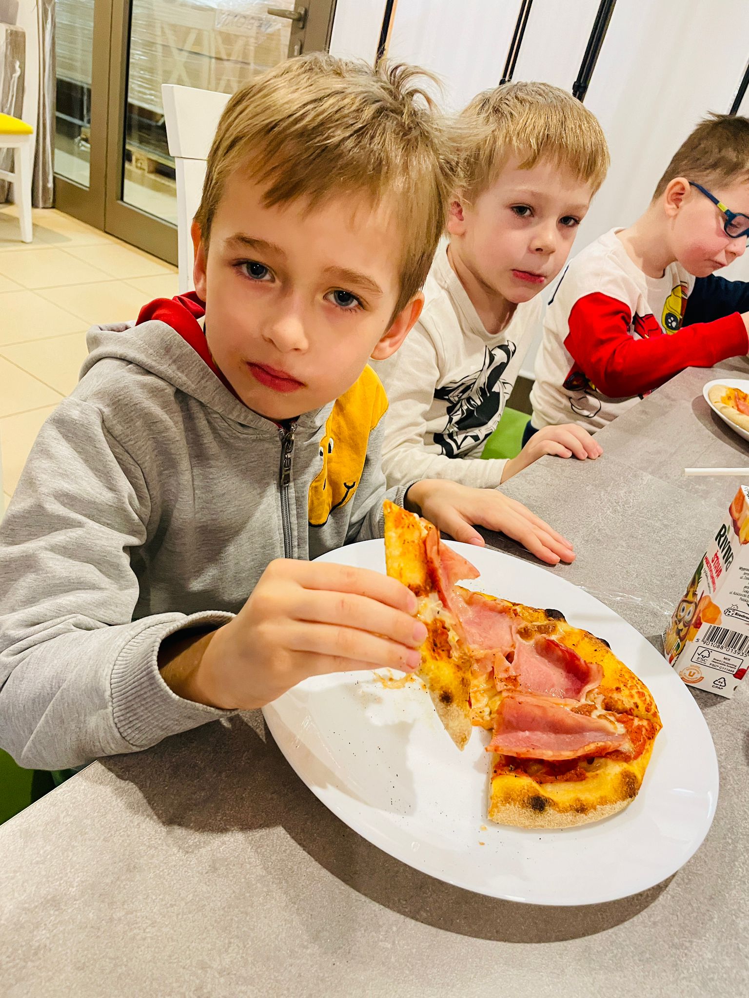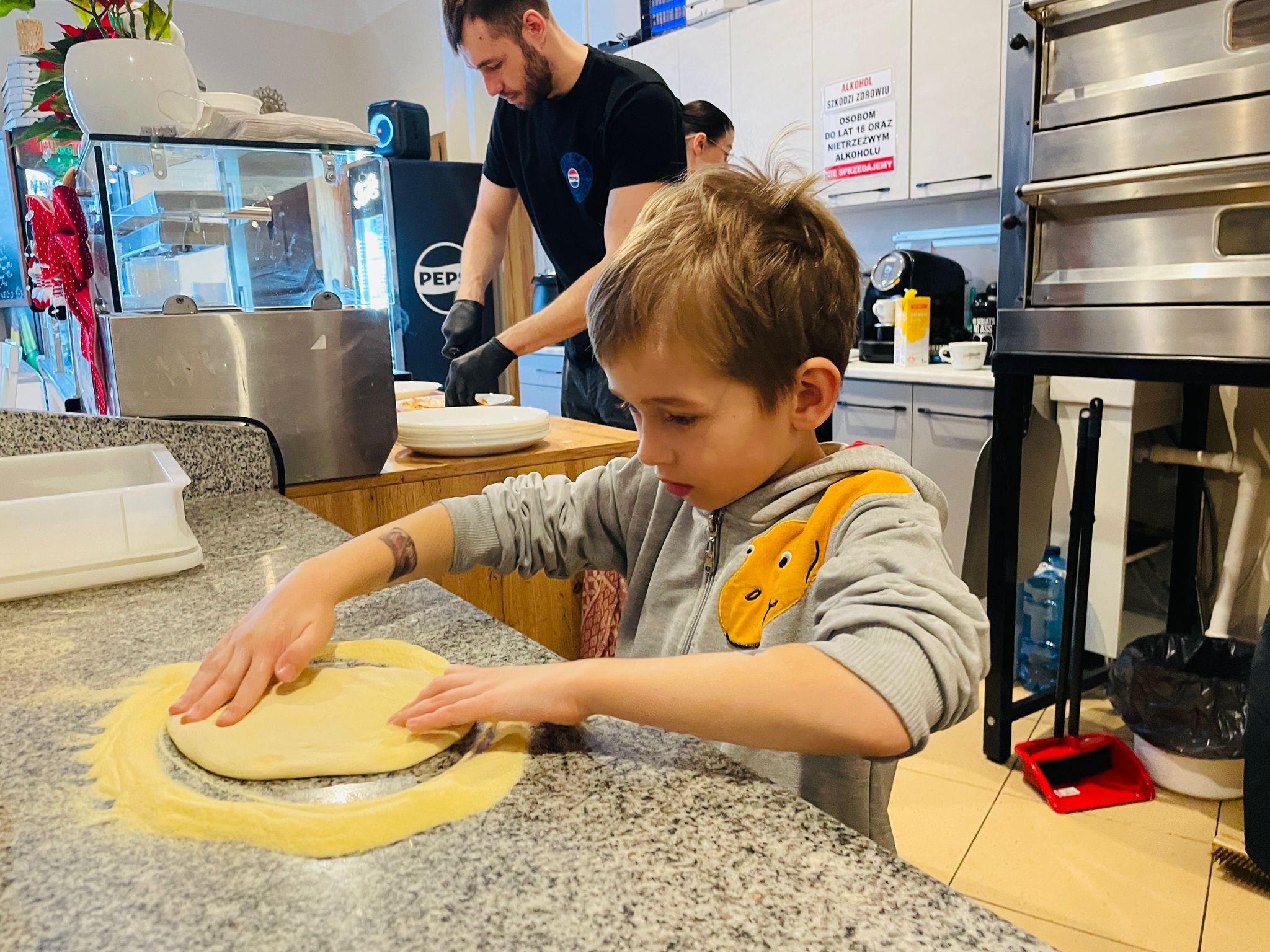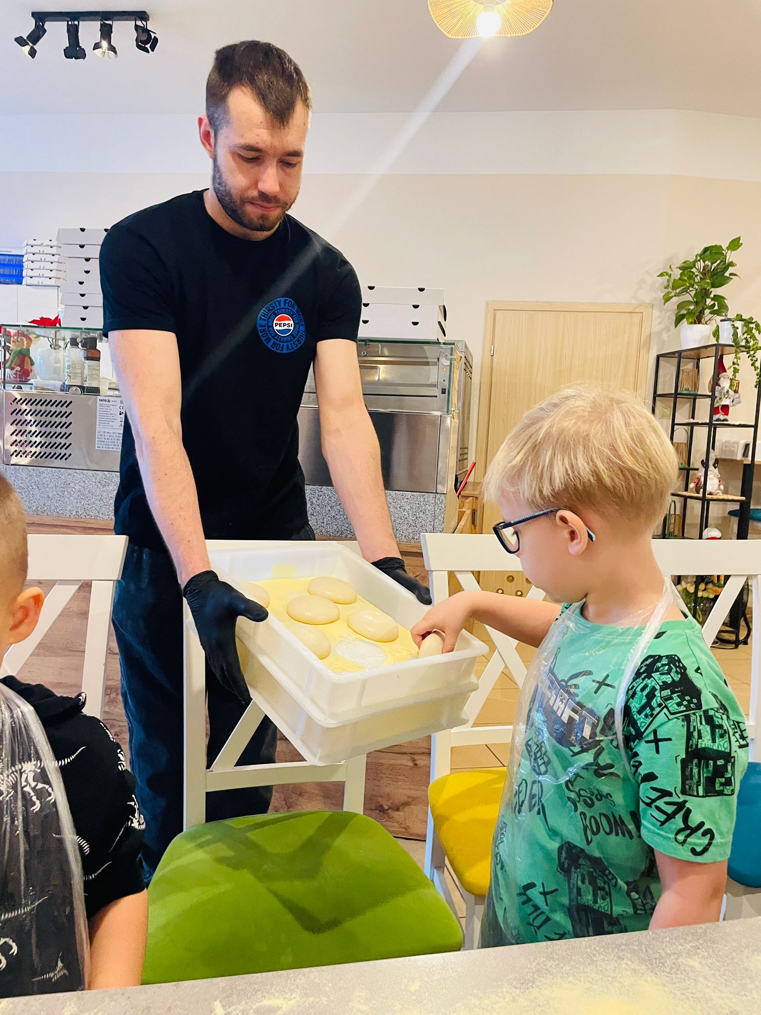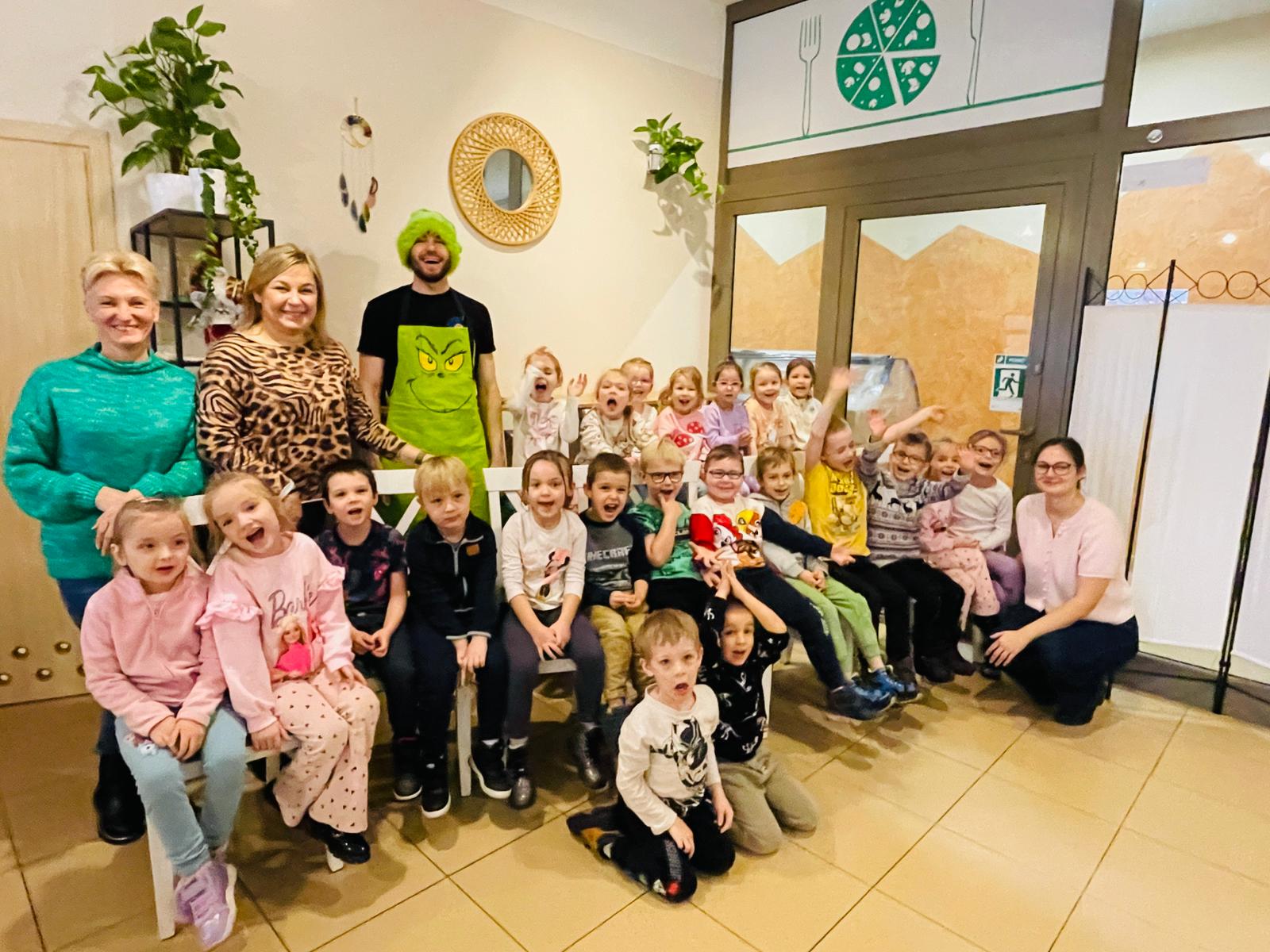 Kolejne kulinarne przygody za nami. Przedszkolaki z gr. XI miały okazję uczestniczyć w warsztatach z robienia pizzy organizowanych w pobliskiej Restauracji "Osiedlowa". Na początku szefowa kuchni- p. Ania, przybliżyła dzieciom historię pizzy. Następnie do akcji wkroczył p. Oliwer- pizzerman, który pokazał dzieciom, jak przejść do części praktycznej. Chłopcy i dziewczynki samodzielnie sypali mąkę, wyrabiali ciasto, a na koniec dodawali ulubione smakołyki. Po wypieczeniu pizzy w specjalnym piecu przyszedł czas na pałaszowanie. Dzieci pracowały z niezwykłym zaangażowaniem, a czekając na wypiek zaśpiewały pracownikom restauracji świąteczną piosenkę. To był niezwykle miły czas.