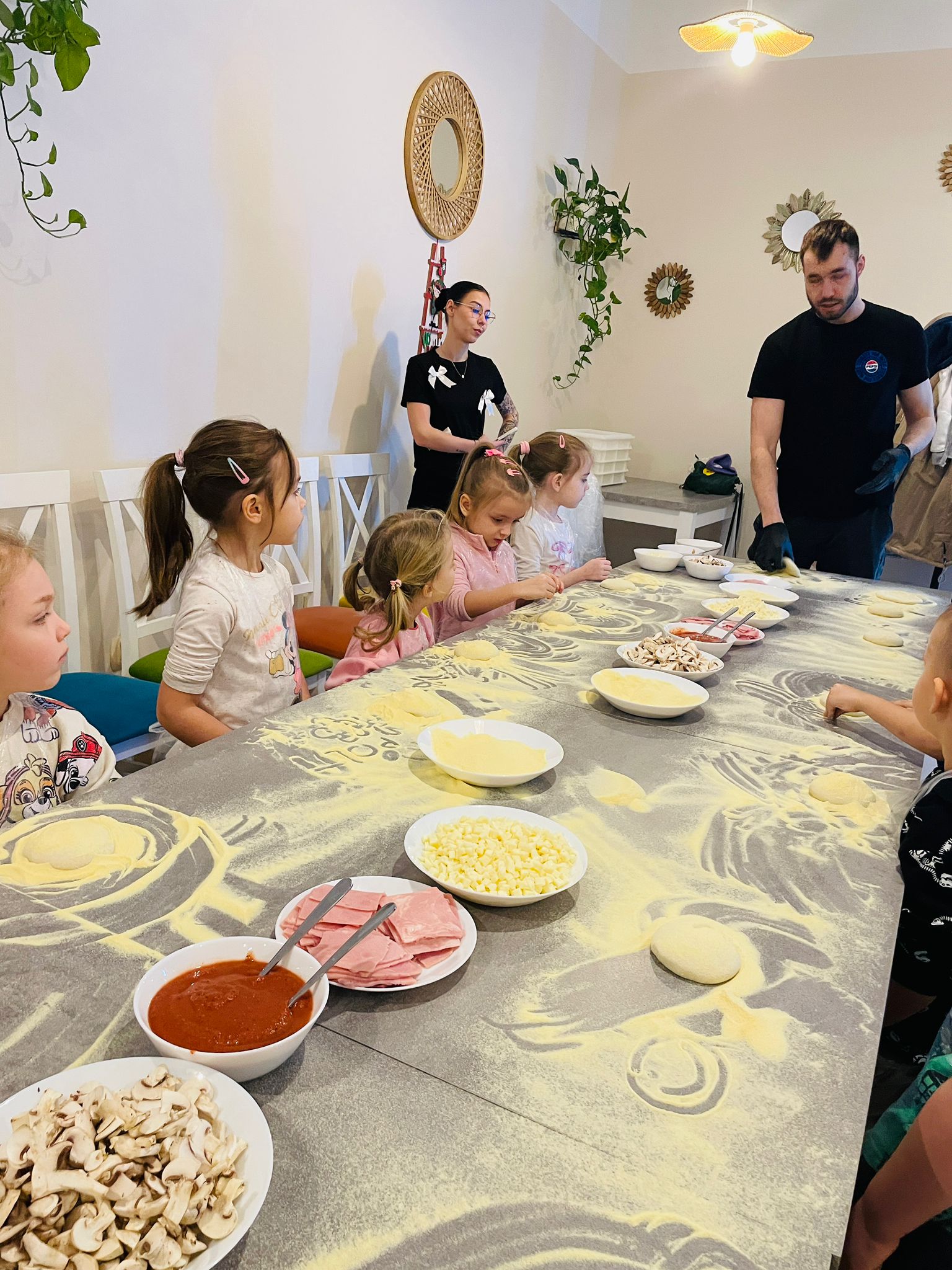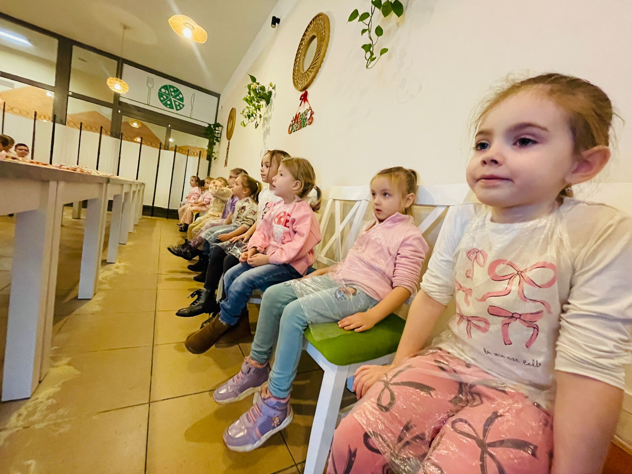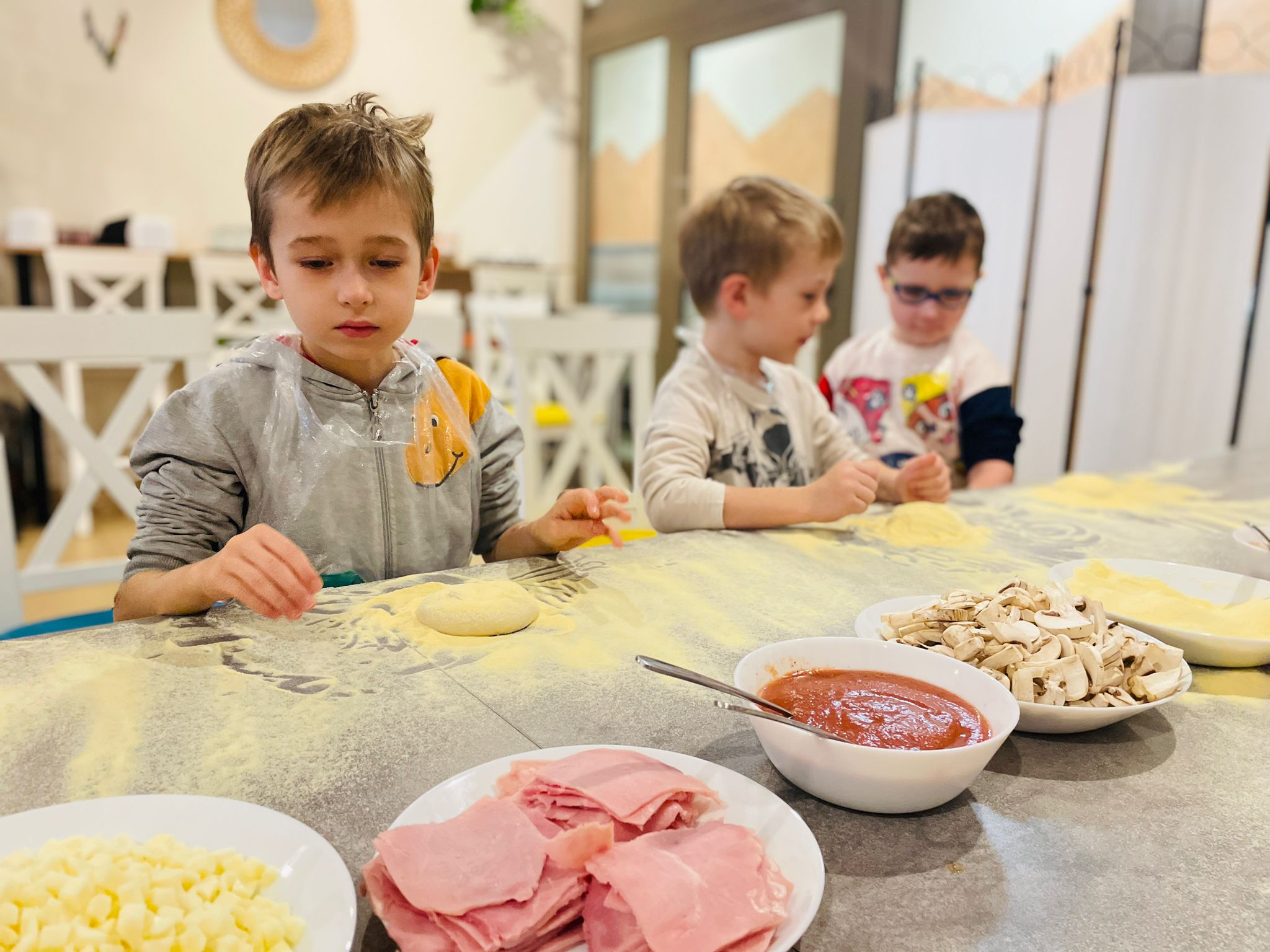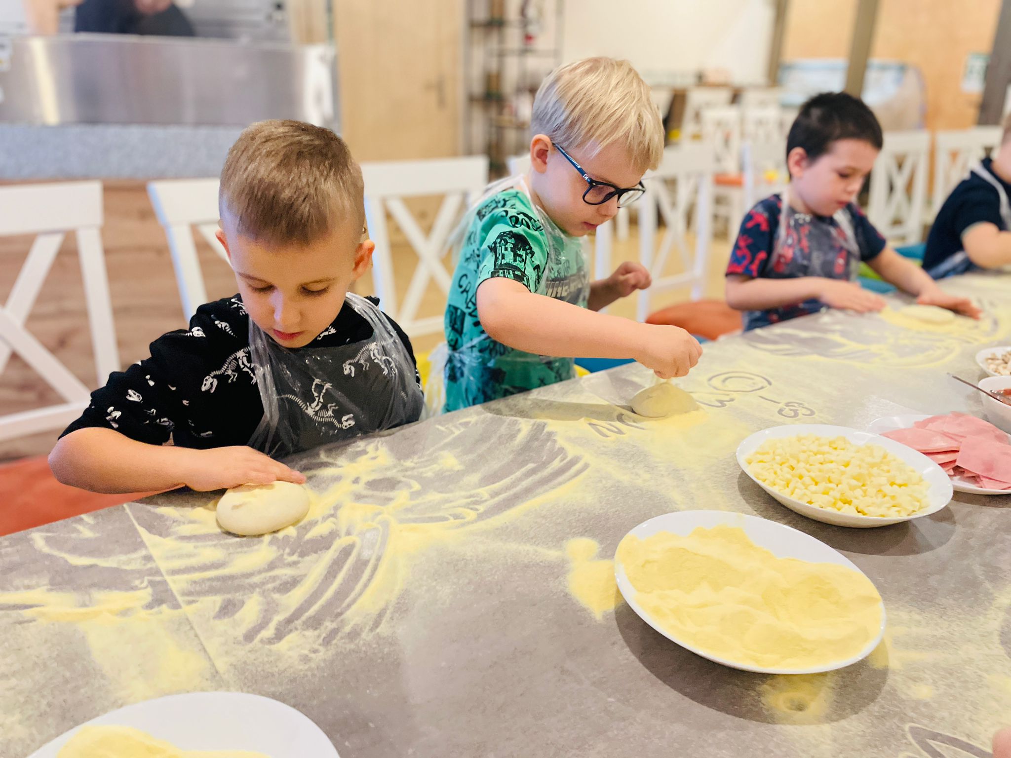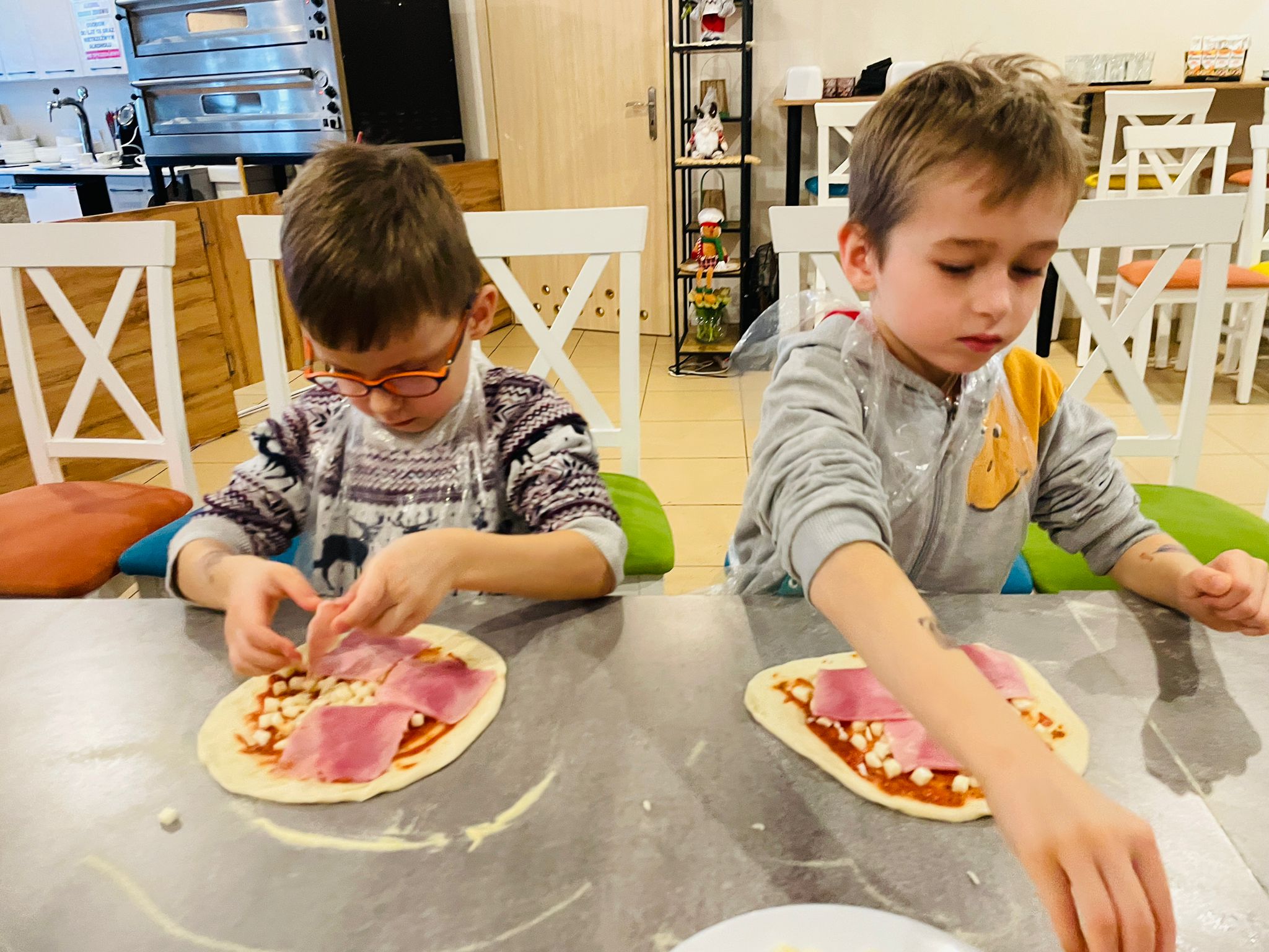 Kolejne kulinarne przygody za nami. Przedszkolaki z gr. XI miały okazję uczestniczyć w warsztatach z robienia pizzy organizowanych w pobliskiej Restauracji "Osiedlowa". Na początku szefowa kuchni- p. Ania, przybliżyła dzieciom historię pizzy. Następnie do akcji wkroczył p. Oliwer- pizzerman, który pokazał dzieciom, jak przejść do części praktycznej. Chłopcy i dziewczynki samodzielnie sypali mąkę, wyrabiali ciasto, a na koniec dodawali ulubione smakołyki. Po wypieczeniu pizzy w specjalnym piecu przyszedł czas na pałaszowanie. Dzieci pracowały z niezwykłym zaangażowaniem, a czekając na wypiek zaśpiewały pracownikom restauracji świąteczną piosenkę. To był niezwykle miły czas.
