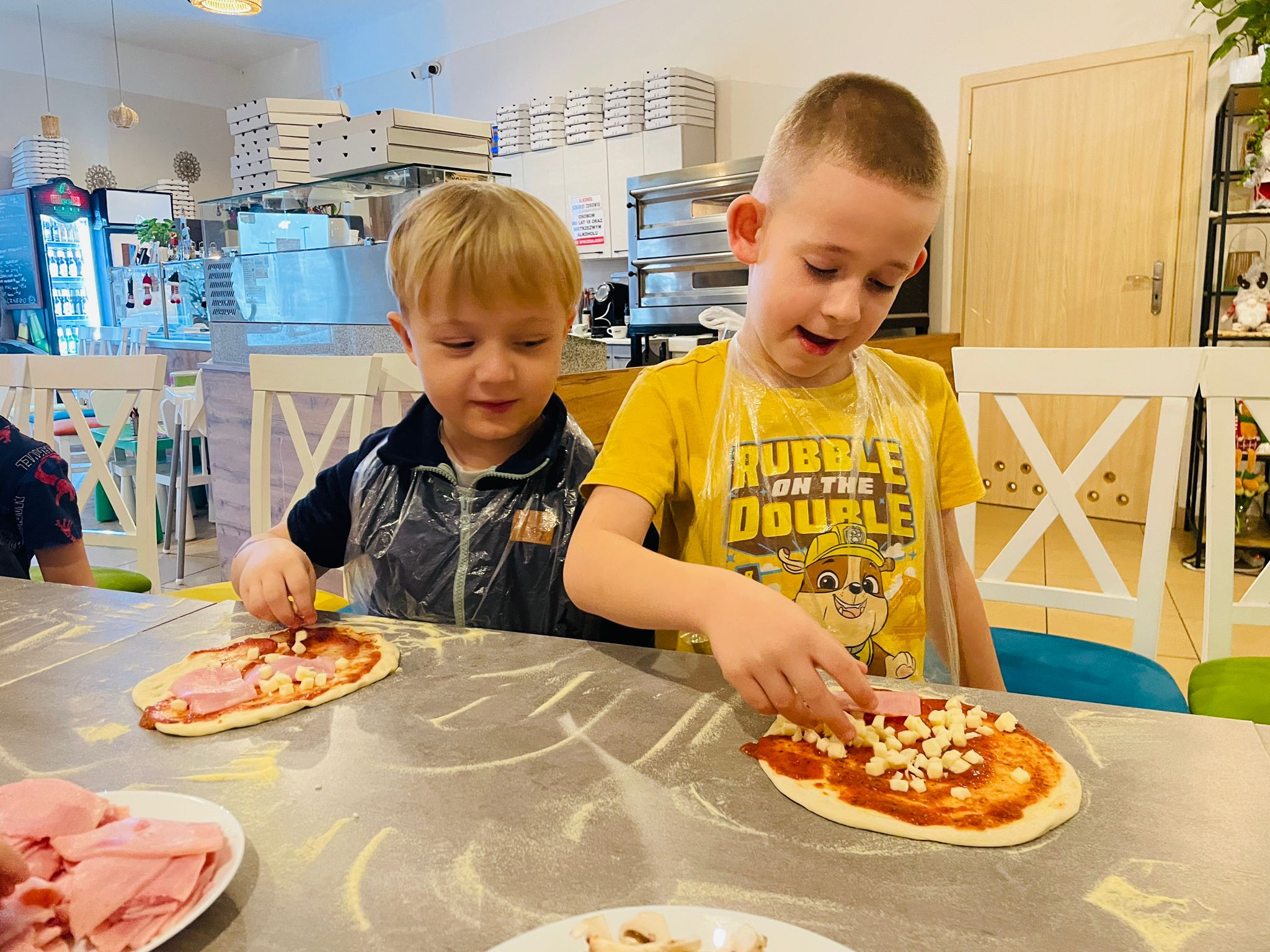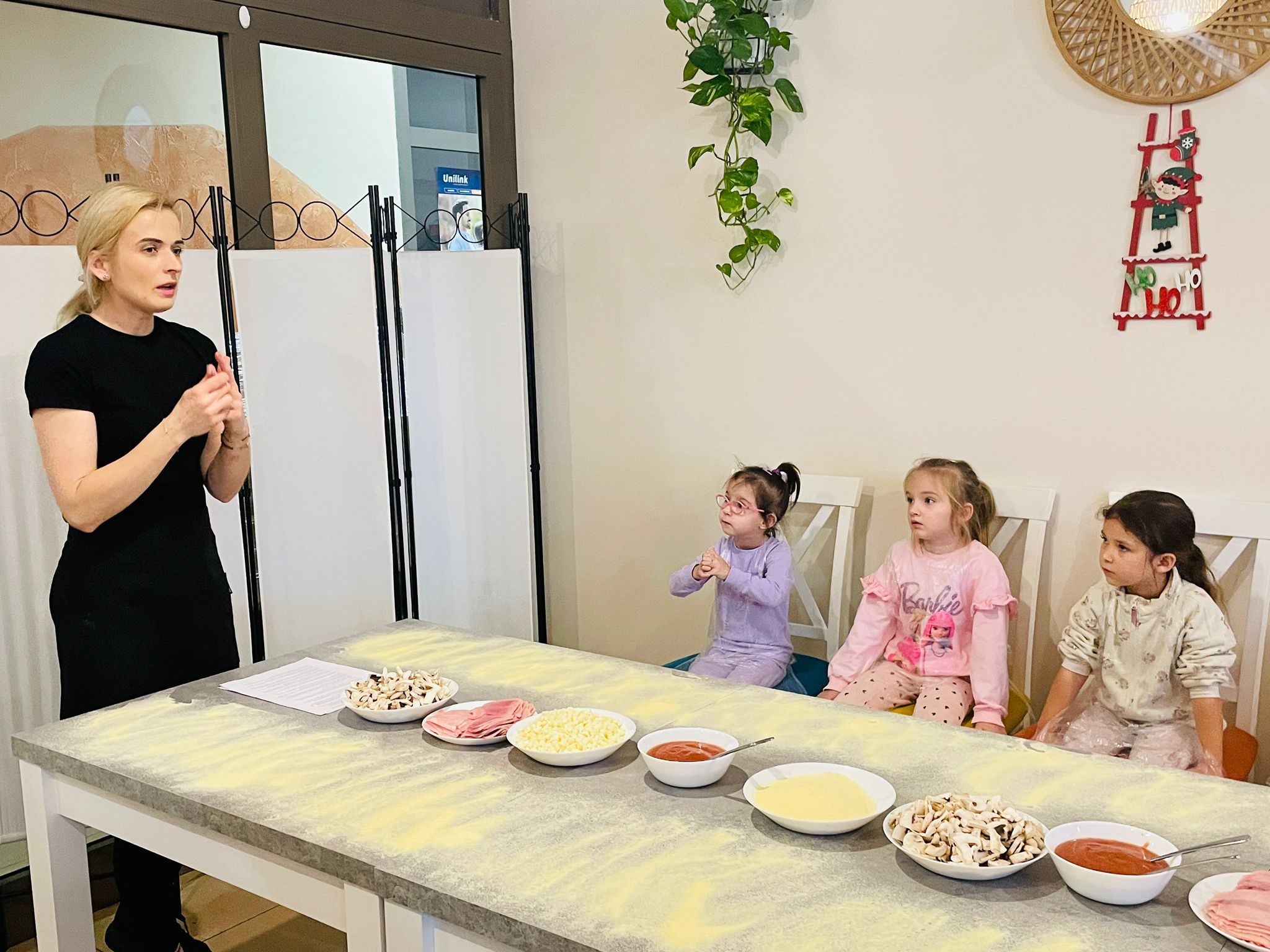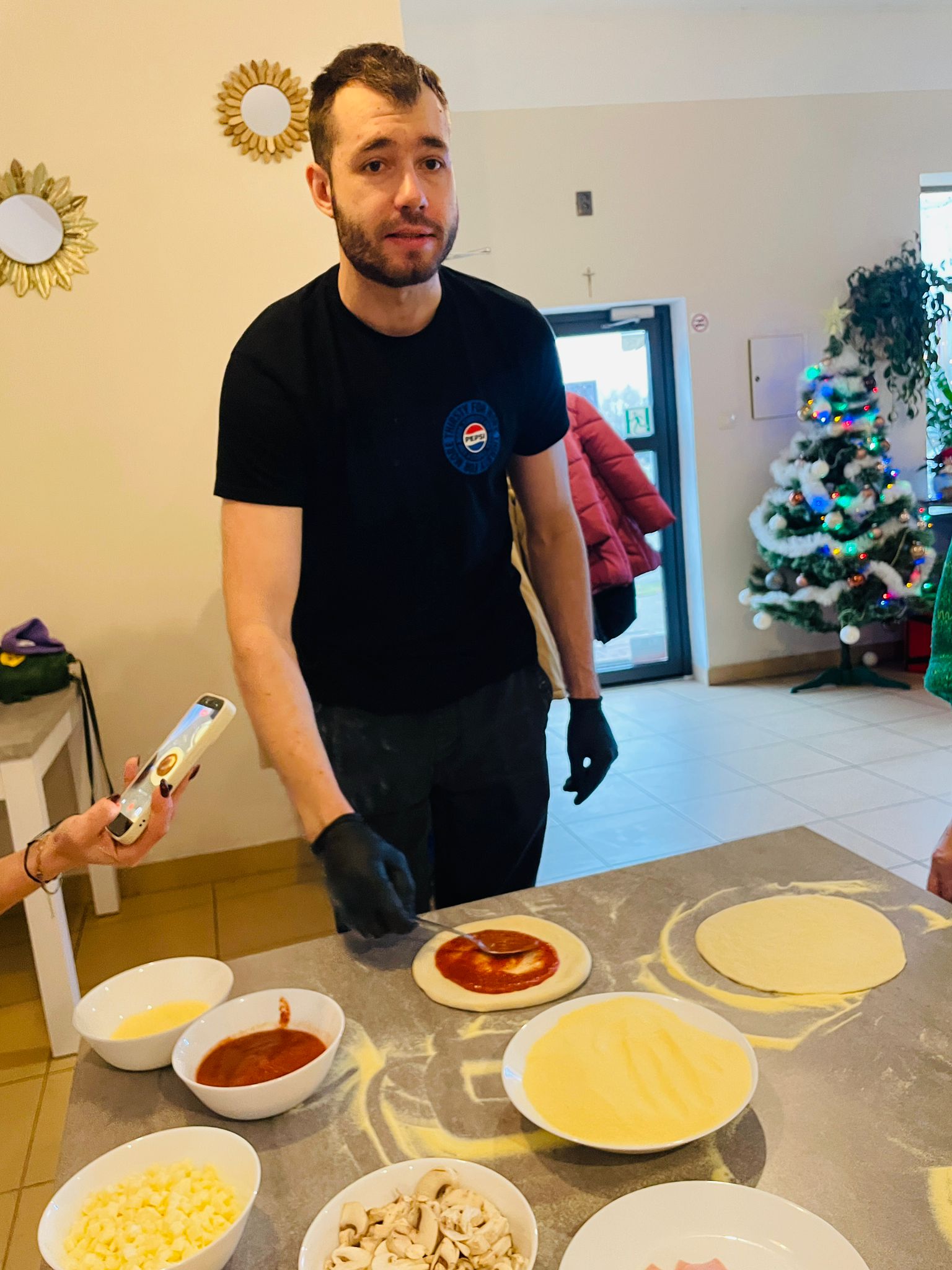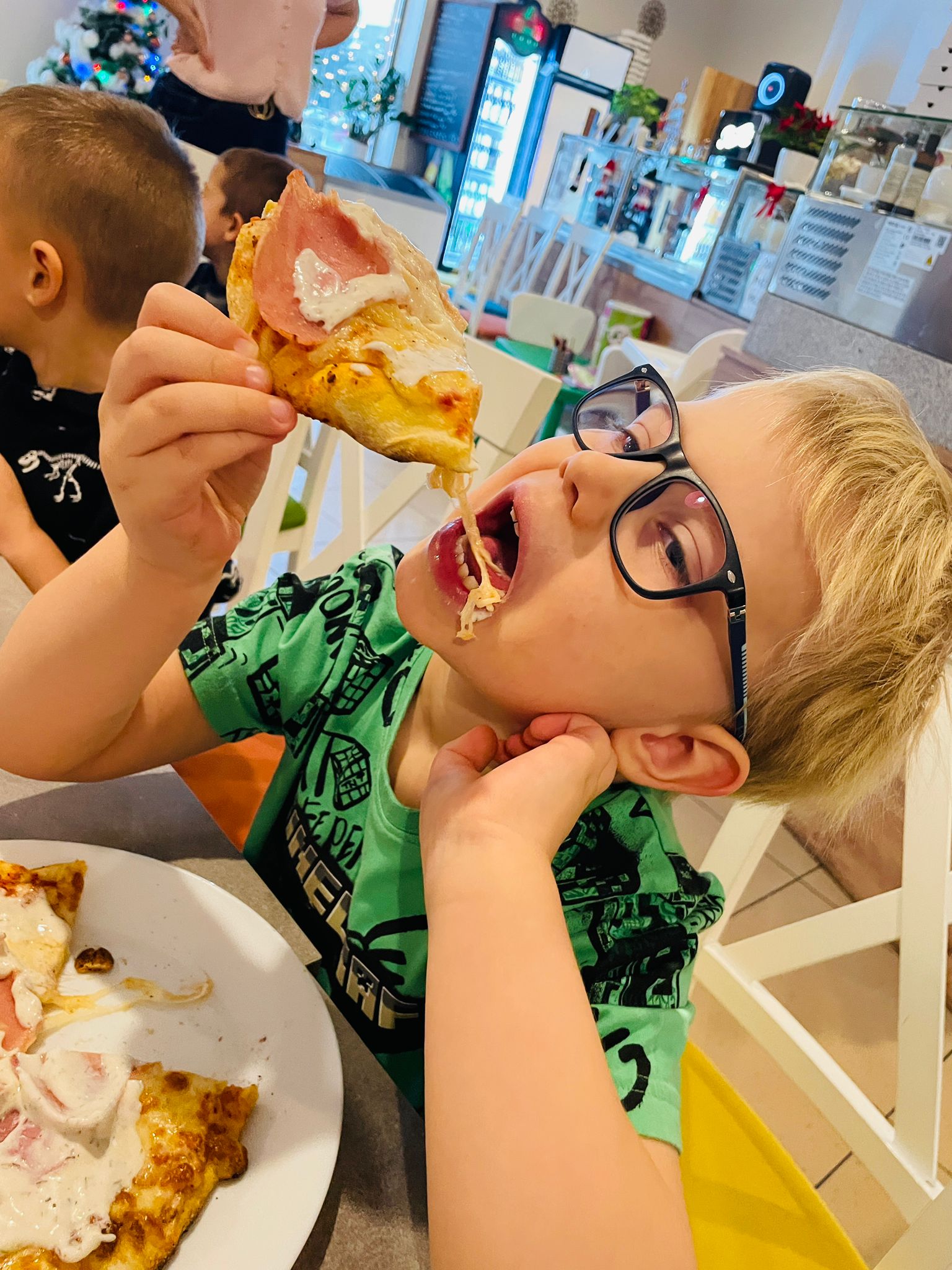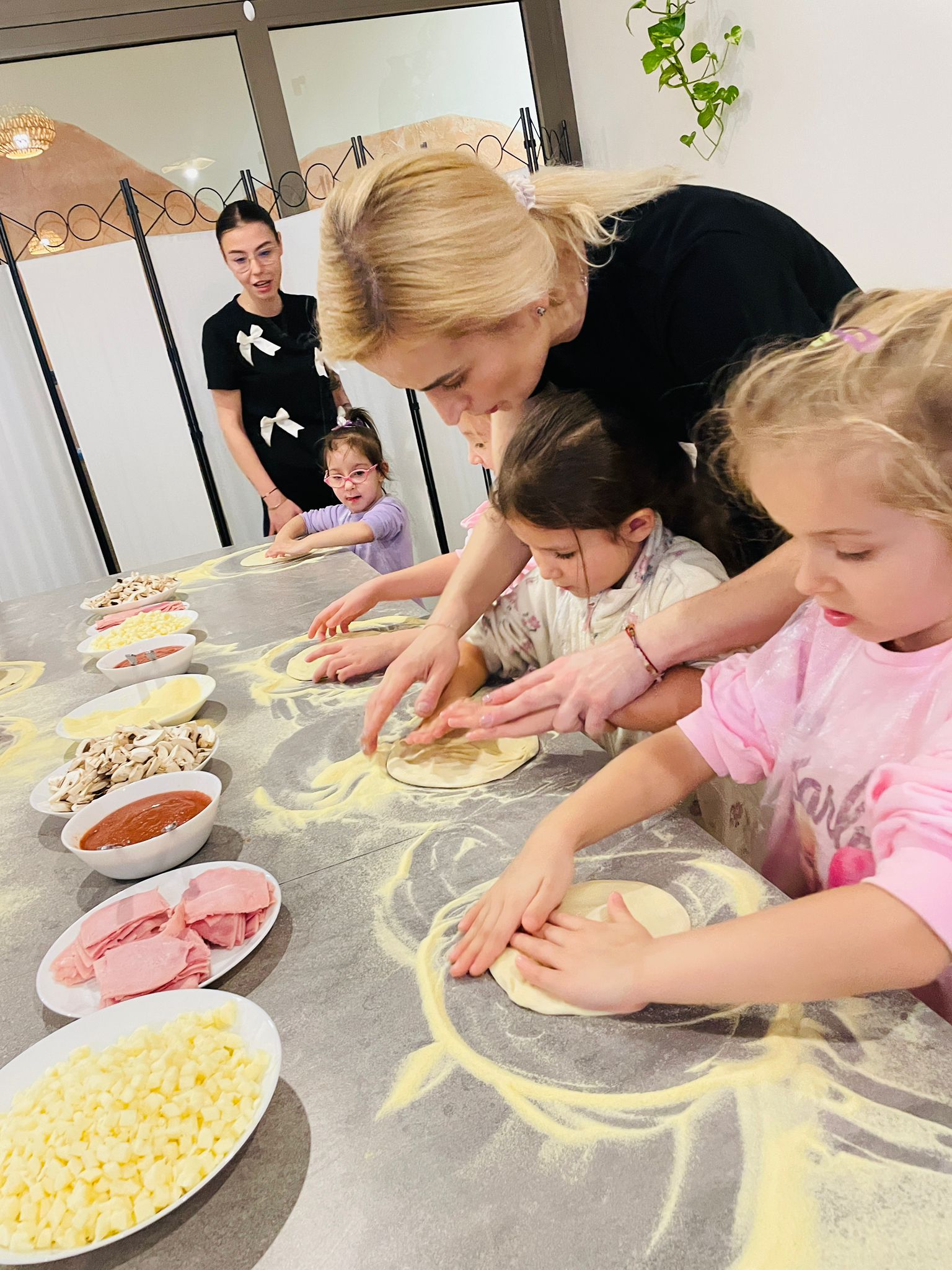 Kolejne kulinarne przygody za nami. Przedszkolaki z gr. XI miały okazję uczestniczyć w warsztatach z robienia pizzy organizowanych w pobliskiej Restauracji "Osiedlowa". Na początku szefowa kuchni- p. Ania, przybliżyła dzieciom historię pizzy. Następnie do akcji wkroczył p. Oliwer- pizzerman, który pokazał dzieciom, jak przejść do części praktycznej. Chłopcy i dziewczynki samodzielnie sypali mąkę, wyrabiali ciasto, a na koniec dodawali ulubione smakołyki. Po wypieczeniu pizzy w specjalnym piecu przyszedł czas na pałaszowanie. Dzieci pracowały z niezwykłym zaangażowaniem, a czekając na wypiek zaśpiewały pracownikom restauracji świąteczną piosenkę. To był niezwykle miły czas.