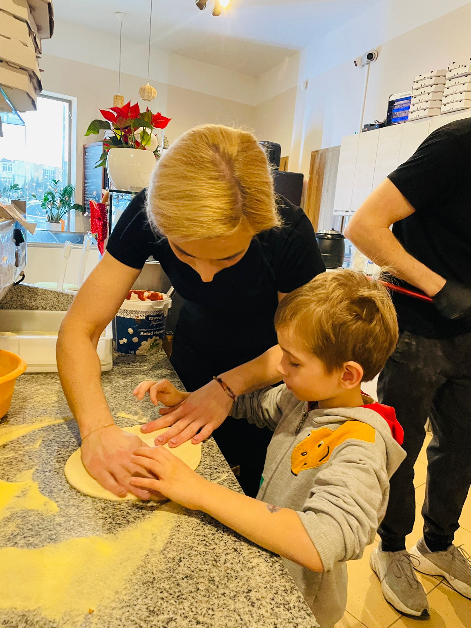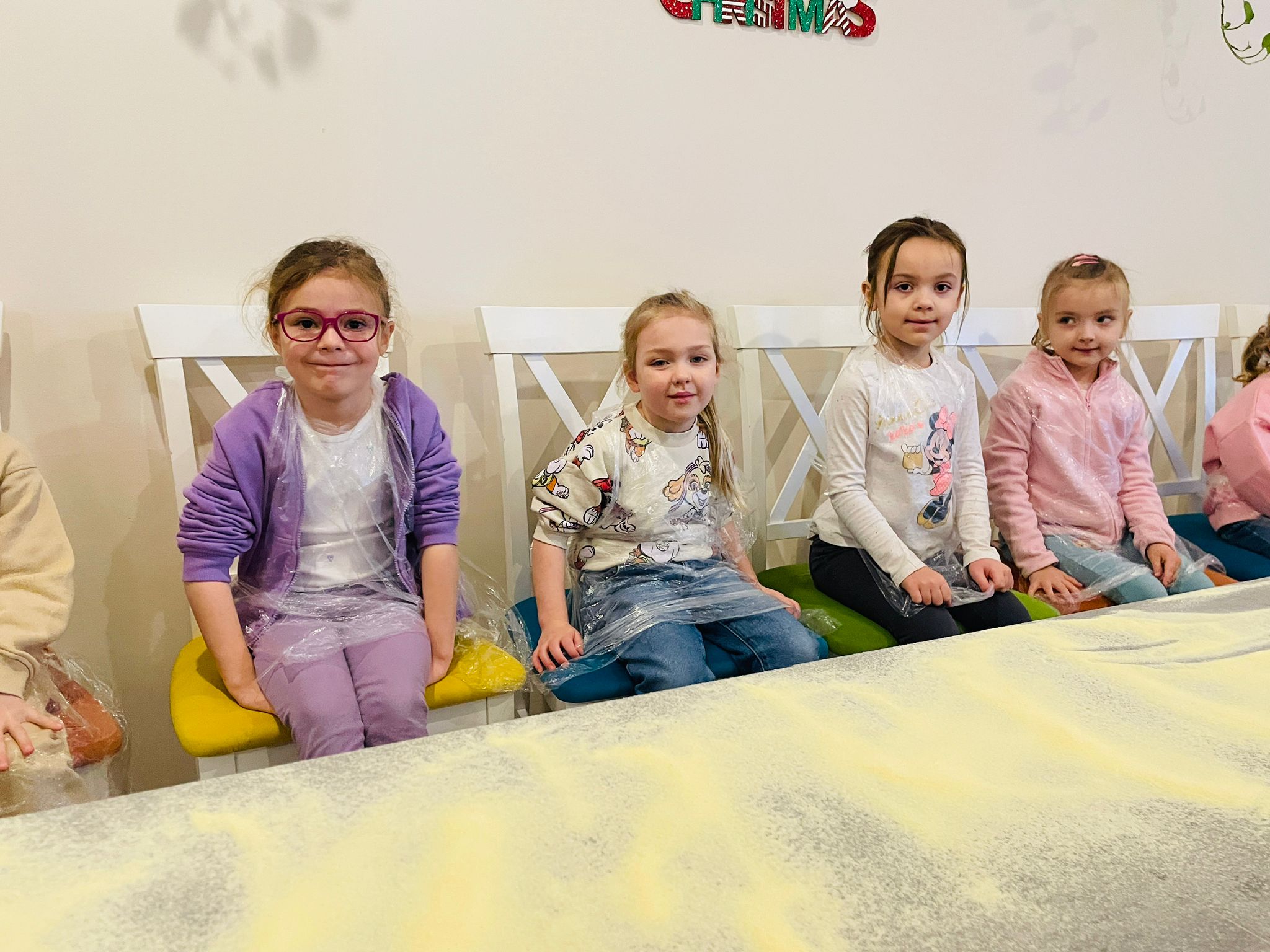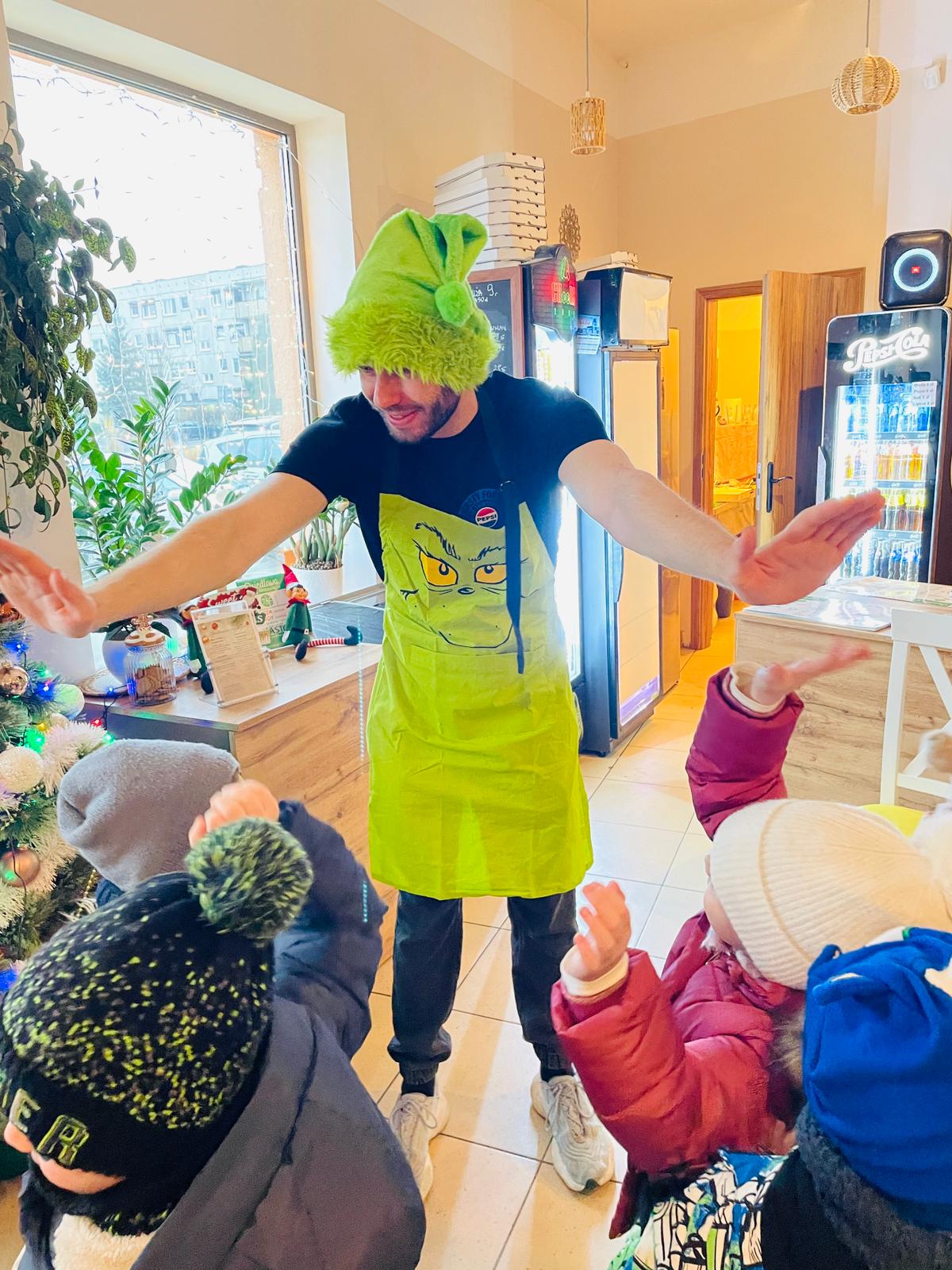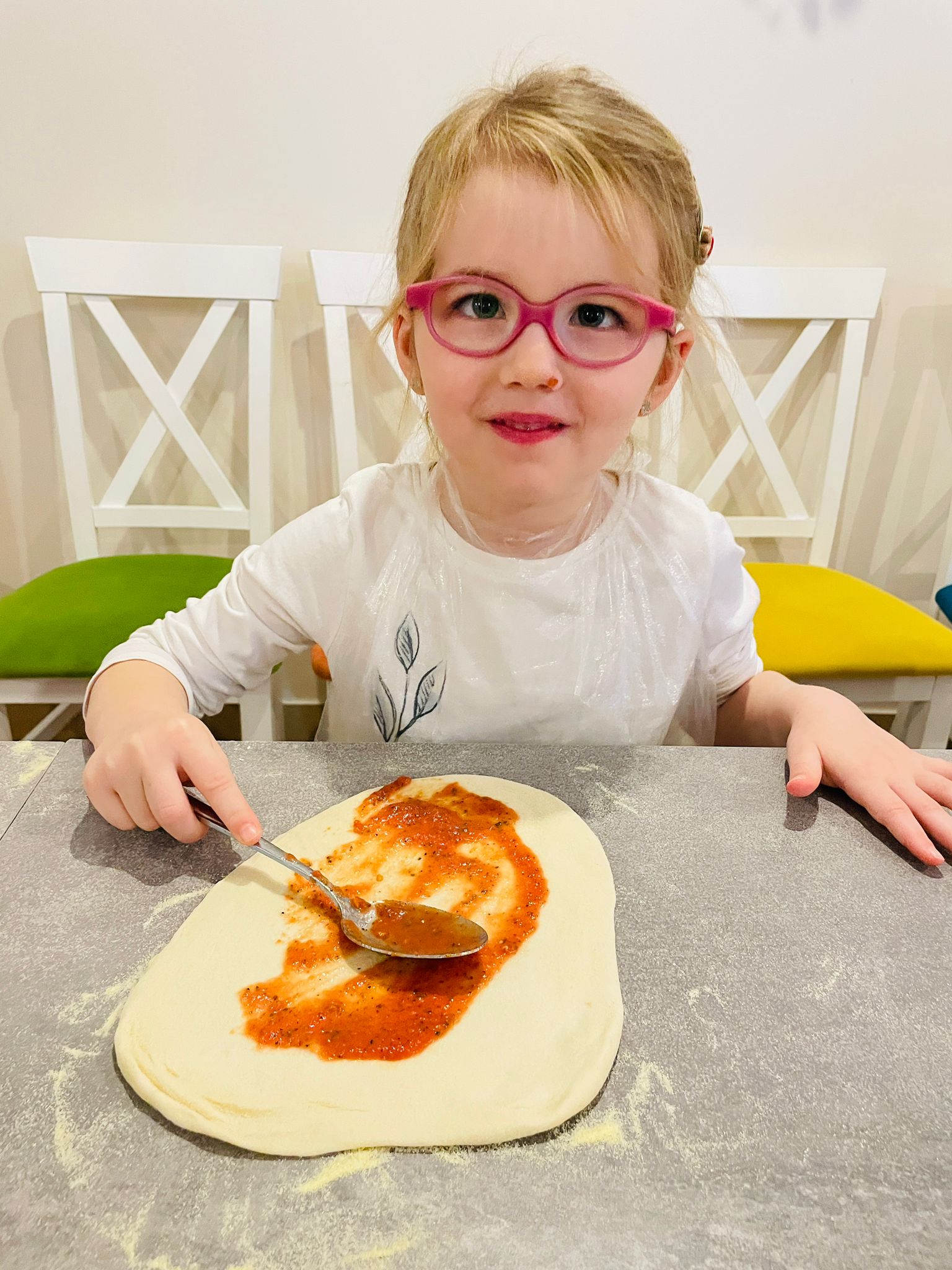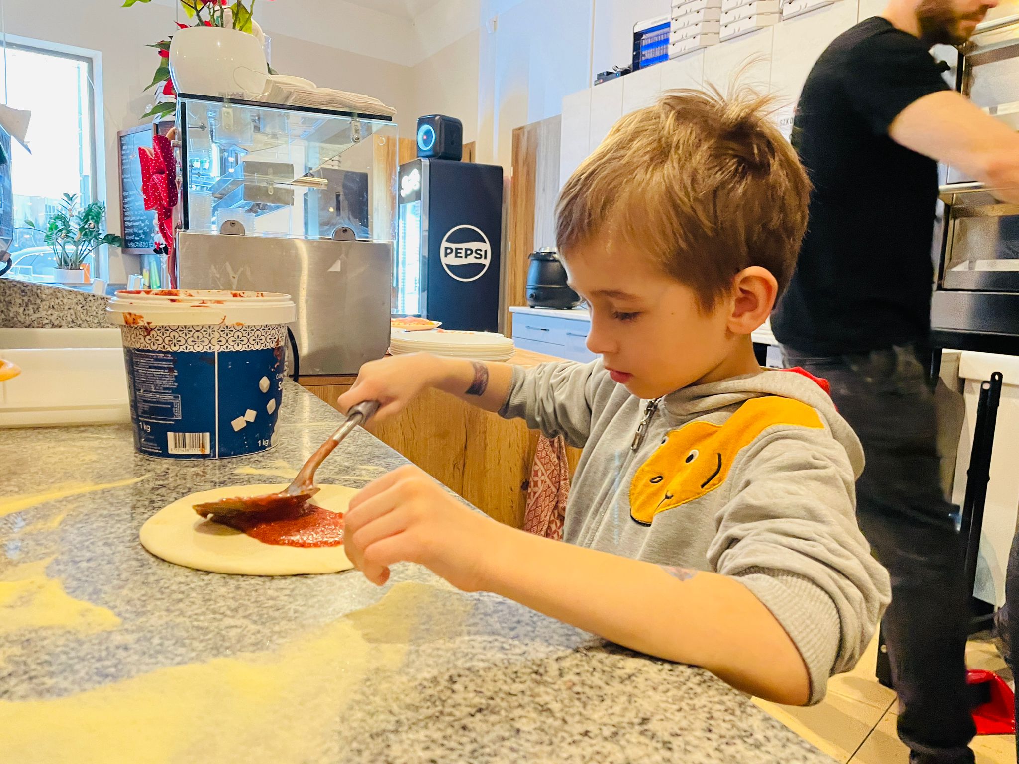 Kolejne kulinarne przygody za nami. Przedszkolaki z gr. XI miały okazję uczestniczyć w warsztatach z robienia pizzy organizowanych w pobliskiej Restauracji "Osiedlowa". Na początku szefowa kuchni- p. Ania, przybliżyła dzieciom historię pizzy. Następnie do akcji wkroczył p. Oliwer- pizzerman, który pokazał dzieciom, jak przejść do części praktycznej. Chłopcy i dziewczynki samodzielnie sypali mąkę, wyrabiali ciasto, a na koniec dodawali ulubione smakołyki. Po wypieczeniu pizzy w specjalnym piecu przyszedł czas na pałaszowanie. Dzieci pracowały z niezwykłym zaangażowaniem, a czekając na wypiek zaśpiewały pracownikom restauracji świąteczną piosenkę. To był niezwykle miły czas.