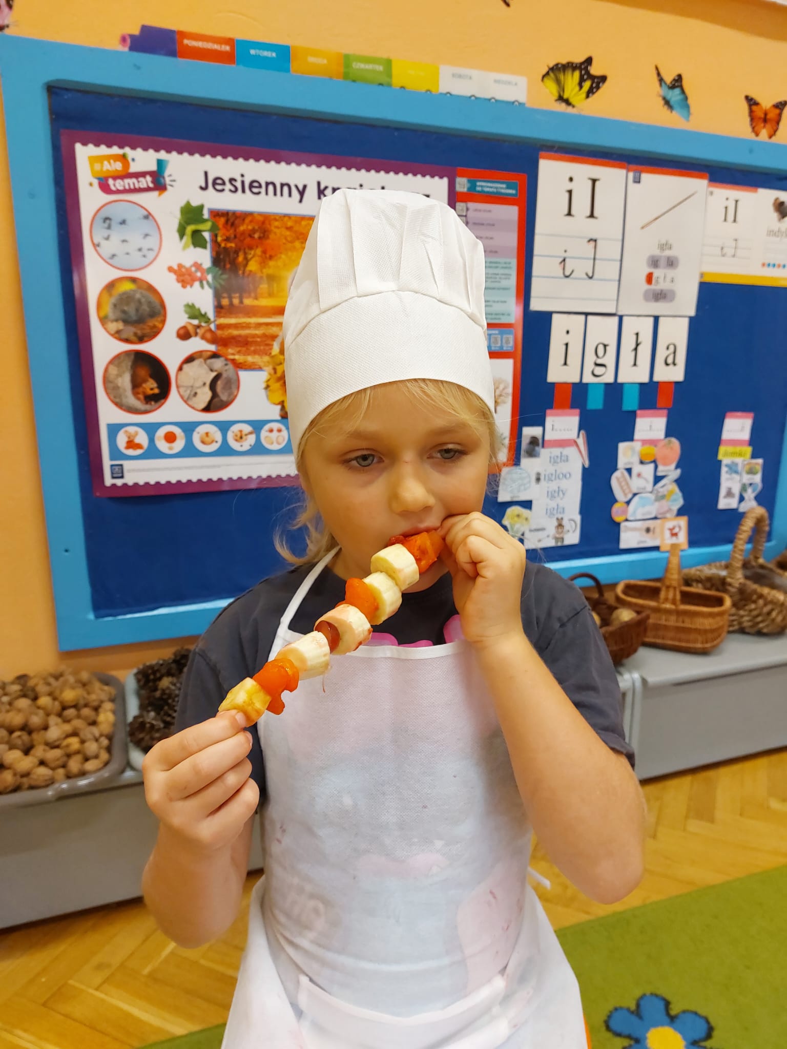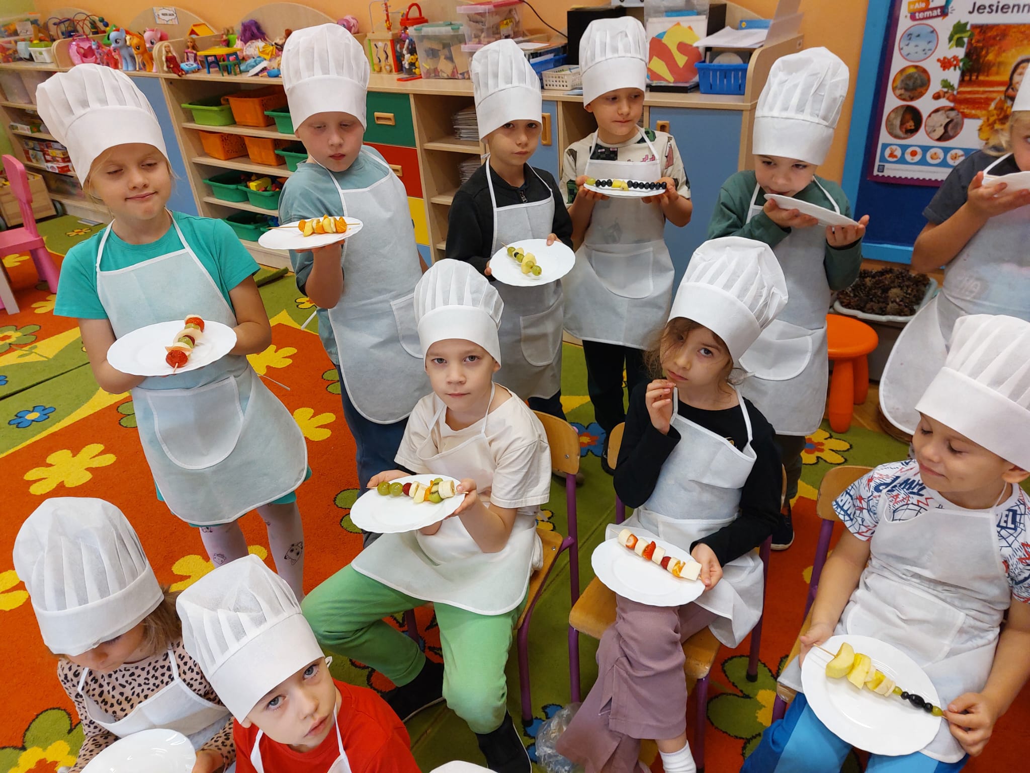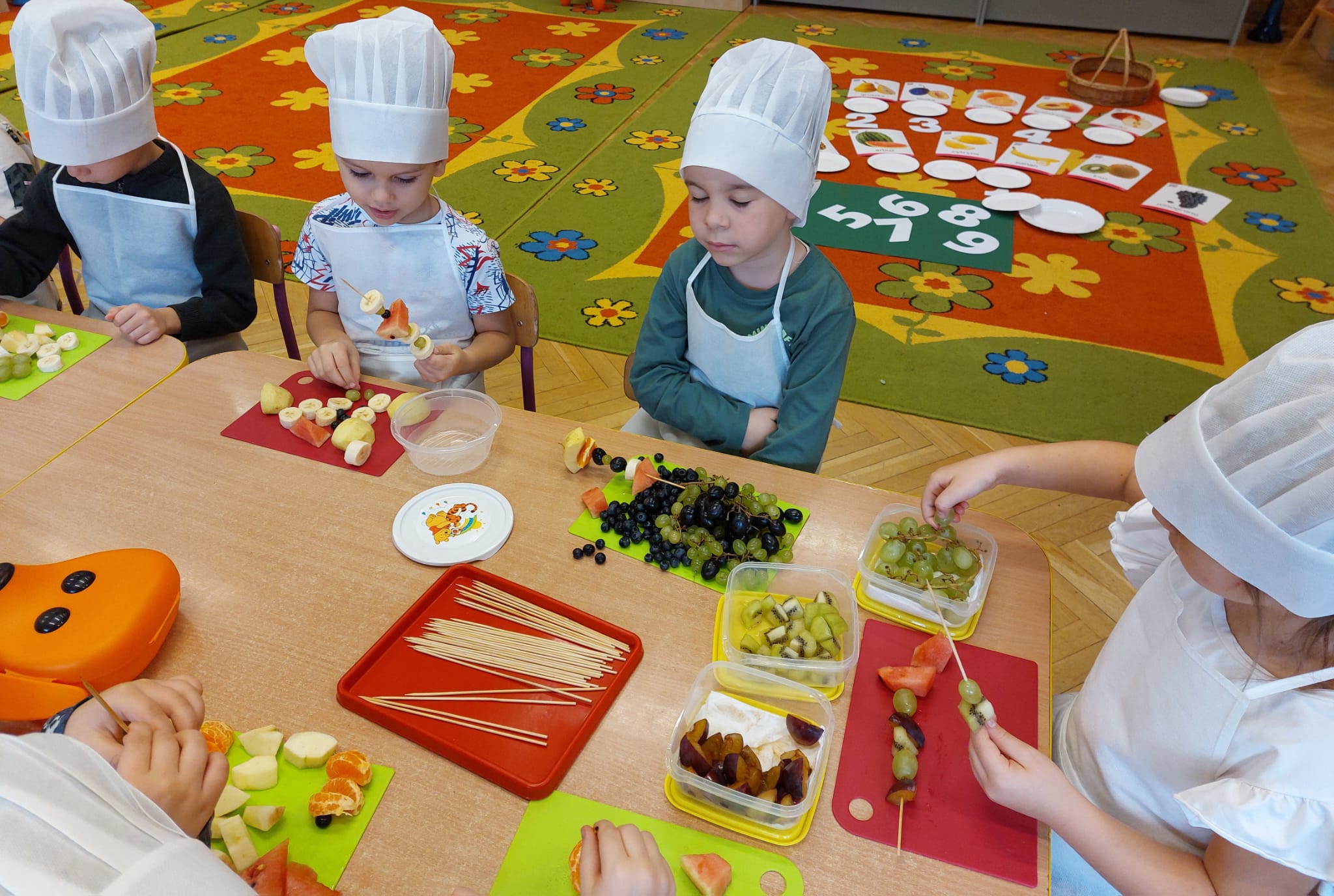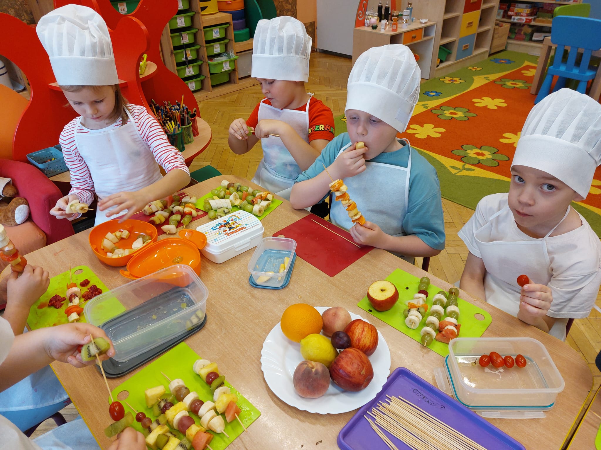 ,,Tup, tup…Pani Jesień owoce w koszu niesie…” pod takim hasłem, dzieci 6-letnie wykonały zdrowe i kolorowe szaszłyki. Celem dzisiejszych kulinarnych doświadczeń było m.in. promowanie zdrowego stylu życia, uświadamianie znaczenia spożywania owoców dla zdrowia, zachęcanie do spożywania owoców oraz ich przetworów, uświadamianie ich wartości odżywczych dla prawidłowego rozwoju, wyrabianie nawyku zdrowego odżywiania, doskonalenie umiejętności współpracy w grupie, jak również dostarczenie radości ze wspólnej zabawy.