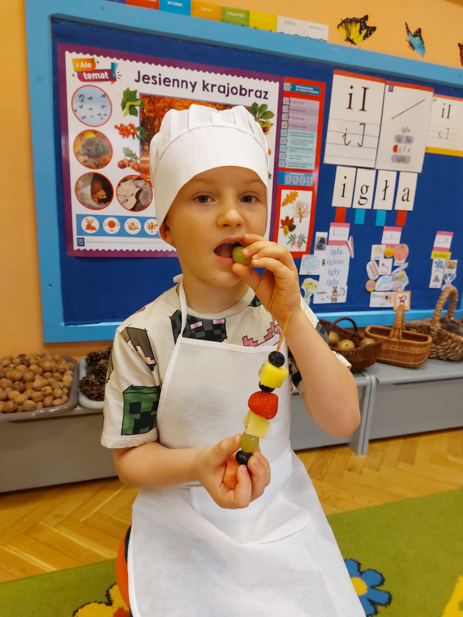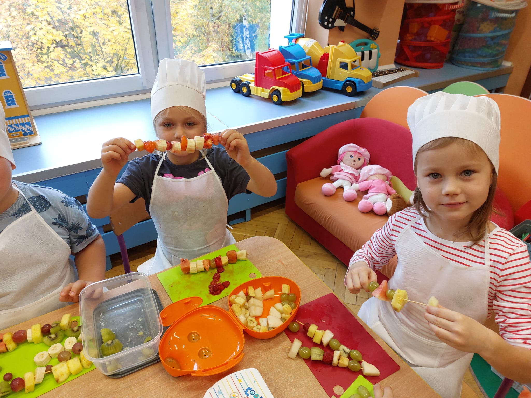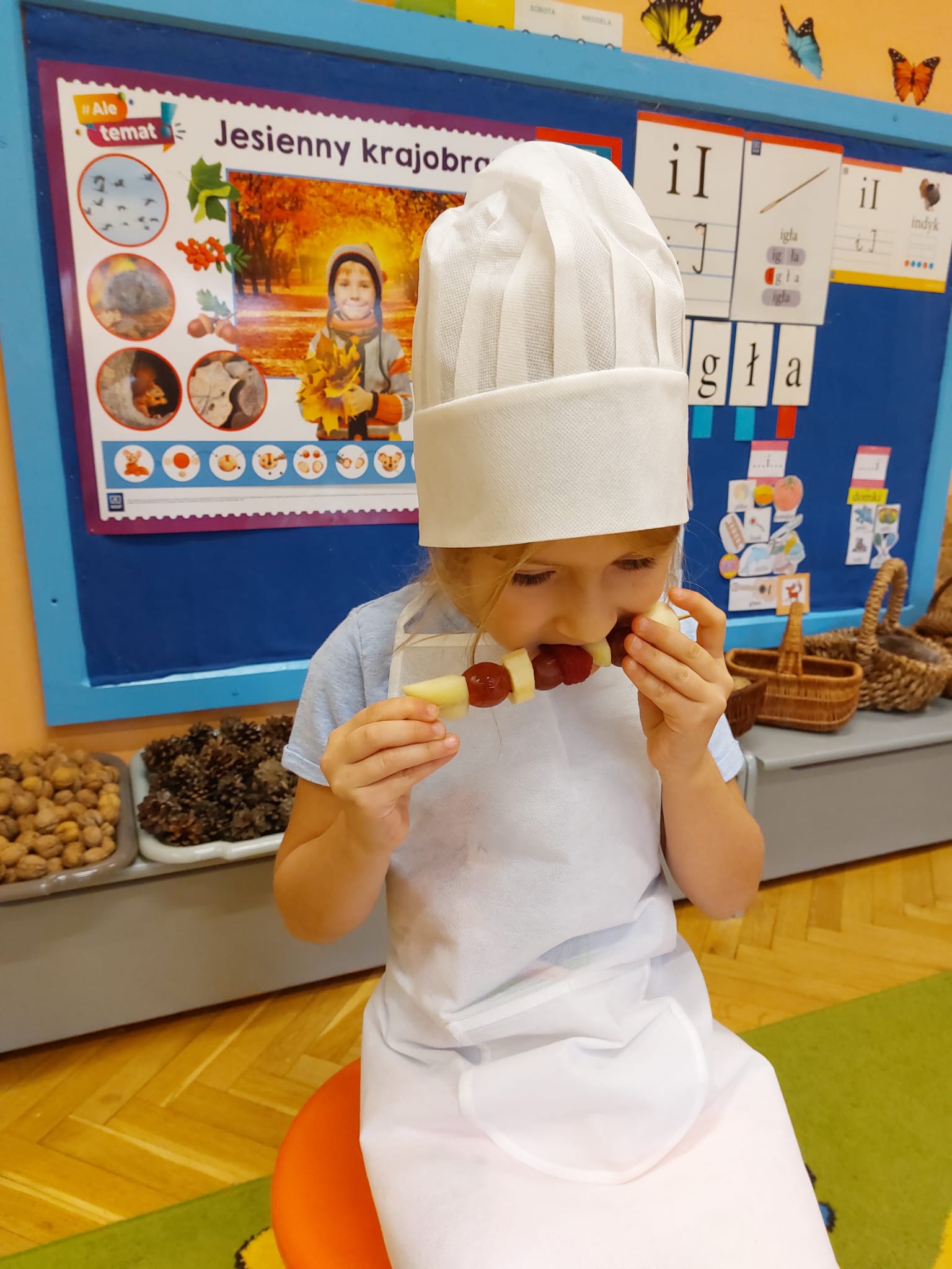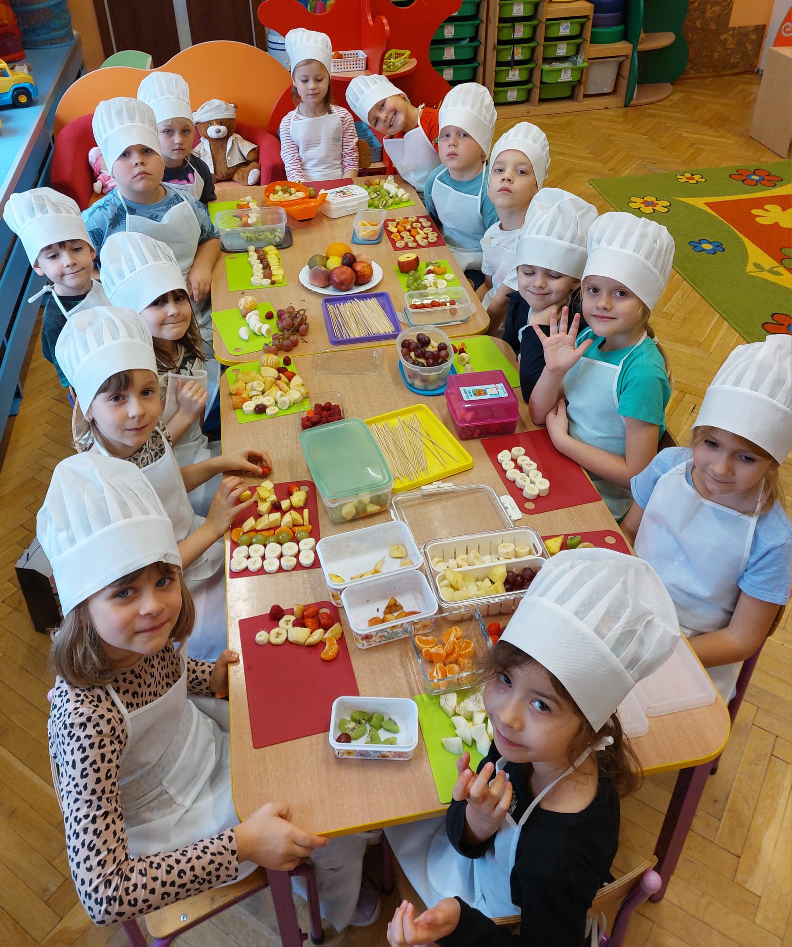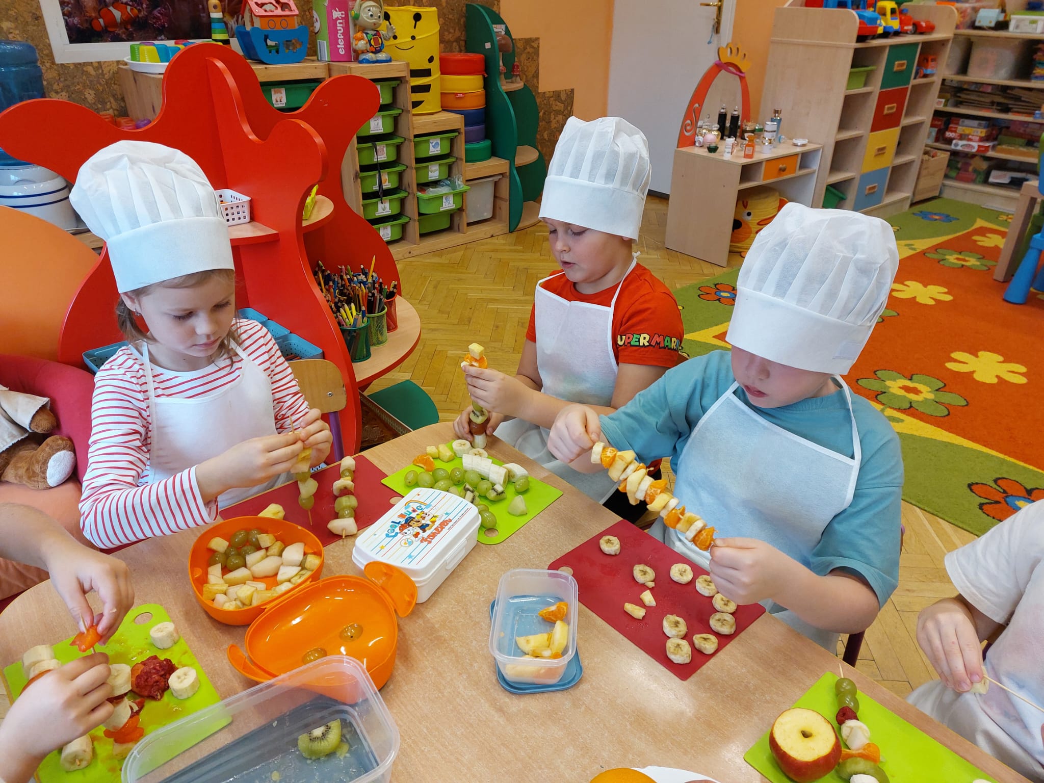,,Tup, tup…Pani Jesień owoce w koszu niesie…” pod takim hasłem, dzieci 6-letnie wykonały zdrowe i kolorowe szaszłyki. Celem dzisiejszych kulinarnych doświadczeń było m.in. promowanie zdrowego stylu życia, uświadamianie znaczenia spożywania owoców dla zdrowia, zachęcanie do spożywania owoców oraz ich przetworów, uświadamianie ich wartości odżywczych dla prawidłowego rozwoju, wyrabianie nawyku zdrowego odżywiania, doskonalenie umiejętności współpracy w grupie, jak również dostarczenie radości ze wspólnej zabawy.