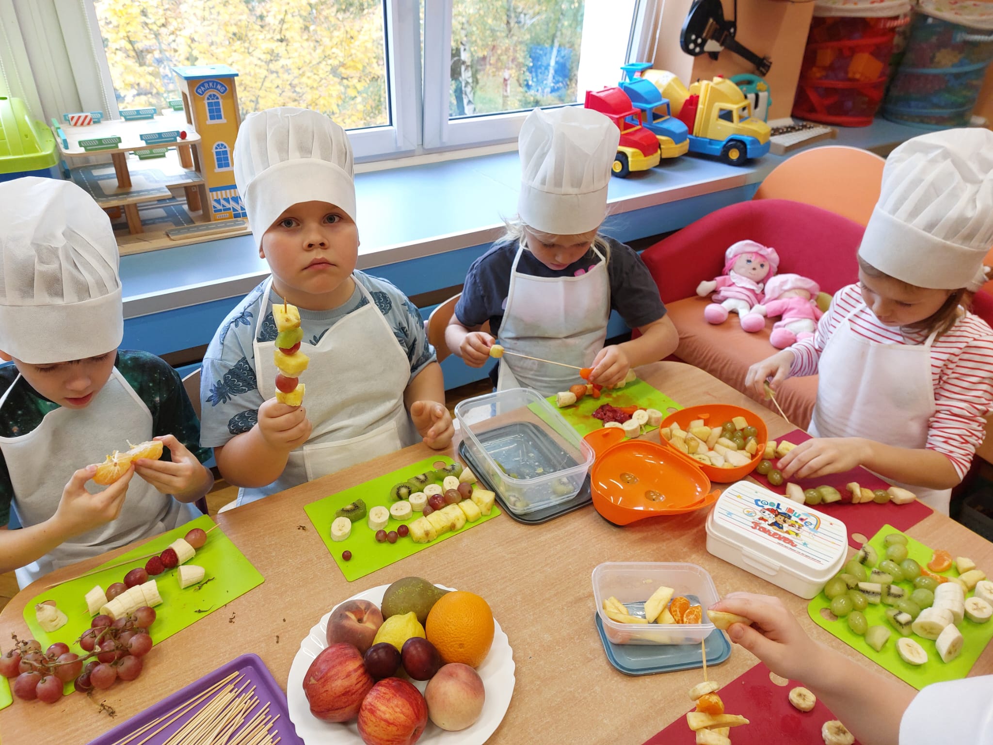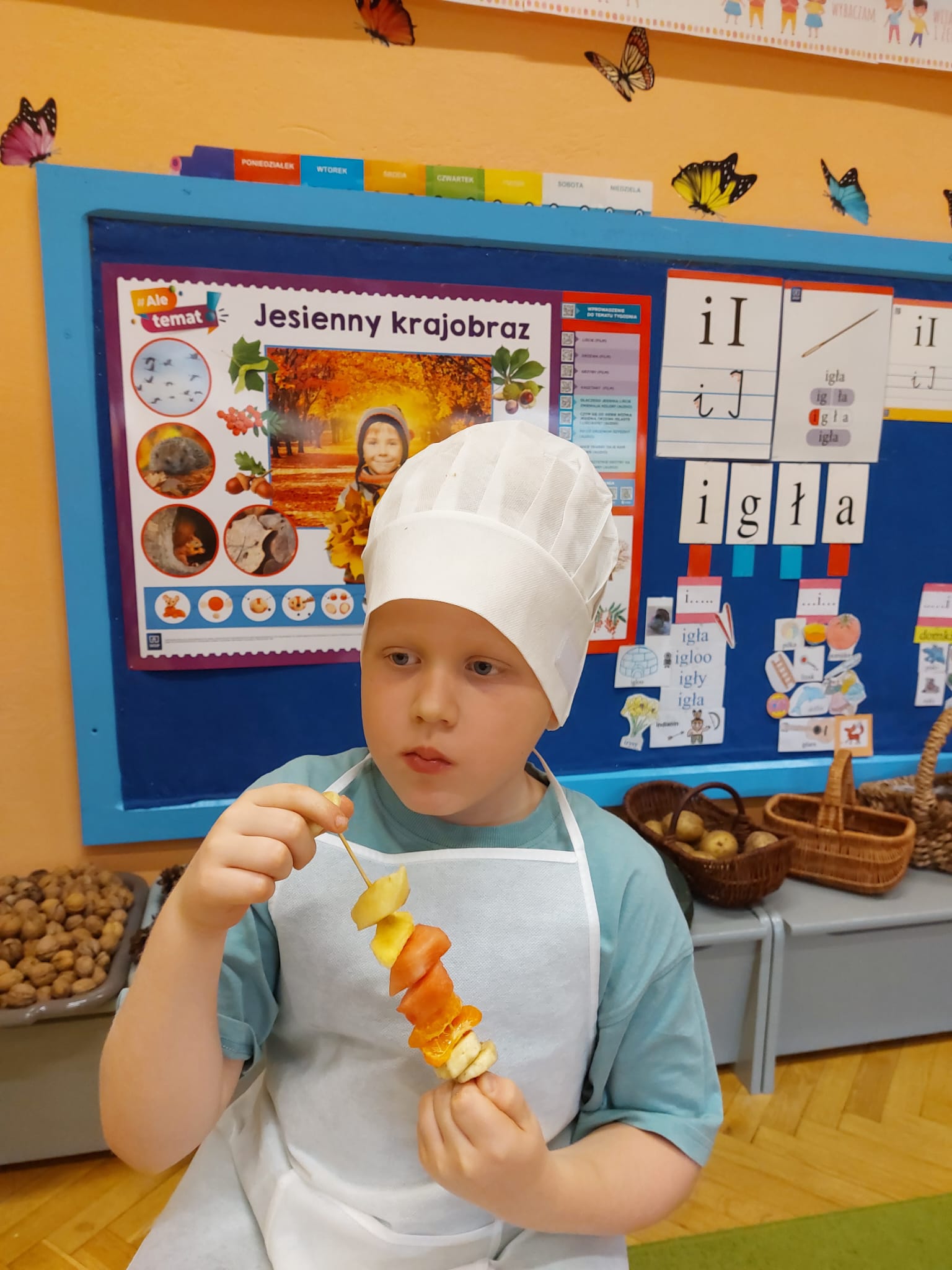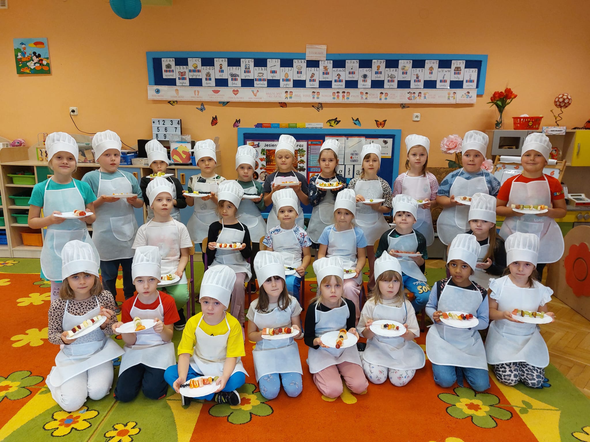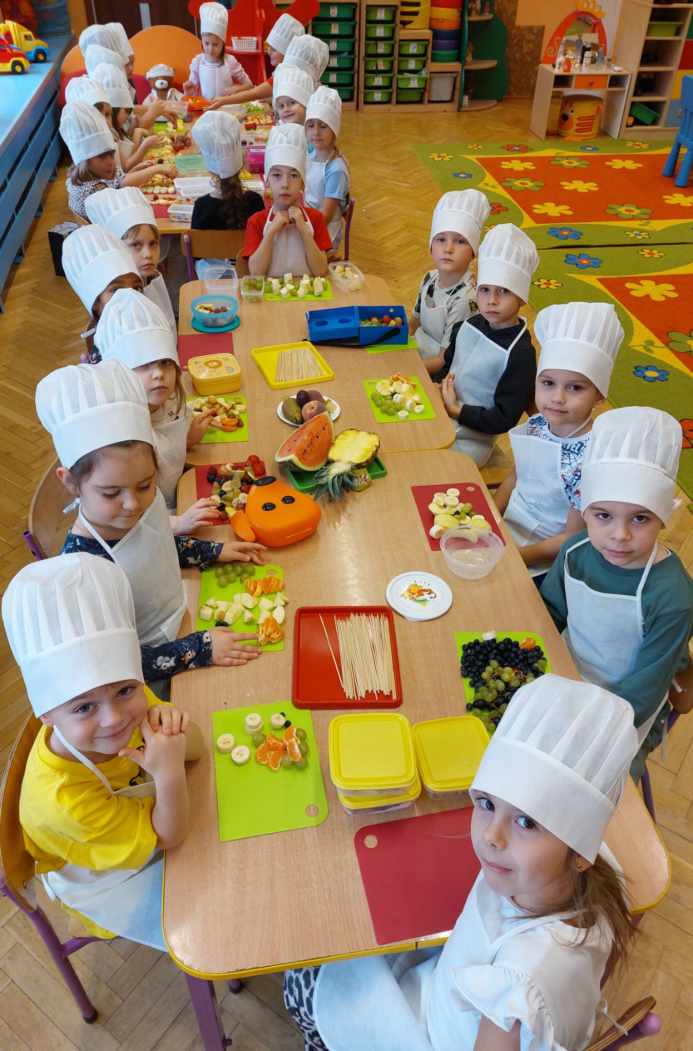 ,,Tup, tup…Pani Jesień owoce w koszu niesie…” pod takim hasłem, dzieci 6-letnie wykonały zdrowe i kolorowe szaszłyki. Celem dzisiejszych kulinarnych doświadczeń było m.in. promowanie zdrowego stylu życia, uświadamianie znaczenia spożywania owoców dla zdrowia, zachęcanie do spożywania owoców oraz ich przetworów, uświadamianie ich wartości odżywczych dla prawidłowego rozwoju, wyrabianie nawyku zdrowego odżywiania, doskonalenie umiejętności współpracy w grupie, jak również dostarczenie radości ze wspólnej zabawy.