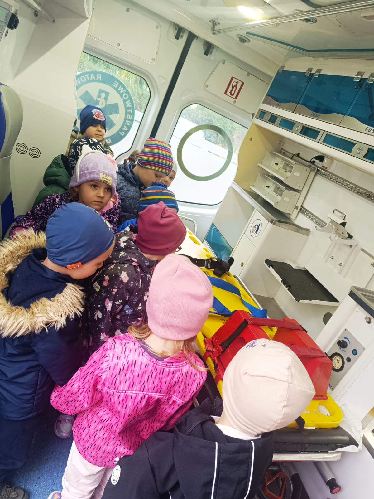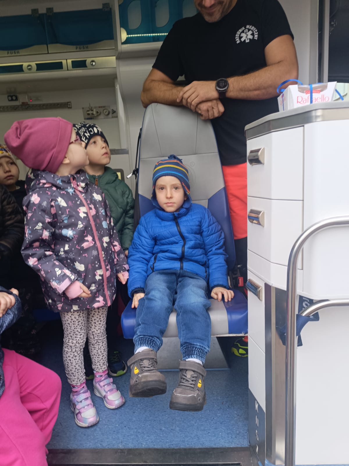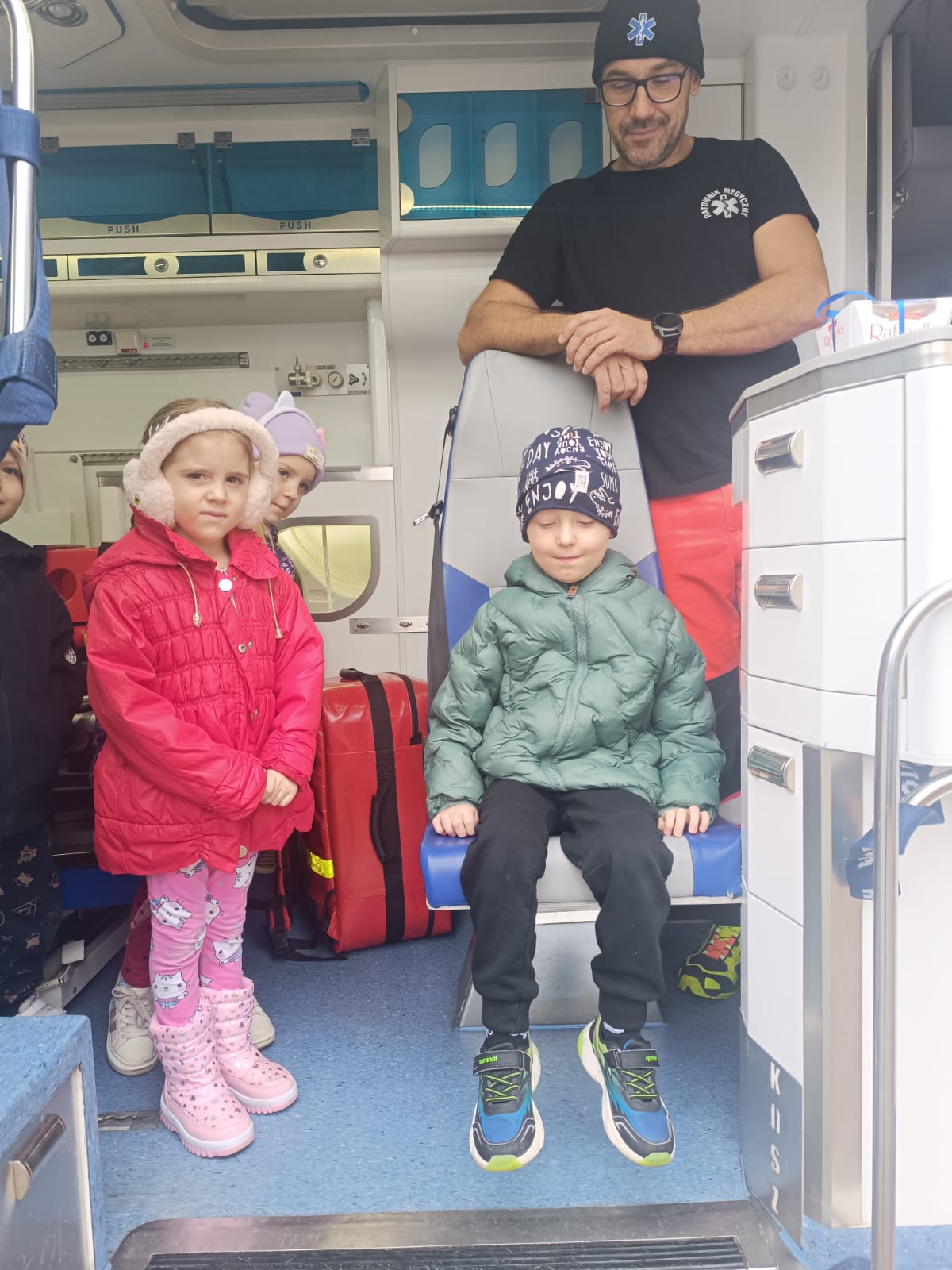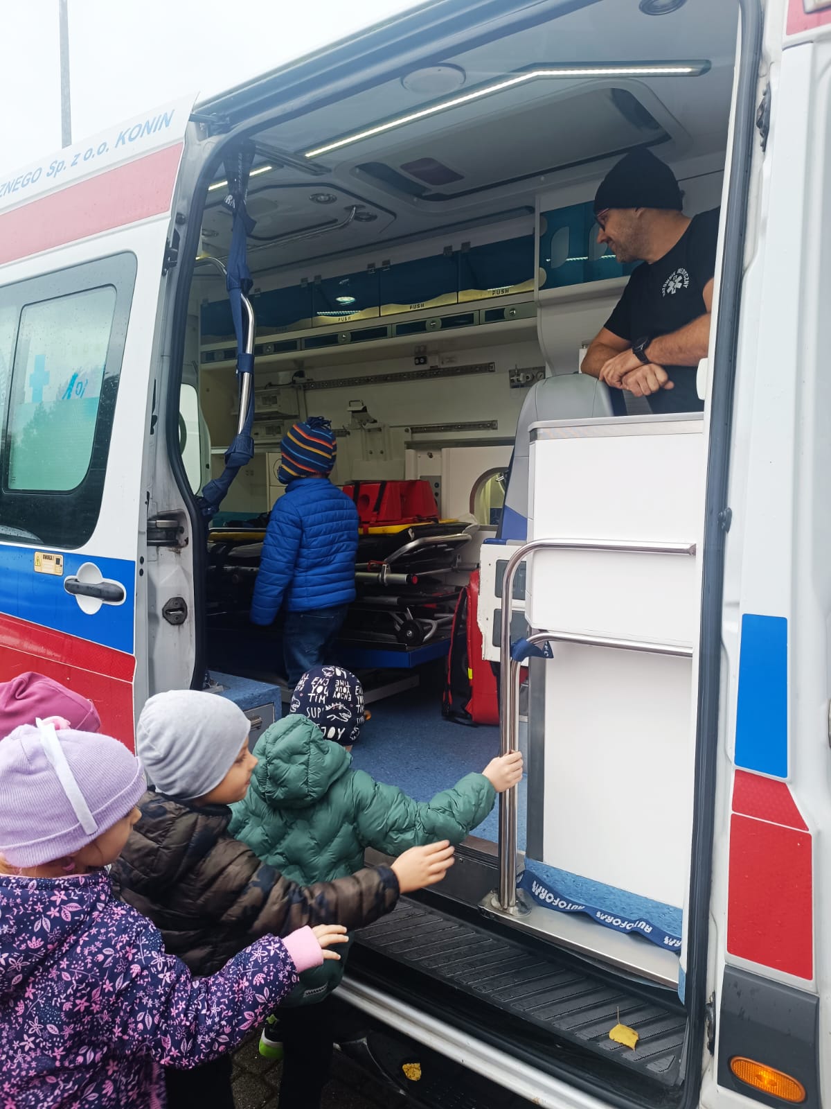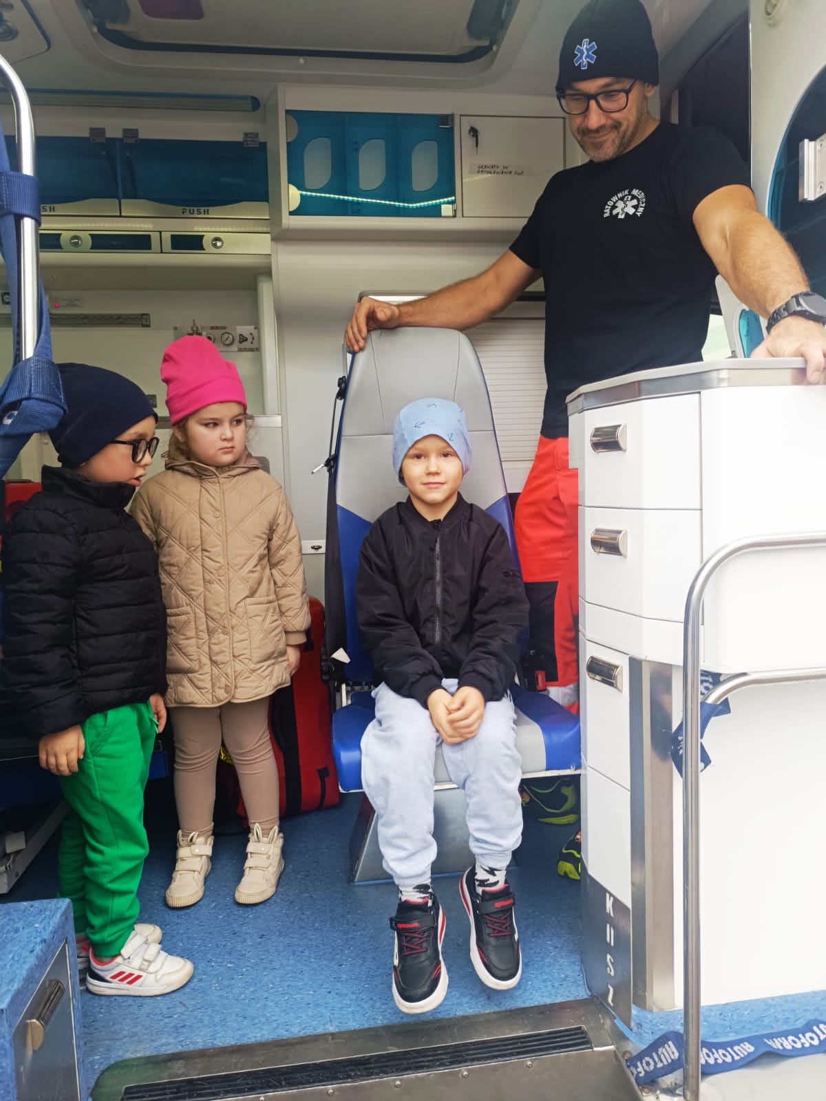 Dnia 28 października w naszym przedszkolu odbyło się wyjątkowe spotkanie z ratownikiem medycznym. Pan Artur Baranowski, który pracuje w Wielkopolskim Centrum Ratownictwa Medycznego w niezwykle przystępny sposób opowiedział dzieciom o swoim zawodzie, niesieniu pomocy i ratowaniu życia. Dzieci miały okazję zobaczyć z bliska karetkę pogotowia i przekonać się, jak ważna jest organizacja stanowiska pracy, gdy trwa walka o zdrowie i życie pacjenta. Podczas zajęć dzieci poznały podstawowe zasady udzielania pierwszej pomocy, zobaczyły torbę ratowniczą i akcesoria, które mogą się przydać przy mniejszym i większym wypadku, nosze i inne niezbędne atrybuty używane podczas akcji ratunkowych. Przedszkolaki z dużym zainteresowaniem uczestniczyły w pokazie, zadawały wiele pytań, ale również wykazały się zdobytą wcześniej wiedzą. Spotkanie było bardzo pouczające i z pewnością na długo pozostanie w pamięci dzieci.