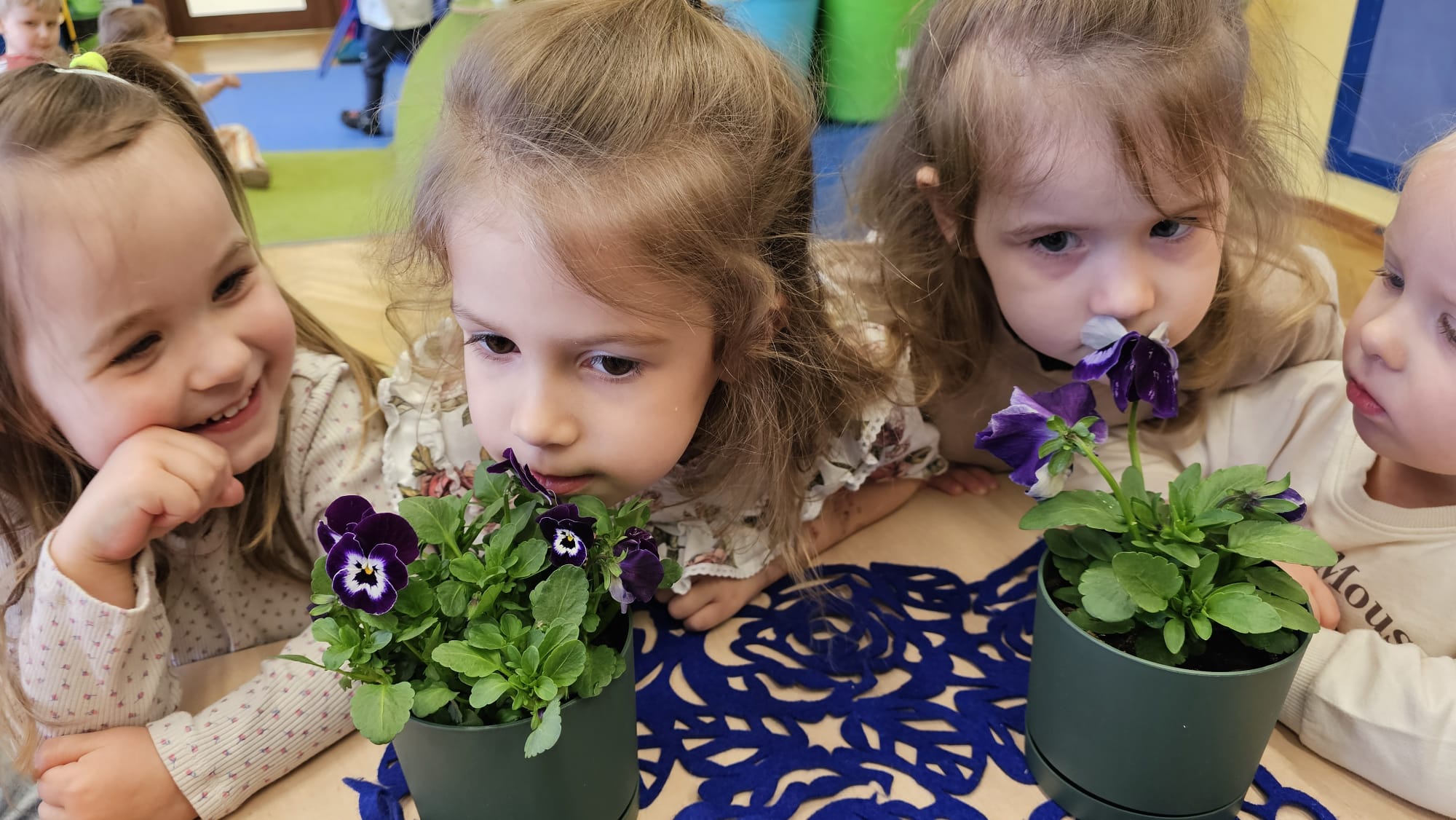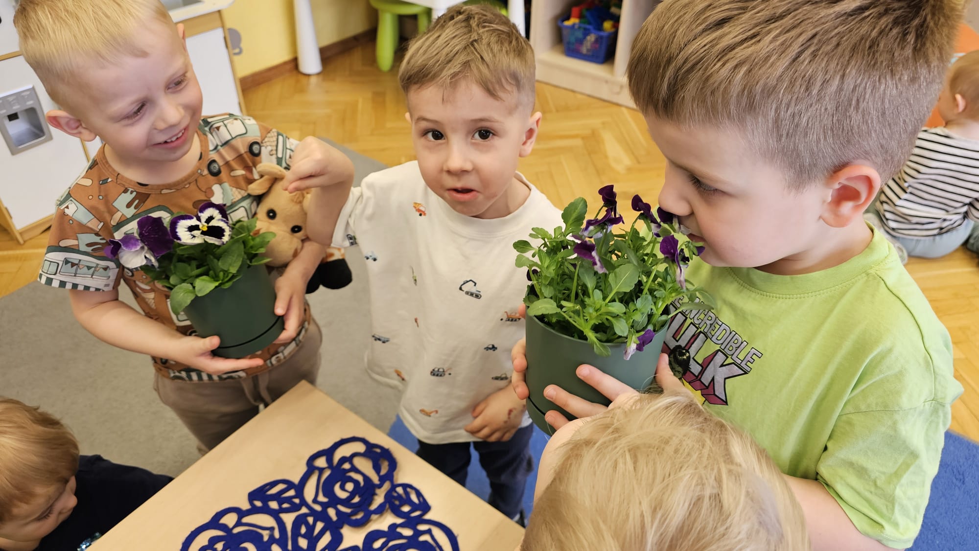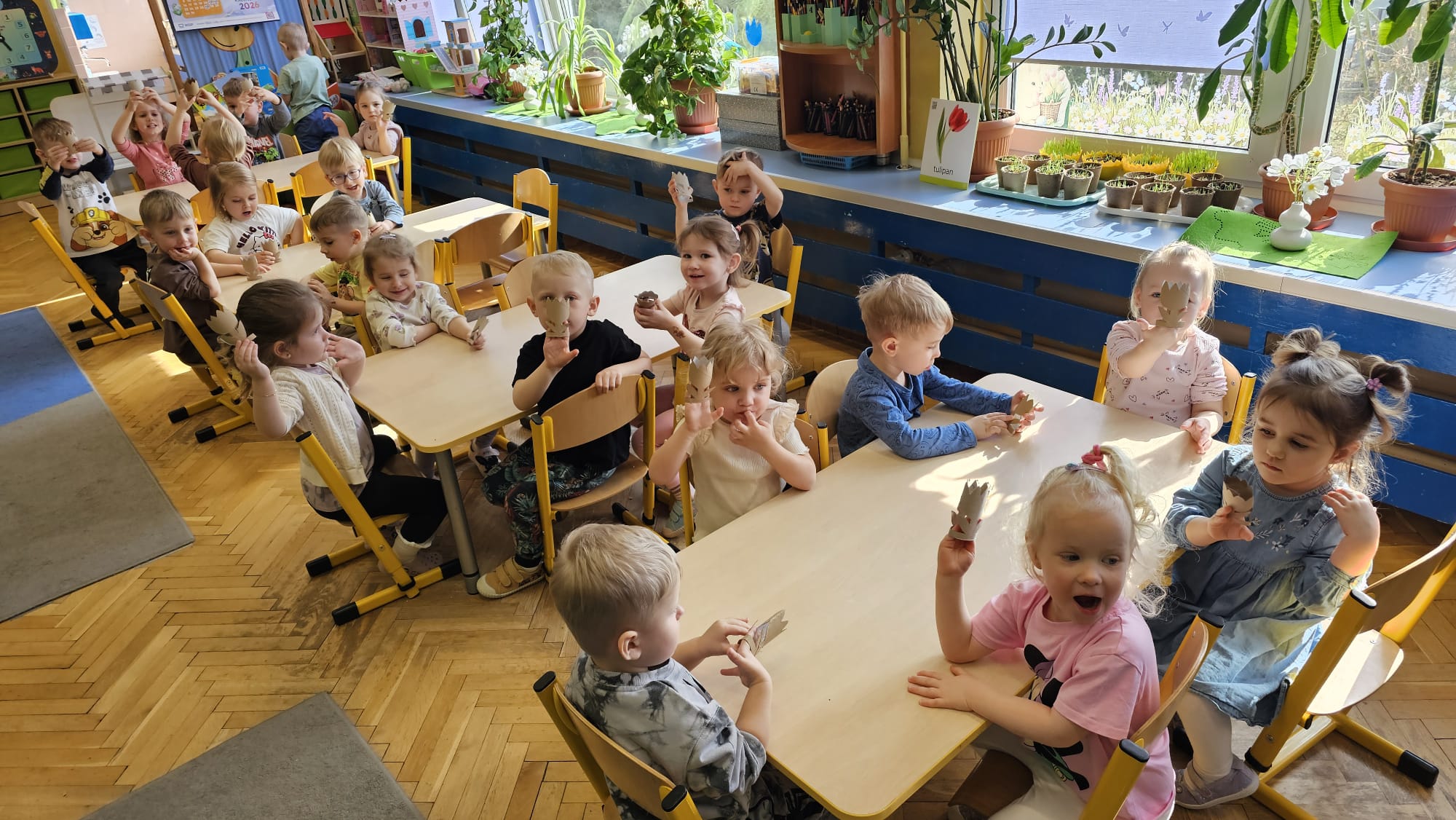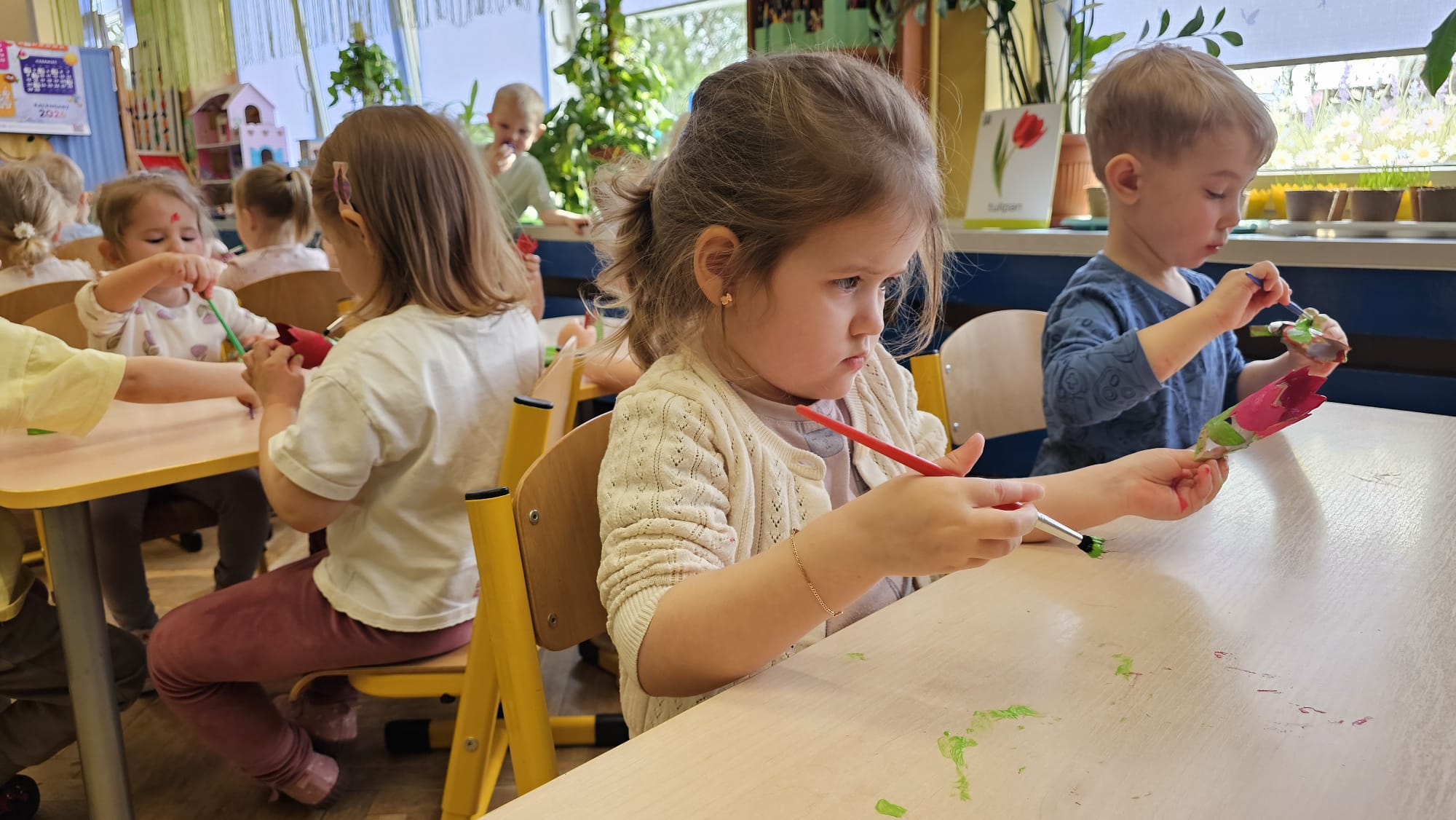 Podczas ostatniego cyklu zajęć pt. „Pierwsze wiosenne kwiatki” dzieci z grupy I maluszków miały okazję poznać pierwsze oznaki wiosny w sposób sensoryczny i artystyczny. Maluchy odkrywały przebiśniegi, hiacynty, tulipany oraz bratki, angażując różne zmysły. Dotykały, oglądały, wąchały i rozmawiały o ich wyglądzie, określały zapach. Dzieci z dużym zaangażowaniem tworzyły również własne kwiatki, wykorzystując różnorodne materiały i techniki plastyczne. Zajęcia były pełne radości, kreatywności i wiosennej atmosfery. Celem zajęć było: rozwijanie percepcji sensorycznej (wzrokowej, dotykowej, węchowej), poznanie wybranych wiosennych kwiatów, rozwijanie sprawności manualnej i kreatywności, kształtowanie umiejętności wypowiadania się i wzbogacanie słownictwa, a przede wszystkim budowanie zainteresowania przyrodą i zmianami zachodzącymi wiosną.