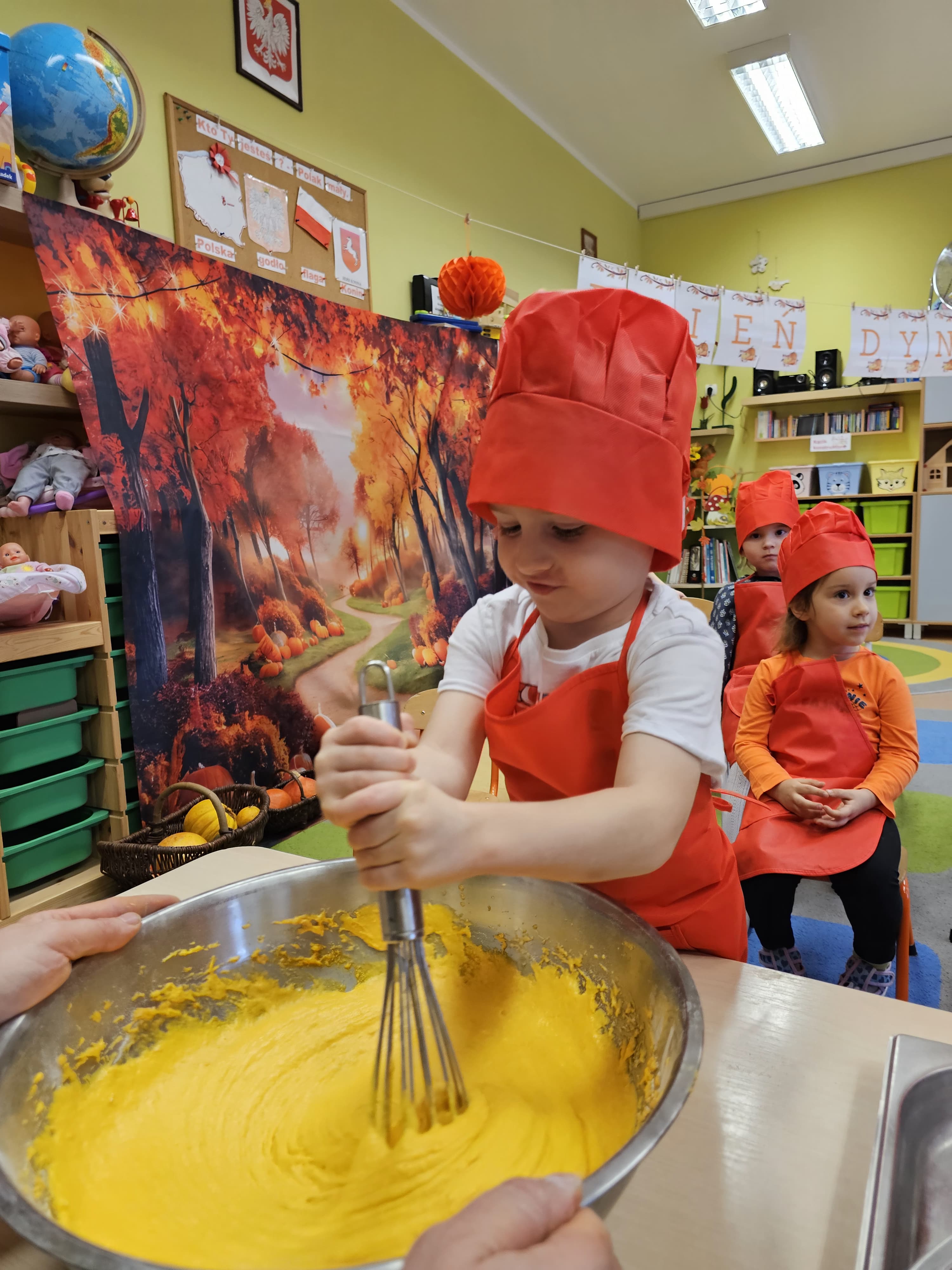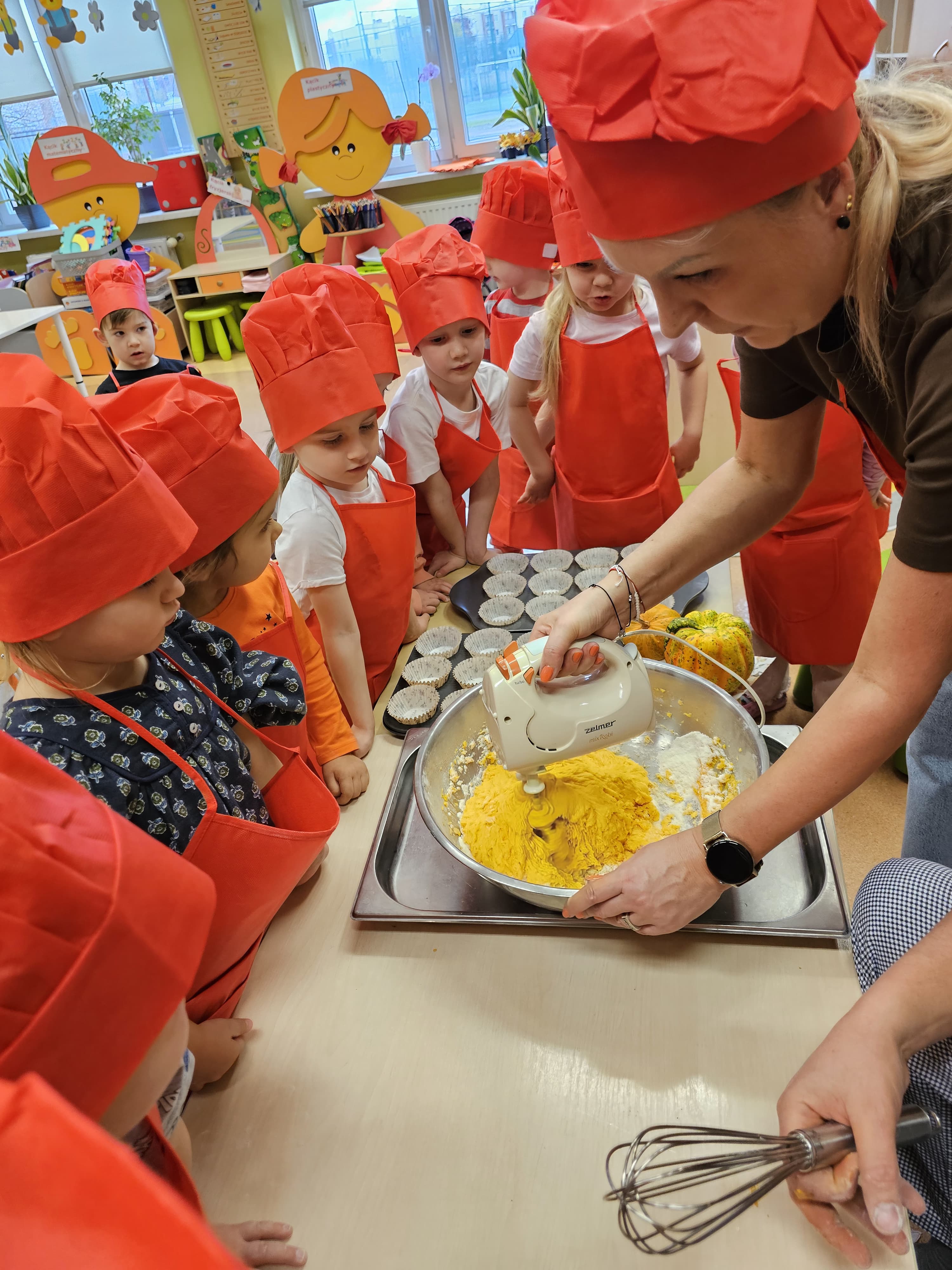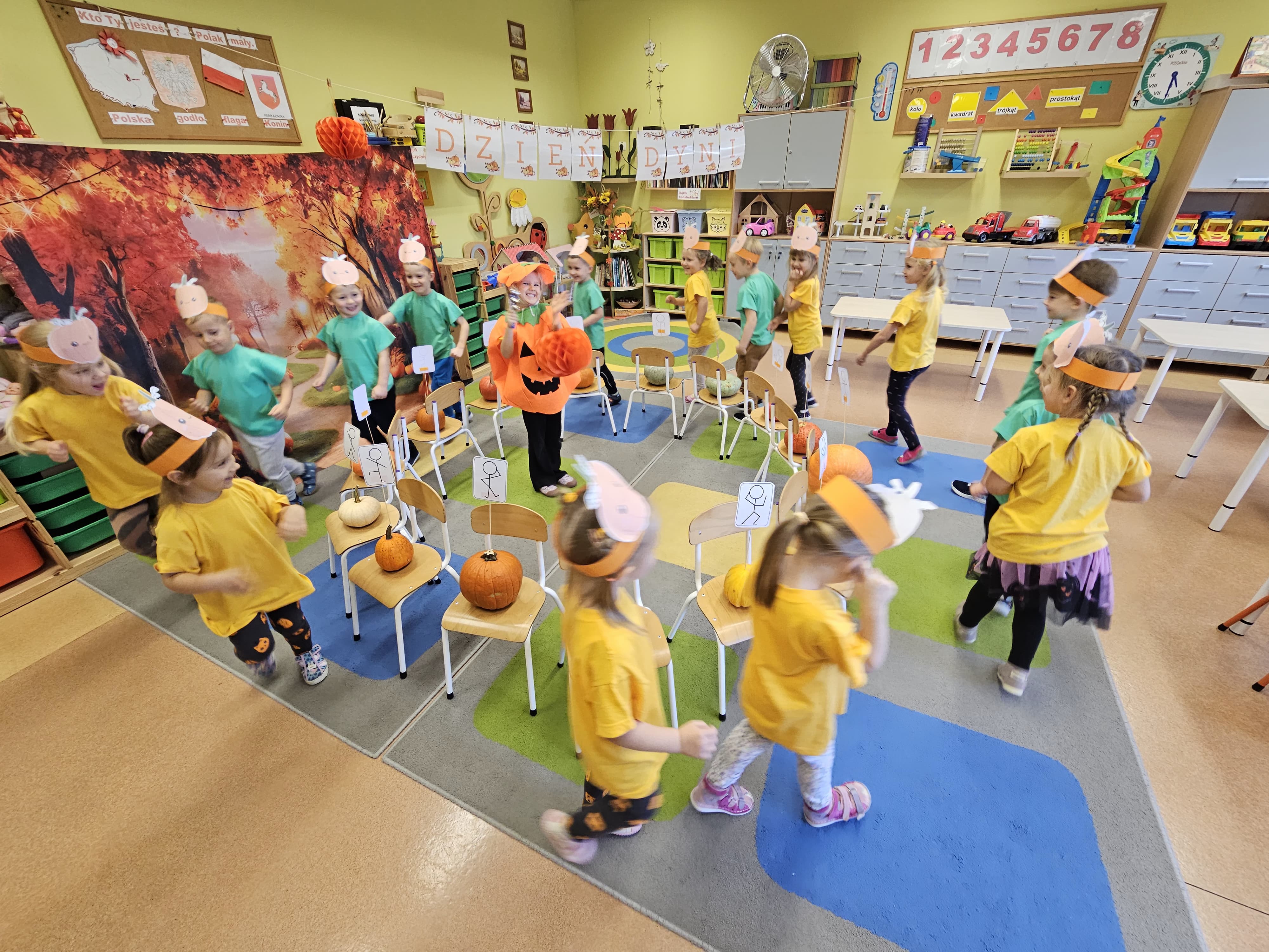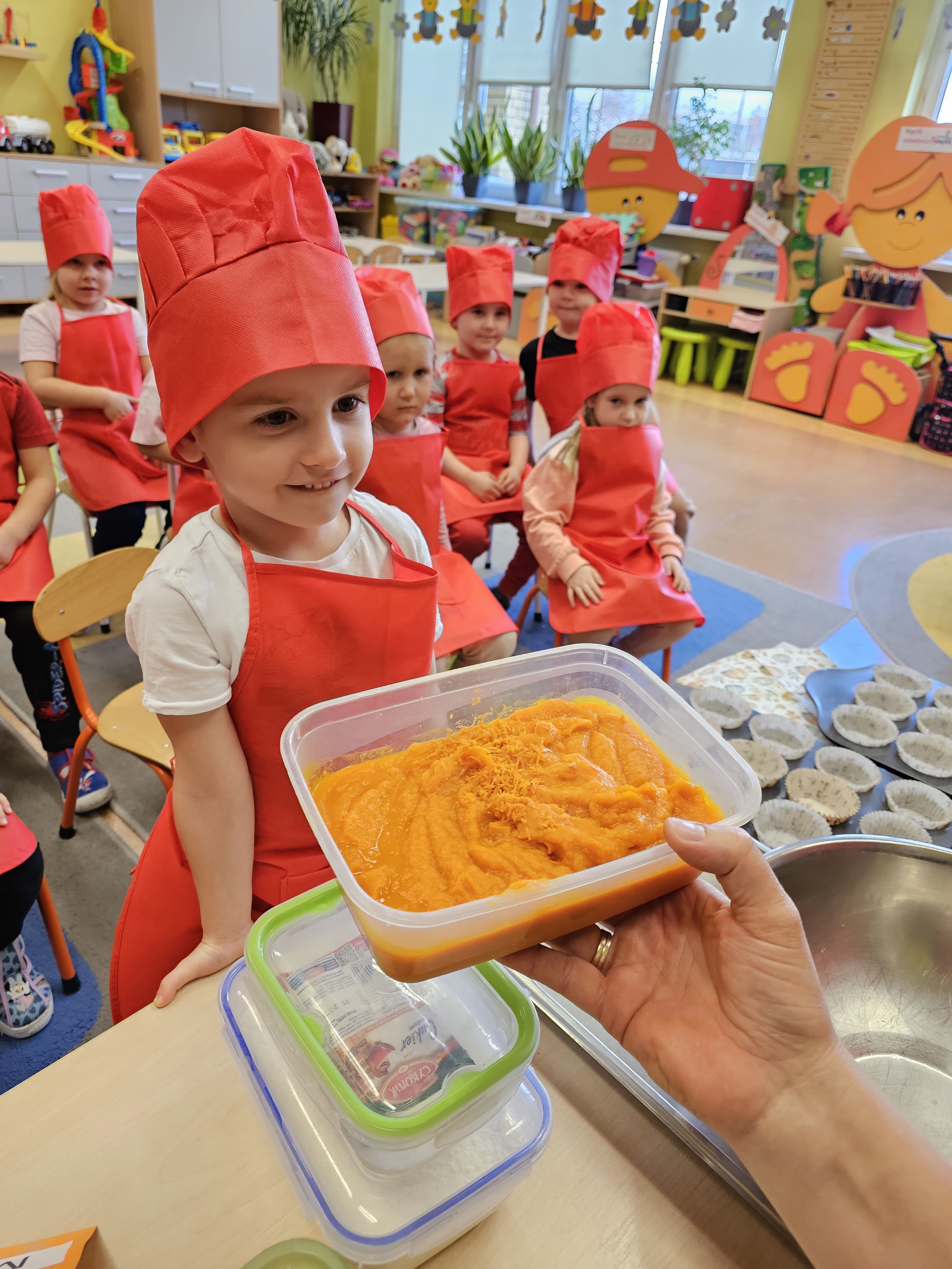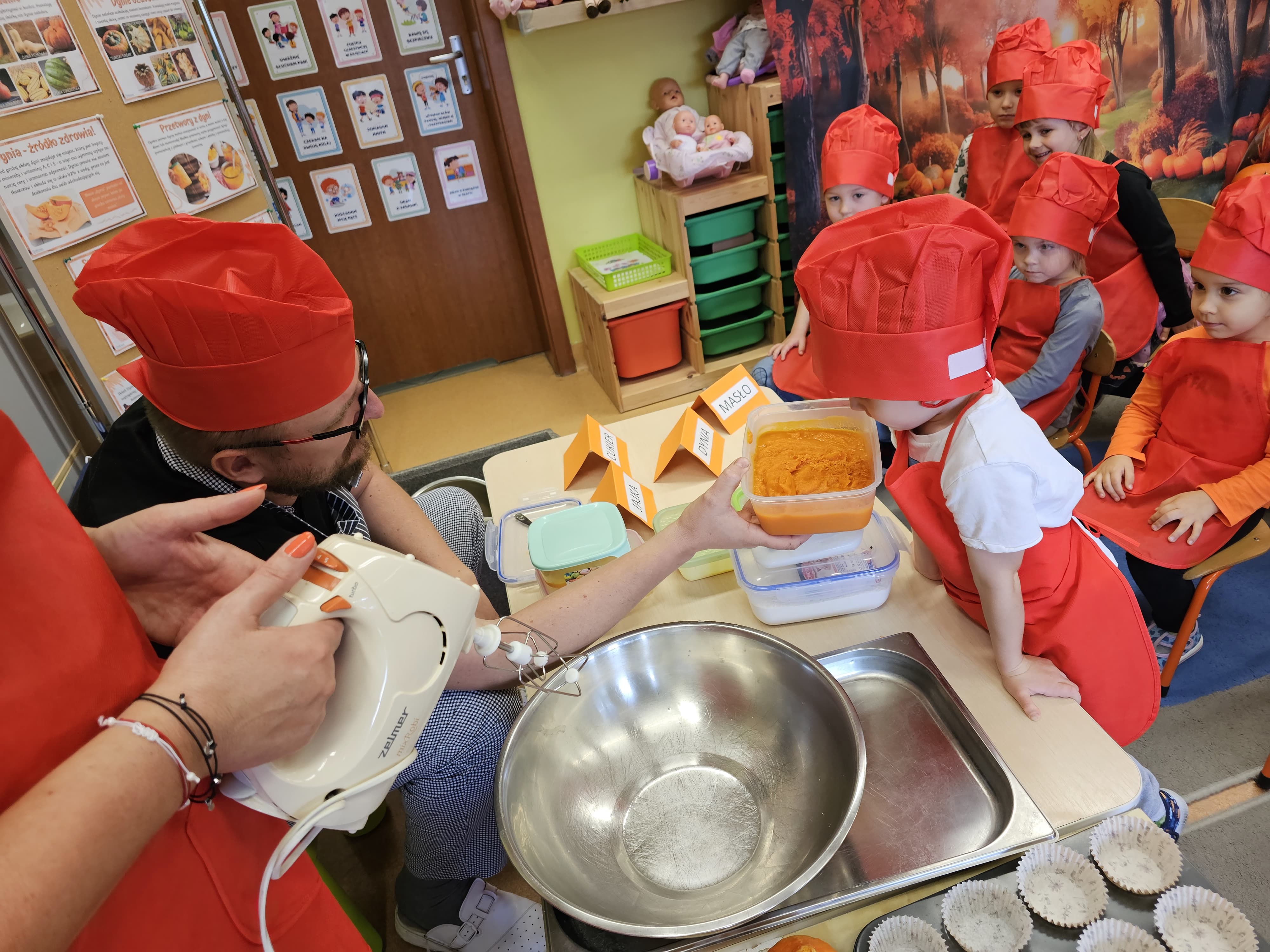 W grupie średniaków odbył się wyjątkowy „Dzień Dyni”. Sala tego dnia wypełniła się pomarańczowymi barwami, dyniowymi dekoracjami i radosnym śmiechem naszych małych przedszkolaków. Podczas zajęć dzieci miały okazję poznać różne odmiany dyni, obejrzeć ją z bliska, dotknąć, powąchać i zajrzeć do jej wnętrza. Wspólnie zastanawiały się, do czego można wykorzystać to niezwykłe warzywo i dlaczego warto je jeść. Gościem specjalnym  był kucharz przedszkolny P. Przemek, który opowiedział dzieciom o wartościach odżywczych dyni – o tym, że zawiera dużo witamin, wspiera odporność i jest bardzo zdrowa. Dzieci z dużym zainteresowaniem słuchały i aktywnie uczestniczyły w rozmowie. Następnie przedszkolaki wzięły udział w warsztatach kulinarnych, podczas których wspólnie z kucharzem  przygotowały muffinki dyniowe. Każde dziecko mogło dodać składniki, wymieszać ciasto i nałożyć je do foremek. W całym przedszkolu unosił się zapach jesiennych wypieków! Oprócz zajęć kulinarnych dzieci uczestniczyły także w różnorodnych działaniach tematycznych – brały udział w konkursach, pracach plastycznych oraz wspólnym śpiewaniu jesiennych piosenek. W trosce o zdrowie, bardzo cenne o tej porze roku, nie zabrakło również jesienno - dyniowej ścieżki ruchowej oraz gimnastyki z dynią. Na zakończenie dnia odbyła się degustacja muffinek, które wszystkim bardzo smakowały. Każdy mały kucharz otrzymał pamiątkową dynię, a w sali długo jeszcze unosił się zapach jesieni i radości ze wspólnego świętowania Dnia Dyni. To było naprawdę udane, kreatywne,pełne kolorów i smaków Święto Dyni !