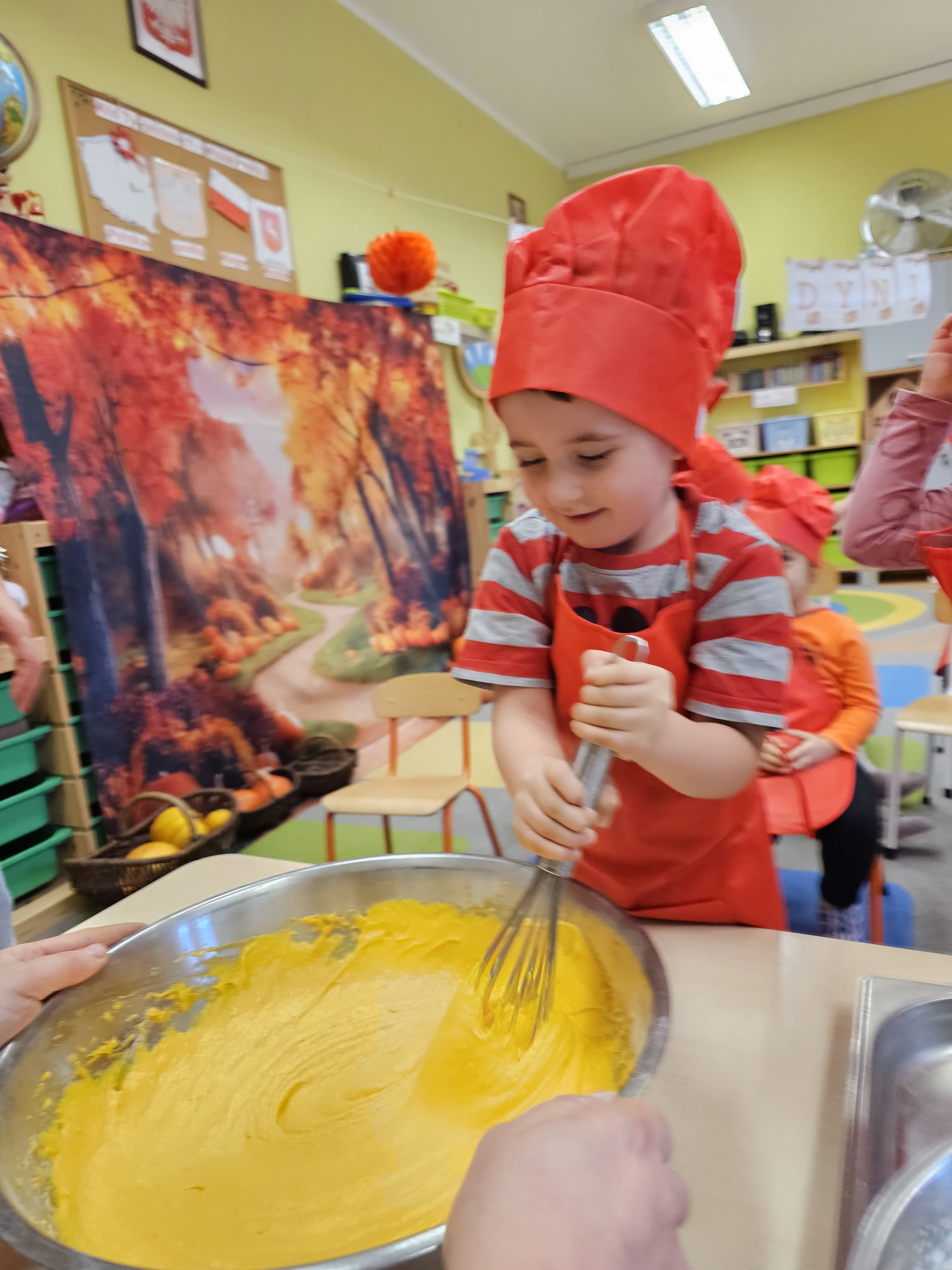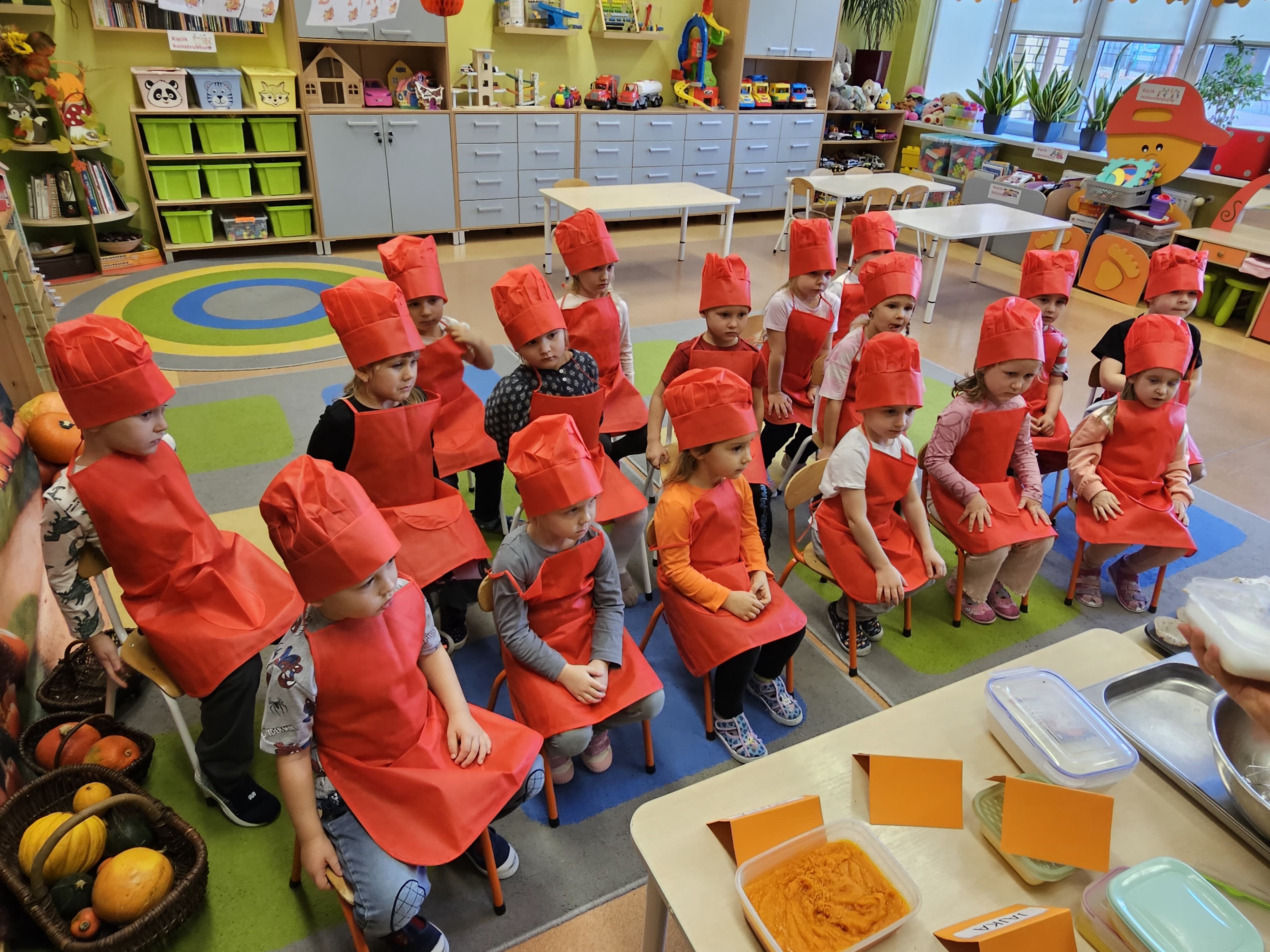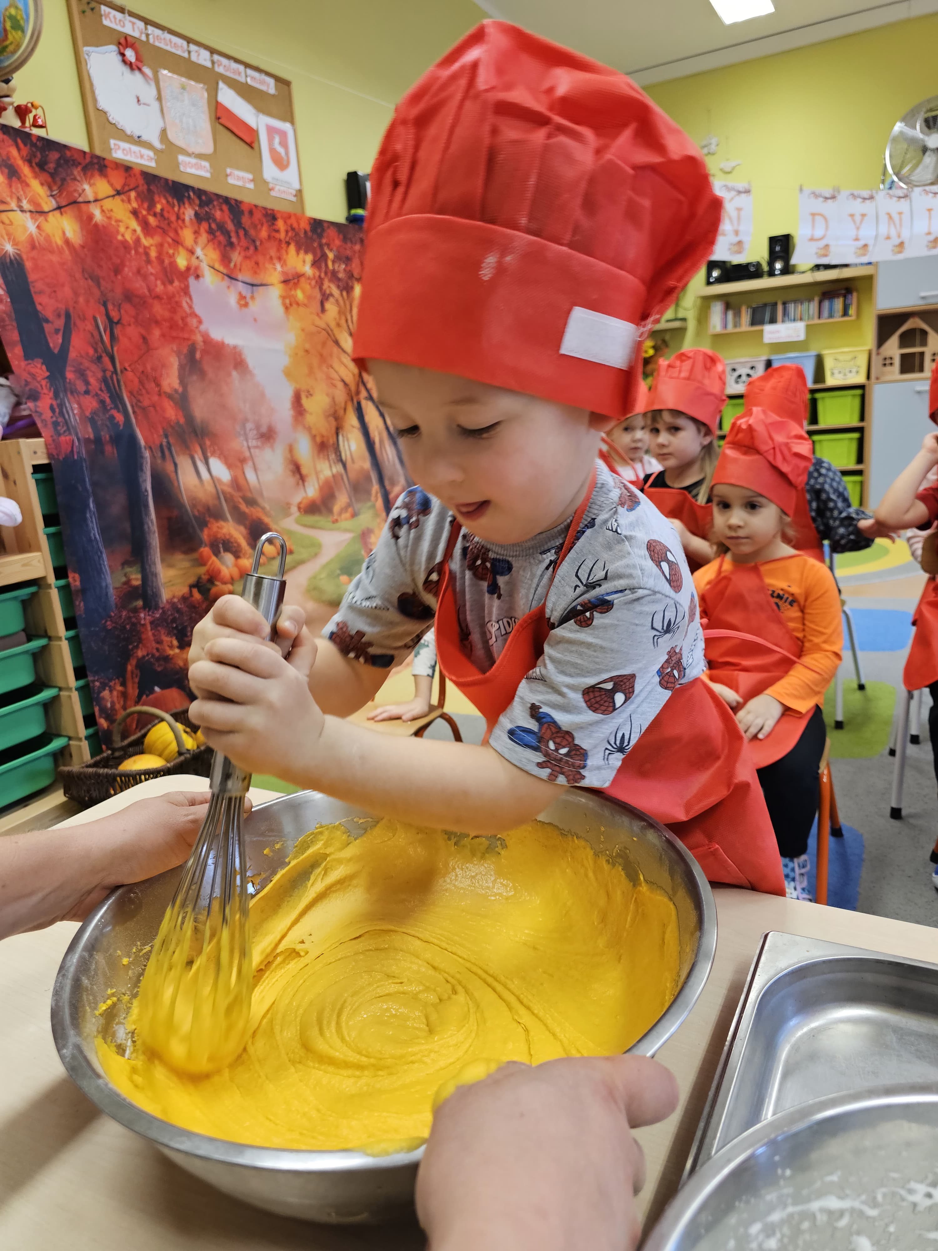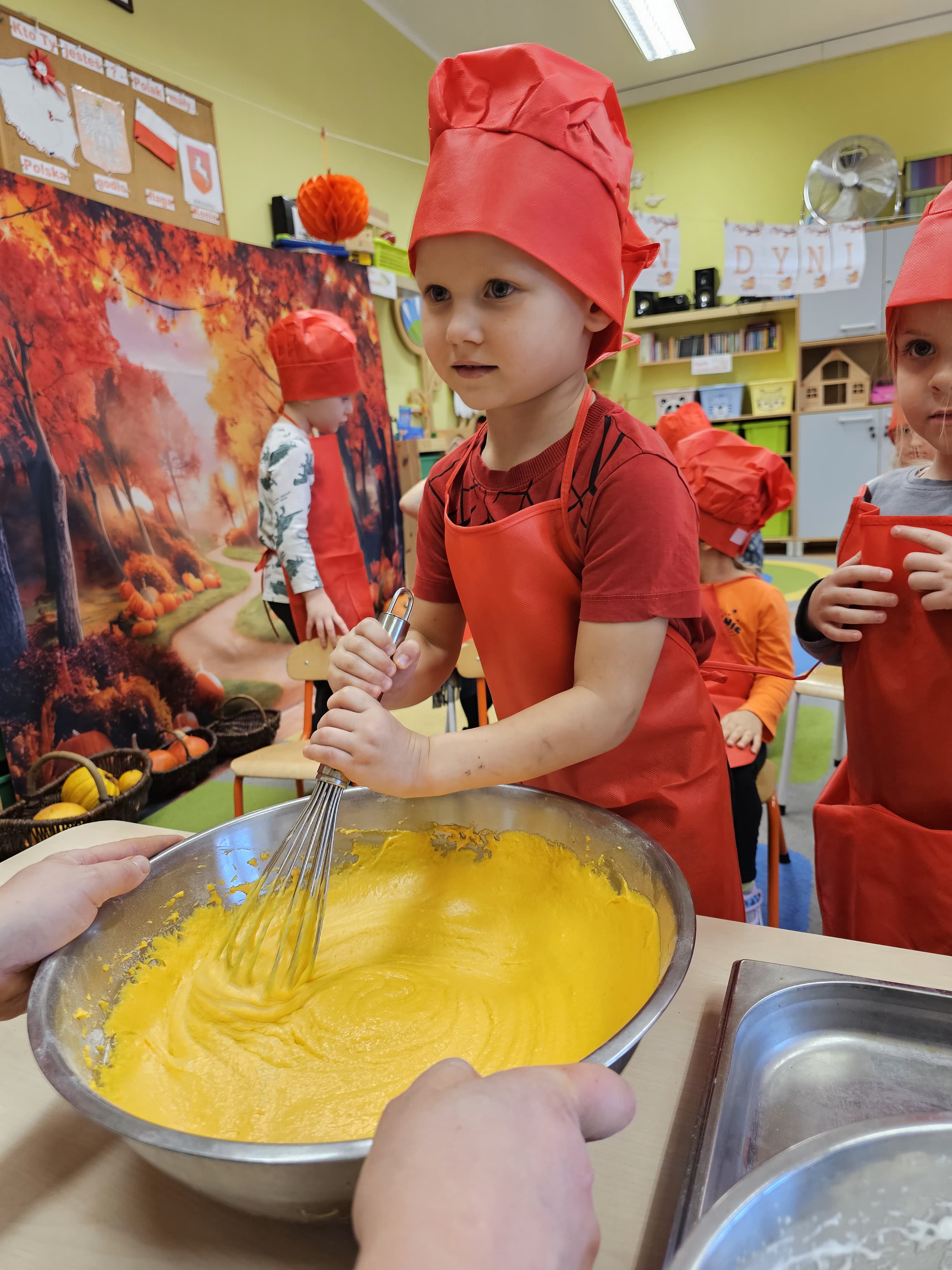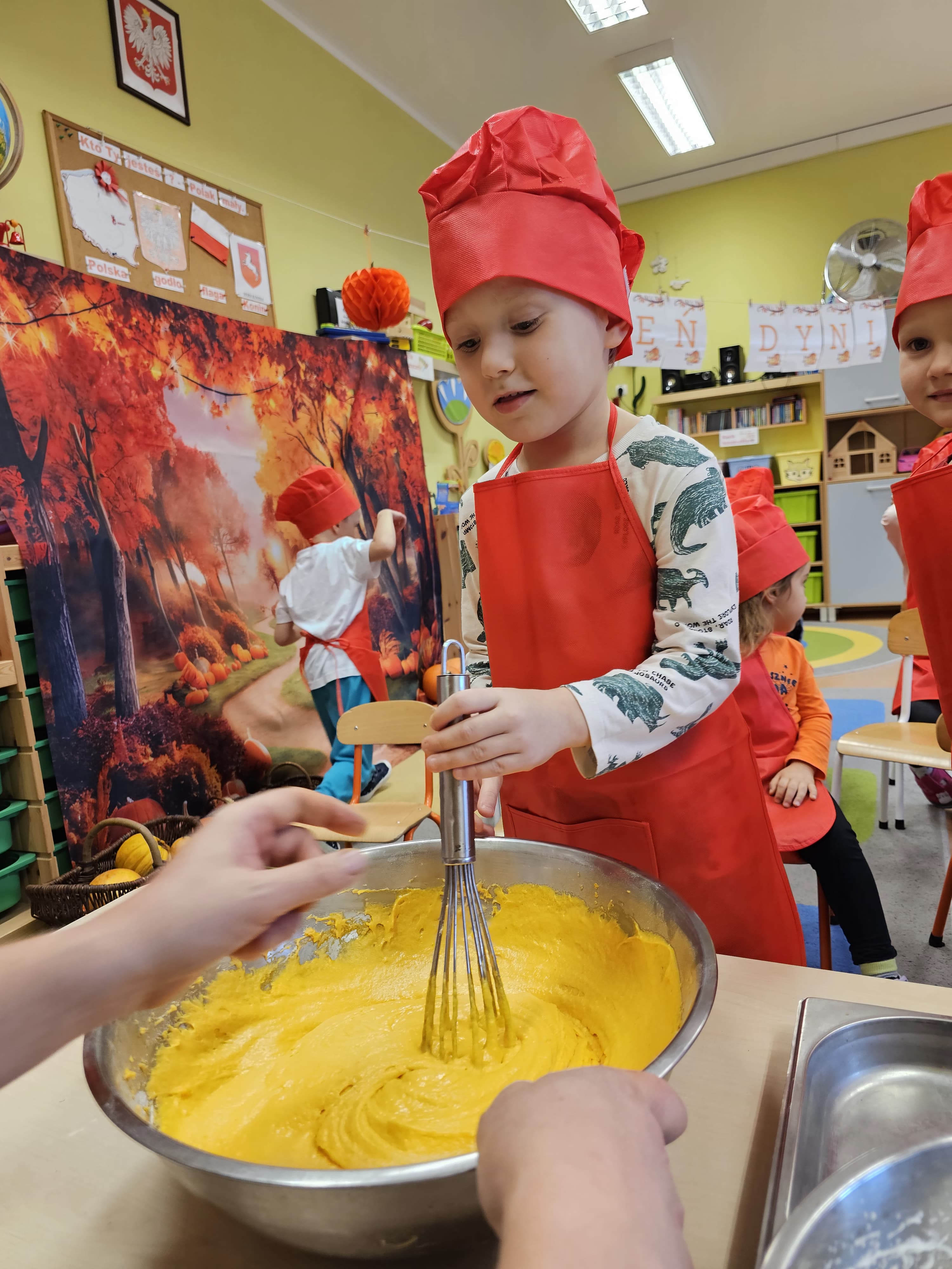 W grupie średniaków odbył się wyjątkowy „Dzień Dyni”. Sala tego dnia wypełniła się pomarańczowymi barwami, dyniowymi dekoracjami i radosnym śmiechem naszych małych przedszkolaków. Podczas zajęć dzieci miały okazję poznać różne odmiany dyni, obejrzeć ją z bliska, dotknąć, powąchać i zajrzeć do jej wnętrza. Wspólnie zastanawiały się, do czego można wykorzystać to niezwykłe warzywo i dlaczego warto je jeść. Gościem specjalnym  był kucharz przedszkolny P. Przemek, który opowiedział dzieciom o wartościach odżywczych dyni – o tym, że zawiera dużo witamin, wspiera odporność i jest bardzo zdrowa. Dzieci z dużym zainteresowaniem słuchały i aktywnie uczestniczyły w rozmowie. Następnie przedszkolaki wzięły udział w warsztatach kulinarnych, podczas których wspólnie z kucharzem  przygotowały muffinki dyniowe. Każde dziecko mogło dodać składniki, wymieszać ciasto i nałożyć je do foremek. W całym przedszkolu unosił się zapach jesiennych wypieków! Oprócz zajęć kulinarnych dzieci uczestniczyły także w różnorodnych działaniach tematycznych – brały udział w konkursach, pracach plastycznych oraz wspólnym śpiewaniu jesiennych piosenek. W trosce o zdrowie, bardzo cenne o tej porze roku, nie zabrakło również jesienno - dyniowej ścieżki ruchowej oraz gimnastyki z dynią. Na zakończenie dnia odbyła się degustacja muffinek, które wszystkim bardzo smakowały. Każdy mały kucharz otrzymał pamiątkową dynię, a w sali długo jeszcze unosił się zapach jesieni i radości ze wspólnego świętowania Dnia Dyni. To było naprawdę udane, kreatywne,pełne kolorów i smaków Święto Dyni !