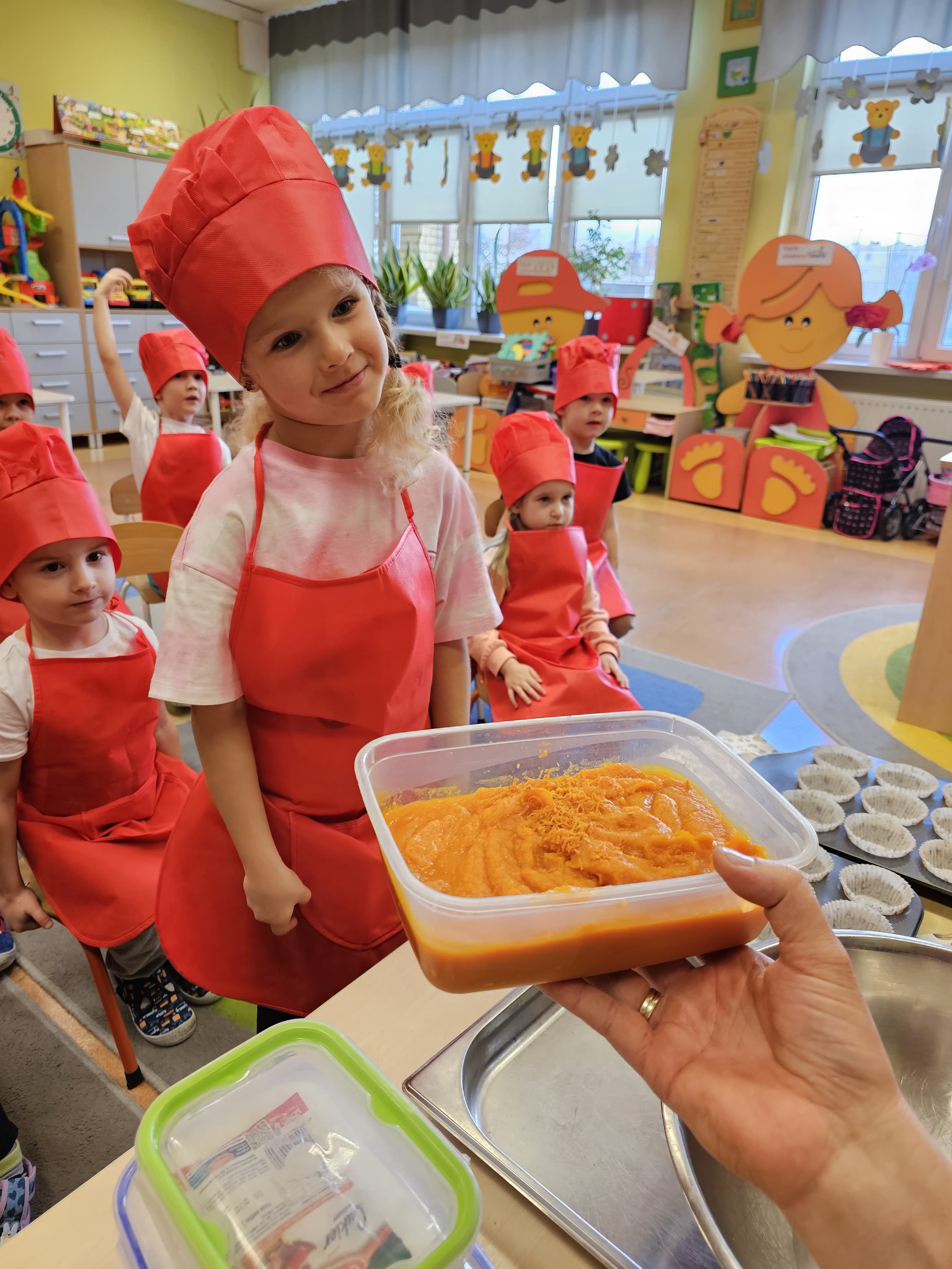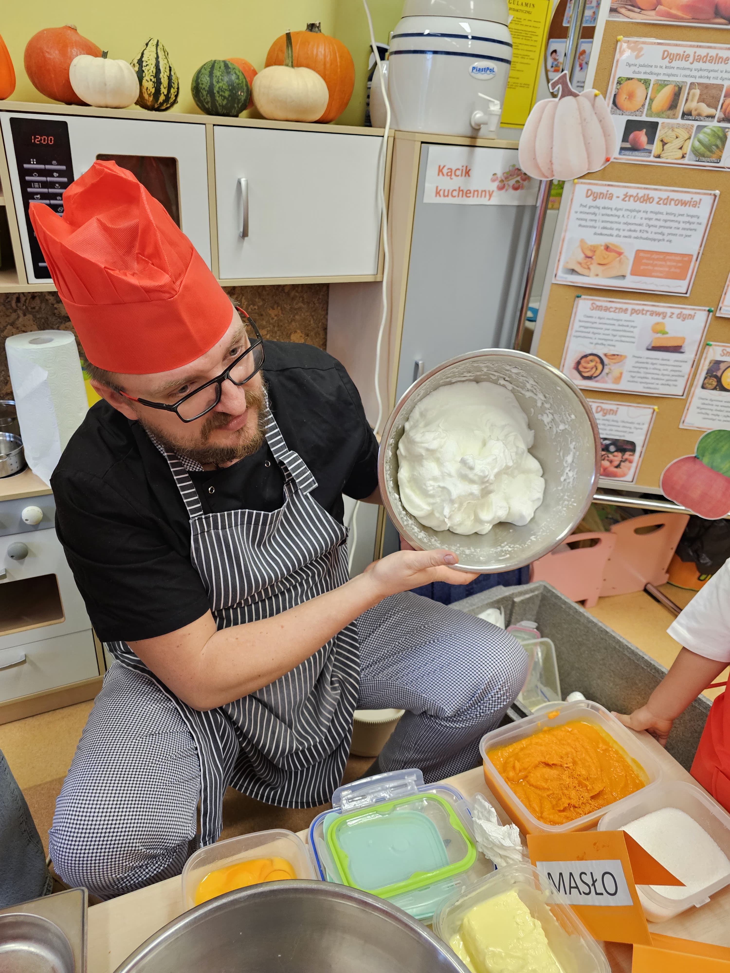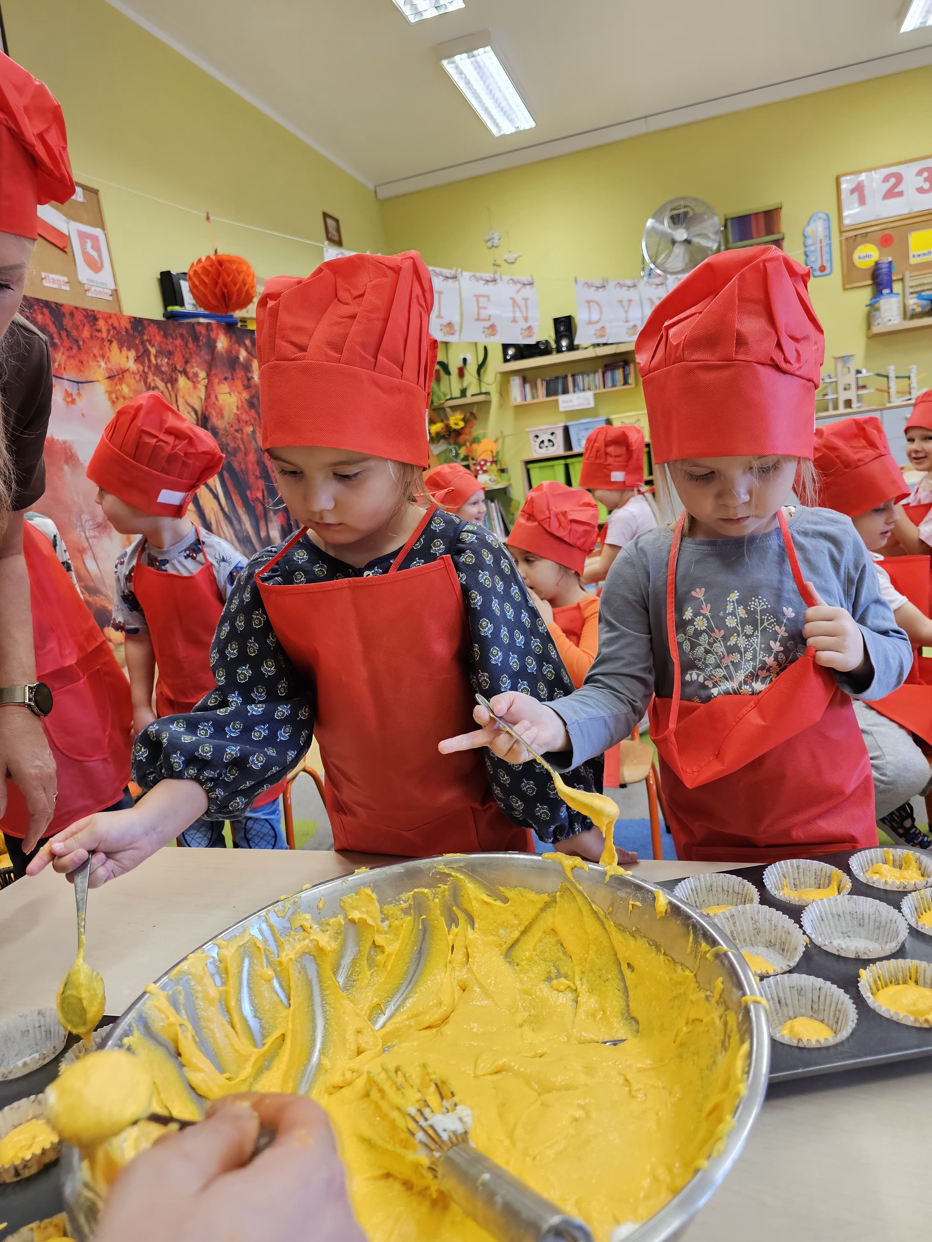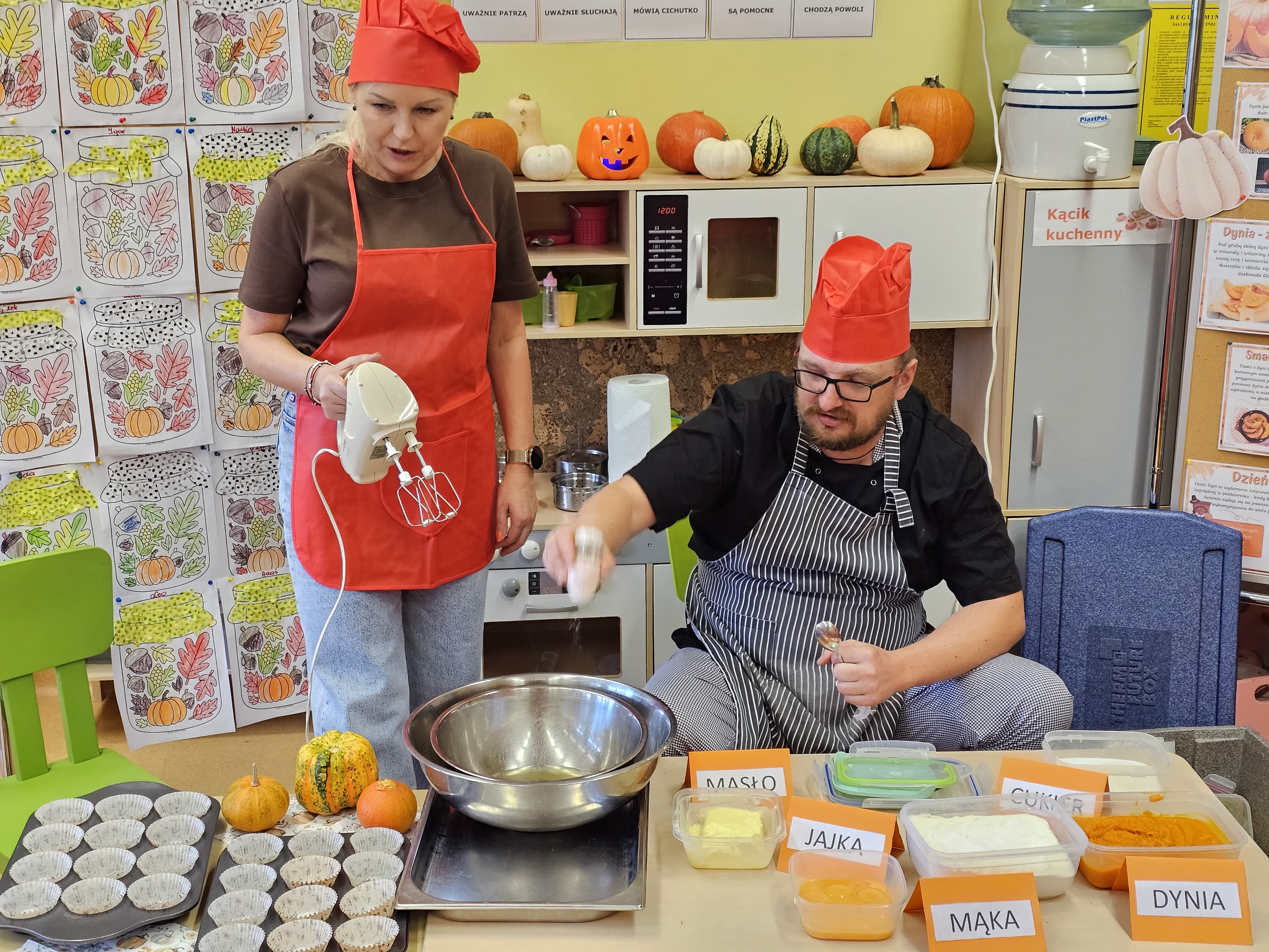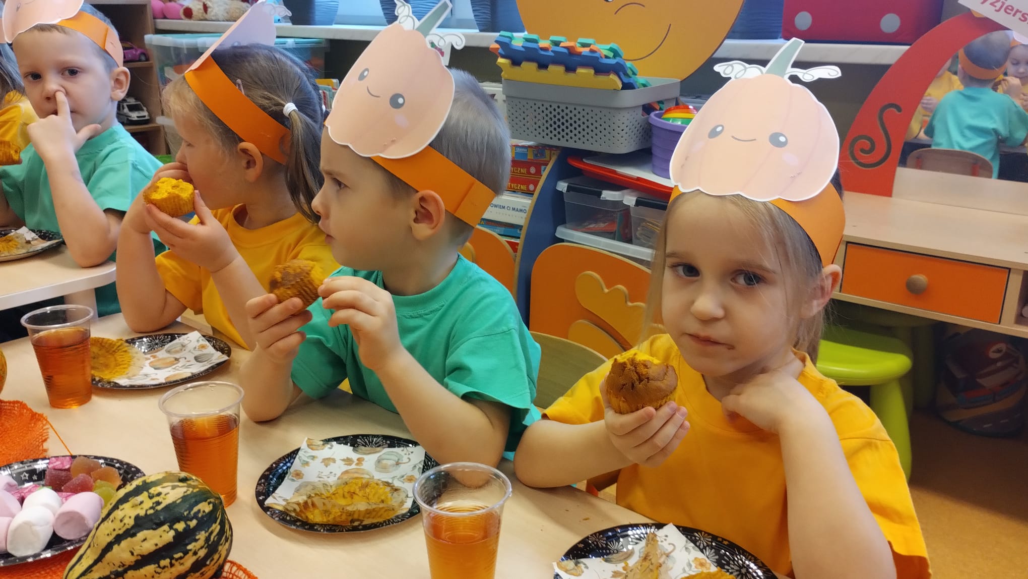 W grupie średniaków odbył się wyjątkowy „Dzień Dyni”. Sala tego dnia wypełniła się pomarańczowymi barwami, dyniowymi dekoracjami i radosnym śmiechem naszych małych przedszkolaków. Podczas zajęć dzieci miały okazję poznać różne odmiany dyni, obejrzeć ją z bliska, dotknąć, powąchać i zajrzeć do jej wnętrza. Wspólnie zastanawiały się, do czego można wykorzystać to niezwykłe warzywo i dlaczego warto je jeść. Gościem specjalnym  był kucharz przedszkolny P. Przemek, który opowiedział dzieciom o wartościach odżywczych dyni – o tym, że zawiera dużo witamin, wspiera odporność i jest bardzo zdrowa. Dzieci z dużym zainteresowaniem słuchały i aktywnie uczestniczyły w rozmowie. Następnie przedszkolaki wzięły udział w warsztatach kulinarnych, podczas których wspólnie z kucharzem  przygotowały muffinki dyniowe. Każde dziecko mogło dodać składniki, wymieszać ciasto i nałożyć je do foremek. W całym przedszkolu unosił się zapach jesiennych wypieków! Oprócz zajęć kulinarnych dzieci uczestniczyły także w różnorodnych działaniach tematycznych – brały udział w konkursach, pracach plastycznych oraz wspólnym śpiewaniu jesiennych piosenek. W trosce o zdrowie, bardzo cenne o tej porze roku, nie zabrakło również jesienno - dyniowej ścieżki ruchowej oraz gimnastyki z dynią. Na zakończenie dnia odbyła się degustacja muffinek, które wszystkim bardzo smakowały. Każdy mały kucharz otrzymał pamiątkową dynię, a w sali długo jeszcze unosił się zapach jesieni i radości ze wspólnego świętowania Dnia Dyni. To było naprawdę udane, kreatywne,pełne kolorów i smaków Święto Dyni !