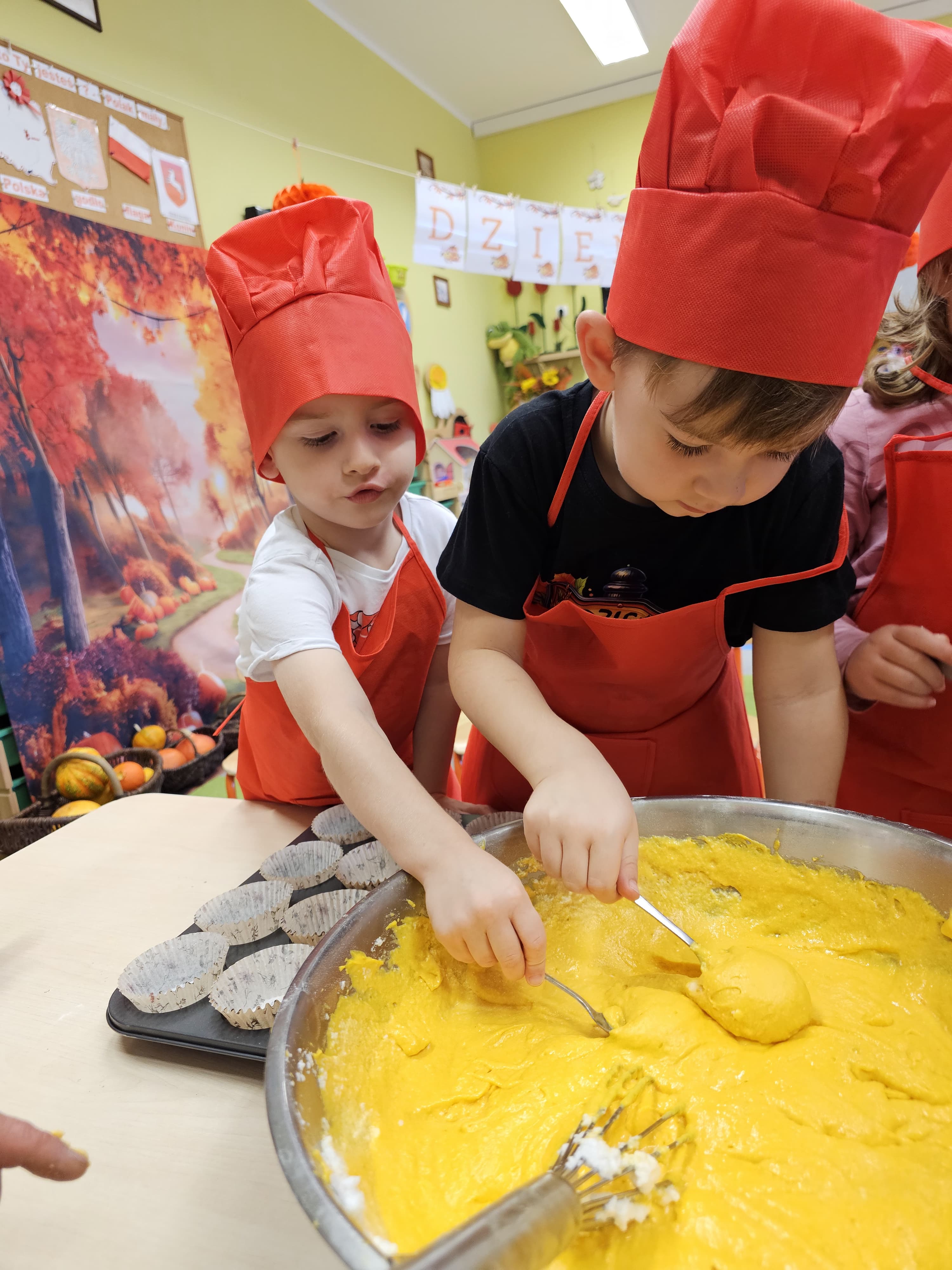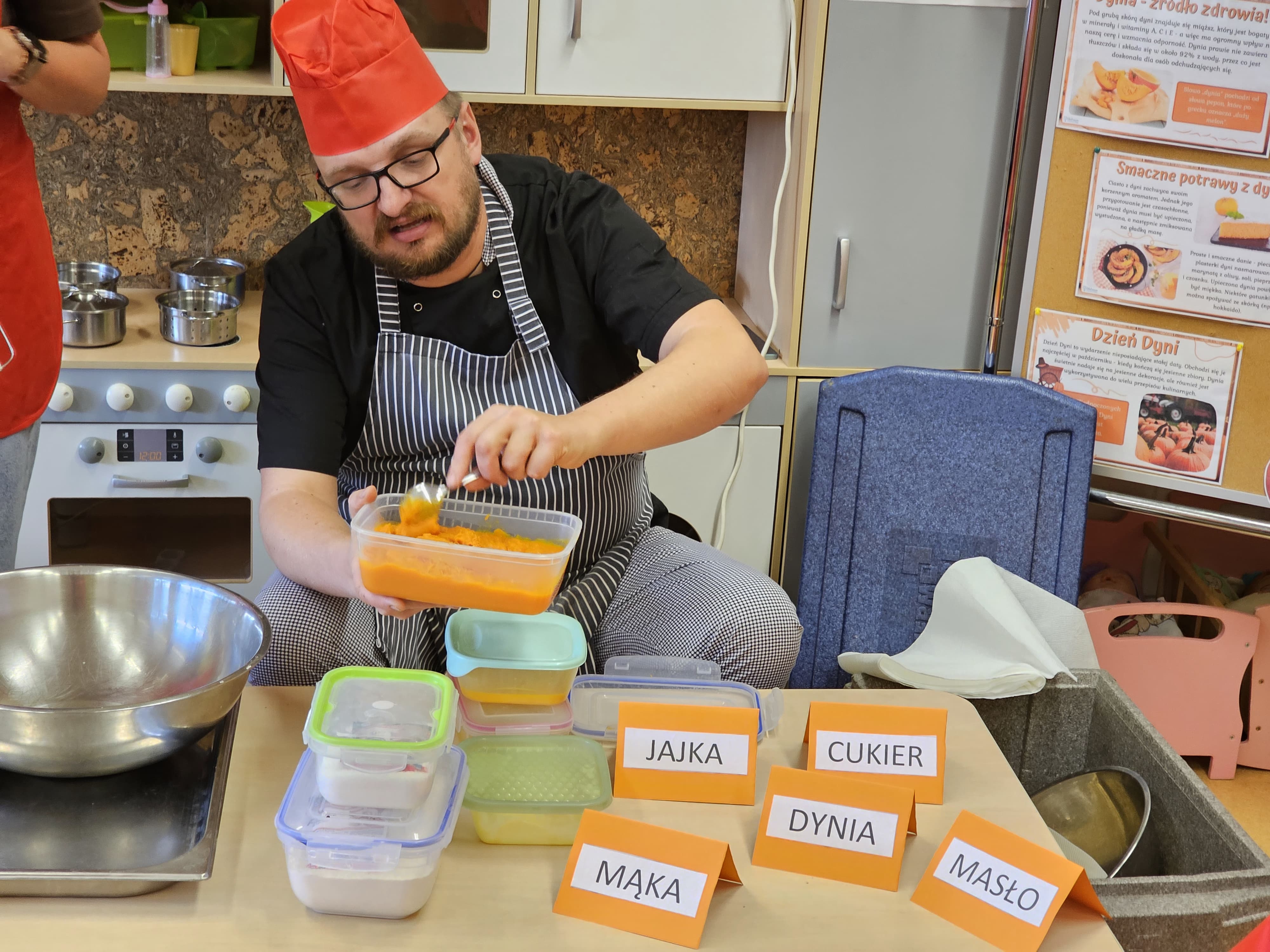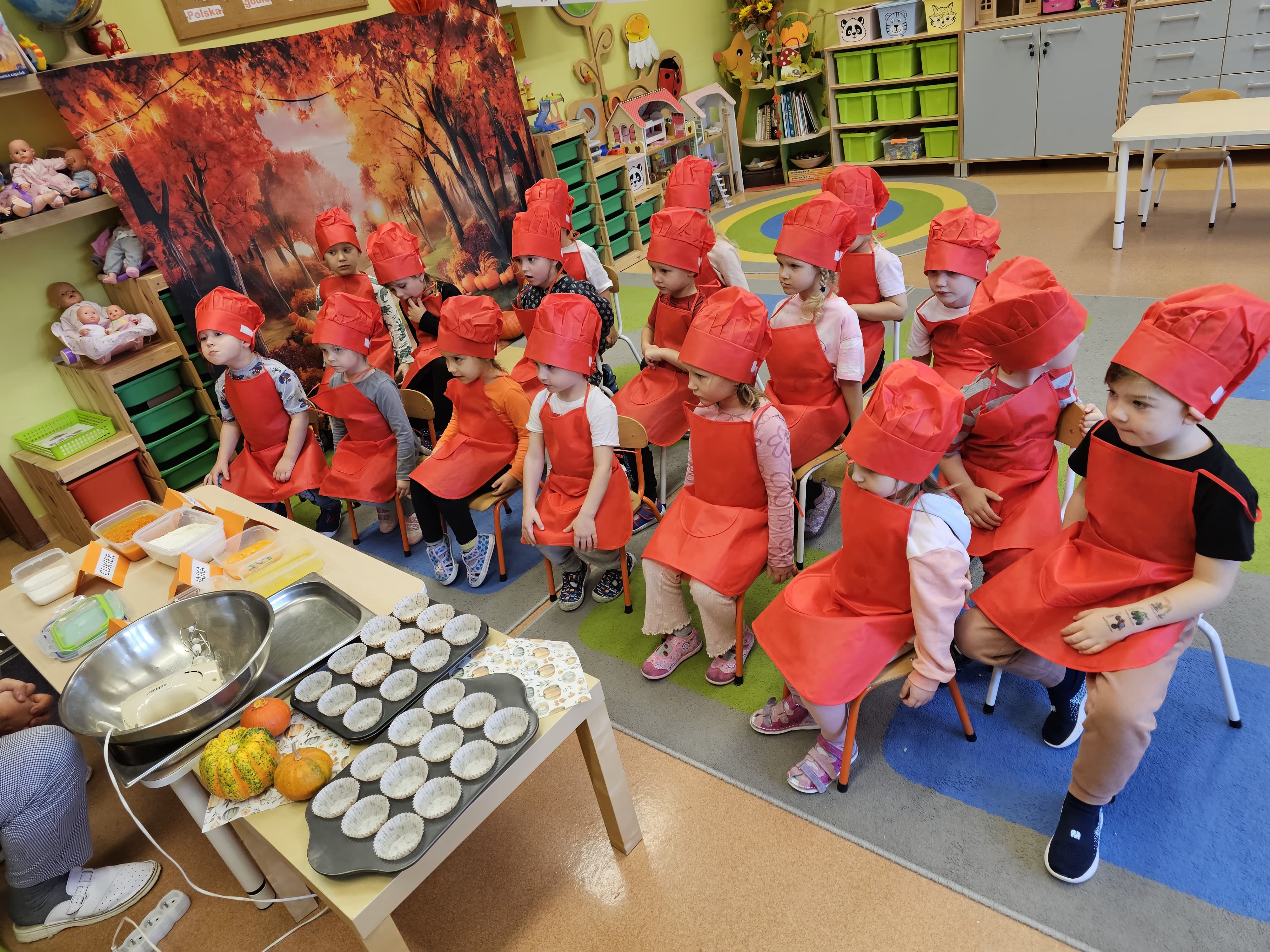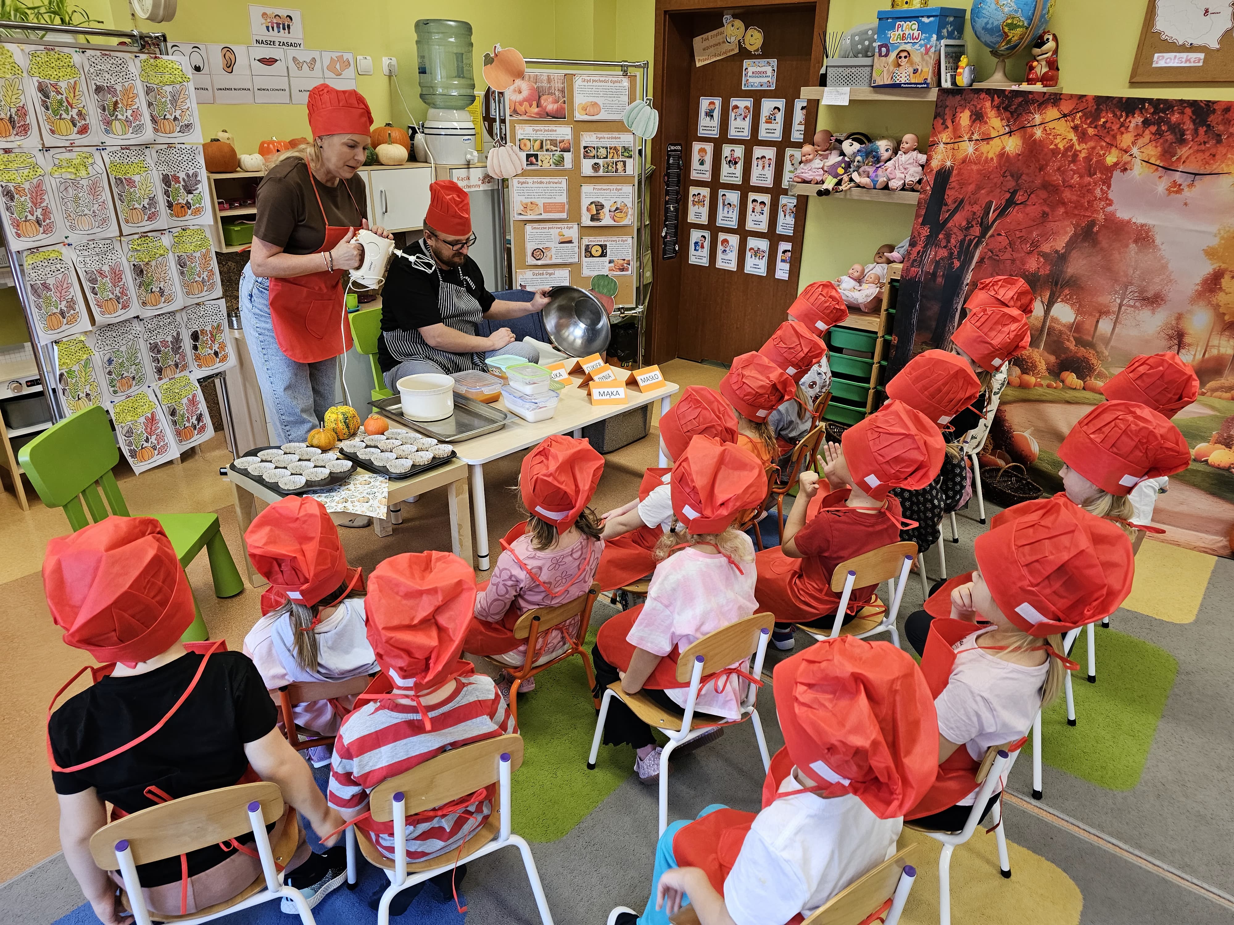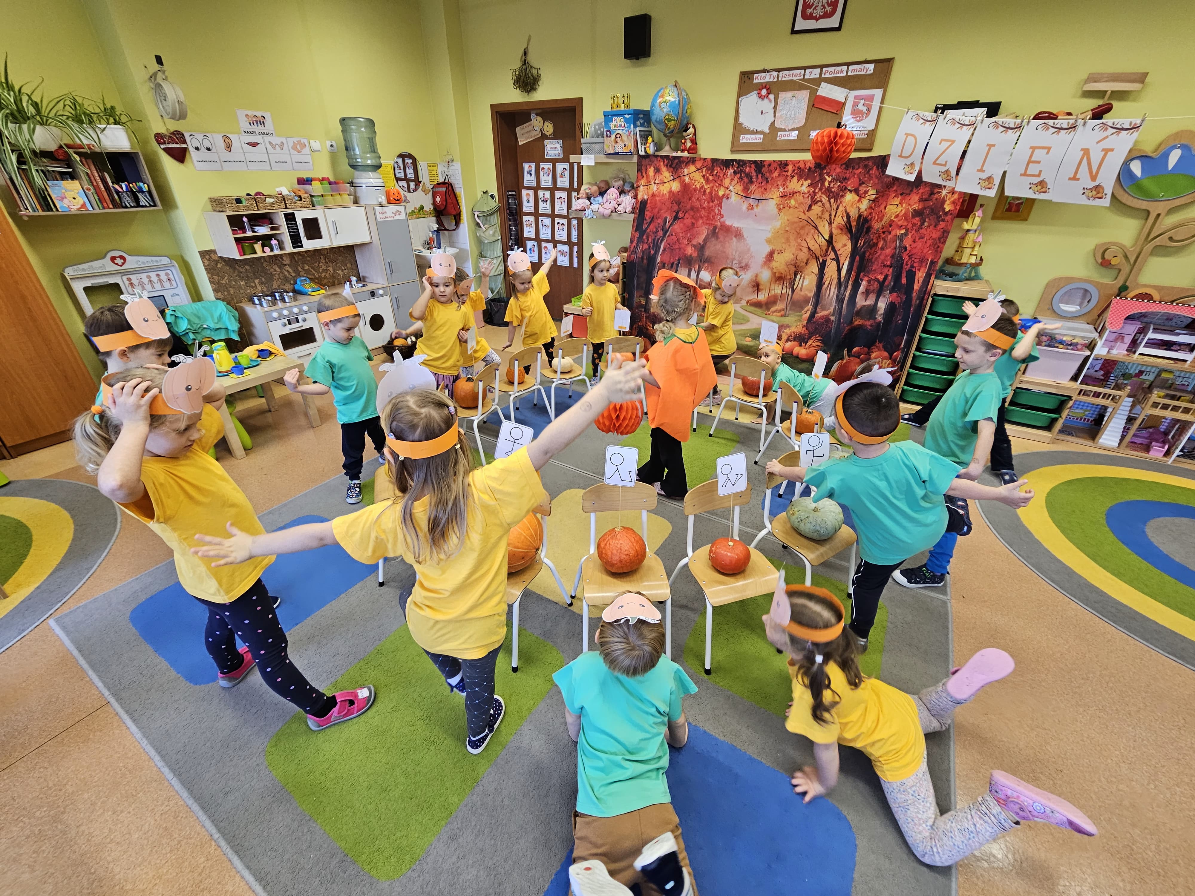 W grupie średniaków odbył się wyjątkowy „Dzień Dyni”. Sala tego dnia wypełniła się pomarańczowymi barwami, dyniowymi dekoracjami i radosnym śmiechem naszych małych przedszkolaków. Podczas zajęć dzieci miały okazję poznać różne odmiany dyni, obejrzeć ją z bliska, dotknąć, powąchać i zajrzeć do jej wnętrza. Wspólnie zastanawiały się, do czego można wykorzystać to niezwykłe warzywo i dlaczego warto je jeść. Gościem specjalnym  był kucharz przedszkolny P. Przemek, który opowiedział dzieciom o wartościach odżywczych dyni – o tym, że zawiera dużo witamin, wspiera odporność i jest bardzo zdrowa. Dzieci z dużym zainteresowaniem słuchały i aktywnie uczestniczyły w rozmowie. Następnie przedszkolaki wzięły udział w warsztatach kulinarnych, podczas których wspólnie z kucharzem  przygotowały muffinki dyniowe. Każde dziecko mogło dodać składniki, wymieszać ciasto i nałożyć je do foremek. W całym przedszkolu unosił się zapach jesiennych wypieków! Oprócz zajęć kulinarnych dzieci uczestniczyły także w różnorodnych działaniach tematycznych – brały udział w konkursach, pracach plastycznych oraz wspólnym śpiewaniu jesiennych piosenek. W trosce o zdrowie, bardzo cenne o tej porze roku, nie zabrakło również jesienno - dyniowej ścieżki ruchowej oraz gimnastyki z dynią. Na zakończenie dnia odbyła się degustacja muffinek, które wszystkim bardzo smakowały. Każdy mały kucharz otrzymał pamiątkową dynię, a w sali długo jeszcze unosił się zapach jesieni i radości ze wspólnego świętowania Dnia Dyni. To było naprawdę udane, kreatywne,pełne kolorów i smaków Święto Dyni !