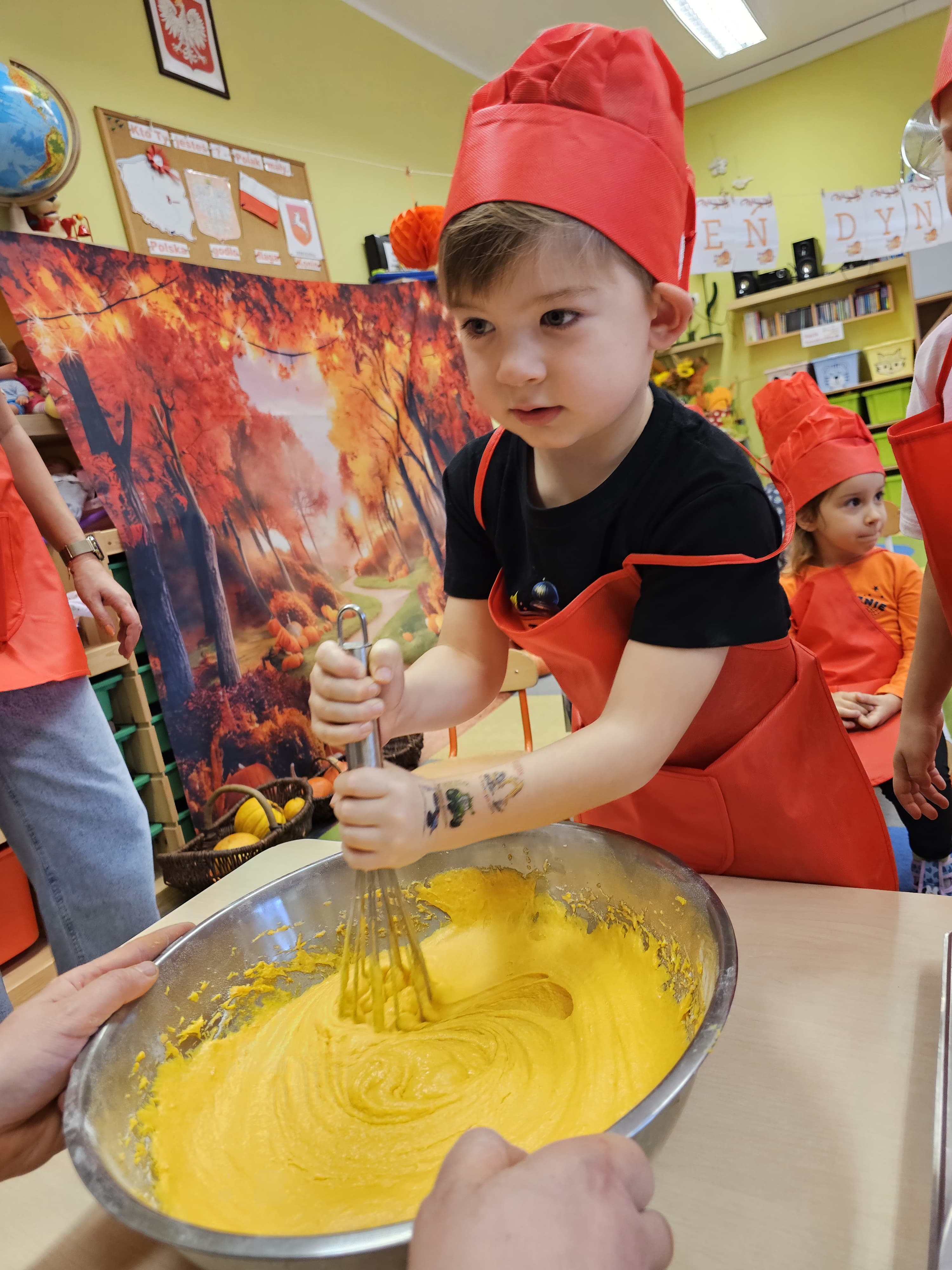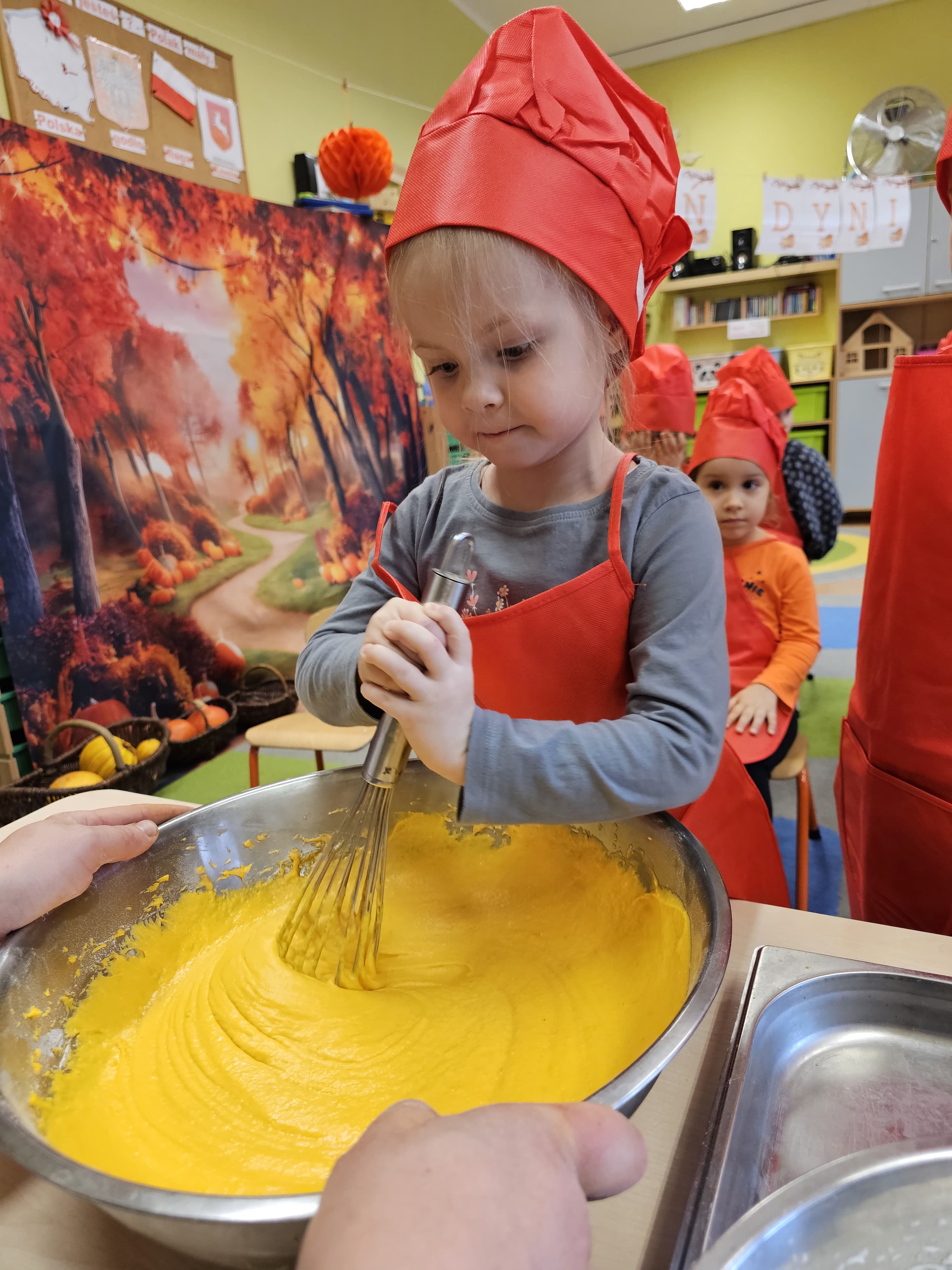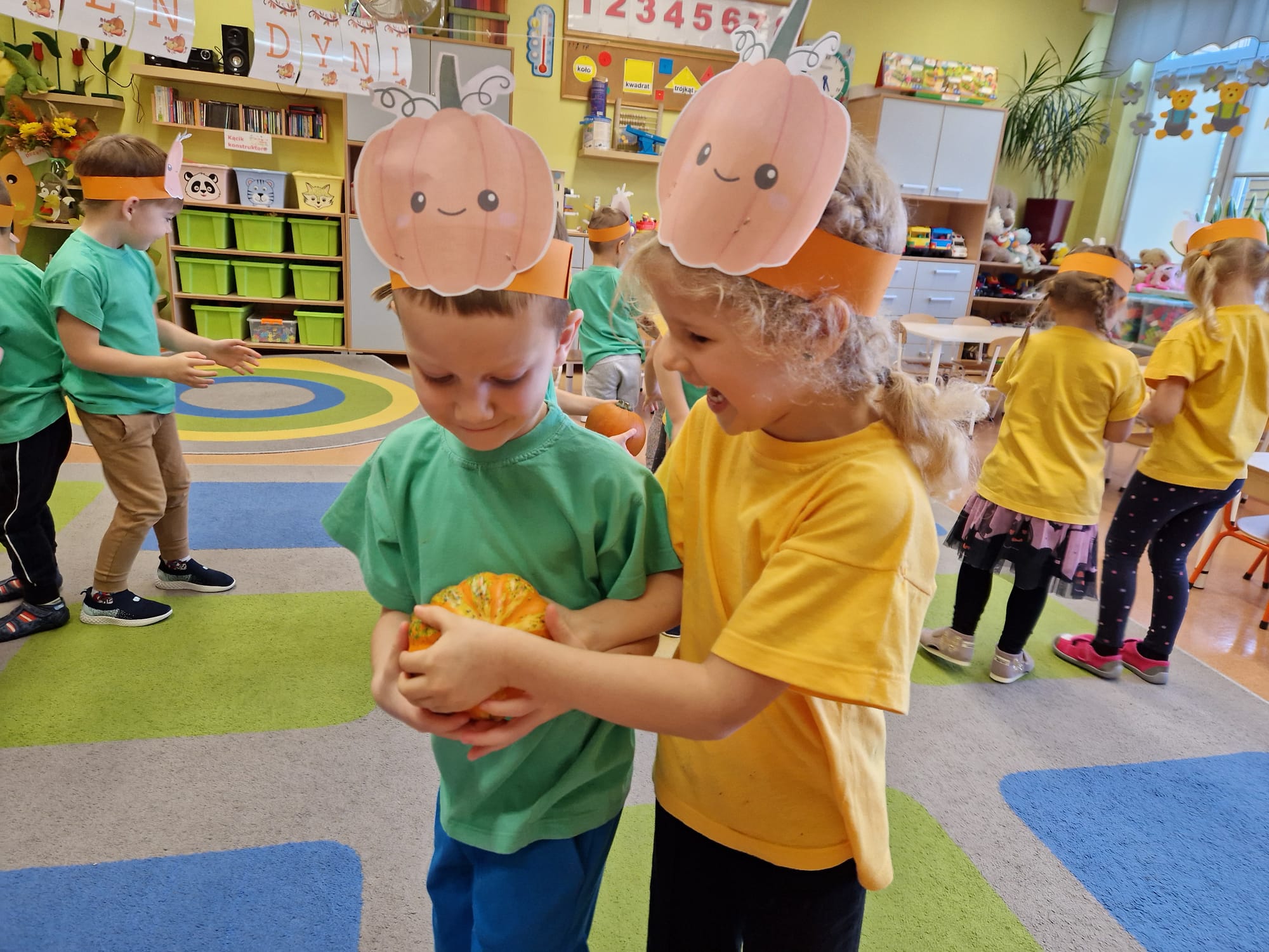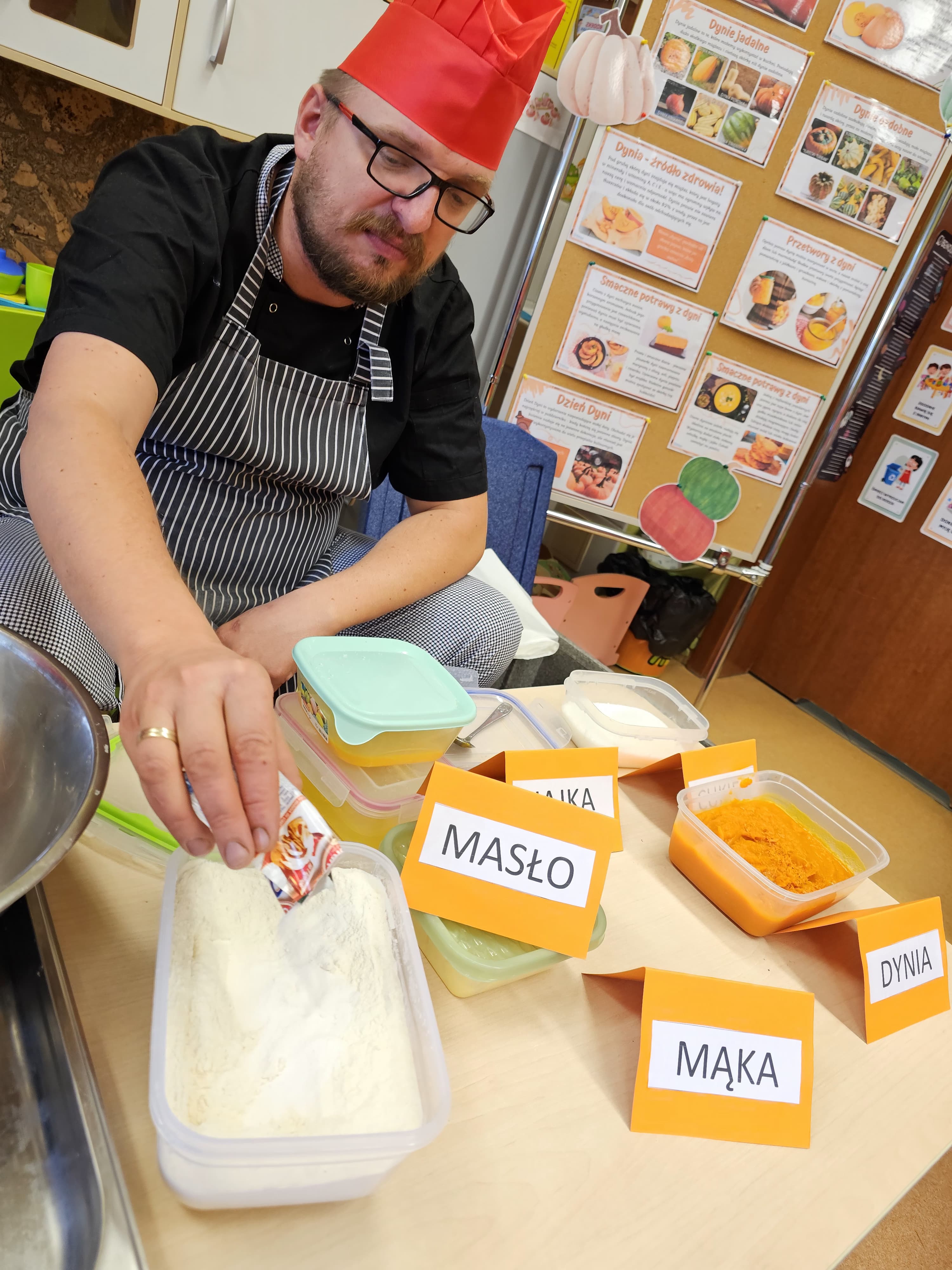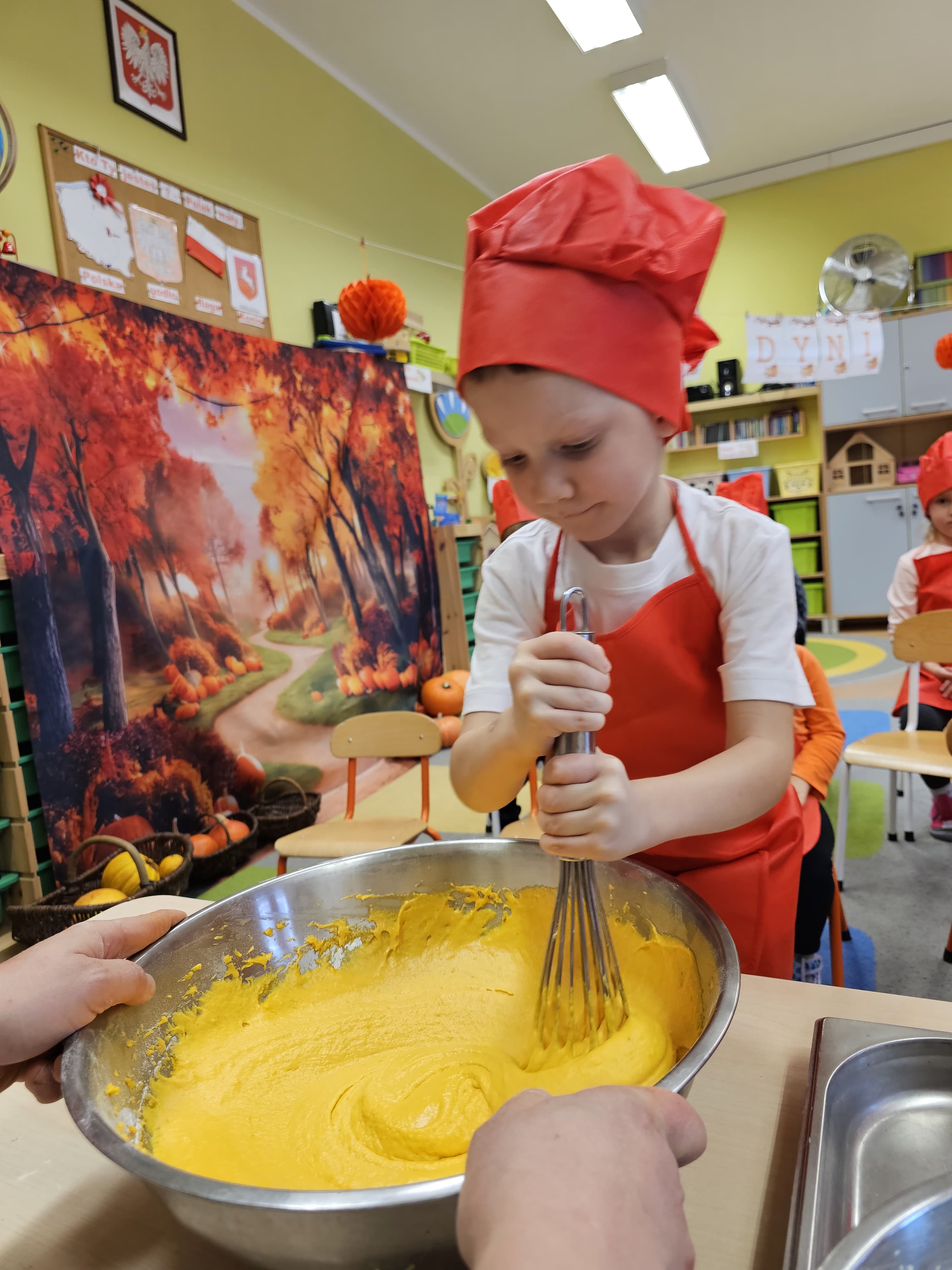 W grupie średniaków odbył się wyjątkowy „Dzień Dyni”. Sala tego dnia wypełniła się pomarańczowymi barwami, dyniowymi dekoracjami i radosnym śmiechem naszych małych przedszkolaków. Podczas zajęć dzieci miały okazję poznać różne odmiany dyni, obejrzeć ją z bliska, dotknąć, powąchać i zajrzeć do jej wnętrza. Wspólnie zastanawiały się, do czego można wykorzystać to niezwykłe warzywo i dlaczego warto je jeść. Gościem specjalnym  był kucharz przedszkolny P. Przemek, który opowiedział dzieciom o wartościach odżywczych dyni – o tym, że zawiera dużo witamin, wspiera odporność i jest bardzo zdrowa. Dzieci z dużym zainteresowaniem słuchały i aktywnie uczestniczyły w rozmowie. Następnie przedszkolaki wzięły udział w warsztatach kulinarnych, podczas których wspólnie z kucharzem  przygotowały muffinki dyniowe. Każde dziecko mogło dodać składniki, wymieszać ciasto i nałożyć je do foremek. W całym przedszkolu unosił się zapach jesiennych wypieków! Oprócz zajęć kulinarnych dzieci uczestniczyły także w różnorodnych działaniach tematycznych – brały udział w konkursach, pracach plastycznych oraz wspólnym śpiewaniu jesiennych piosenek. W trosce o zdrowie, bardzo cenne o tej porze roku, nie zabrakło również jesienno - dyniowej ścieżki ruchowej oraz gimnastyki z dynią. Na zakończenie dnia odbyła się degustacja muffinek, które wszystkim bardzo smakowały. Każdy mały kucharz otrzymał pamiątkową dynię, a w sali długo jeszcze unosił się zapach jesieni i radości ze wspólnego świętowania Dnia Dyni. To było naprawdę udane, kreatywne,pełne kolorów i smaków Święto Dyni !