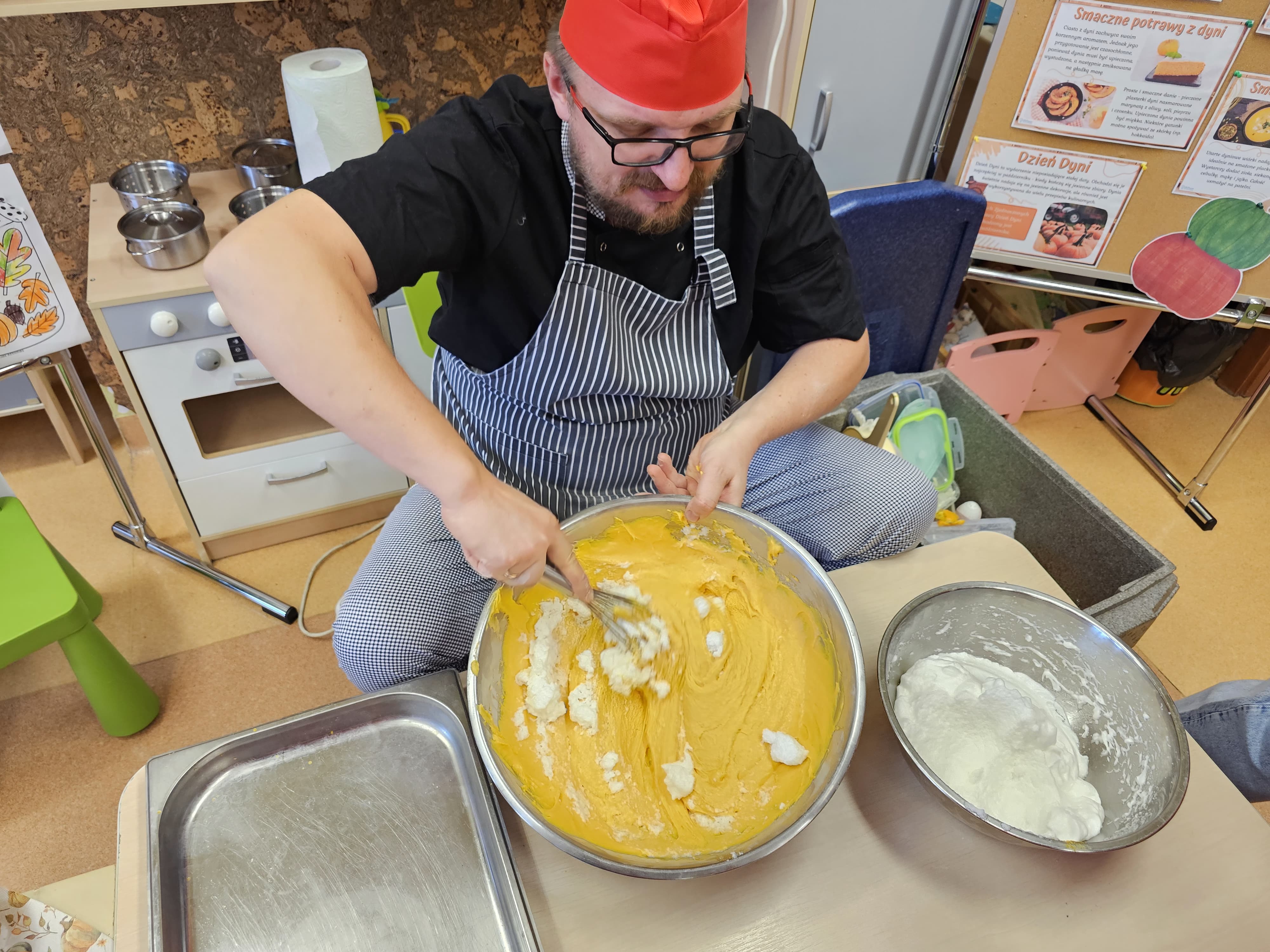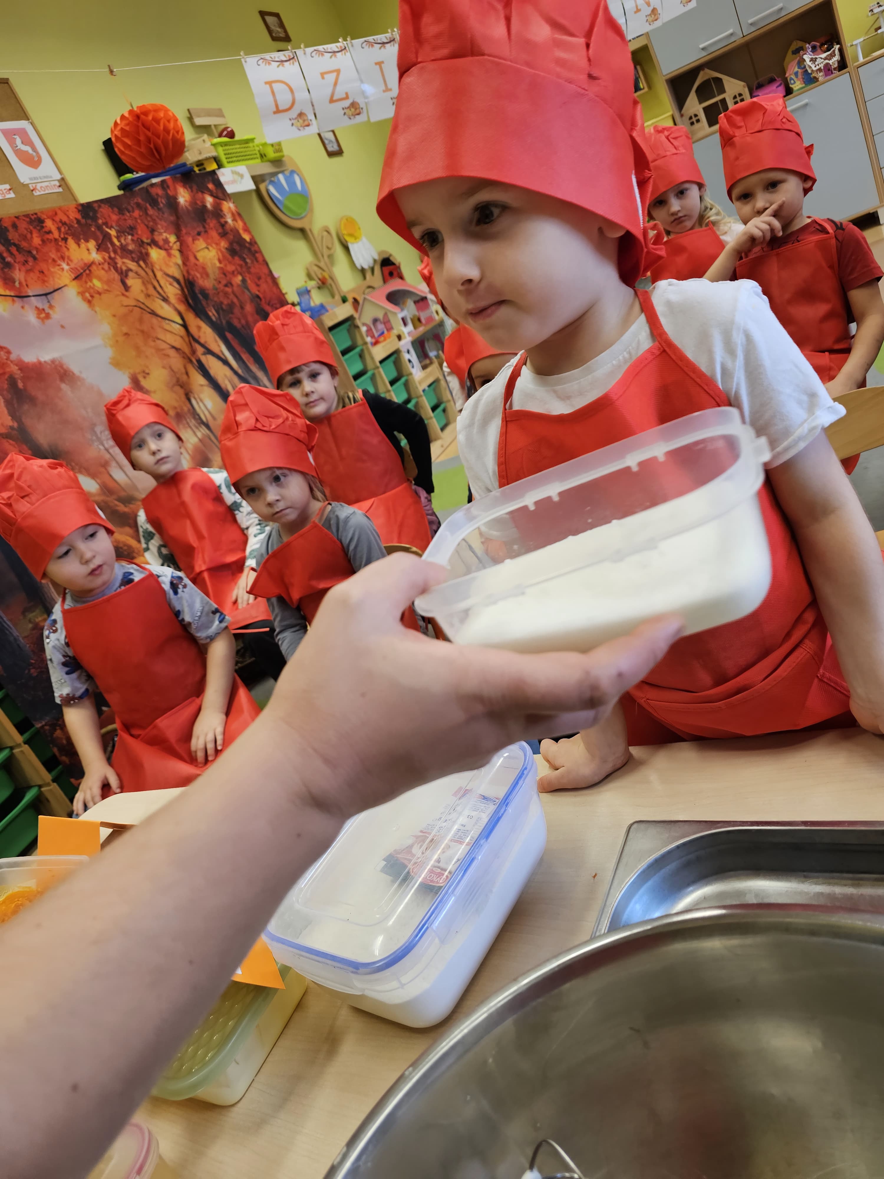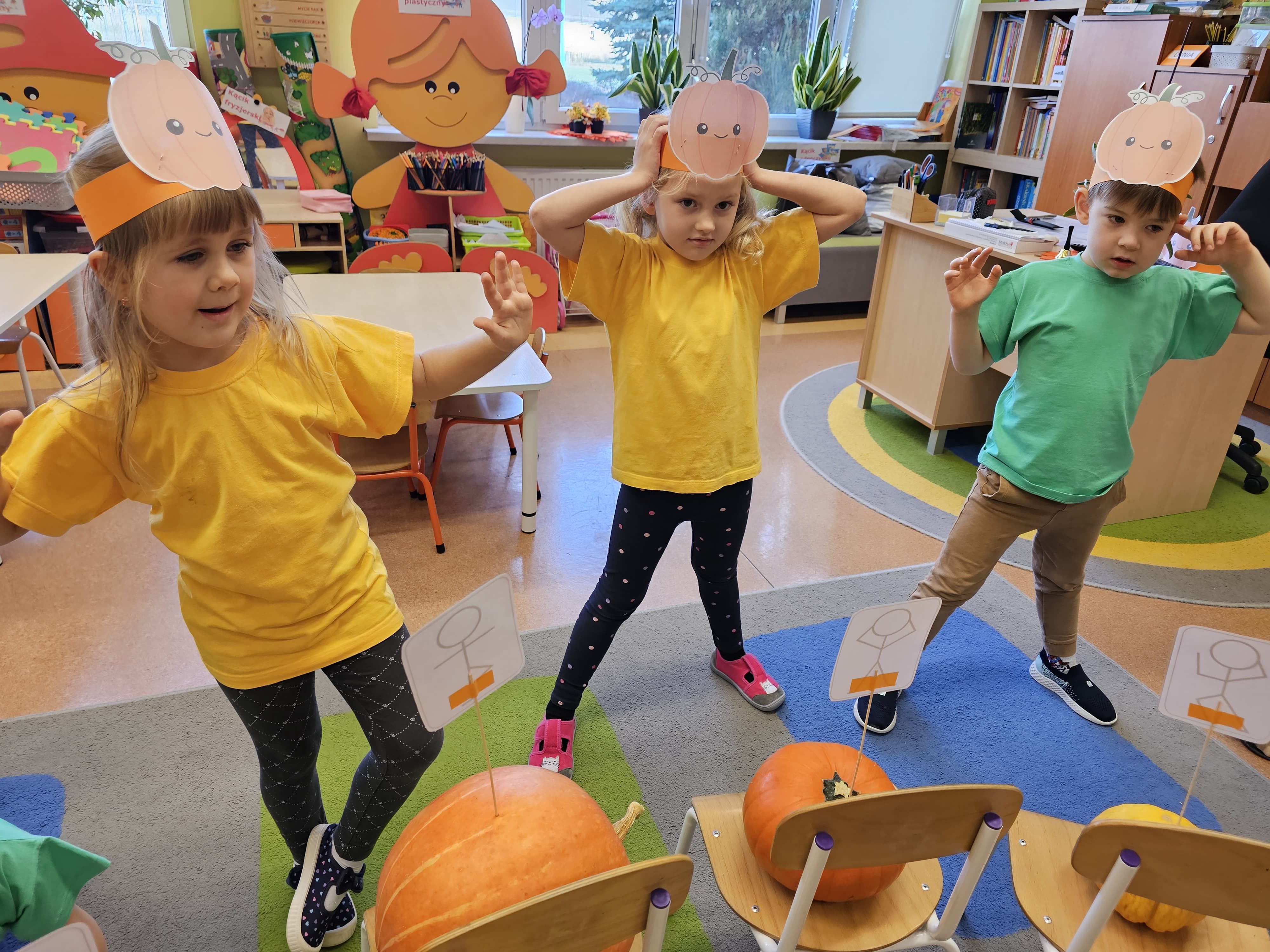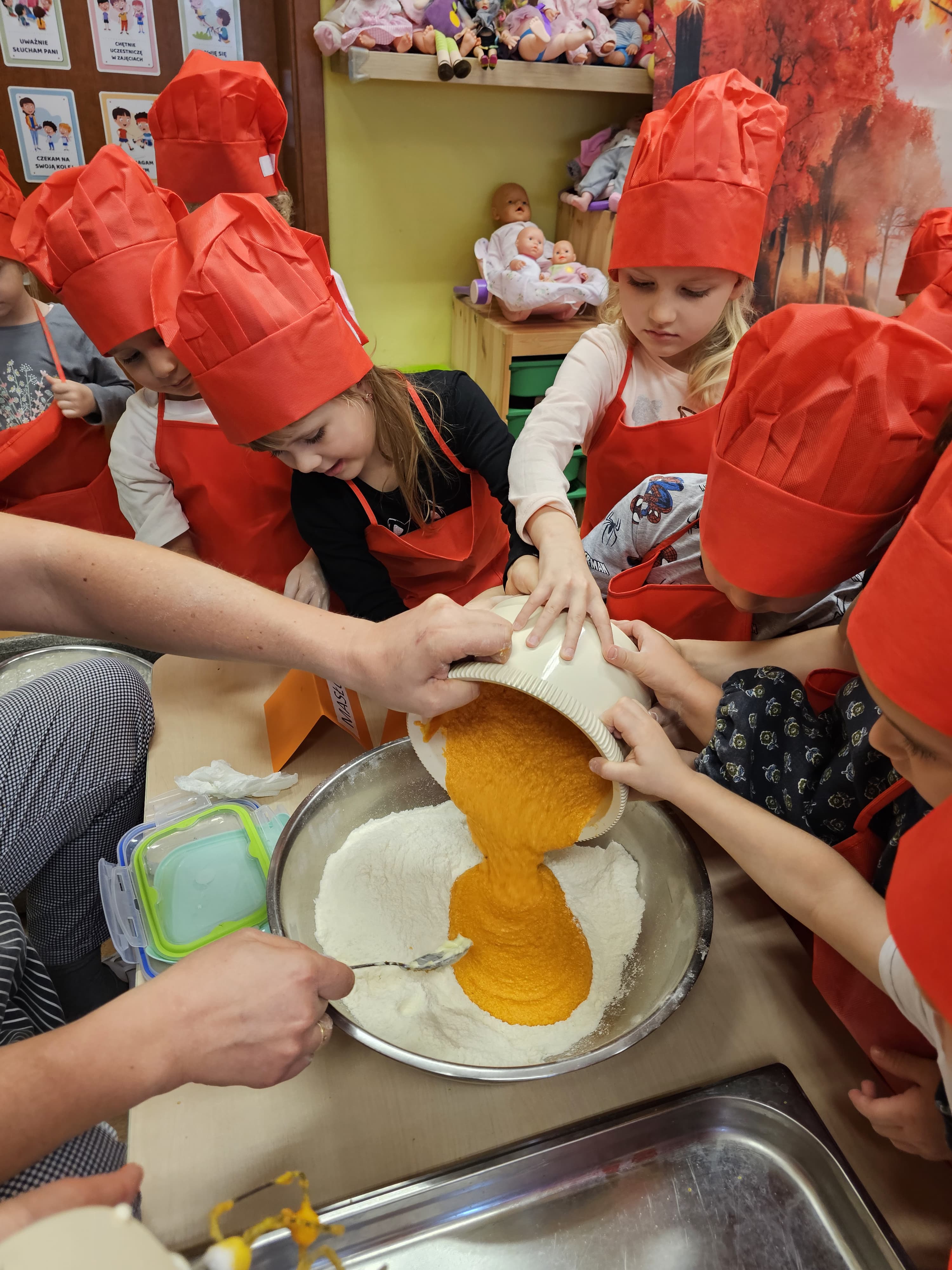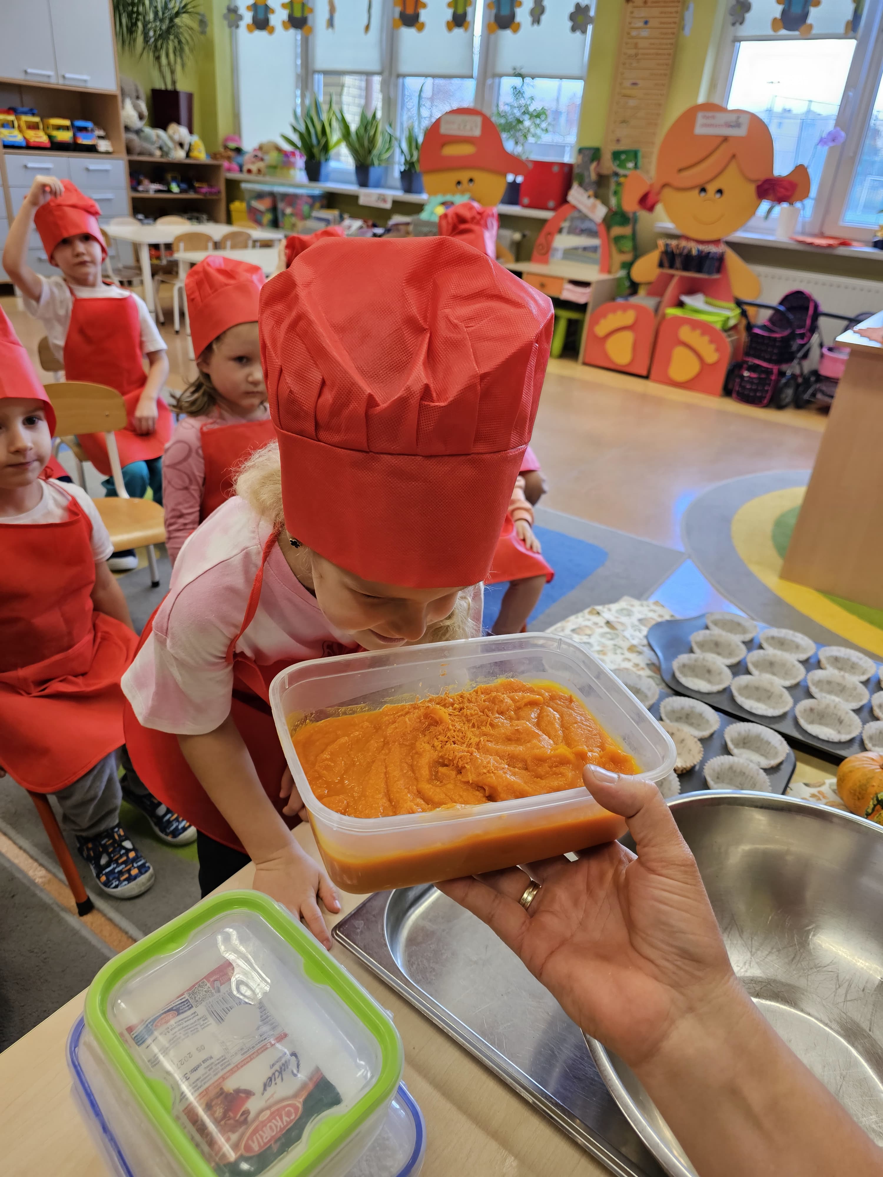 W grupie średniaków odbył się wyjątkowy „Dzień Dyni”. Sala tego dnia wypełniła się pomarańczowymi barwami, dyniowymi dekoracjami i radosnym śmiechem naszych małych przedszkolaków. Podczas zajęć dzieci miały okazję poznać różne odmiany dyni, obejrzeć ją z bliska, dotknąć, powąchać i zajrzeć do jej wnętrza. Wspólnie zastanawiały się, do czego można wykorzystać to niezwykłe warzywo i dlaczego warto je jeść. Gościem specjalnym  był kucharz przedszkolny P. Przemek, który opowiedział dzieciom o wartościach odżywczych dyni – o tym, że zawiera dużo witamin, wspiera odporność i jest bardzo zdrowa. Dzieci z dużym zainteresowaniem słuchały i aktywnie uczestniczyły w rozmowie. Następnie przedszkolaki wzięły udział w warsztatach kulinarnych, podczas których wspólnie z kucharzem  przygotowały muffinki dyniowe. Każde dziecko mogło dodać składniki, wymieszać ciasto i nałożyć je do foremek. W całym przedszkolu unosił się zapach jesiennych wypieków! Oprócz zajęć kulinarnych dzieci uczestniczyły także w różnorodnych działaniach tematycznych – brały udział w konkursach, pracach plastycznych oraz wspólnym śpiewaniu jesiennych piosenek. W trosce o zdrowie, bardzo cenne o tej porze roku, nie zabrakło również jesienno - dyniowej ścieżki ruchowej oraz gimnastyki z dynią. Na zakończenie dnia odbyła się degustacja muffinek, które wszystkim bardzo smakowały. Każdy mały kucharz otrzymał pamiątkową dynię, a w sali długo jeszcze unosił się zapach jesieni i radości ze wspólnego świętowania Dnia Dyni. To było naprawdę udane, kreatywne,pełne kolorów i smaków Święto Dyni !