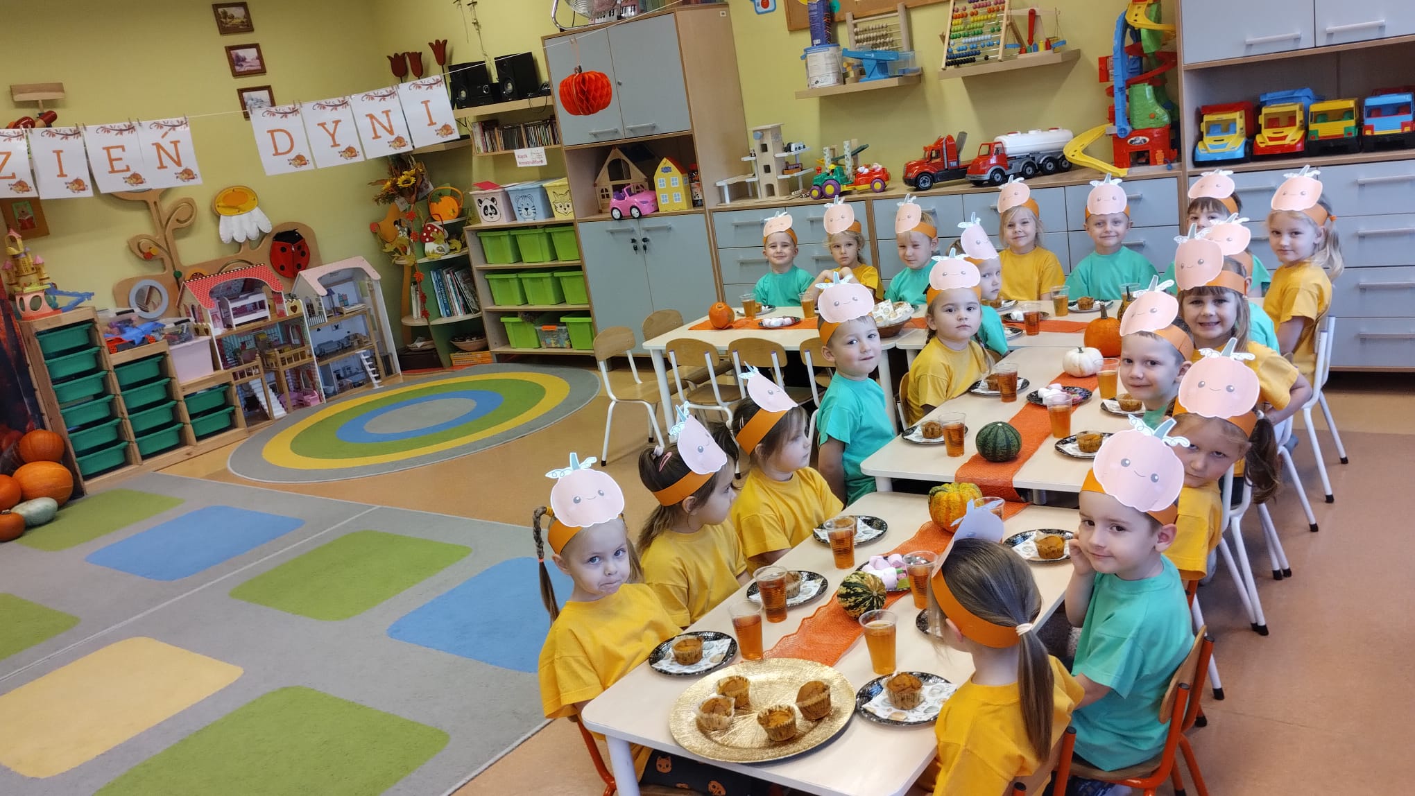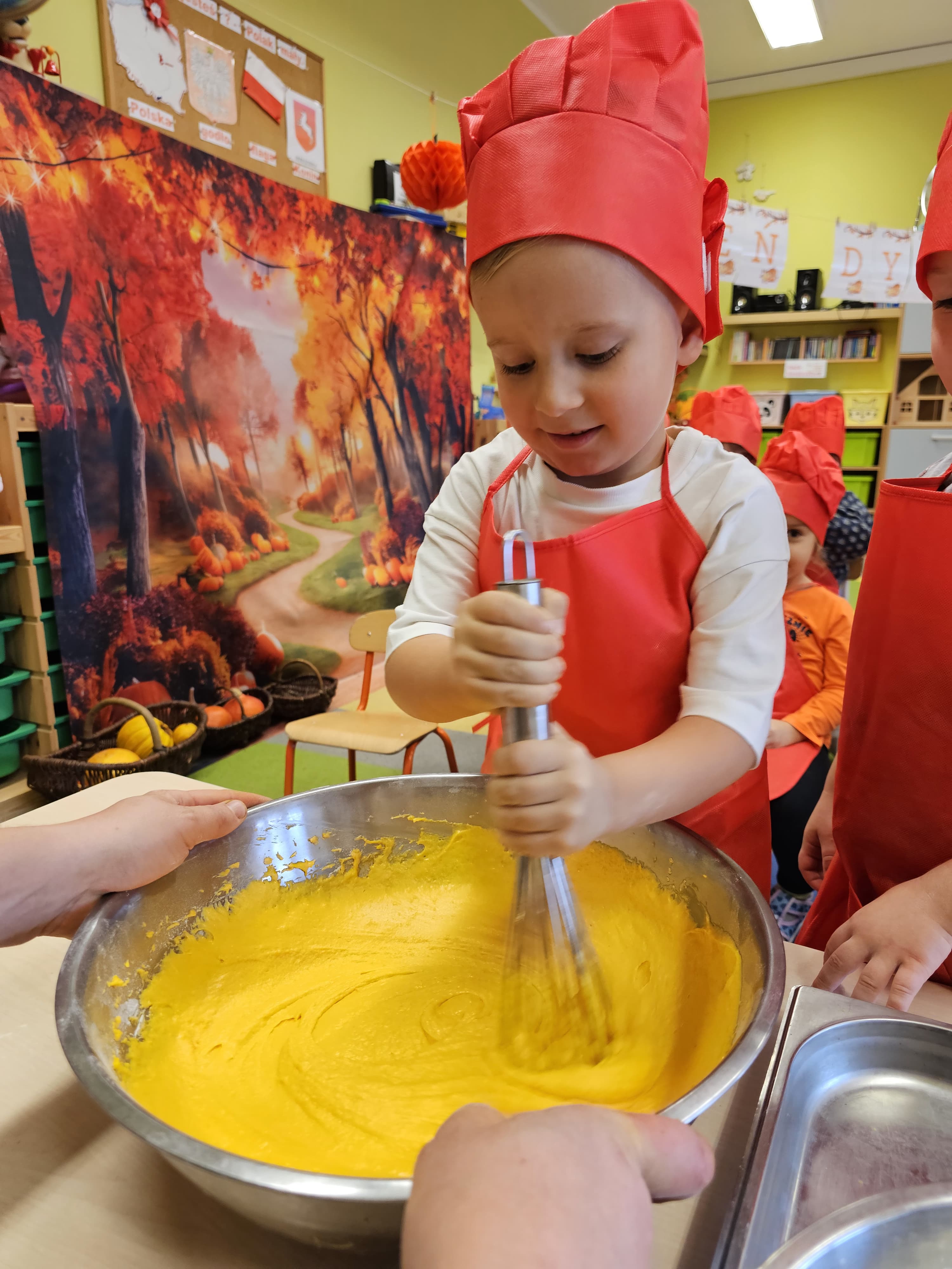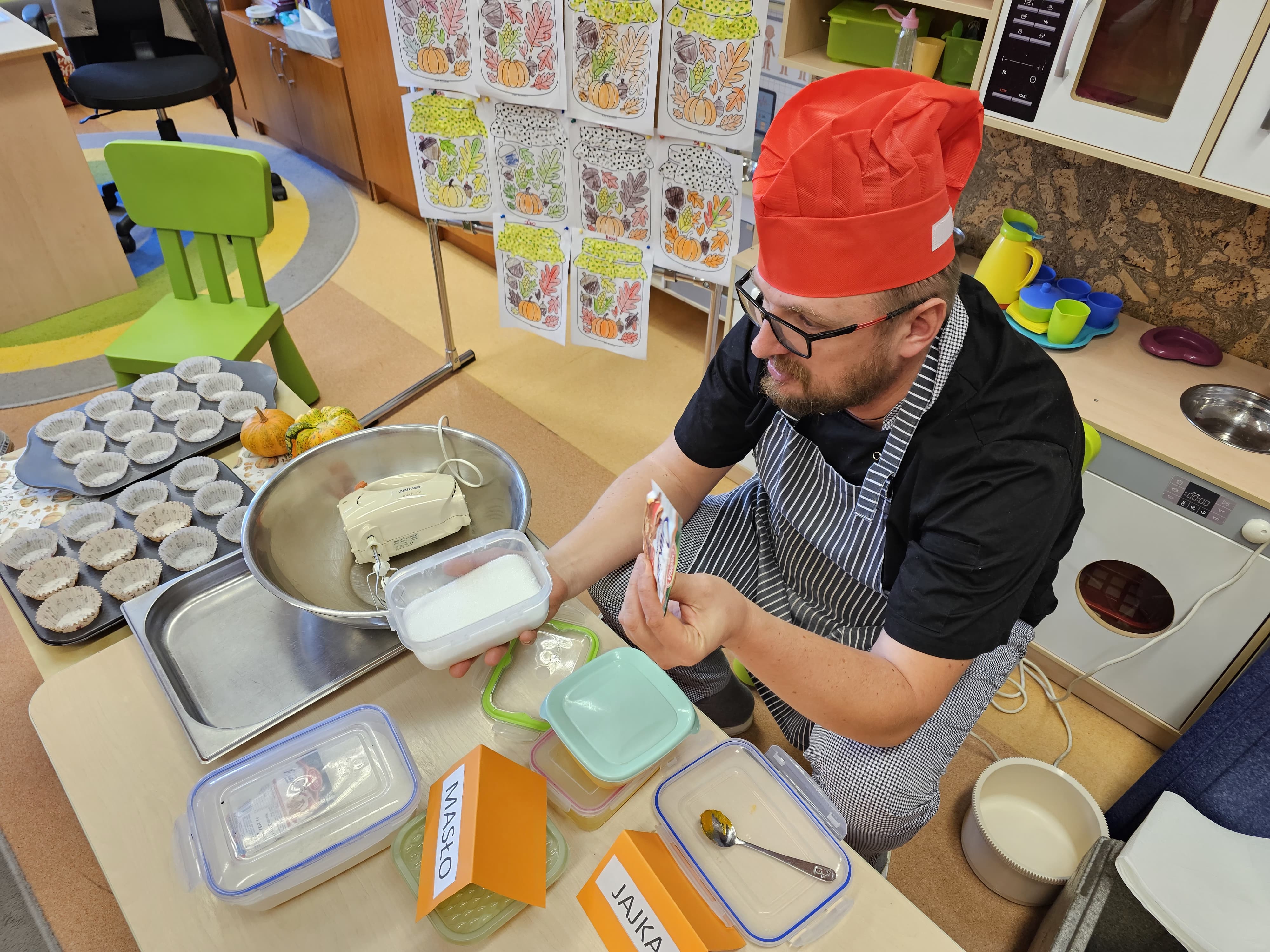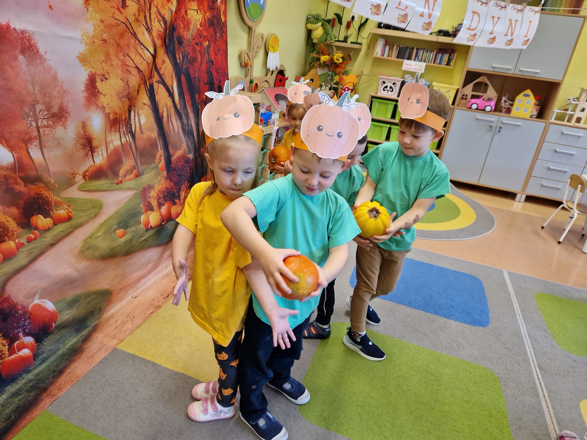 W grupie średniaków odbył się wyjątkowy „Dzień Dyni”. Sala tego dnia wypełniła się pomarańczowymi barwami, dyniowymi dekoracjami i radosnym śmiechem naszych małych przedszkolaków. Podczas zajęć dzieci miały okazję poznać różne odmiany dyni, obejrzeć ją z bliska, dotknąć, powąchać i zajrzeć do jej wnętrza. Wspólnie zastanawiały się, do czego można wykorzystać to niezwykłe warzywo i dlaczego warto je jeść. Gościem specjalnym  był kucharz przedszkolny P. Przemek, który opowiedział dzieciom o wartościach odżywczych dyni – o tym, że zawiera dużo witamin, wspiera odporność i jest bardzo zdrowa. Dzieci z dużym zainteresowaniem słuchały i aktywnie uczestniczyły w rozmowie. Następnie przedszkolaki wzięły udział w warsztatach kulinarnych, podczas których wspólnie z kucharzem  przygotowały muffinki dyniowe. Każde dziecko mogło dodać składniki, wymieszać ciasto i nałożyć je do foremek. W całym przedszkolu unosił się zapach jesiennych wypieków! Oprócz zajęć kulinarnych dzieci uczestniczyły także w różnorodnych działaniach tematycznych – brały udział w konkursach, pracach plastycznych oraz wspólnym śpiewaniu jesiennych piosenek. W trosce o zdrowie, bardzo cenne o tej porze roku, nie zabrakło również jesienno - dyniowej ścieżki ruchowej oraz gimnastyki z dynią. Na zakończenie dnia odbyła się degustacja muffinek, które wszystkim bardzo smakowały. Każdy mały kucharz otrzymał pamiątkową dynię, a w sali długo jeszcze unosił się zapach jesieni i radości ze wspólnego świętowania Dnia Dyni. To było naprawdę udane, kreatywne,pełne kolorów i smaków Święto Dyni !