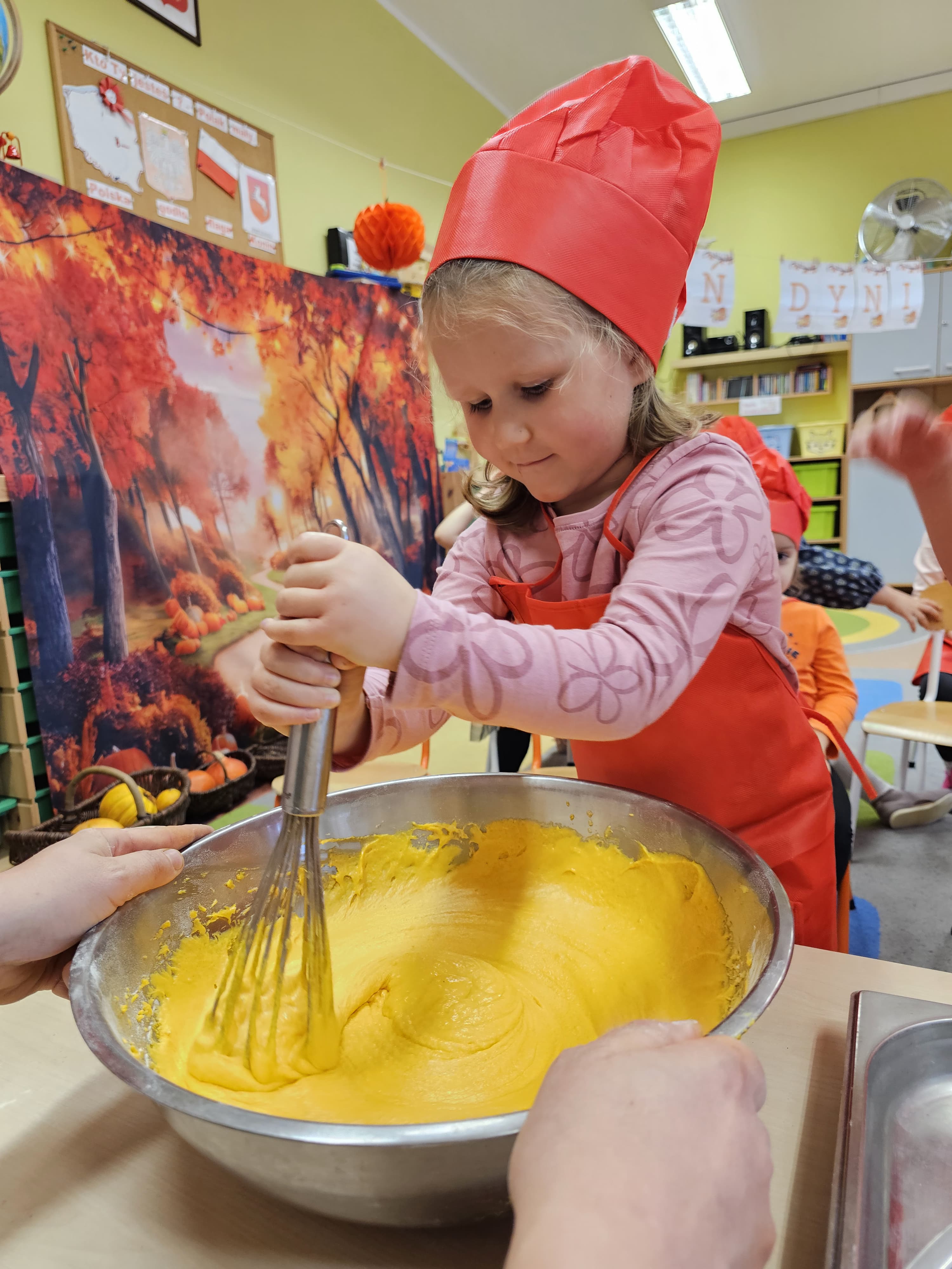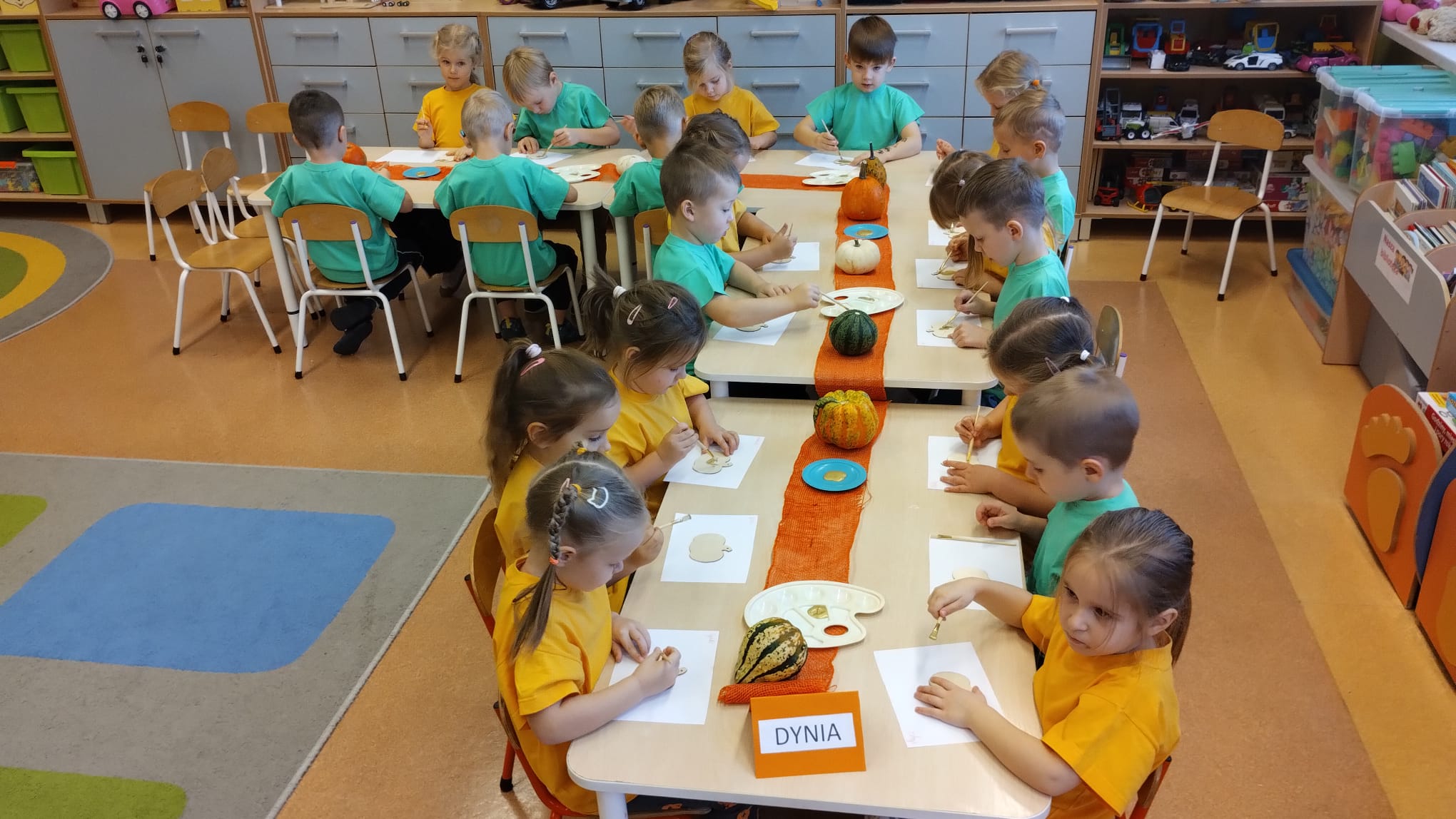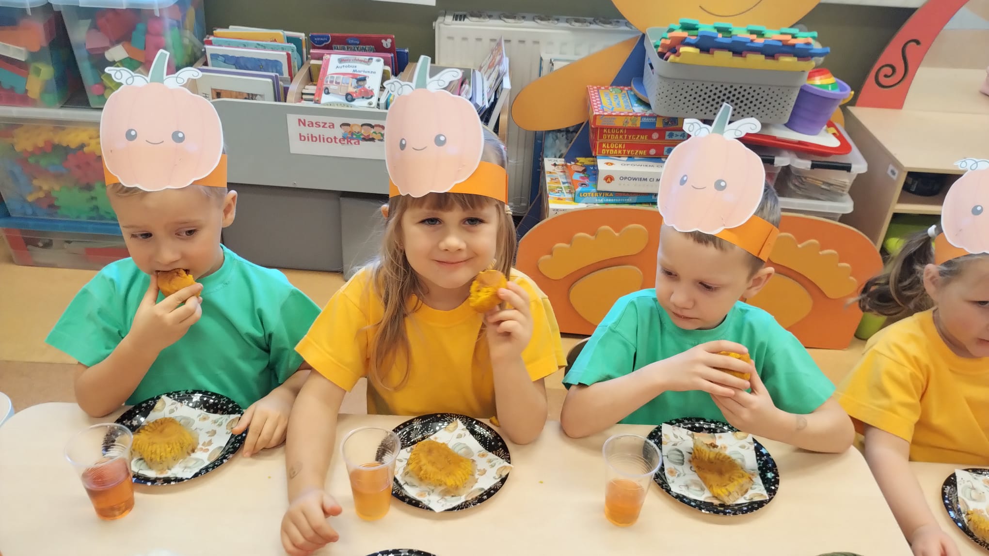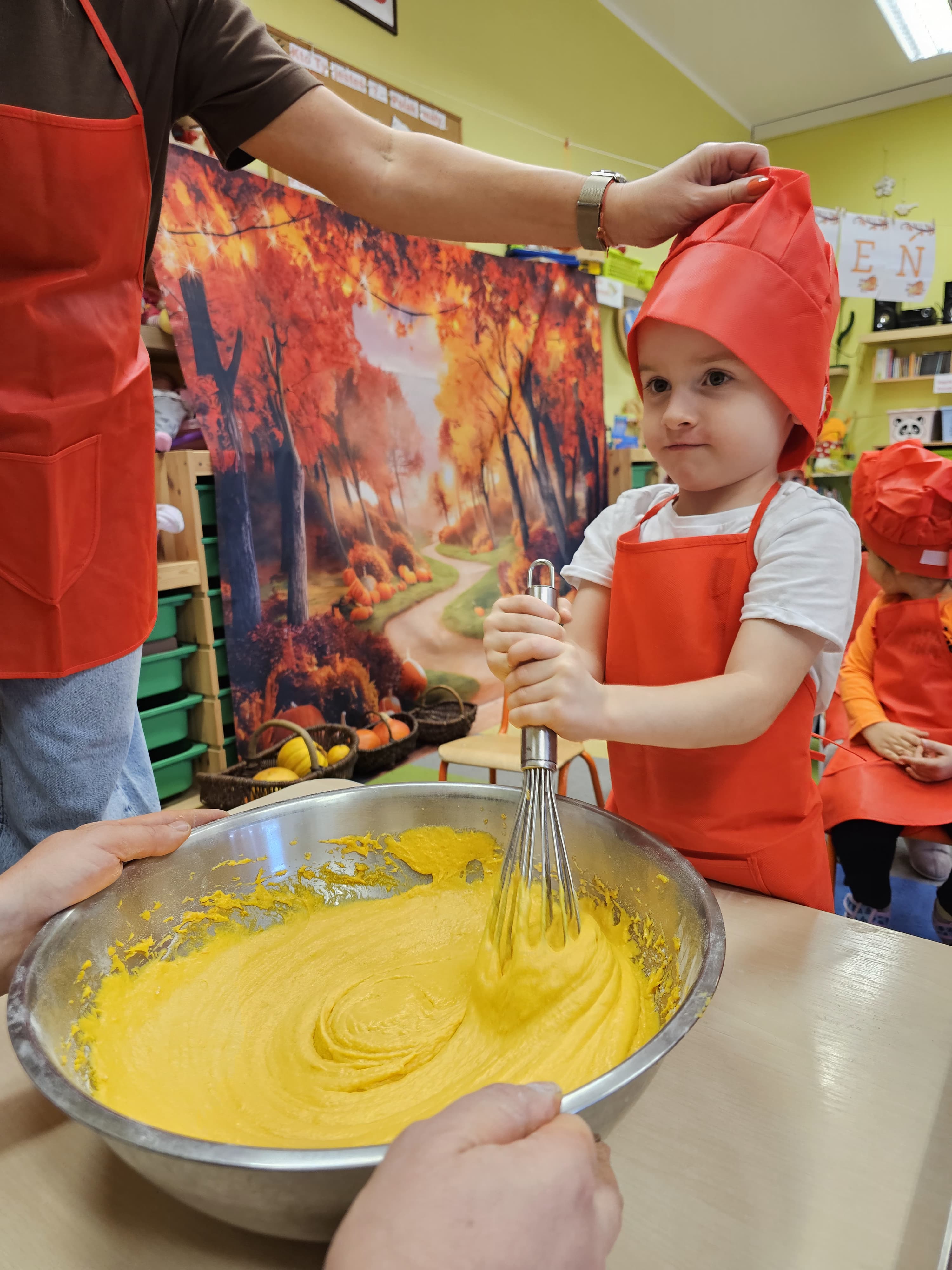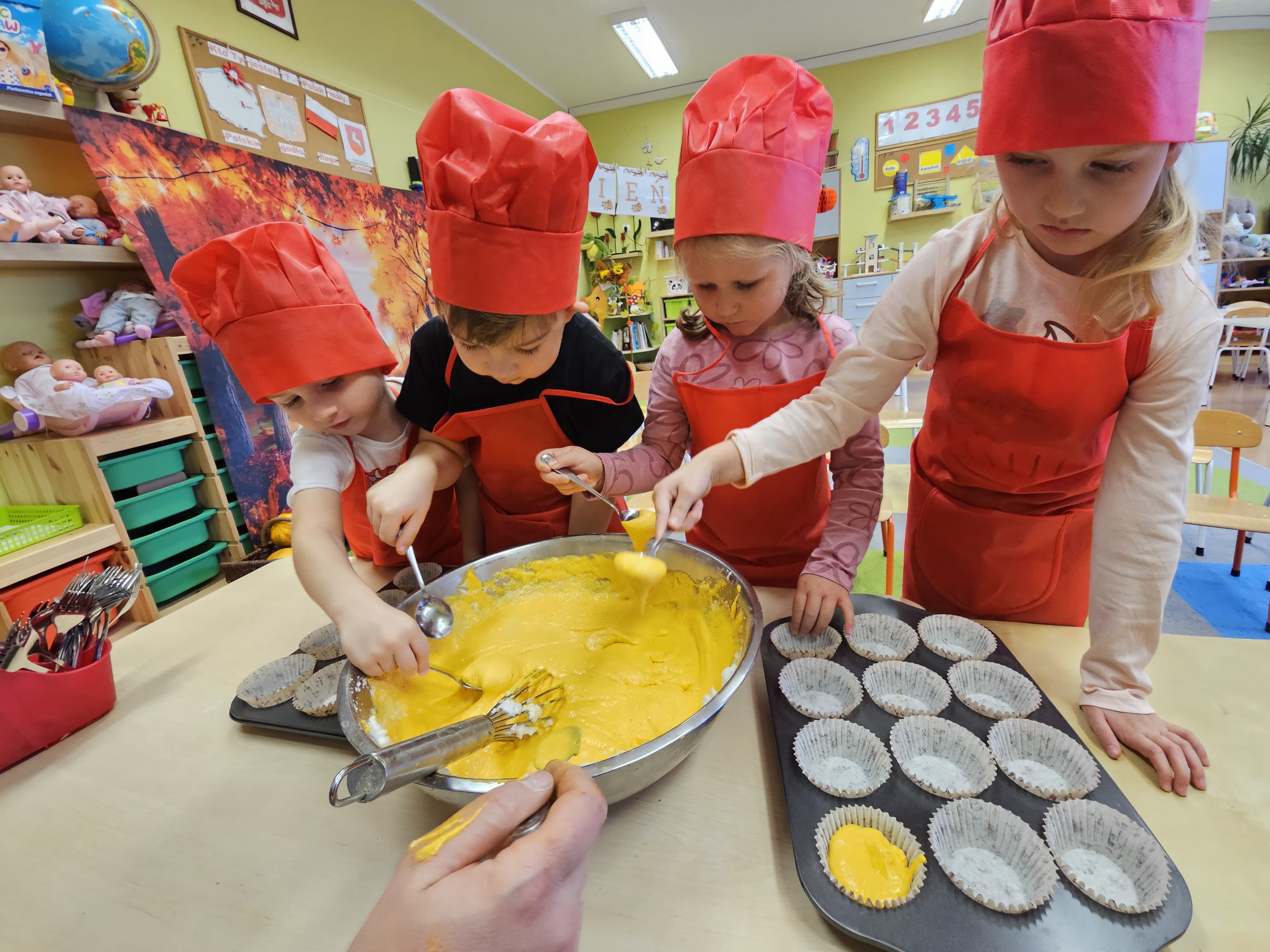 W grupie średniaków odbył się wyjątkowy „Dzień Dyni”. Sala tego dnia wypełniła się pomarańczowymi barwami, dyniowymi dekoracjami i radosnym śmiechem naszych małych przedszkolaków. Podczas zajęć dzieci miały okazję poznać różne odmiany dyni, obejrzeć ją z bliska, dotknąć, powąchać i zajrzeć do jej wnętrza. Wspólnie zastanawiały się, do czego można wykorzystać to niezwykłe warzywo i dlaczego warto je jeść. Gościem specjalnym  był kucharz przedszkolny P. Przemek, który opowiedział dzieciom o wartościach odżywczych dyni – o tym, że zawiera dużo witamin, wspiera odporność i jest bardzo zdrowa. Dzieci z dużym zainteresowaniem słuchały i aktywnie uczestniczyły w rozmowie. Następnie przedszkolaki wzięły udział w warsztatach kulinarnych, podczas których wspólnie z kucharzem  przygotowały muffinki dyniowe. Każde dziecko mogło dodać składniki, wymieszać ciasto i nałożyć je do foremek. W całym przedszkolu unosił się zapach jesiennych wypieków! Oprócz zajęć kulinarnych dzieci uczestniczyły także w różnorodnych działaniach tematycznych – brały udział w konkursach, pracach plastycznych oraz wspólnym śpiewaniu jesiennych piosenek. W trosce o zdrowie, bardzo cenne o tej porze roku, nie zabrakło również jesienno - dyniowej ścieżki ruchowej oraz gimnastyki z dynią. Na zakończenie dnia odbyła się degustacja muffinek, które wszystkim bardzo smakowały. Każdy mały kucharz otrzymał pamiątkową dynię, a w sali długo jeszcze unosił się zapach jesieni i radości ze wspólnego świętowania Dnia Dyni. To było naprawdę udane, kreatywne,pełne kolorów i smaków Święto Dyni !