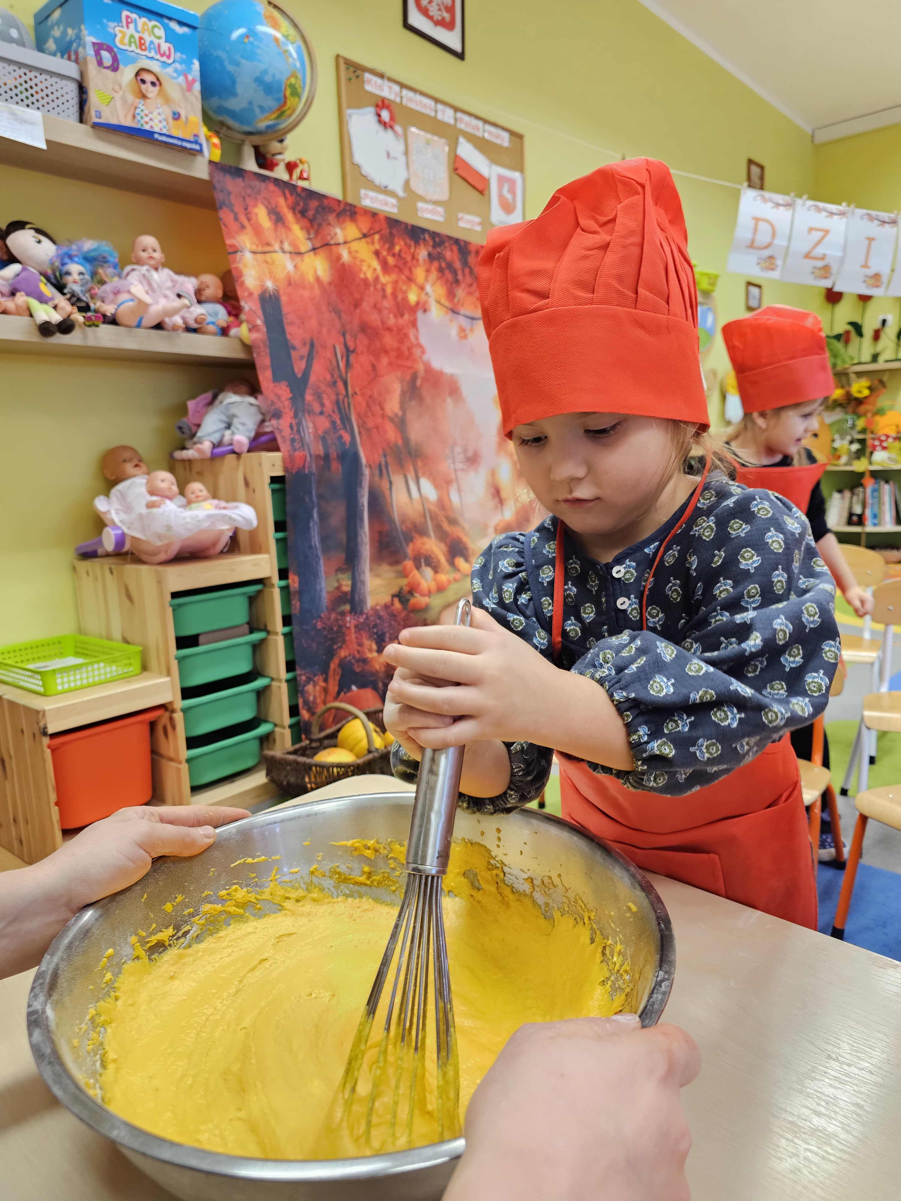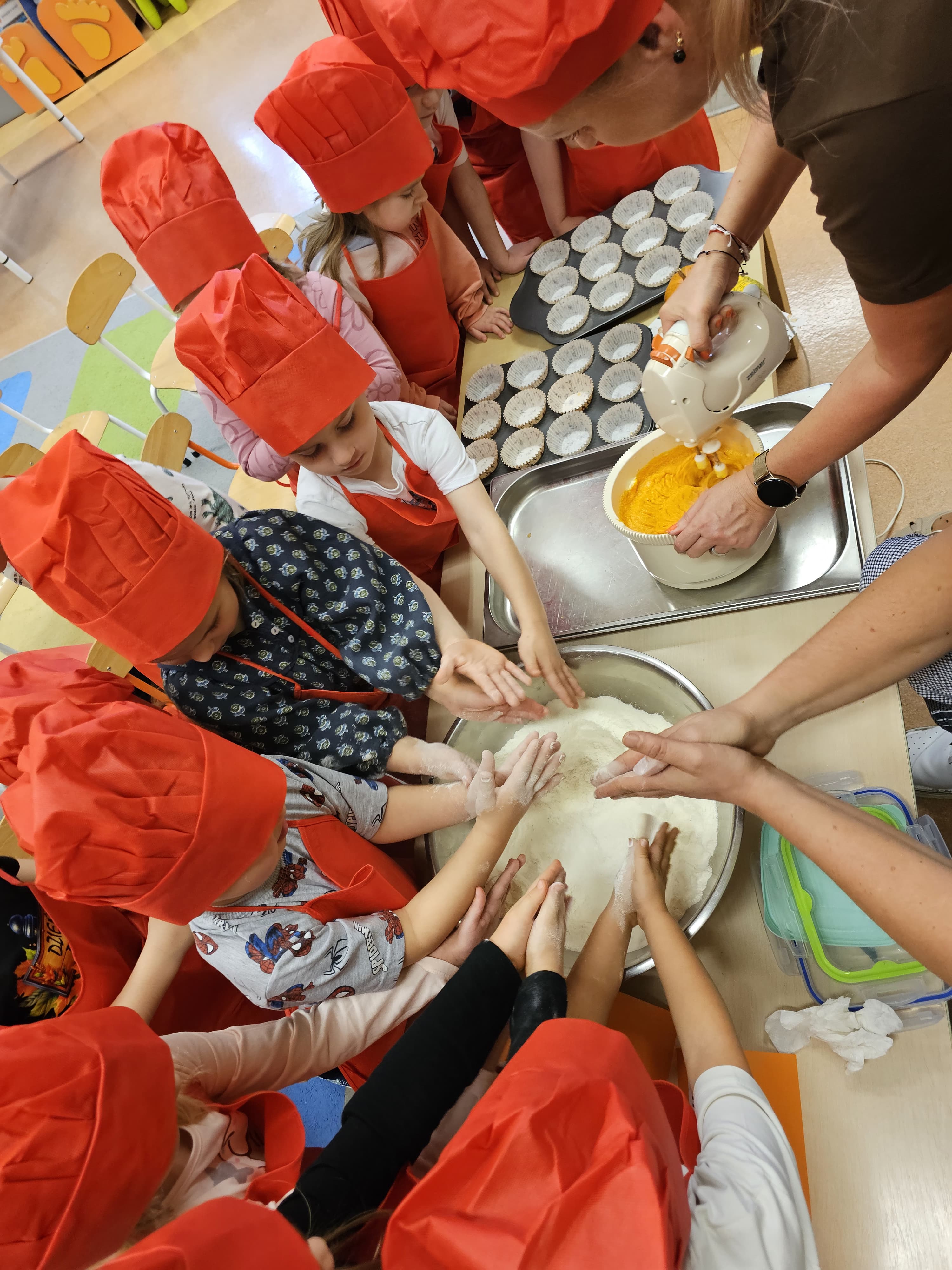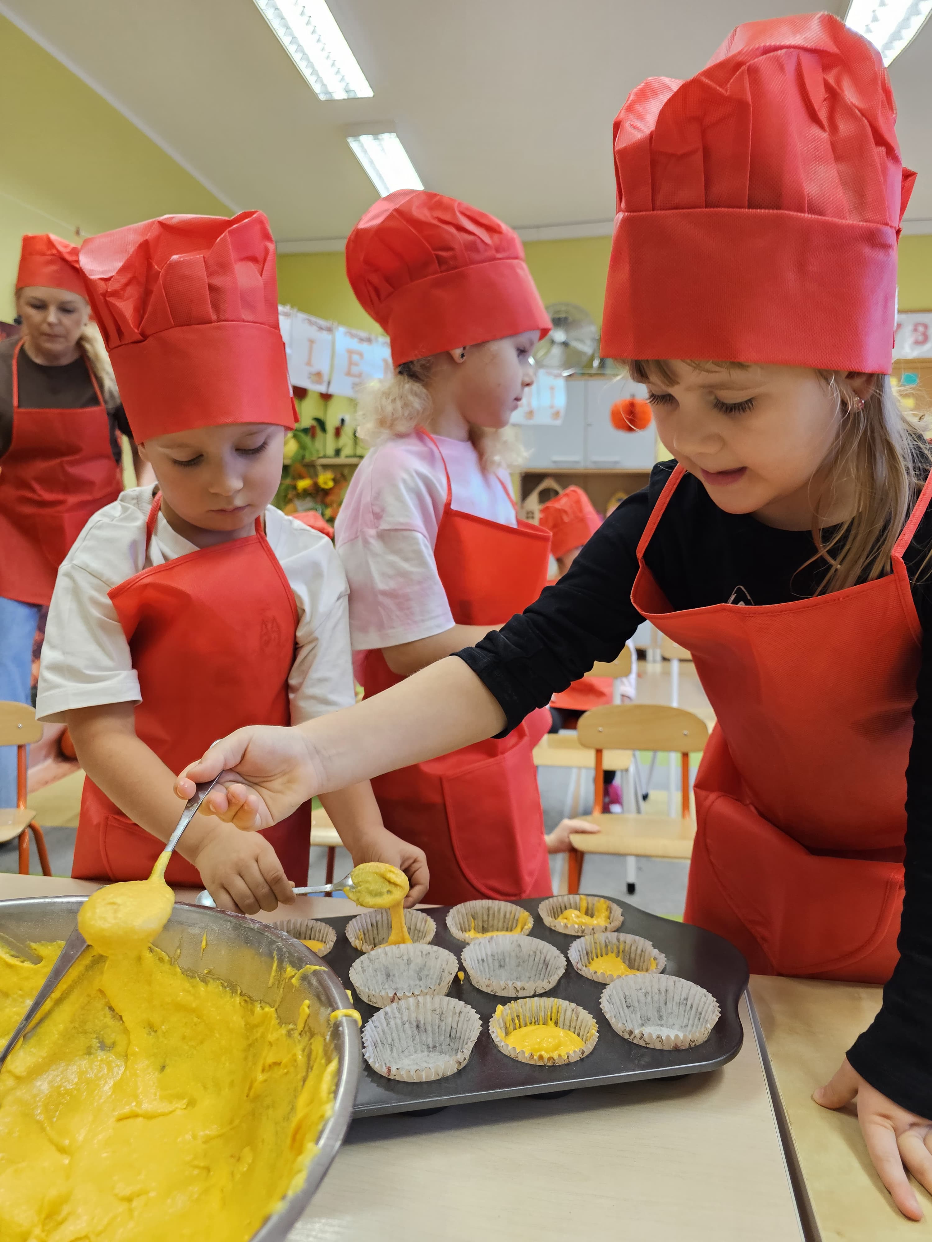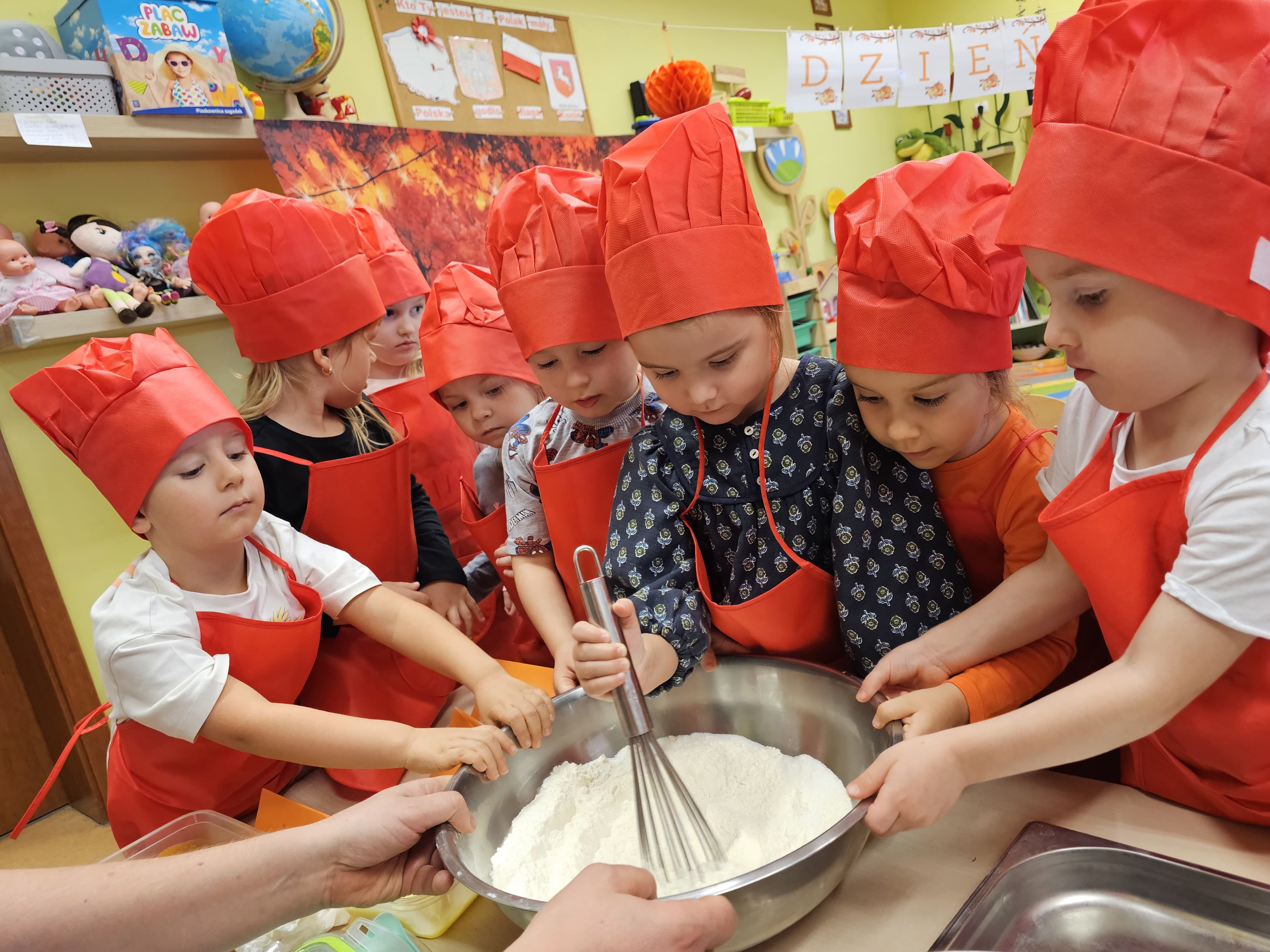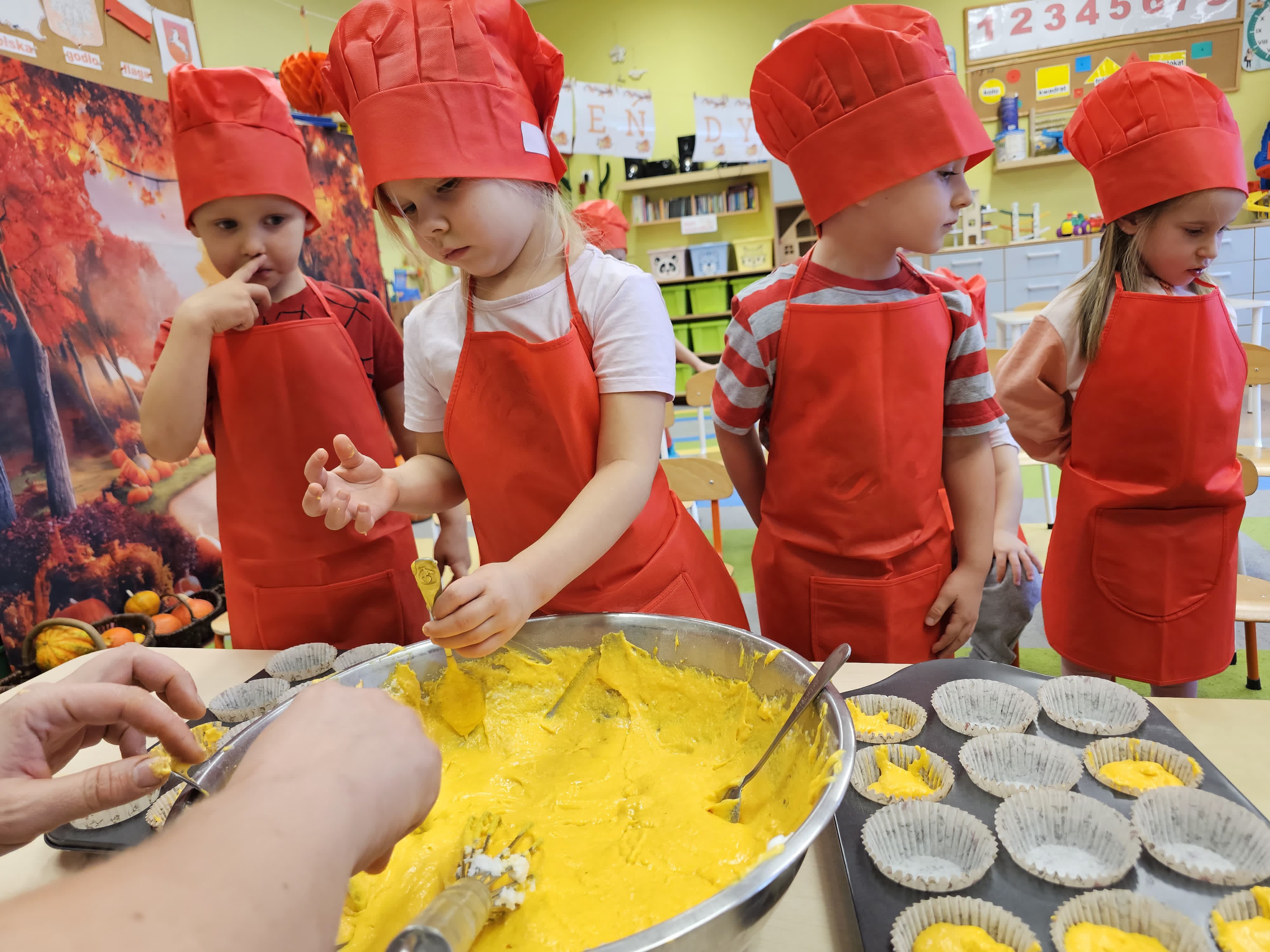 W grupie średniaków odbył się wyjątkowy „Dzień Dyni”. Sala tego dnia wypełniła się pomarańczowymi barwami, dyniowymi dekoracjami i radosnym śmiechem naszych małych przedszkolaków. Podczas zajęć dzieci miały okazję poznać różne odmiany dyni, obejrzeć ją z bliska, dotknąć, powąchać i zajrzeć do jej wnętrza. Wspólnie zastanawiały się, do czego można wykorzystać to niezwykłe warzywo i dlaczego warto je jeść. Gościem specjalnym  był kucharz przedszkolny P. Przemek, który opowiedział dzieciom o wartościach odżywczych dyni – o tym, że zawiera dużo witamin, wspiera odporność i jest bardzo zdrowa. Dzieci z dużym zainteresowaniem słuchały i aktywnie uczestniczyły w rozmowie. Następnie przedszkolaki wzięły udział w warsztatach kulinarnych, podczas których wspólnie z kucharzem  przygotowały muffinki dyniowe. Każde dziecko mogło dodać składniki, wymieszać ciasto i nałożyć je do foremek. W całym przedszkolu unosił się zapach jesiennych wypieków! Oprócz zajęć kulinarnych dzieci uczestniczyły także w różnorodnych działaniach tematycznych – brały udział w konkursach, pracach plastycznych oraz wspólnym śpiewaniu jesiennych piosenek. W trosce o zdrowie, bardzo cenne o tej porze roku, nie zabrakło również jesienno - dyniowej ścieżki ruchowej oraz gimnastyki z dynią. Na zakończenie dnia odbyła się degustacja muffinek, które wszystkim bardzo smakowały. Każdy mały kucharz otrzymał pamiątkową dynię, a w sali długo jeszcze unosił się zapach jesieni i radości ze wspólnego świętowania Dnia Dyni. To było naprawdę udane, kreatywne,pełne kolorów i smaków Święto Dyni !