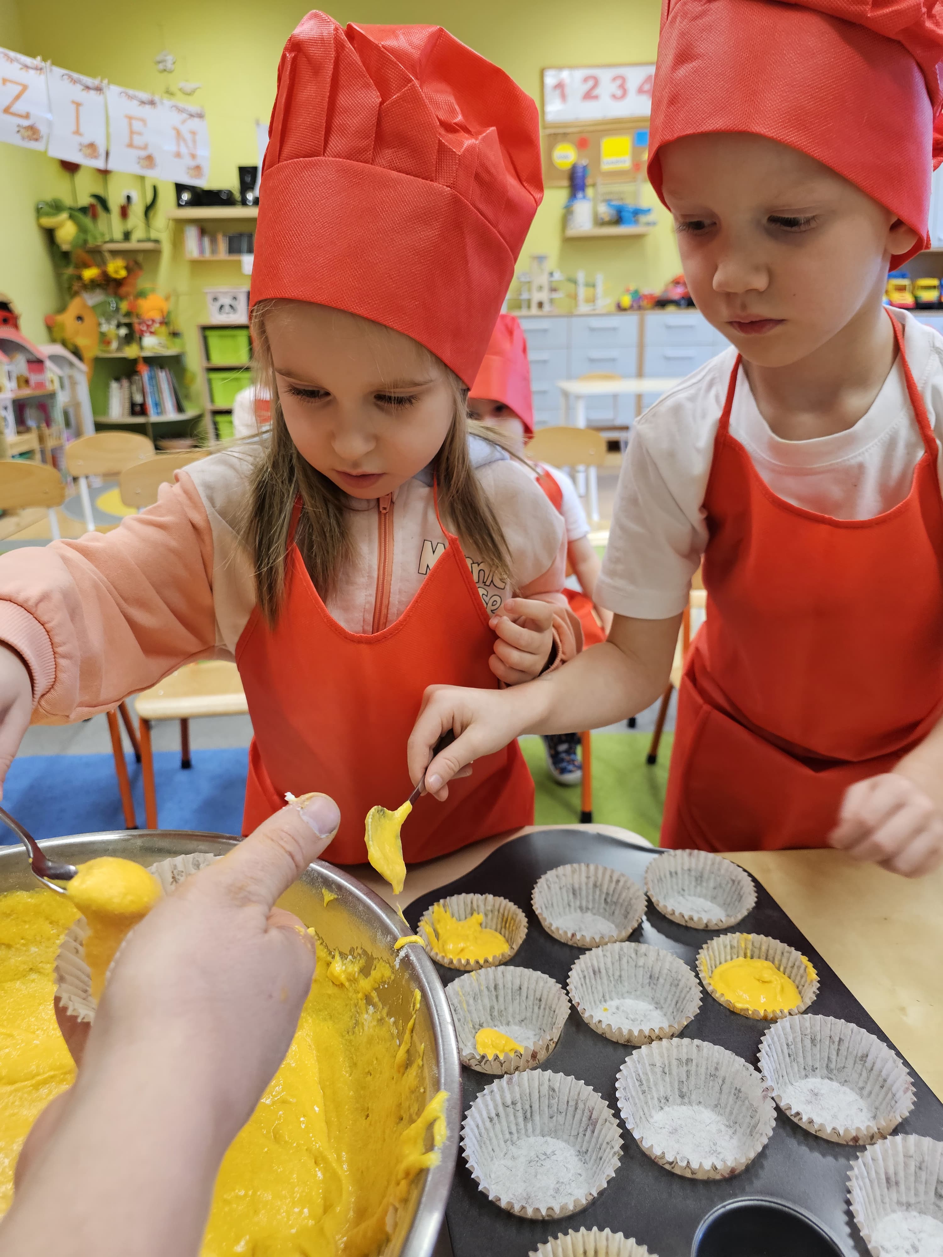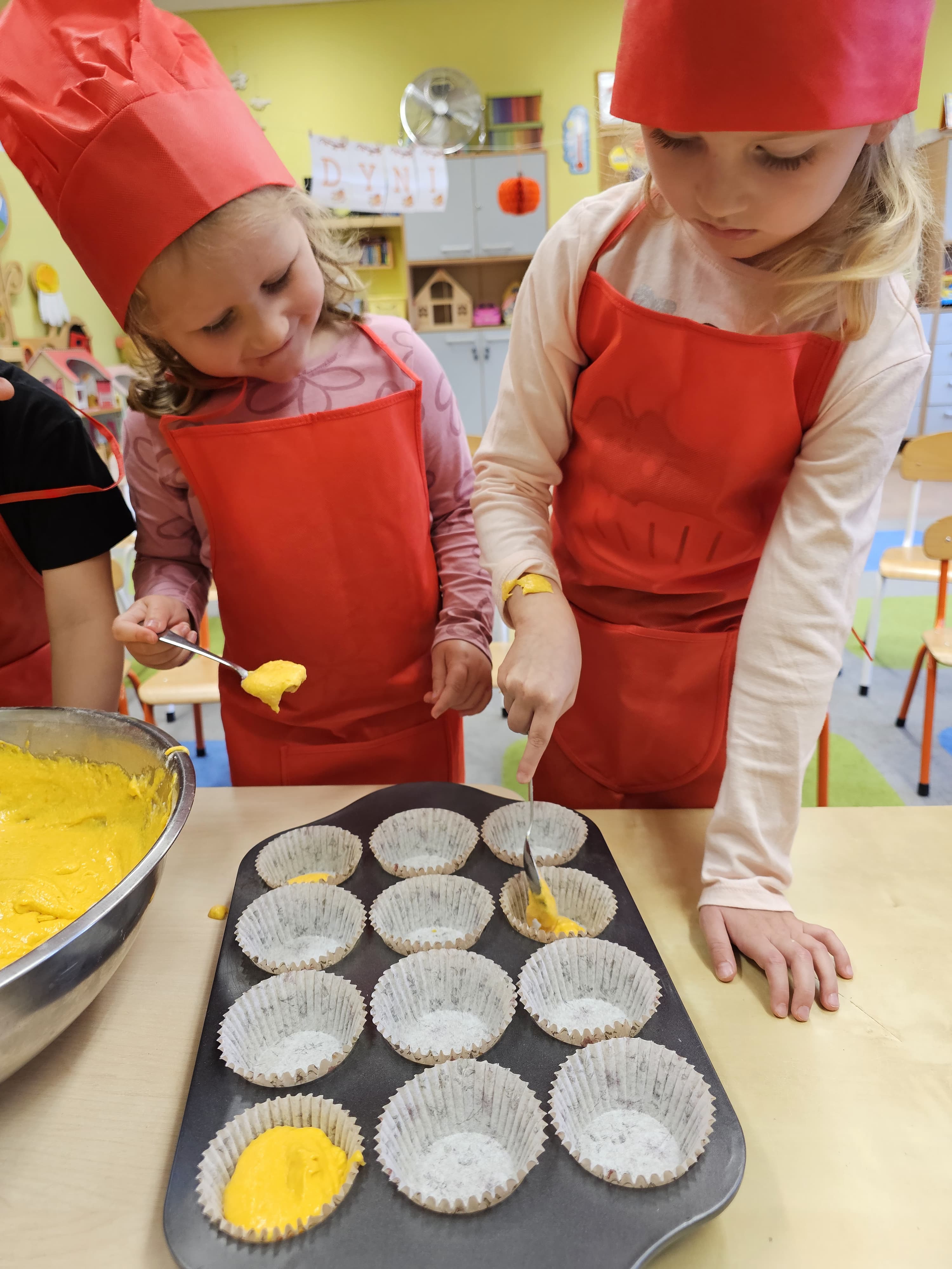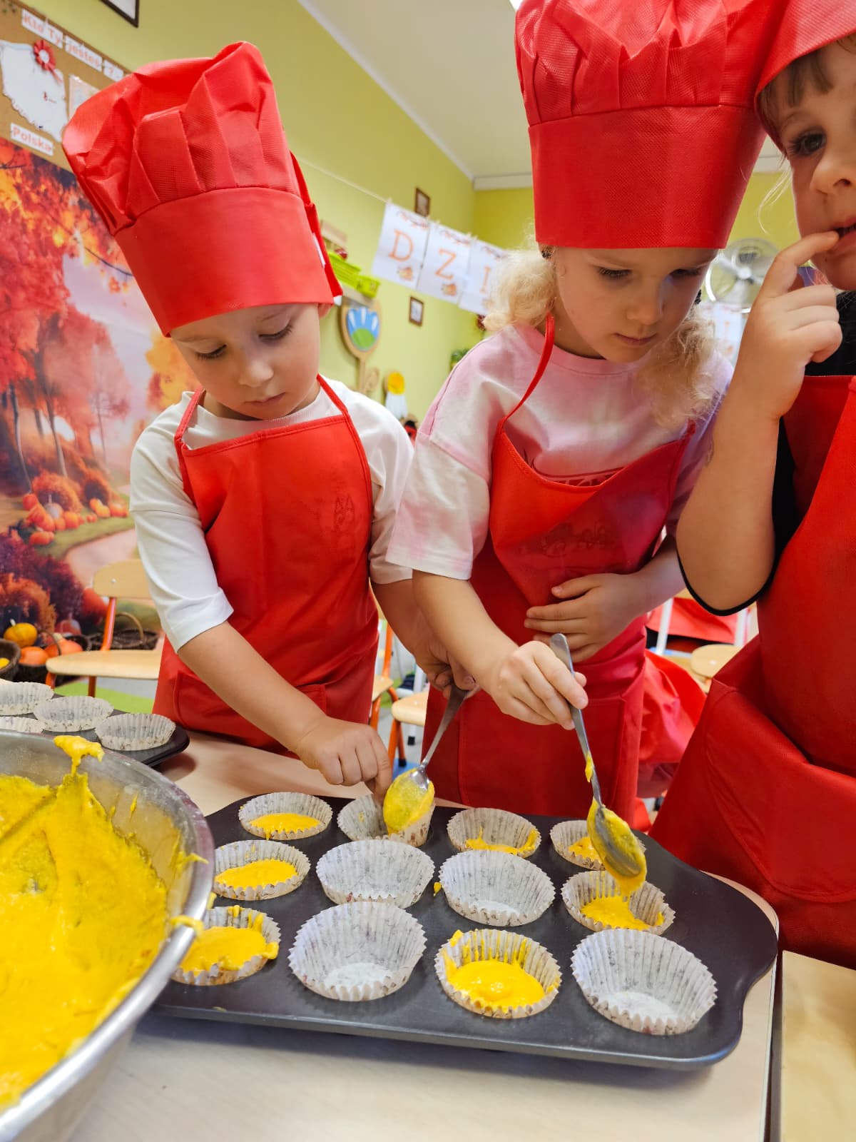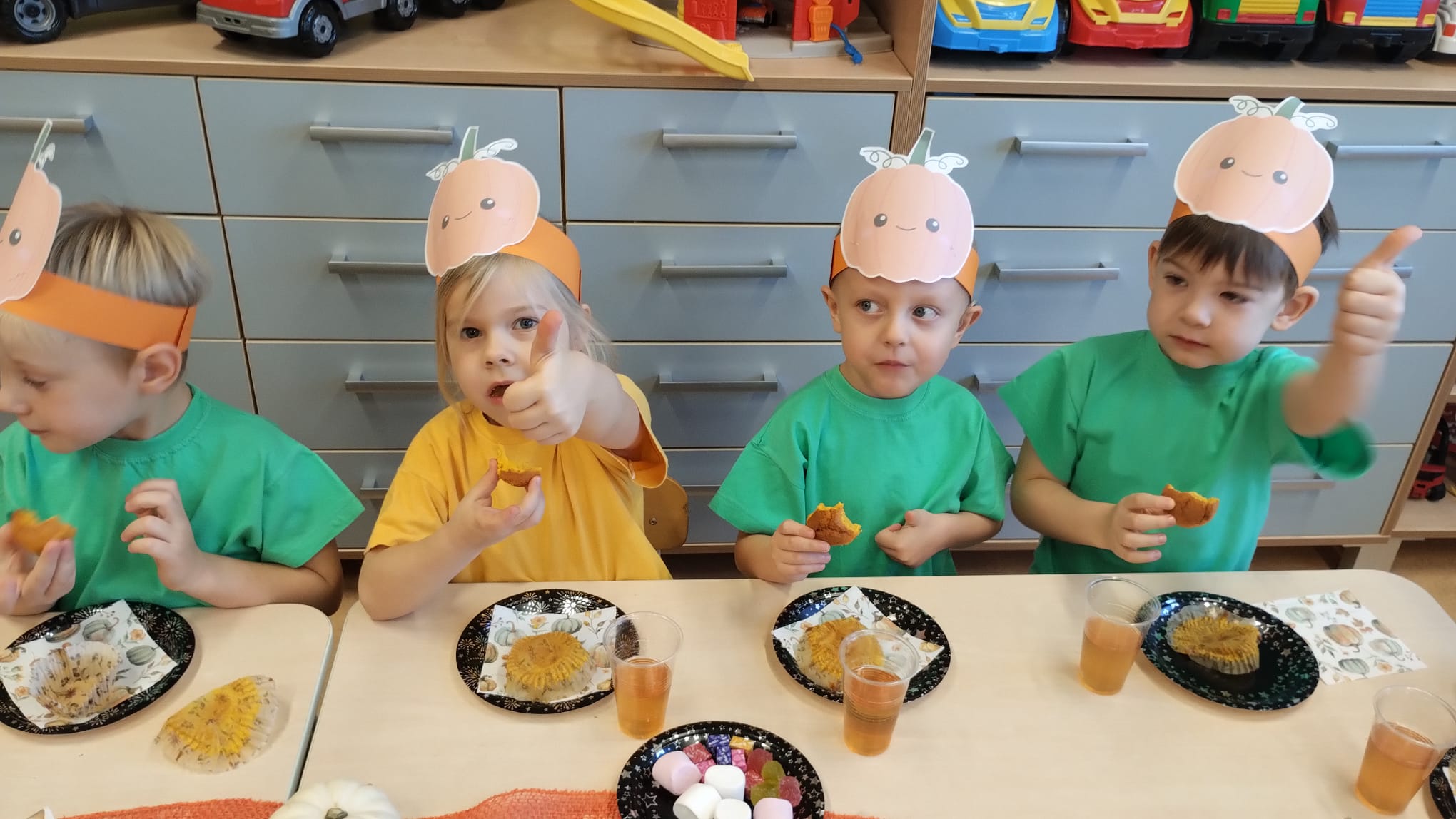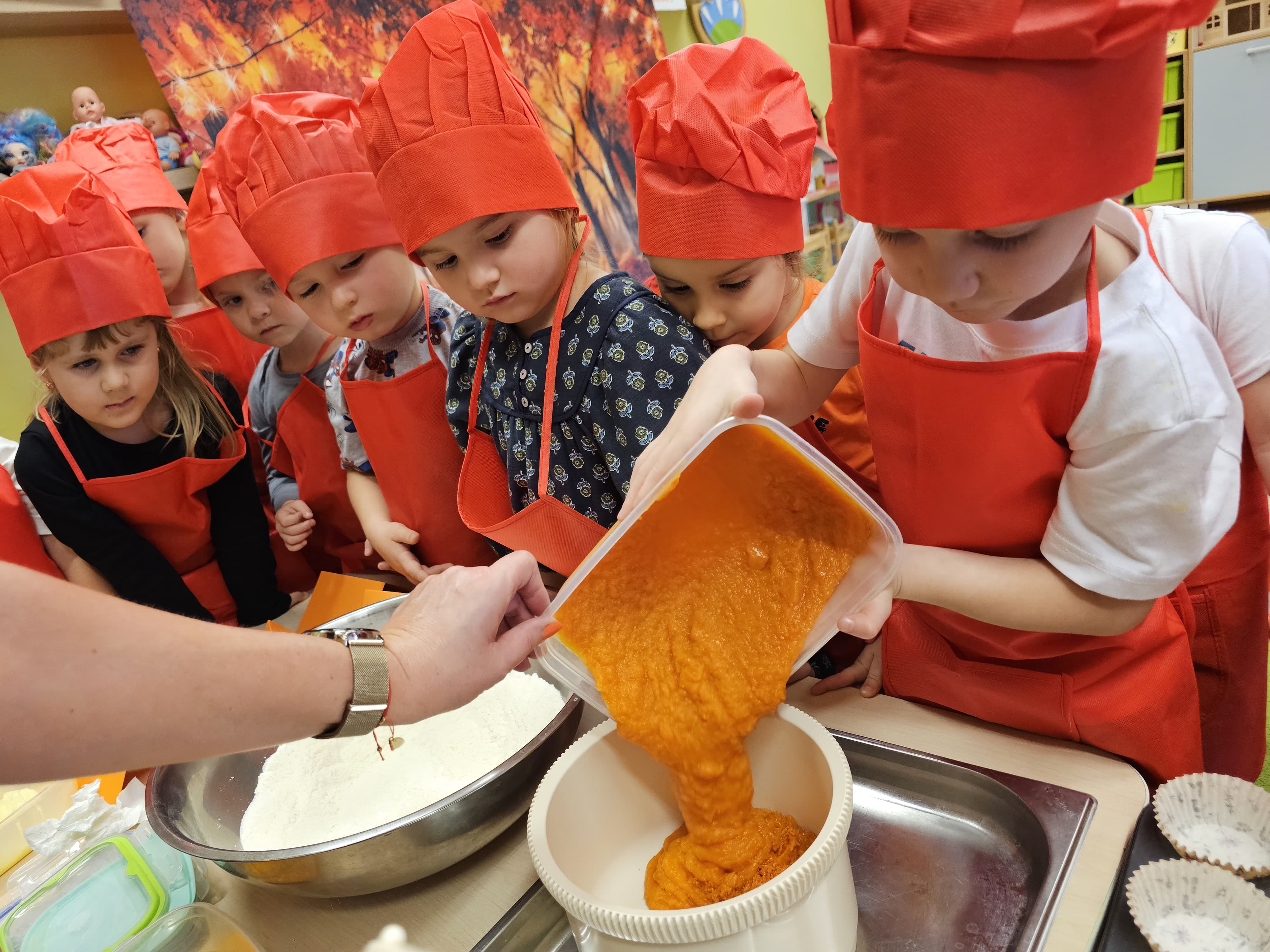 W grupie średniaków odbył się wyjątkowy „Dzień Dyni”. Sala tego dnia wypełniła się pomarańczowymi barwami, dyniowymi dekoracjami i radosnym śmiechem naszych małych przedszkolaków. Podczas zajęć dzieci miały okazję poznać różne odmiany dyni, obejrzeć ją z bliska, dotknąć, powąchać i zajrzeć do jej wnętrza. Wspólnie zastanawiały się, do czego można wykorzystać to niezwykłe warzywo i dlaczego warto je jeść. Gościem specjalnym  był kucharz przedszkolny P. Przemek, który opowiedział dzieciom o wartościach odżywczych dyni – o tym, że zawiera dużo witamin, wspiera odporność i jest bardzo zdrowa. Dzieci z dużym zainteresowaniem słuchały i aktywnie uczestniczyły w rozmowie. Następnie przedszkolaki wzięły udział w warsztatach kulinarnych, podczas których wspólnie z kucharzem  przygotowały muffinki dyniowe. Każde dziecko mogło dodać składniki, wymieszać ciasto i nałożyć je do foremek. W całym przedszkolu unosił się zapach jesiennych wypieków! Oprócz zajęć kulinarnych dzieci uczestniczyły także w różnorodnych działaniach tematycznych – brały udział w konkursach, pracach plastycznych oraz wspólnym śpiewaniu jesiennych piosenek. W trosce o zdrowie, bardzo cenne o tej porze roku, nie zabrakło również jesienno - dyniowej ścieżki ruchowej oraz gimnastyki z dynią. Na zakończenie dnia odbyła się degustacja muffinek, które wszystkim bardzo smakowały. Każdy mały kucharz otrzymał pamiątkową dynię, a w sali długo jeszcze unosił się zapach jesieni i radości ze wspólnego świętowania Dnia Dyni. To było naprawdę udane, kreatywne,pełne kolorów i smaków Święto Dyni !