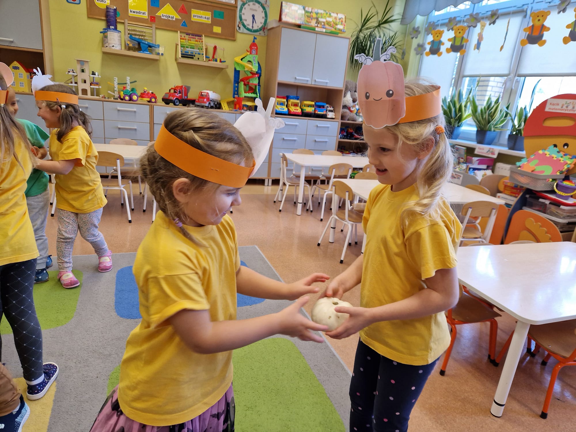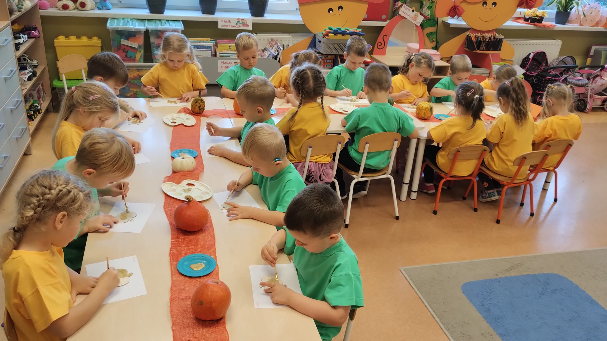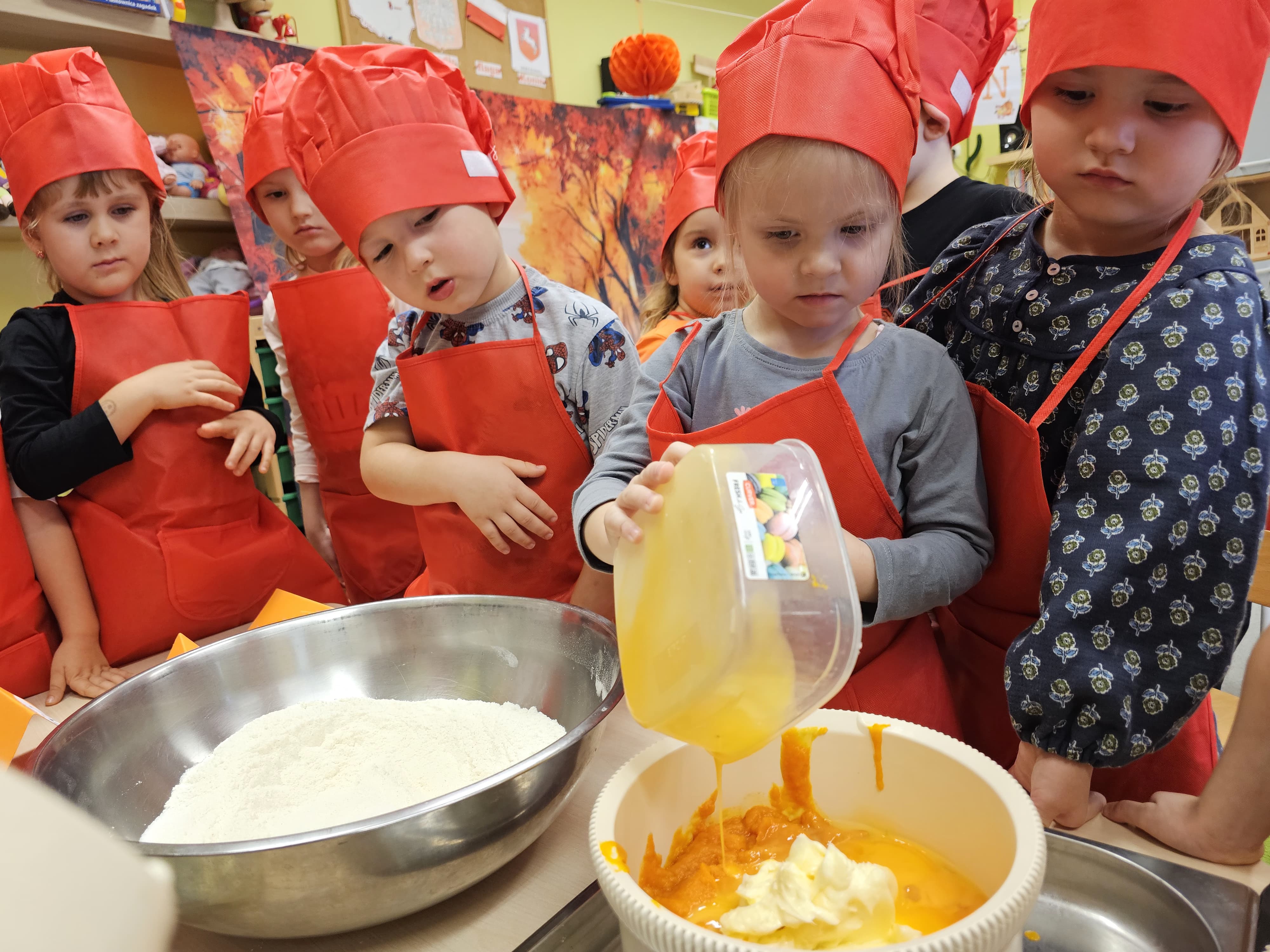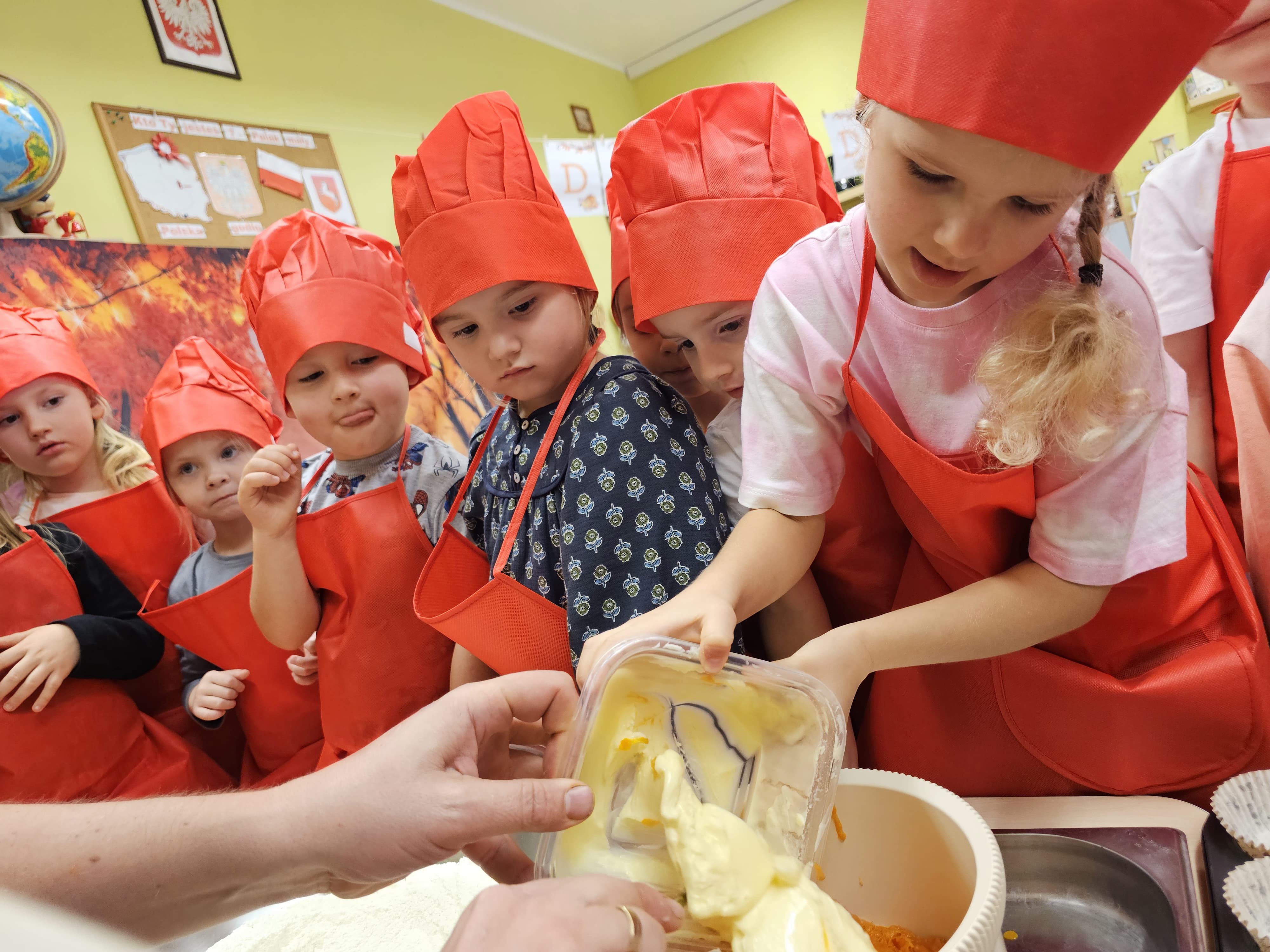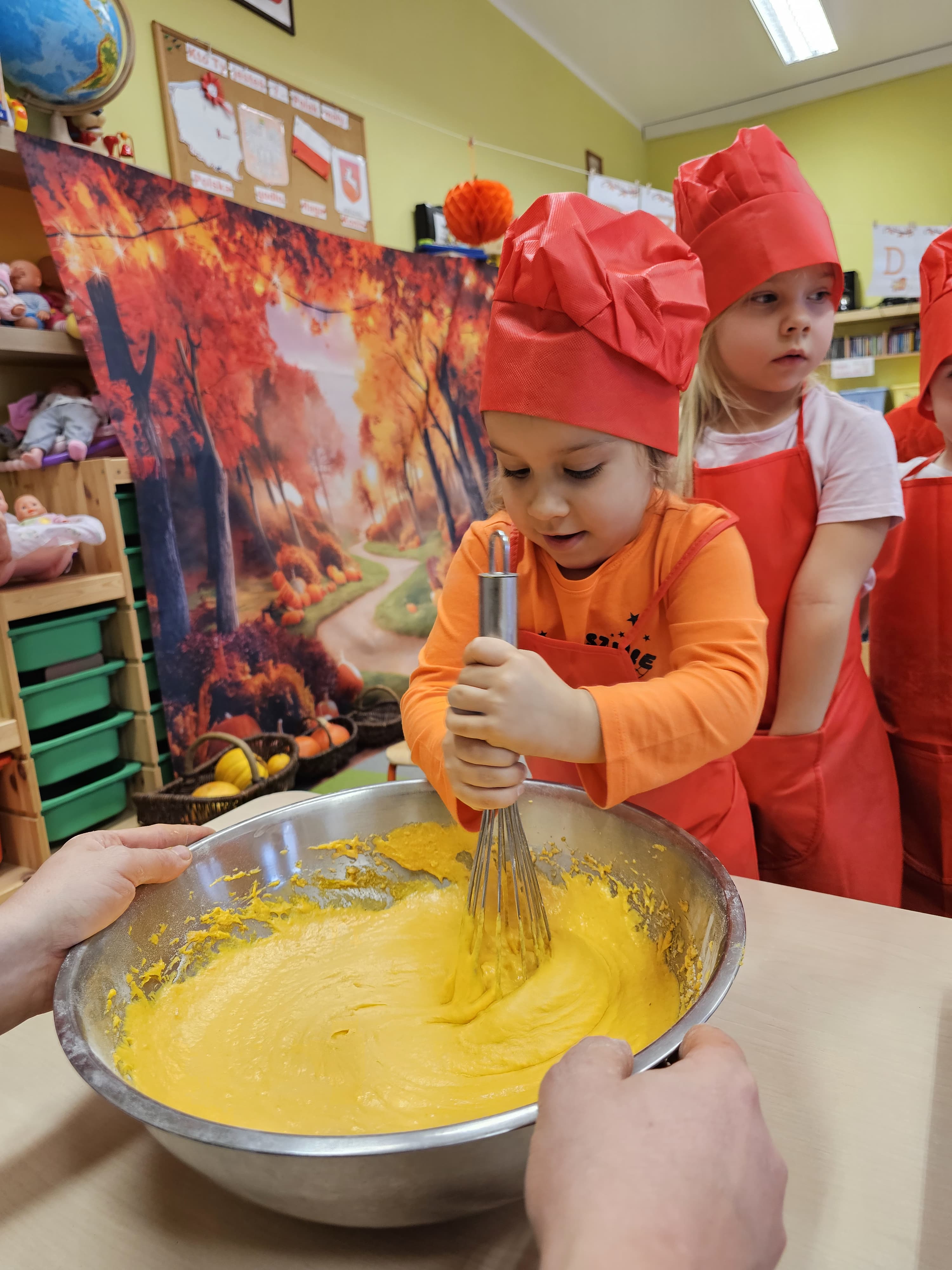 W grupie średniaków odbył się wyjątkowy „Dzień Dyni”. Sala tego dnia wypełniła się pomarańczowymi barwami, dyniowymi dekoracjami i radosnym śmiechem naszych małych przedszkolaków. Podczas zajęć dzieci miały okazję poznać różne odmiany dyni, obejrzeć ją z bliska, dotknąć, powąchać i zajrzeć do jej wnętrza. Wspólnie zastanawiały się, do czego można wykorzystać to niezwykłe warzywo i dlaczego warto je jeść. Gościem specjalnym  był kucharz przedszkolny P. Przemek, który opowiedział dzieciom o wartościach odżywczych dyni – o tym, że zawiera dużo witamin, wspiera odporność i jest bardzo zdrowa. Dzieci z dużym zainteresowaniem słuchały i aktywnie uczestniczyły w rozmowie. Następnie przedszkolaki wzięły udział w warsztatach kulinarnych, podczas których wspólnie z kucharzem  przygotowały muffinki dyniowe. Każde dziecko mogło dodać składniki, wymieszać ciasto i nałożyć je do foremek. W całym przedszkolu unosił się zapach jesiennych wypieków! Oprócz zajęć kulinarnych dzieci uczestniczyły także w różnorodnych działaniach tematycznych – brały udział w konkursach, pracach plastycznych oraz wspólnym śpiewaniu jesiennych piosenek. W trosce o zdrowie, bardzo cenne o tej porze roku, nie zabrakło również jesienno - dyniowej ścieżki ruchowej oraz gimnastyki z dynią. Na zakończenie dnia odbyła się degustacja muffinek, które wszystkim bardzo smakowały. Każdy mały kucharz otrzymał pamiątkową dynię, a w sali długo jeszcze unosił się zapach jesieni i radości ze wspólnego świętowania Dnia Dyni. To było naprawdę udane, kreatywne,pełne kolorów i smaków Święto Dyni !
