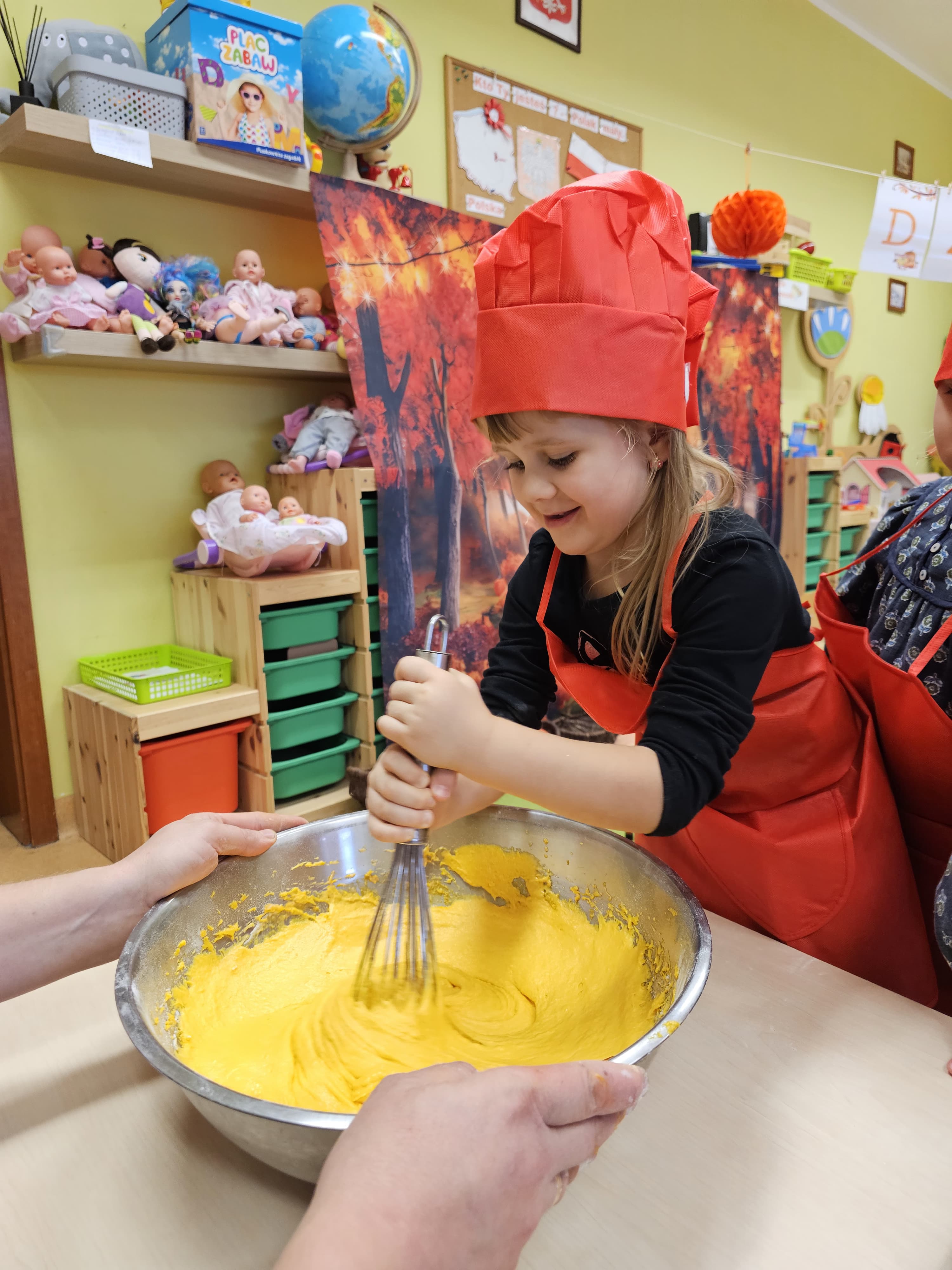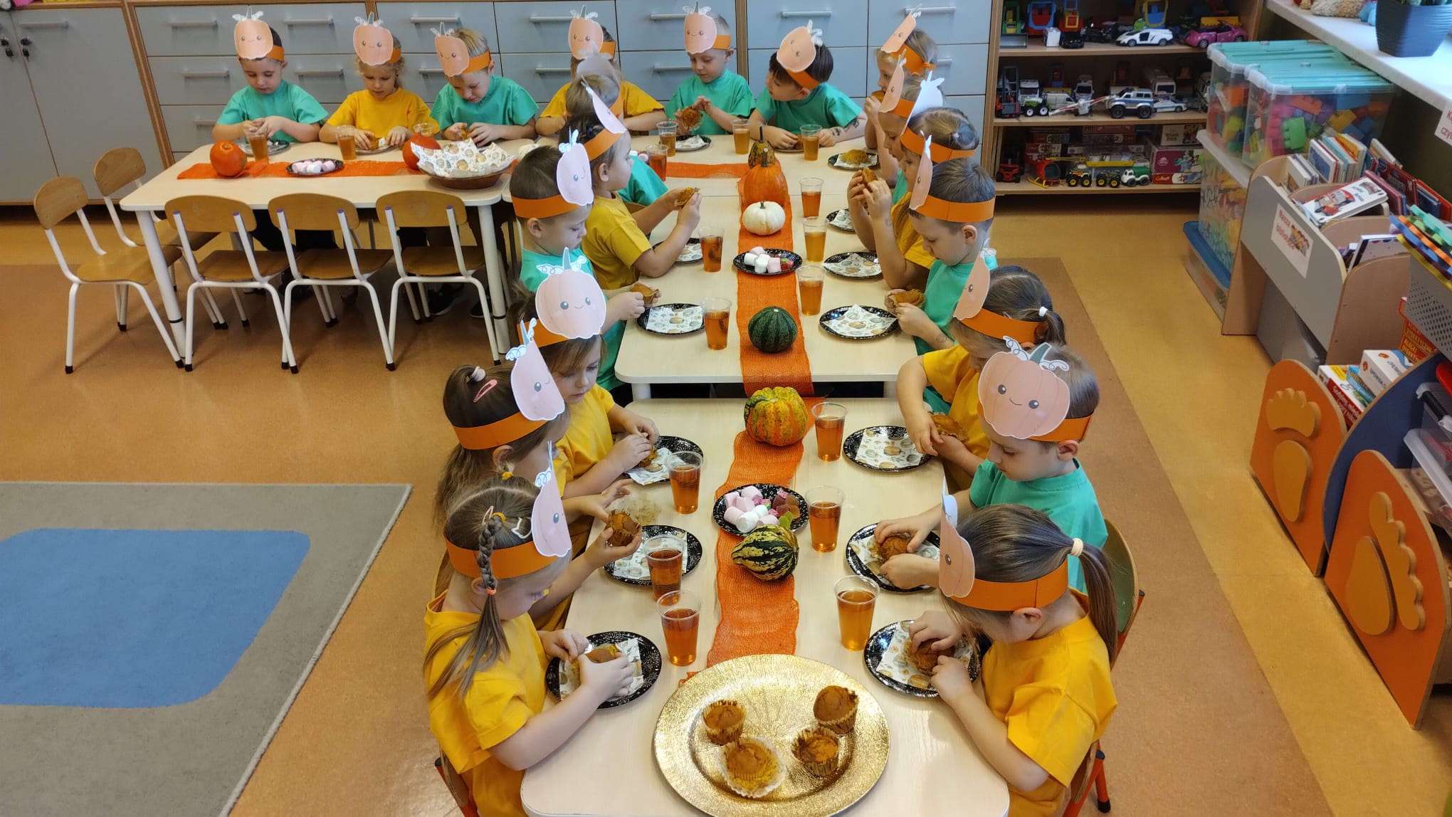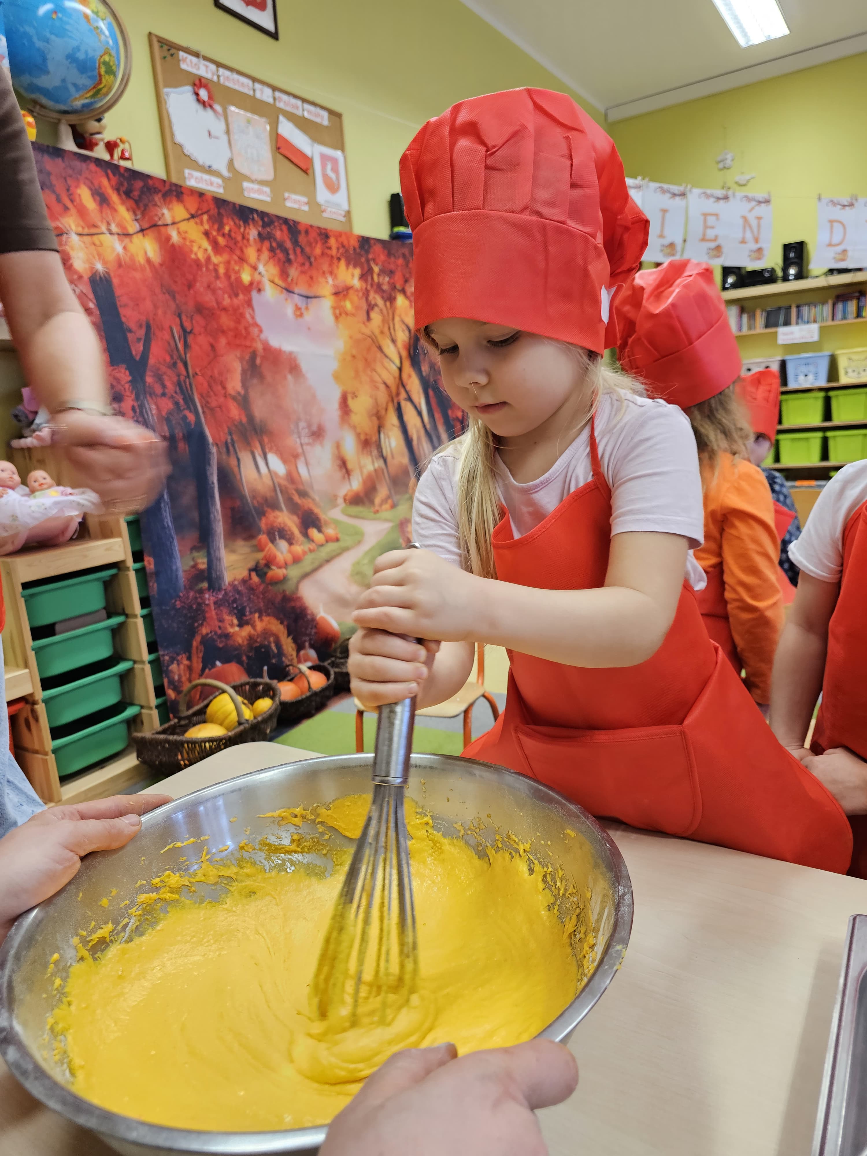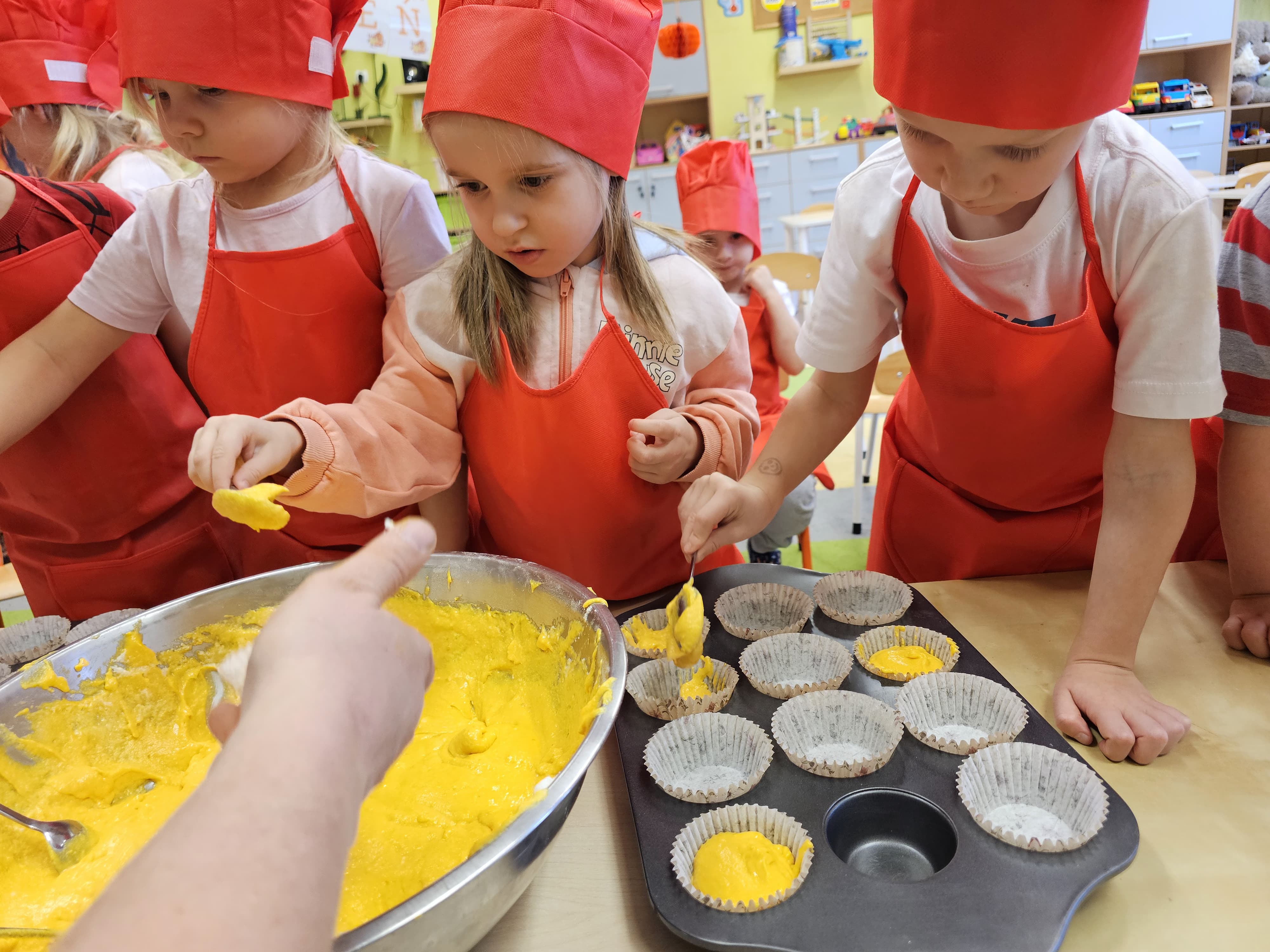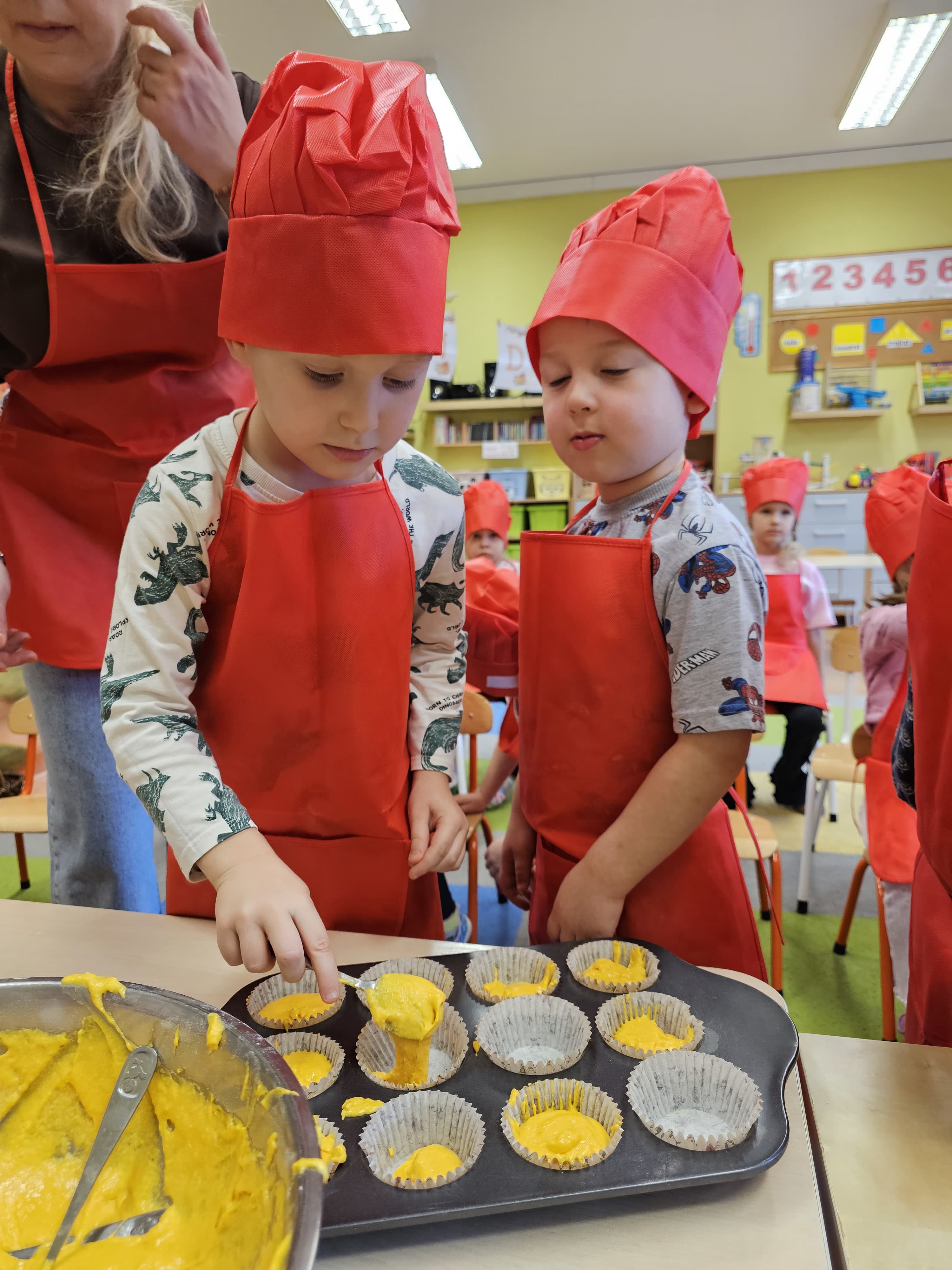 W grupie średniaków odbył się wyjątkowy „Dzień Dyni”. Sala tego dnia wypełniła się pomarańczowymi barwami, dyniowymi dekoracjami i radosnym śmiechem naszych małych przedszkolaków. Podczas zajęć dzieci miały okazję poznać różne odmiany dyni, obejrzeć ją z bliska, dotknąć, powąchać i zajrzeć do jej wnętrza. Wspólnie zastanawiały się, do czego można wykorzystać to niezwykłe warzywo i dlaczego warto je jeść. Gościem specjalnym  był kucharz przedszkolny P. Przemek, który opowiedział dzieciom o wartościach odżywczych dyni – o tym, że zawiera dużo witamin, wspiera odporność i jest bardzo zdrowa. Dzieci z dużym zainteresowaniem słuchały i aktywnie uczestniczyły w rozmowie. Następnie przedszkolaki wzięły udział w warsztatach kulinarnych, podczas których wspólnie z kucharzem  przygotowały muffinki dyniowe. Każde dziecko mogło dodać składniki, wymieszać ciasto i nałożyć je do foremek. W całym przedszkolu unosił się zapach jesiennych wypieków! Oprócz zajęć kulinarnych dzieci uczestniczyły także w różnorodnych działaniach tematycznych – brały udział w konkursach, pracach plastycznych oraz wspólnym śpiewaniu jesiennych piosenek. W trosce o zdrowie, bardzo cenne o tej porze roku, nie zabrakło również jesienno - dyniowej ścieżki ruchowej oraz gimnastyki z dynią. Na zakończenie dnia odbyła się degustacja muffinek, które wszystkim bardzo smakowały. Każdy mały kucharz otrzymał pamiątkową dynię, a w sali długo jeszcze unosił się zapach jesieni i radości ze wspólnego świętowania Dnia Dyni. To było naprawdę udane, kreatywne,pełne kolorów i smaków Święto Dyni !