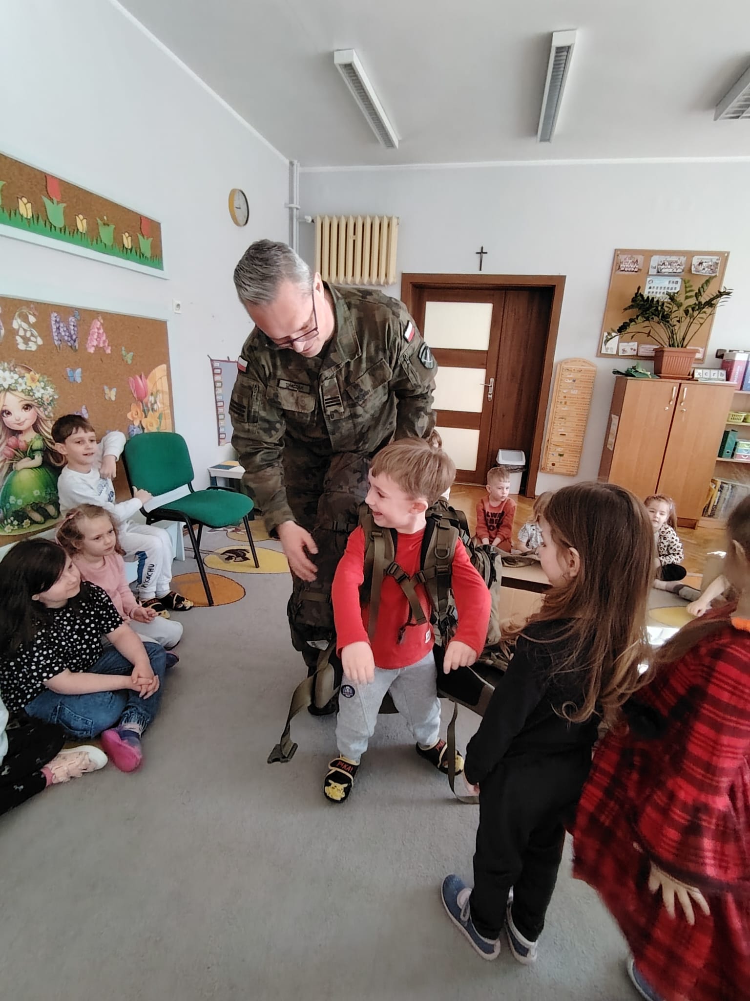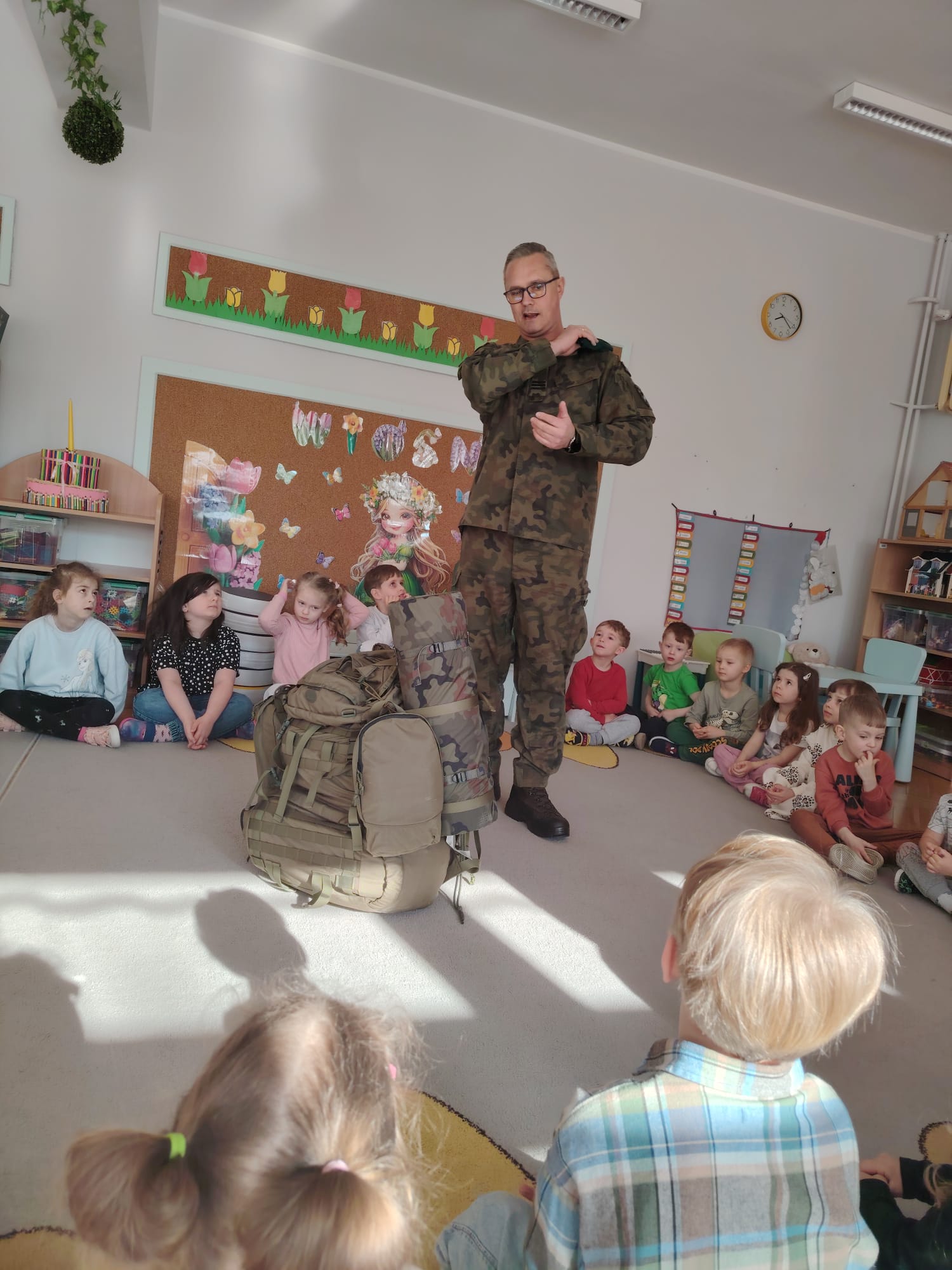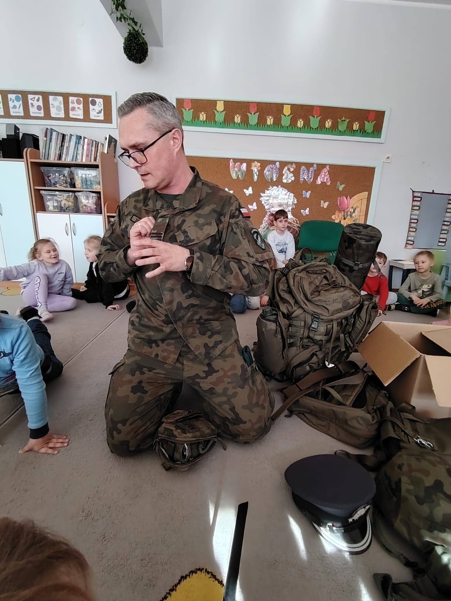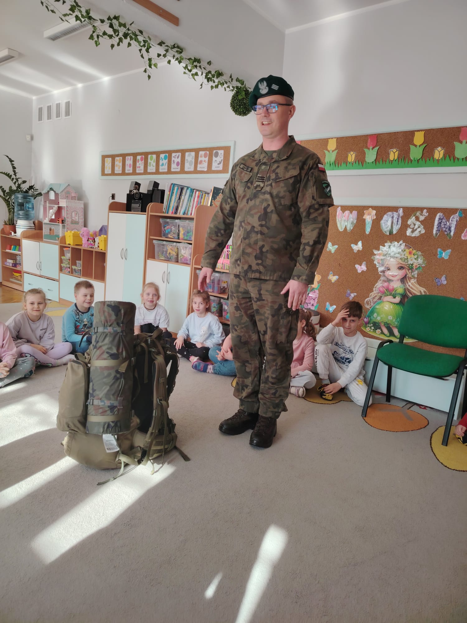 Podczas zajęć z preorientacji zawodowej dzieci poznały zawód żołnierza dzięki spotkaniu z tatą Adasia i Jasia, który jest zawodowym żołnierzem. Gość opowiedział o swojej pracy, obowiązkach oraz o tym, jak żołnierze dbają o bezpieczeństwo kraju i pomagają ludziom w różnych sytuacjach. Zaprezentowane szczegółowo elementy stroju żołnierskiego zbudziły z dzieciach ogromny entuzjazm i za zgodą gościa szybko przystąpiły do próbnych przymiarek. Niejeden przedszkolak stwierdził, że od dziś jego powołaniem jest służba ojczyźnie. Dzisiejszego dnia dowiedzieliśmy się, co jest fundamentem w pracy żołnierza, a są nimi: odwaga, sprawność fizyczna, dyscyplina oraz współpraca z innymi. Podczas spotkania dzieci miały możliwość zadawania pytań i rozmowy z gościem, dzięki czemu rozwijały swoją ciekawość poznawczą oraz poszerzyły wiedzę na temat świata zawodów. Zajęcia pomogły także kształtować u dzieci szacunek do osób wykonujących odpowiedzialne zawody oraz budować poczucie bezpieczeństwa i postawę patriotyczną. Tacie Adasia i Jasia serdecznie dziękujemy za owocne spotkanie, życząc samych sukcesów zawodowych.
