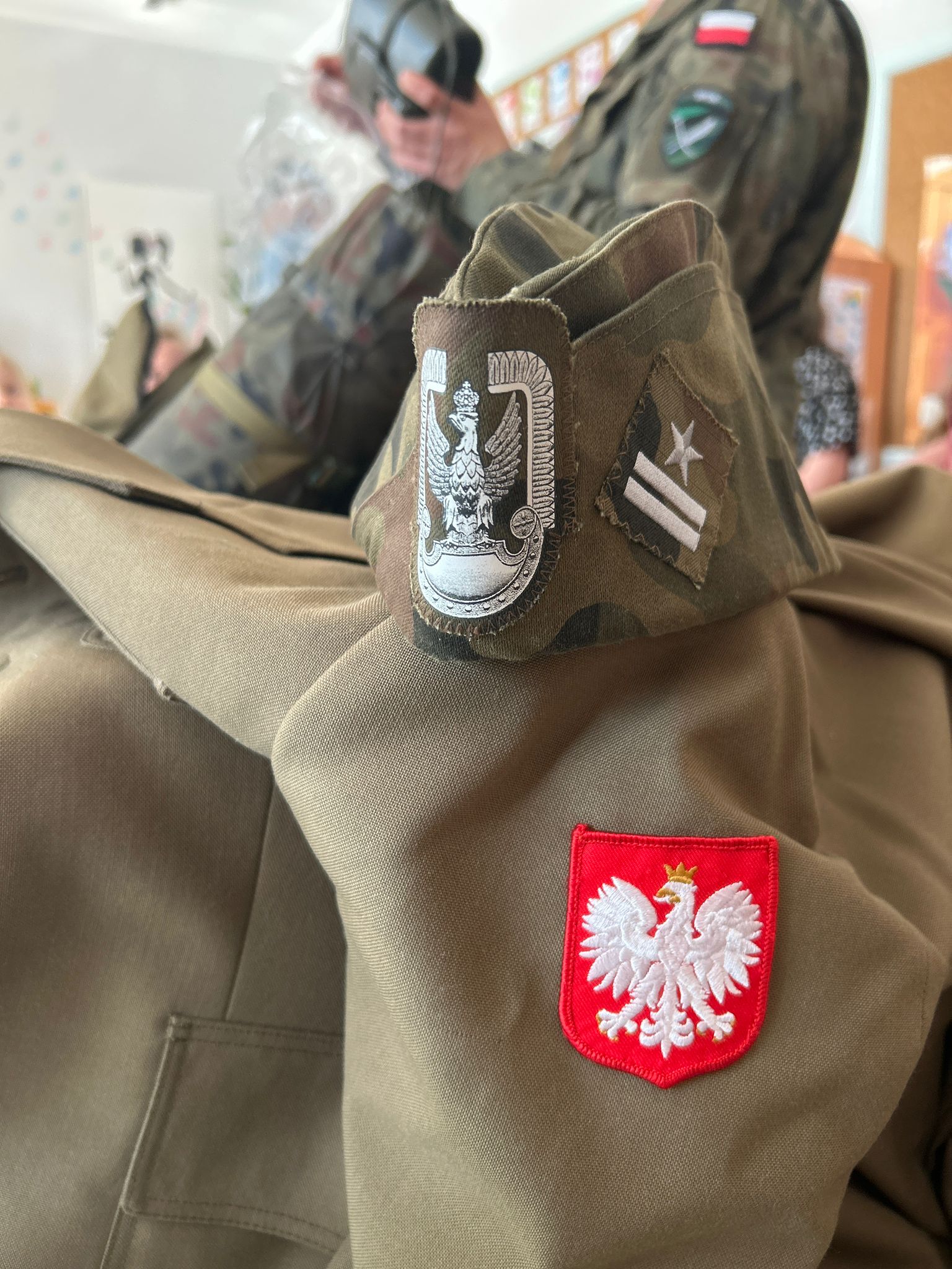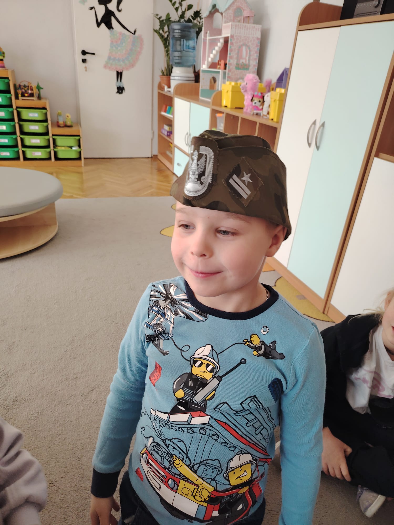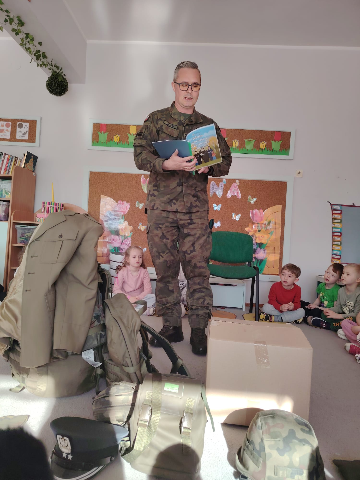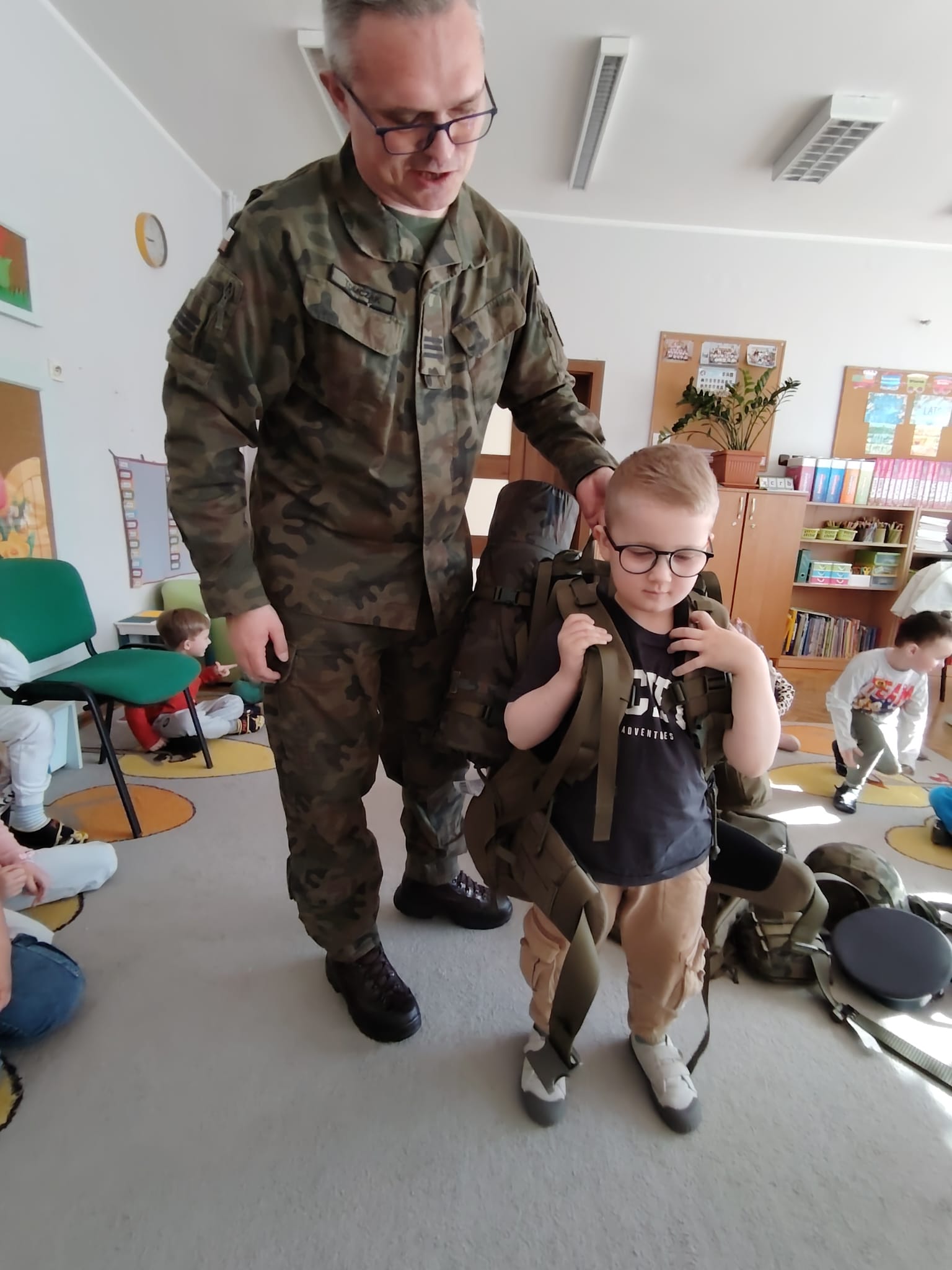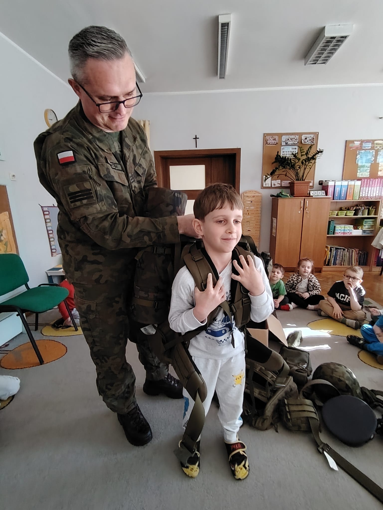 Podczas zajęć z preorientacji zawodowej dzieci poznały zawód żołnierza dzięki spotkaniu z tatą Adasia i Jasia, który jest zawodowym żołnierzem. Gość opowiedział o swojej pracy, obowiązkach oraz o tym, jak żołnierze dbają o bezpieczeństwo kraju i pomagają ludziom w różnych sytuacjach. Zaprezentowane szczegółowo elementy stroju żołnierskiego zbudziły z dzieciach ogromny entuzjazm i za zgodą gościa szybko przystąpiły do próbnych przymiarek. Niejeden przedszkolak stwierdził, że od dziś jego powołaniem jest służba ojczyźnie. Dzisiejszego dnia dowiedzieliśmy się, co jest fundamentem w pracy żołnierza, a są nimi: odwaga, sprawność fizyczna, dyscyplina oraz współpraca z innymi. Podczas spotkania dzieci miały możliwość zadawania pytań i rozmowy z gościem, dzięki czemu rozwijały swoją ciekawość poznawczą oraz poszerzyły wiedzę na temat świata zawodów. Zajęcia pomogły także kształtować u dzieci szacunek do osób wykonujących odpowiedzialne zawody oraz budować poczucie bezpieczeństwa i postawę patriotyczną. Tacie Adasia i Jasia serdecznie dziękujemy za owocne spotkanie, życząc samych sukcesów zawodowych.