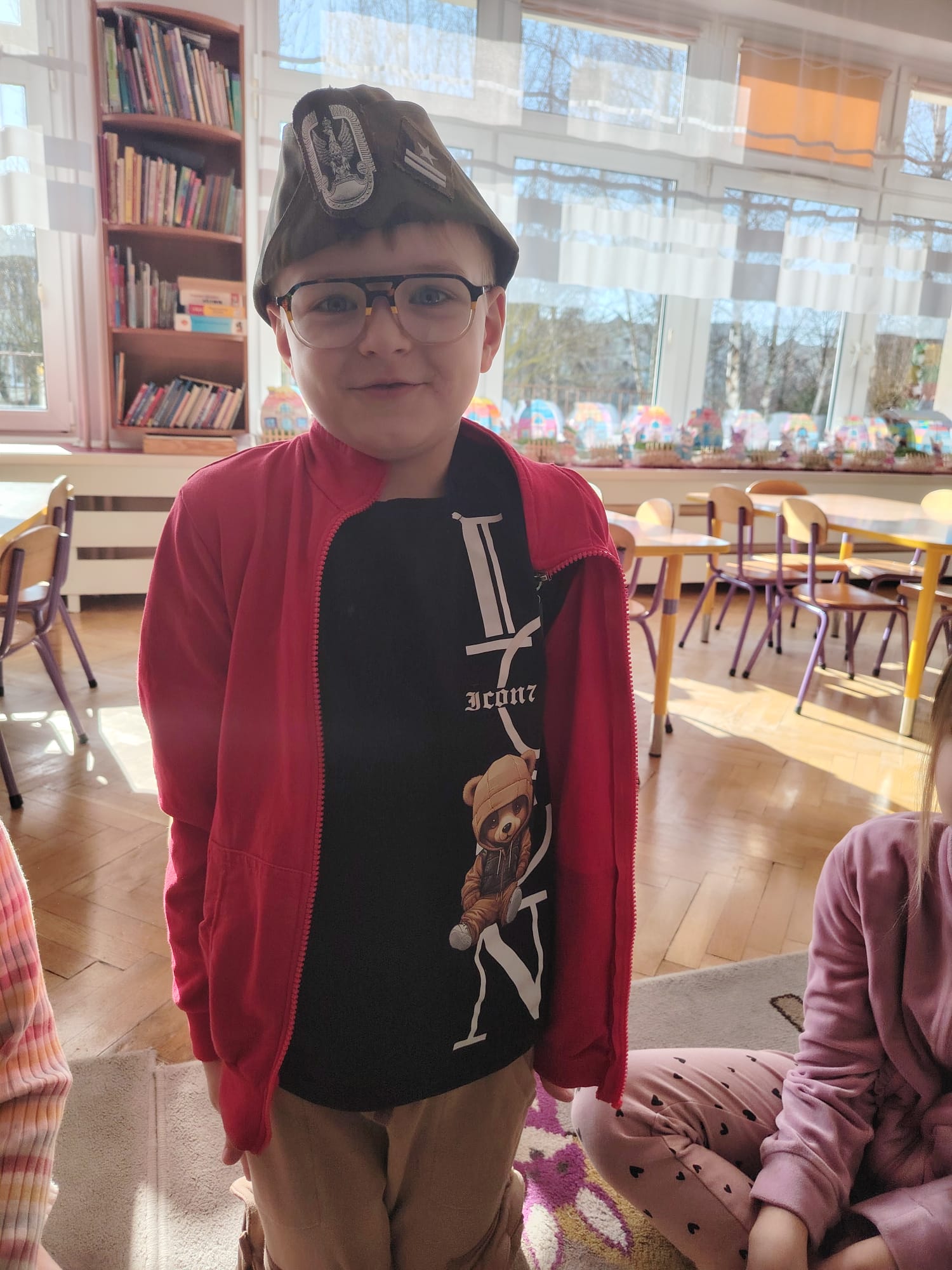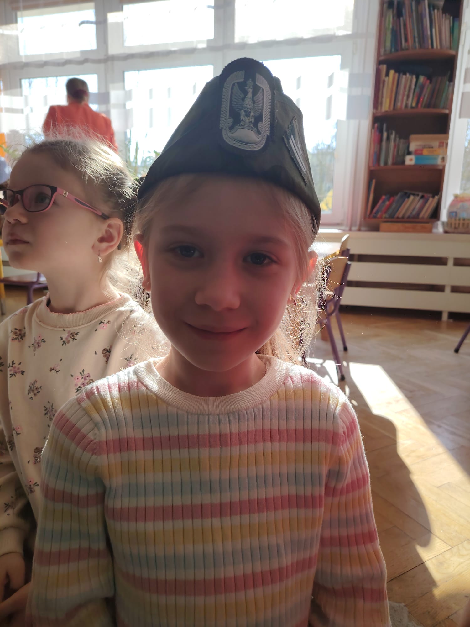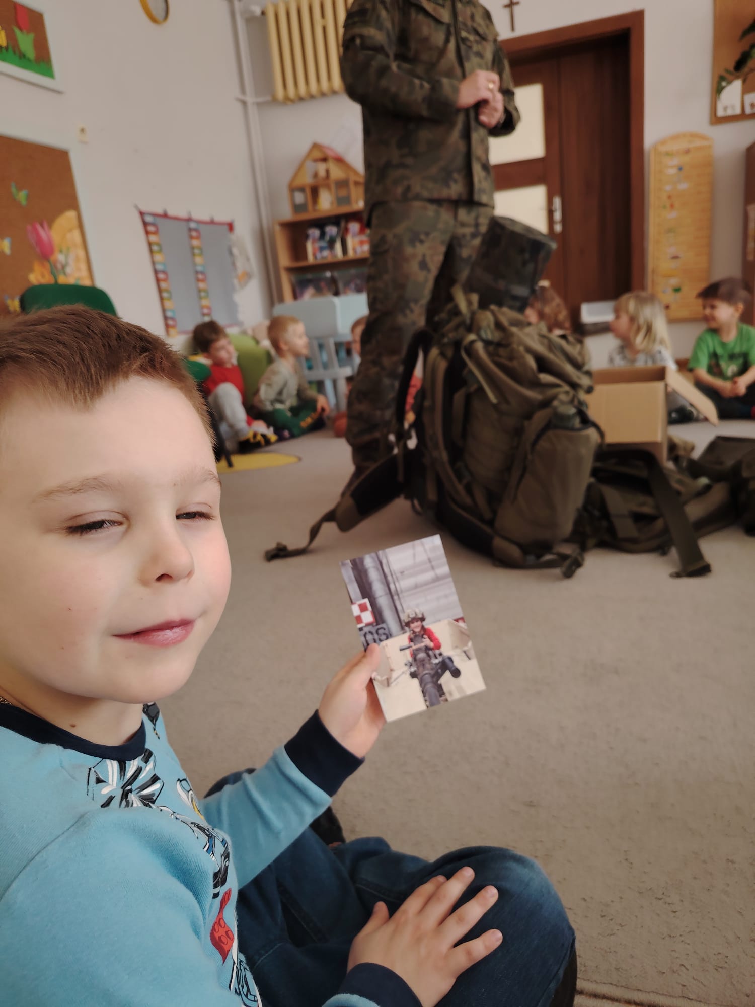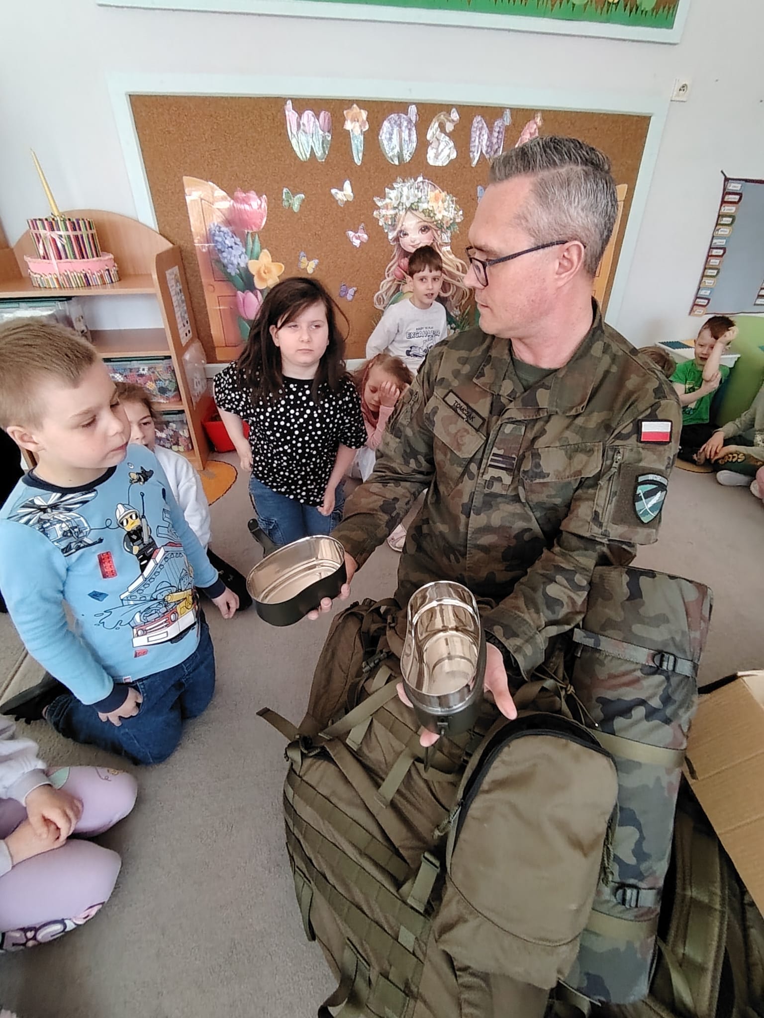 Podczas zajęć z preorientacji zawodowej dzieci poznały zawód żołnierza dzięki spotkaniu z tatą Adasia i Jasia, który jest zawodowym żołnierzem. Gość opowiedział o swojej pracy, obowiązkach oraz o tym, jak żołnierze dbają o bezpieczeństwo kraju i pomagają ludziom w różnych sytuacjach. Zaprezentowane szczegółowo elementy stroju żołnierskiego zbudziły z dzieciach ogromny entuzjazm i za zgodą gościa szybko przystąpiły do próbnych przymiarek. Niejeden przedszkolak stwierdził, że od dziś jego powołaniem jest służba ojczyźnie. Dzisiejszego dnia dowiedzieliśmy się, co jest fundamentem w pracy żołnierza, a są nimi: odwaga, sprawność fizyczna, dyscyplina oraz współpraca z innymi. Podczas spotkania dzieci miały możliwość zadawania pytań i rozmowy z gościem, dzięki czemu rozwijały swoją ciekawość poznawczą oraz poszerzyły wiedzę na temat świata zawodów. Zajęcia pomogły także kształtować u dzieci szacunek do osób wykonujących odpowiedzialne zawody oraz budować poczucie bezpieczeństwa i postawę patriotyczną. Tacie Adasia i Jasia serdecznie dziękujemy za owocne spotkanie, życząc samych sukcesów zawodowych.