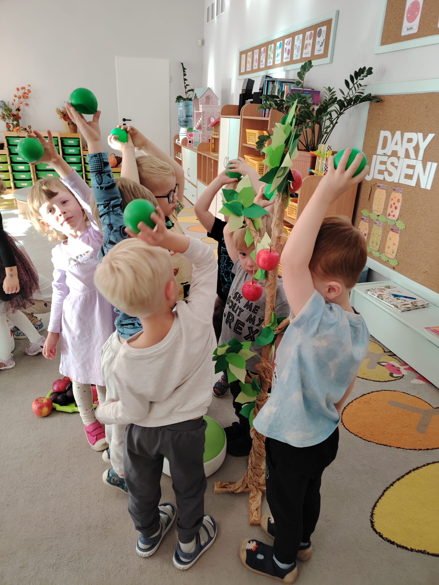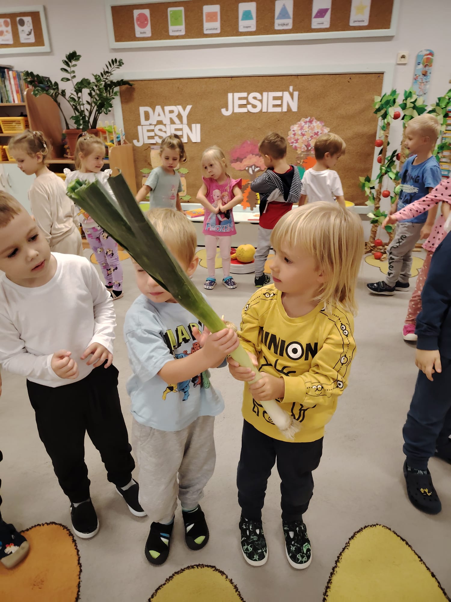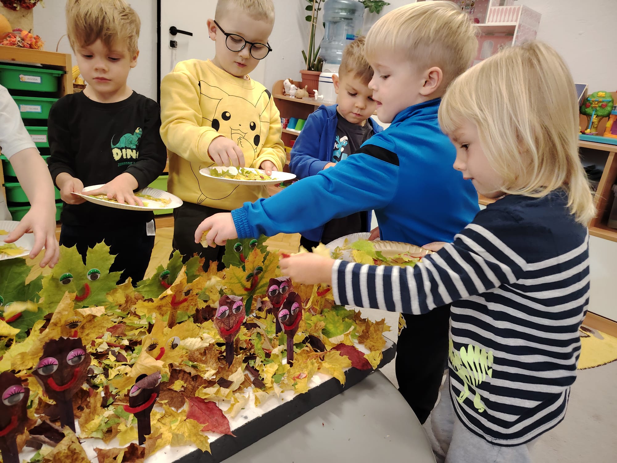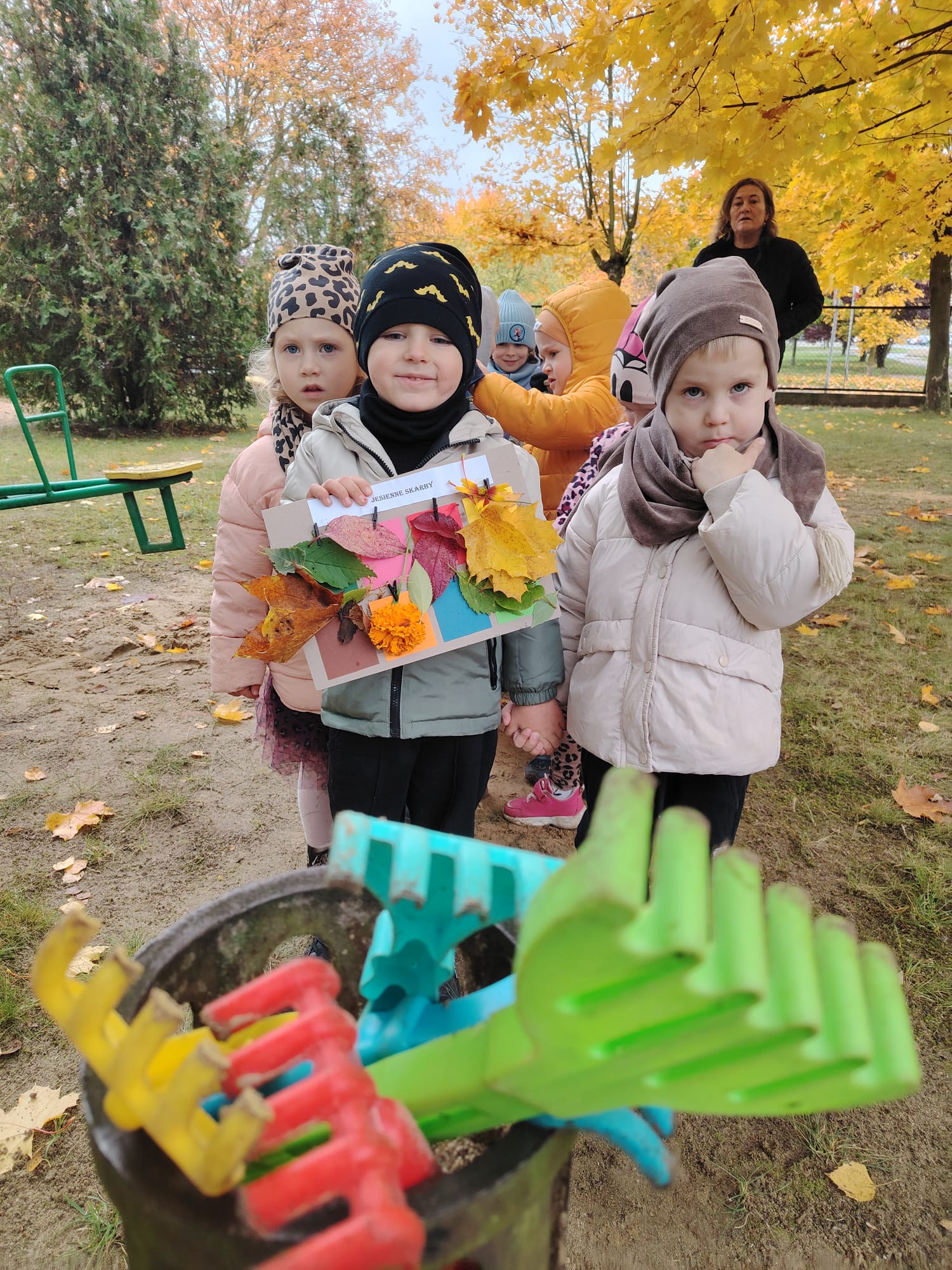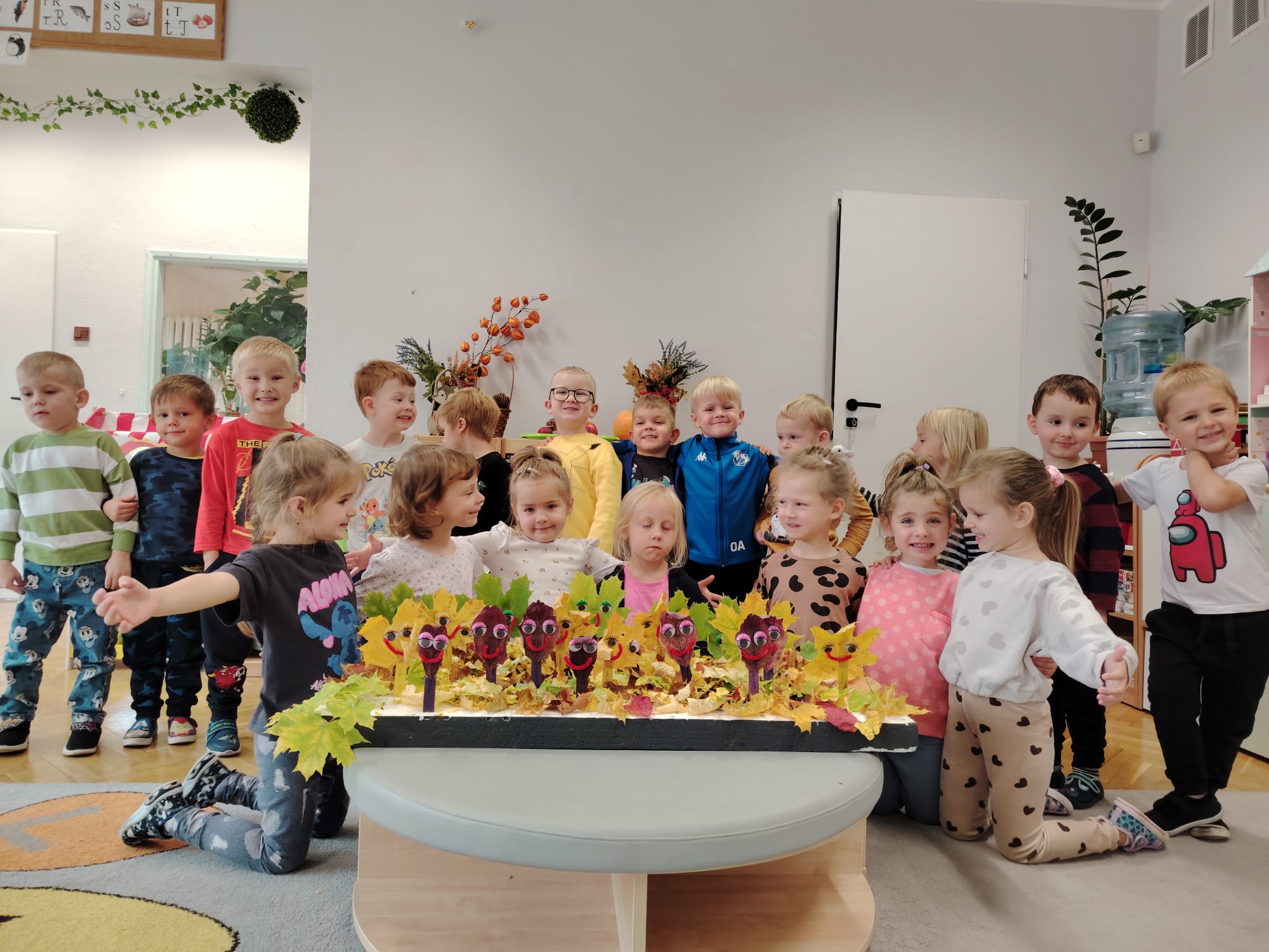 Jesień jest często niedocenianą porą roku, uważa się ją za ponurą i kapryśną... Jednak jest to pora przez nas uwielbiana! Dlaczego? Gdyż niesie ze sobą piękne dary, które służą nam do nauki przez doskonałą zabawę każdego dnia. Wystarczy wyjść na spacer, rozejrzeć się, przykucnąć w trawie, pod drzewami w parku... Znajdujemy wtedy żołędzie, kasztany, szyszki, kolorowe liście, jarzębinę... Czas niepogody to również świetna okazja do przeprowadzania wielozmysłowych zabaw. Grupa II przez ostatnie trzy tygodnie realizowała jesienny projekt edukacyjny, którego głównym celem było kształtowanie postaw poznawczych i proekologicznych poprzez wielozmysłowe doświadczanie otaczającej przyrody. W trakcie działań projektowych dzieci: podczas zabaw sensorycznych nazywały, rozróżniały i klasyfikowały naturalne produkty, rozwijały umiejętność planowania budując przestrzenny ogród z klocków, ćwiczyły analizę i syntezę wzrokową oraz logiczne myślenie, dopasowując warzywa do ich nazw i kształtów, uczestniczyły w zabawach ruchowych z elementami metody aktywnego słuchania w grze „Dopasuj owoc do drzewa”. Podczas jesiennego spaceru edukacyjnego przedszkolaki realizowały zadania z listy obserwacyjnej, rozwijając spostrzegawczość i świadomość zmian zachodzących w przyrodzie. W ramach podsumowania powstała galeria prac dzieci- „Kolorowa jesień oczami dziecka” stworzona z postaci z liści na patykach. Dzięki różnorodnym formom aktywności nasze przedszkolaki miały okazję uczyć się przez działanie, odkrywanie i współdziałanie w grupie. Był to naprawdę radosny i edukacyjnie drogocenny czas. Zapraszamy do galerii.