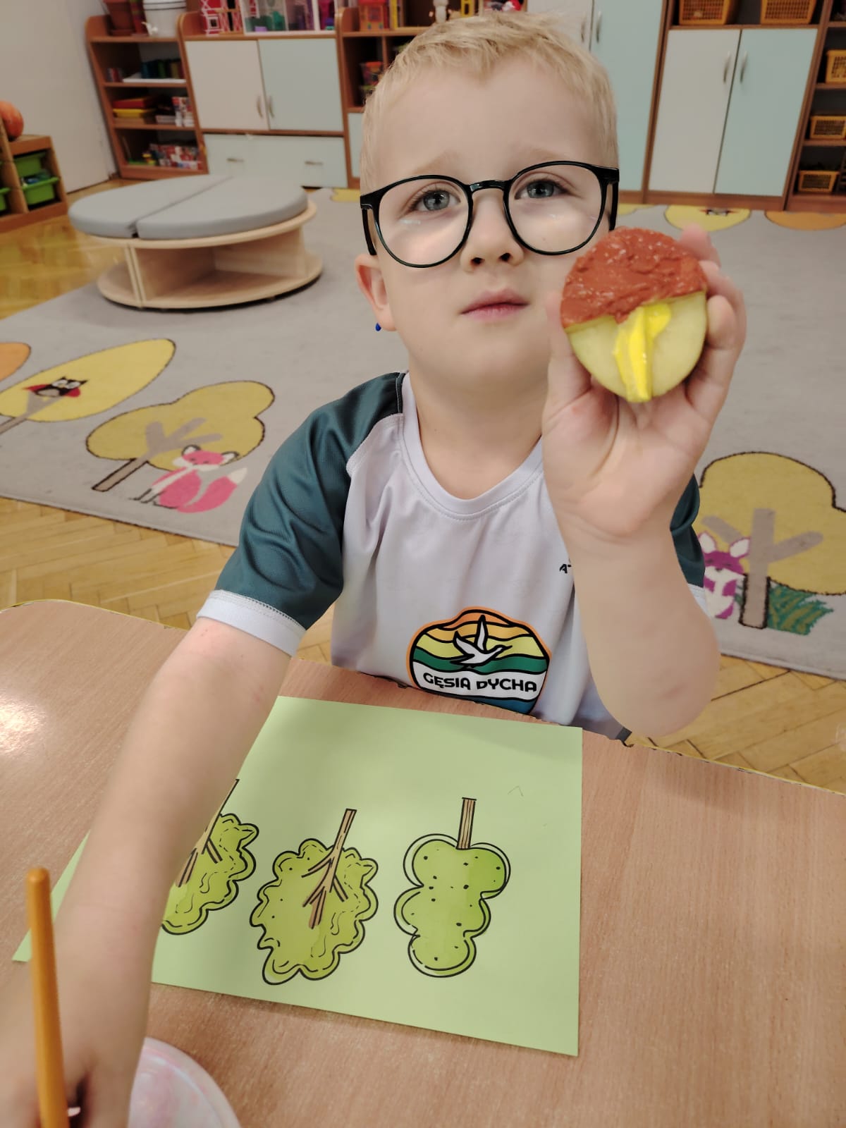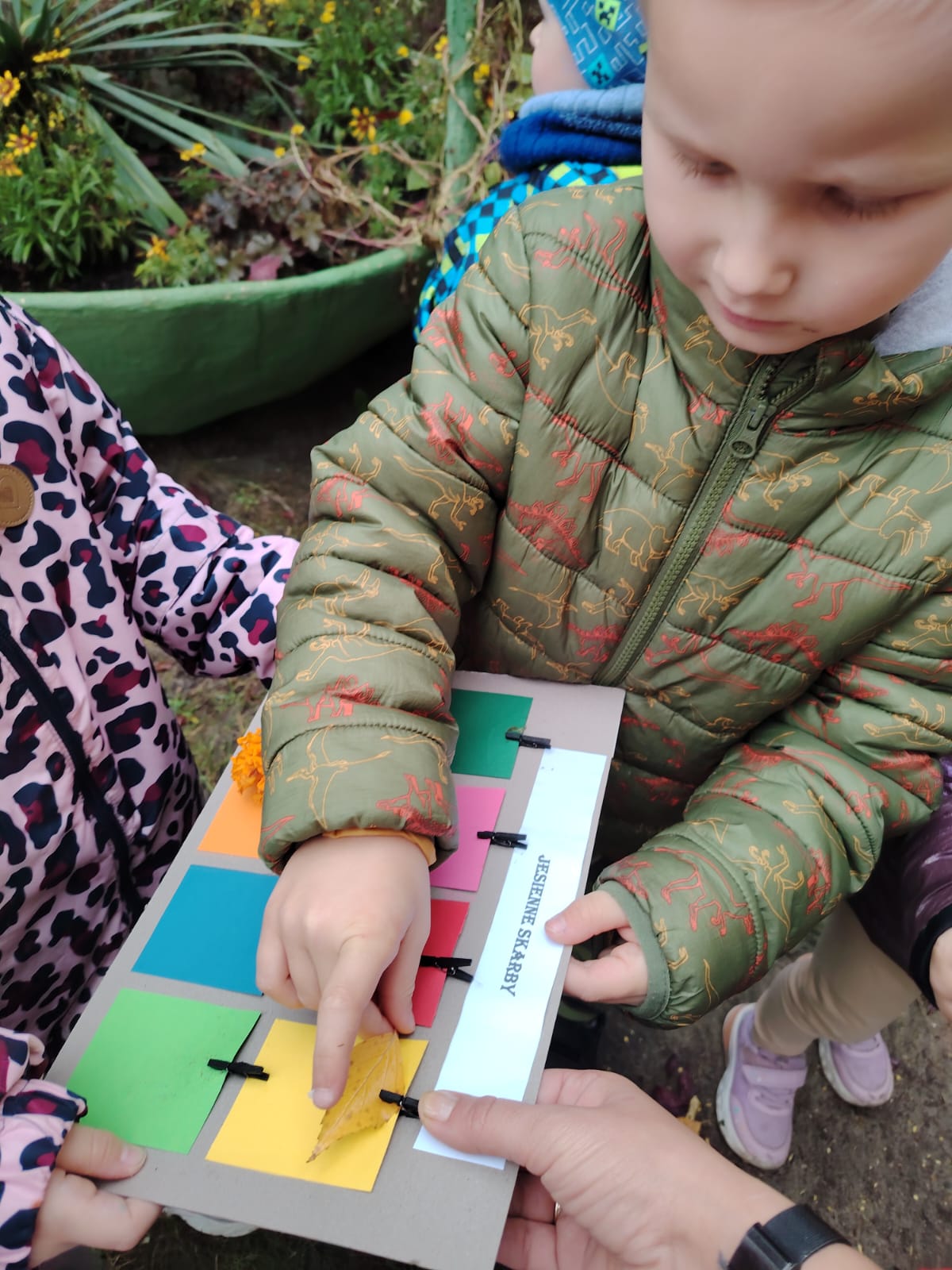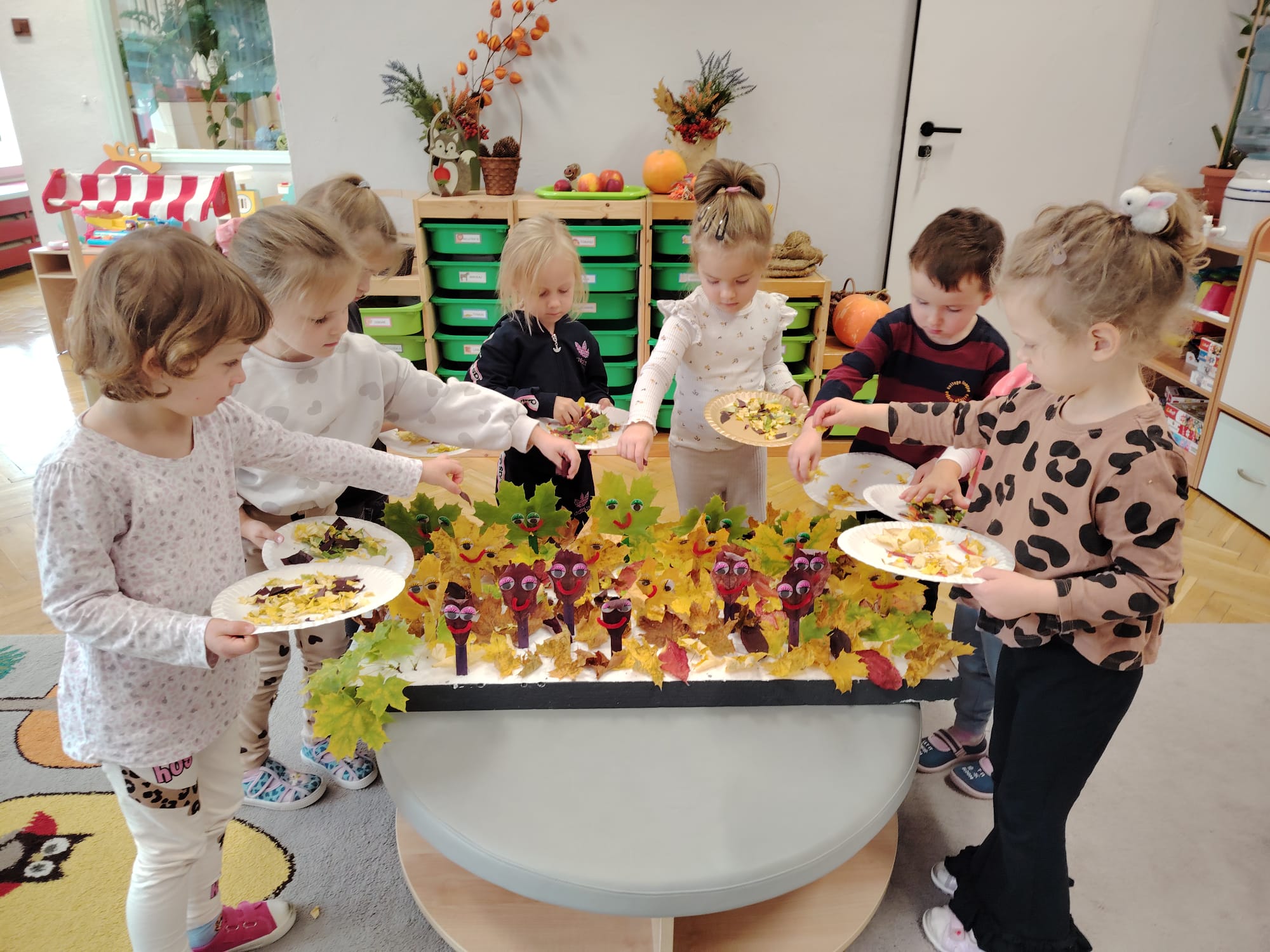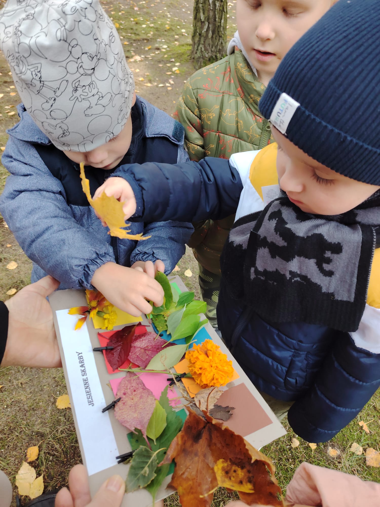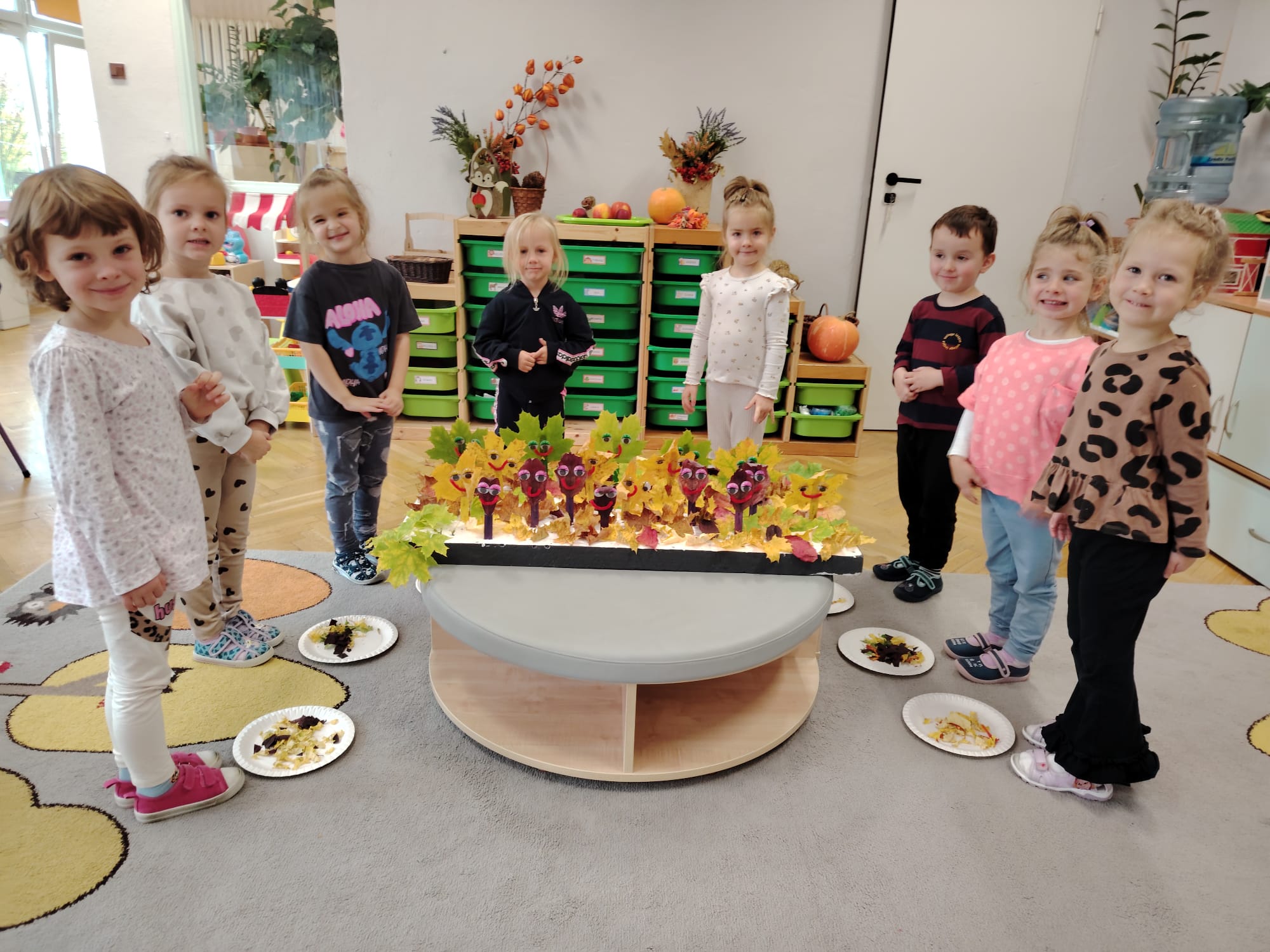 Jesień jest często niedocenianą porą roku, uważa się ją za ponurą i kapryśną... Jednak jest to pora przez nas uwielbiana! Dlaczego? Gdyż niesie ze sobą piękne dary, które służą nam do nauki przez doskonałą zabawę każdego dnia. Wystarczy wyjść na spacer, rozejrzeć się, przykucnąć w trawie, pod drzewami w parku... Znajdujemy wtedy żołędzie, kasztany, szyszki, kolorowe liście, jarzębinę... Czas niepogody to również świetna okazja do przeprowadzania wielozmysłowych zabaw. Grupa II przez ostatnie trzy tygodnie realizowała jesienny projekt edukacyjny, którego głównym celem było kształtowanie postaw poznawczych i proekologicznych poprzez wielozmysłowe doświadczanie otaczającej przyrody. W trakcie działań projektowych dzieci: podczas zabaw sensorycznych nazywały, rozróżniały i klasyfikowały naturalne produkty, rozwijały umiejętność planowania budując przestrzenny ogród z klocków, ćwiczyły analizę i syntezę wzrokową oraz logiczne myślenie, dopasowując warzywa do ich nazw i kształtów, uczestniczyły w zabawach ruchowych z elementami metody aktywnego słuchania w grze „Dopasuj owoc do drzewa”. Podczas jesiennego spaceru edukacyjnego przedszkolaki realizowały zadania z listy obserwacyjnej, rozwijając spostrzegawczość i świadomość zmian zachodzących w przyrodzie. W ramach podsumowania powstała galeria prac dzieci- „Kolorowa jesień oczami dziecka” stworzona z postaci z liści na patykach. Dzięki różnorodnym formom aktywności nasze przedszkolaki miały okazję uczyć się przez działanie, odkrywanie i współdziałanie w grupie. Był to naprawdę radosny i edukacyjnie drogocenny czas. Zapraszamy do galerii.