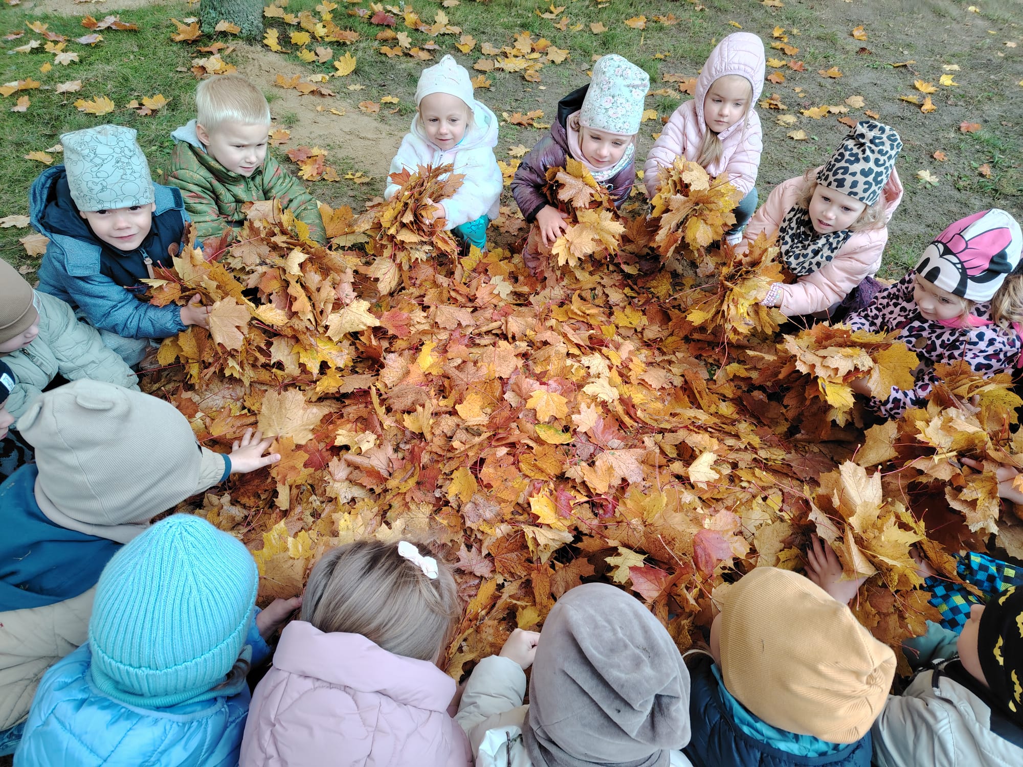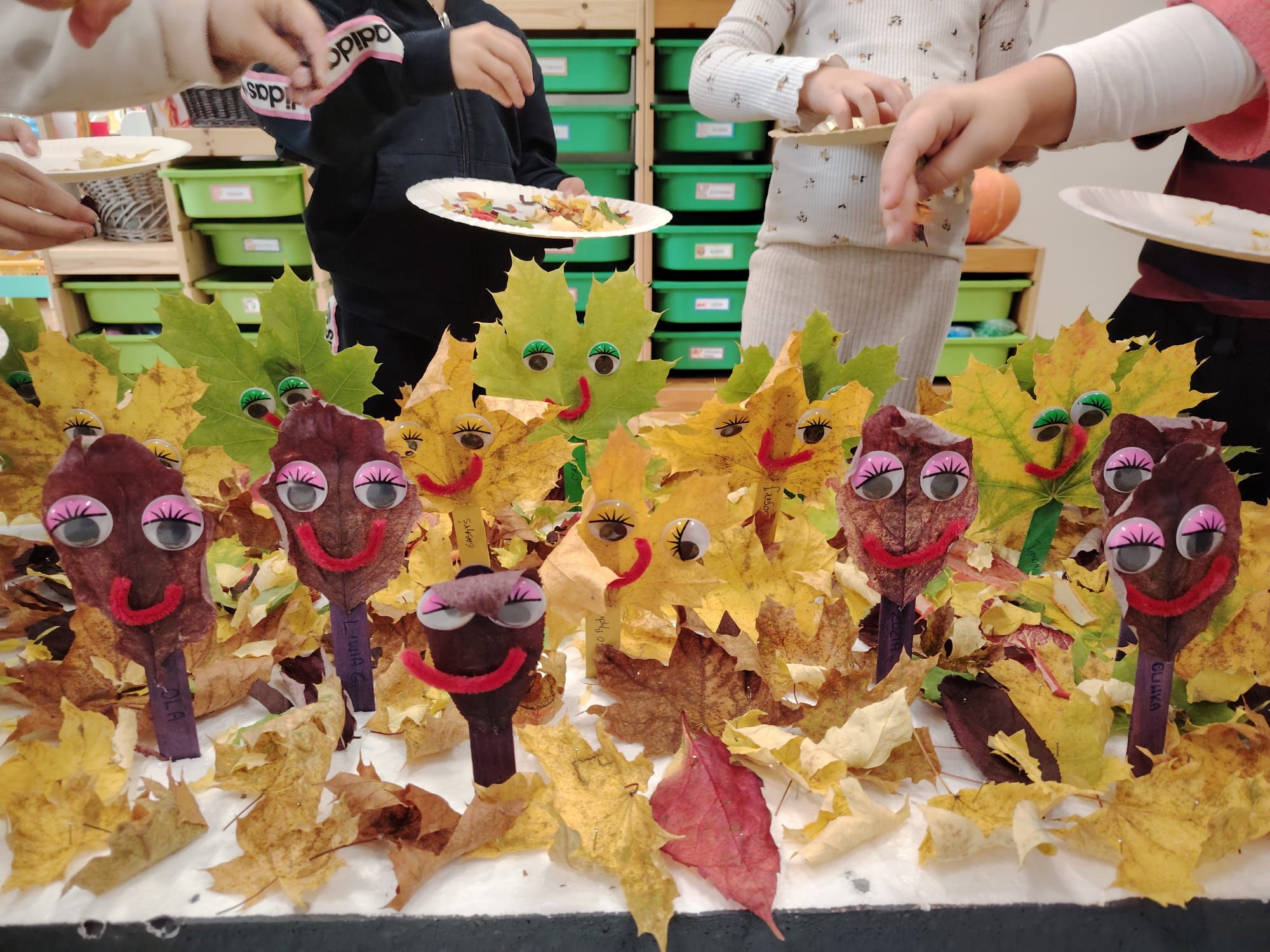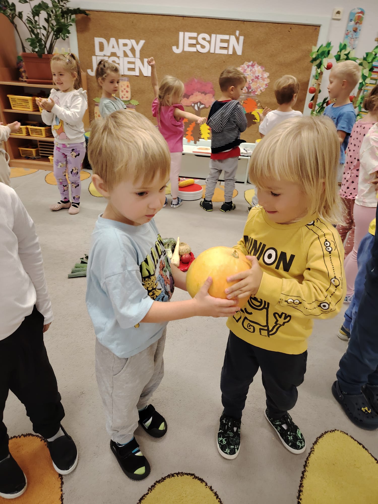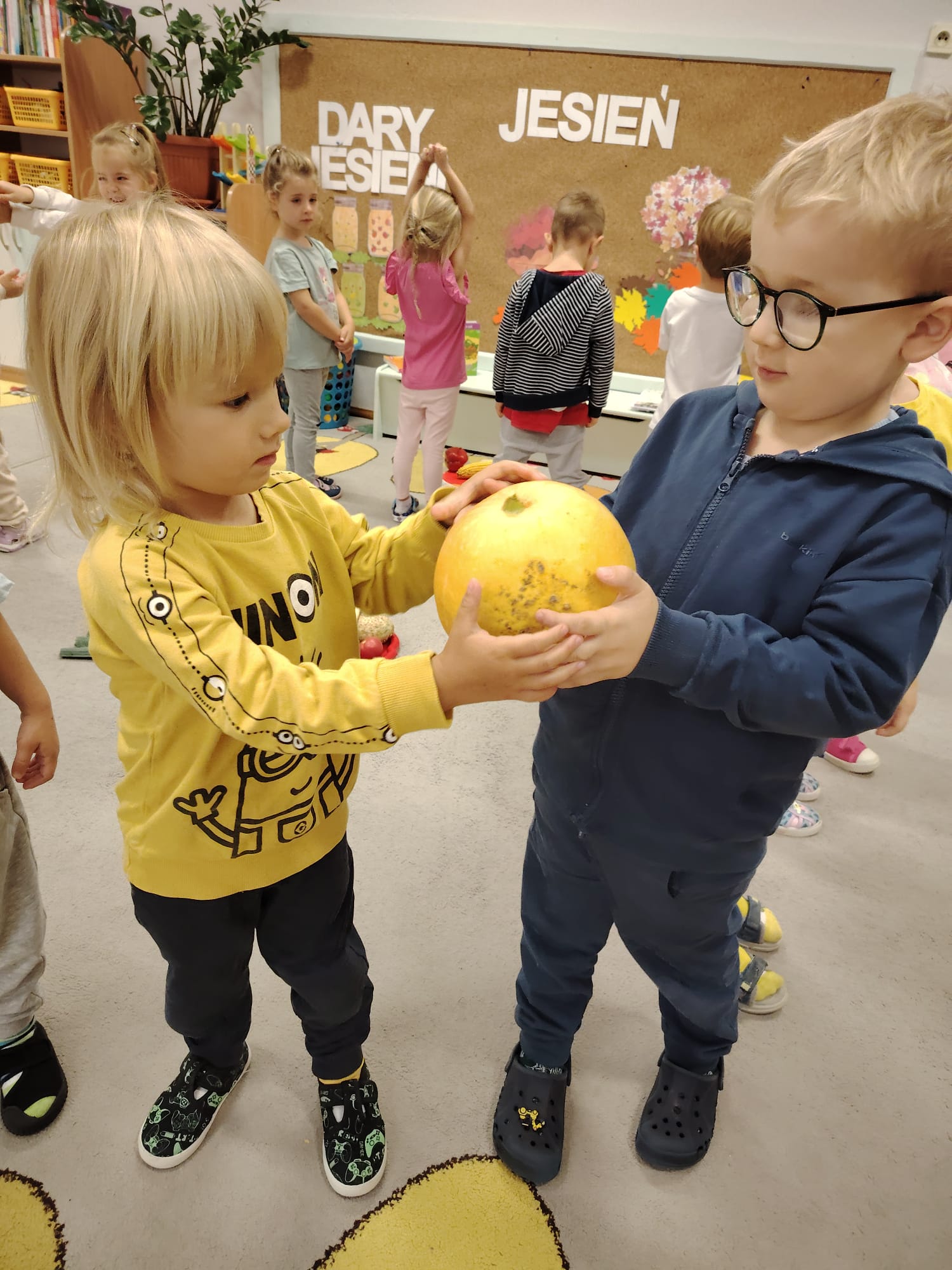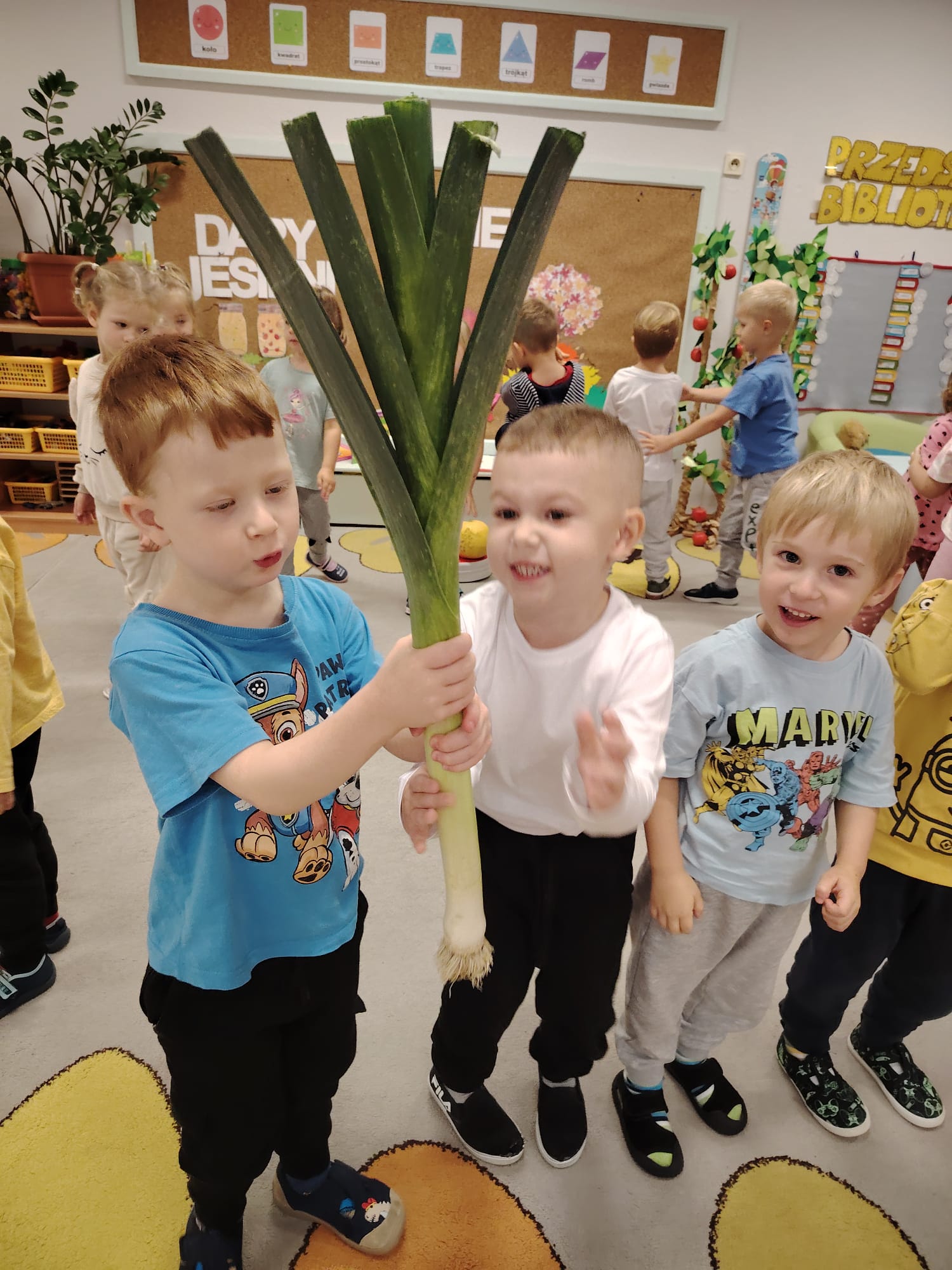 Jesień jest często niedocenianą porą roku, uważa się ją za ponurą i kapryśną... Jednak jest to pora przez nas uwielbiana! Dlaczego? Gdyż niesie ze sobą piękne dary, które służą nam do nauki przez doskonałą zabawę każdego dnia. Wystarczy wyjść na spacer, rozejrzeć się, przykucnąć w trawie, pod drzewami w parku... Znajdujemy wtedy żołędzie, kasztany, szyszki, kolorowe liście, jarzębinę... Czas niepogody to również świetna okazja do przeprowadzania wielozmysłowych zabaw. Grupa II przez ostatnie trzy tygodnie realizowała jesienny projekt edukacyjny, którego głównym celem było kształtowanie postaw poznawczych i proekologicznych poprzez wielozmysłowe doświadczanie otaczającej przyrody. W trakcie działań projektowych dzieci: podczas zabaw sensorycznych nazywały, rozróżniały i klasyfikowały naturalne produkty, rozwijały umiejętność planowania budując przestrzenny ogród z klocków, ćwiczyły analizę i syntezę wzrokową oraz logiczne myślenie, dopasowując warzywa do ich nazw i kształtów, uczestniczyły w zabawach ruchowych z elementami metody aktywnego słuchania w grze „Dopasuj owoc do drzewa”. Podczas jesiennego spaceru edukacyjnego przedszkolaki realizowały zadania z listy obserwacyjnej, rozwijając spostrzegawczość i świadomość zmian zachodzących w przyrodzie. W ramach podsumowania powstała galeria prac dzieci- „Kolorowa jesień oczami dziecka” stworzona z postaci z liści na patykach. Dzięki różnorodnym formom aktywności nasze przedszkolaki miały okazję uczyć się przez działanie, odkrywanie i współdziałanie w grupie. Był to naprawdę radosny i edukacyjnie drogocenny czas. Zapraszamy do galerii.