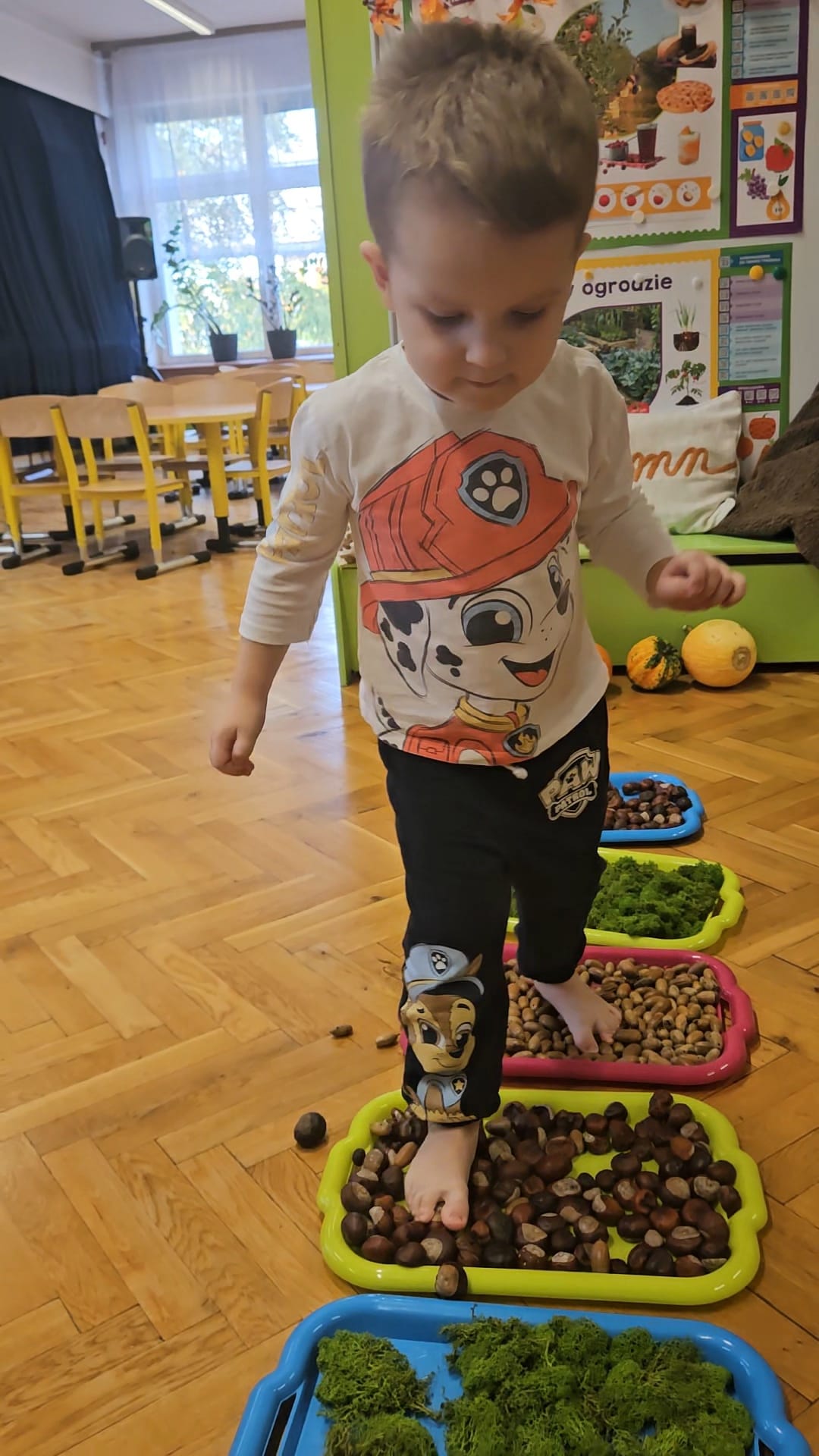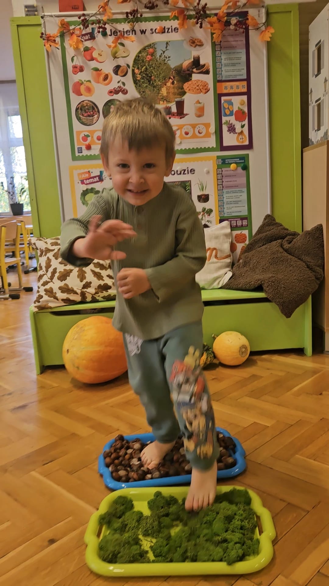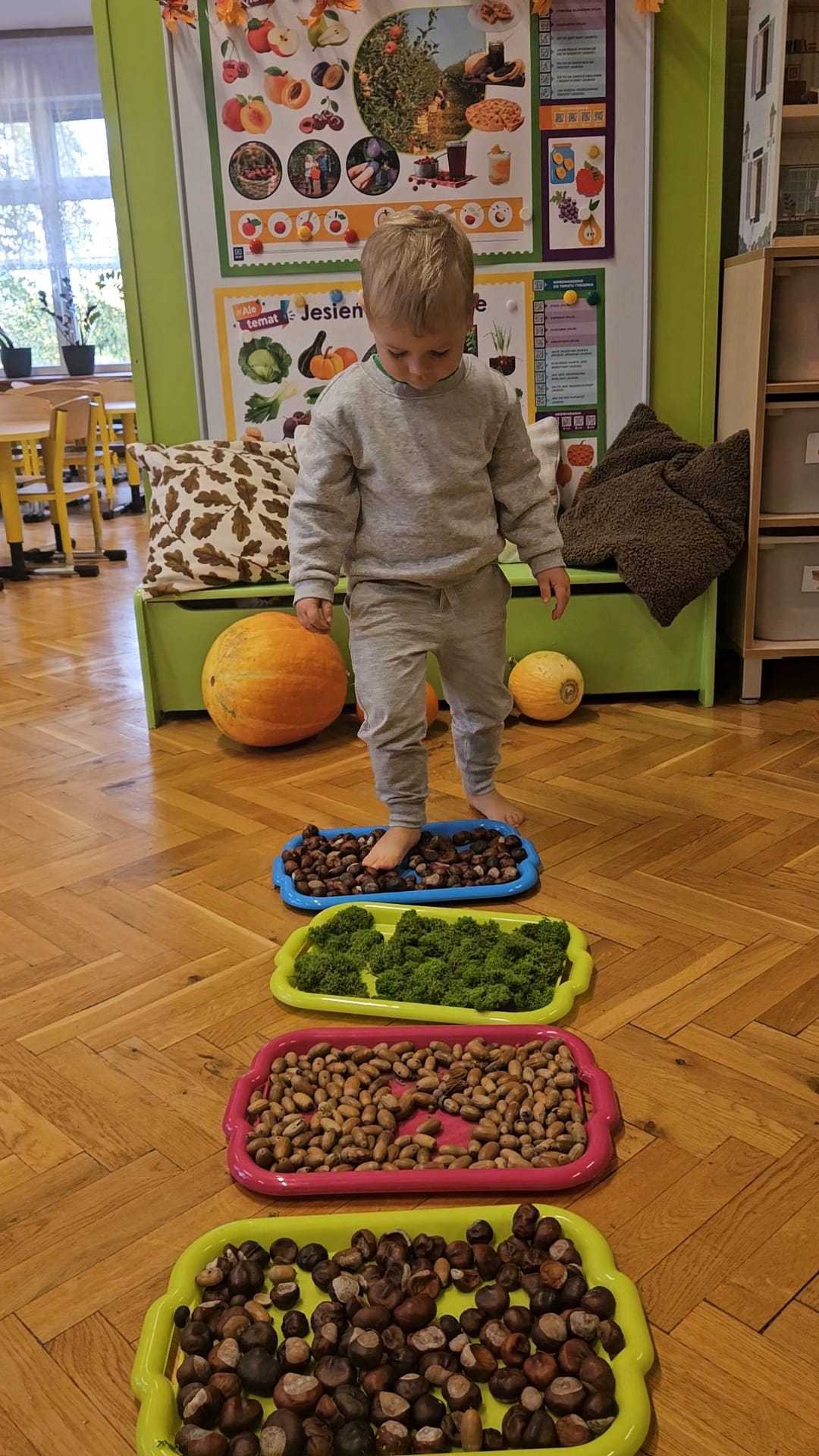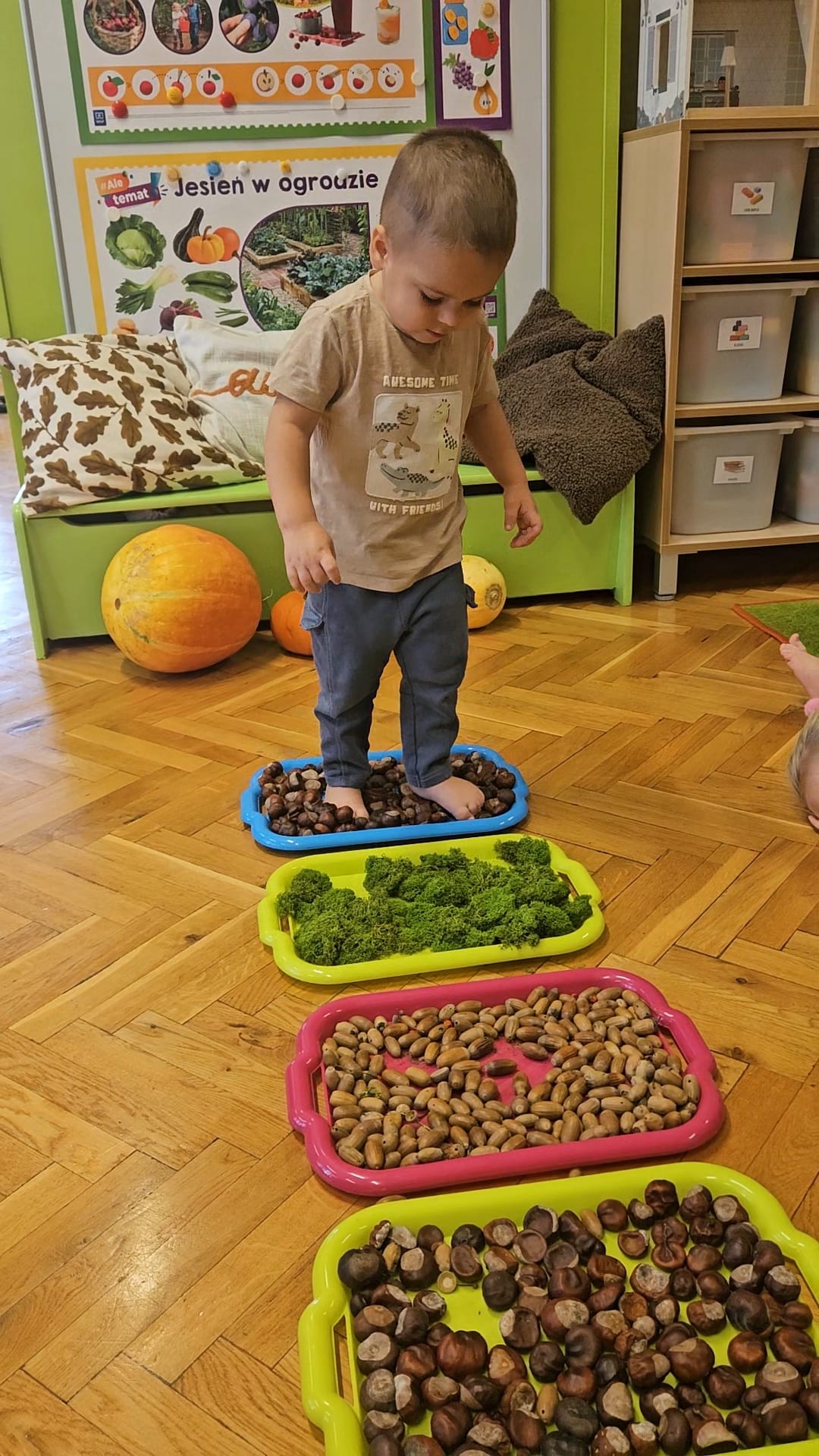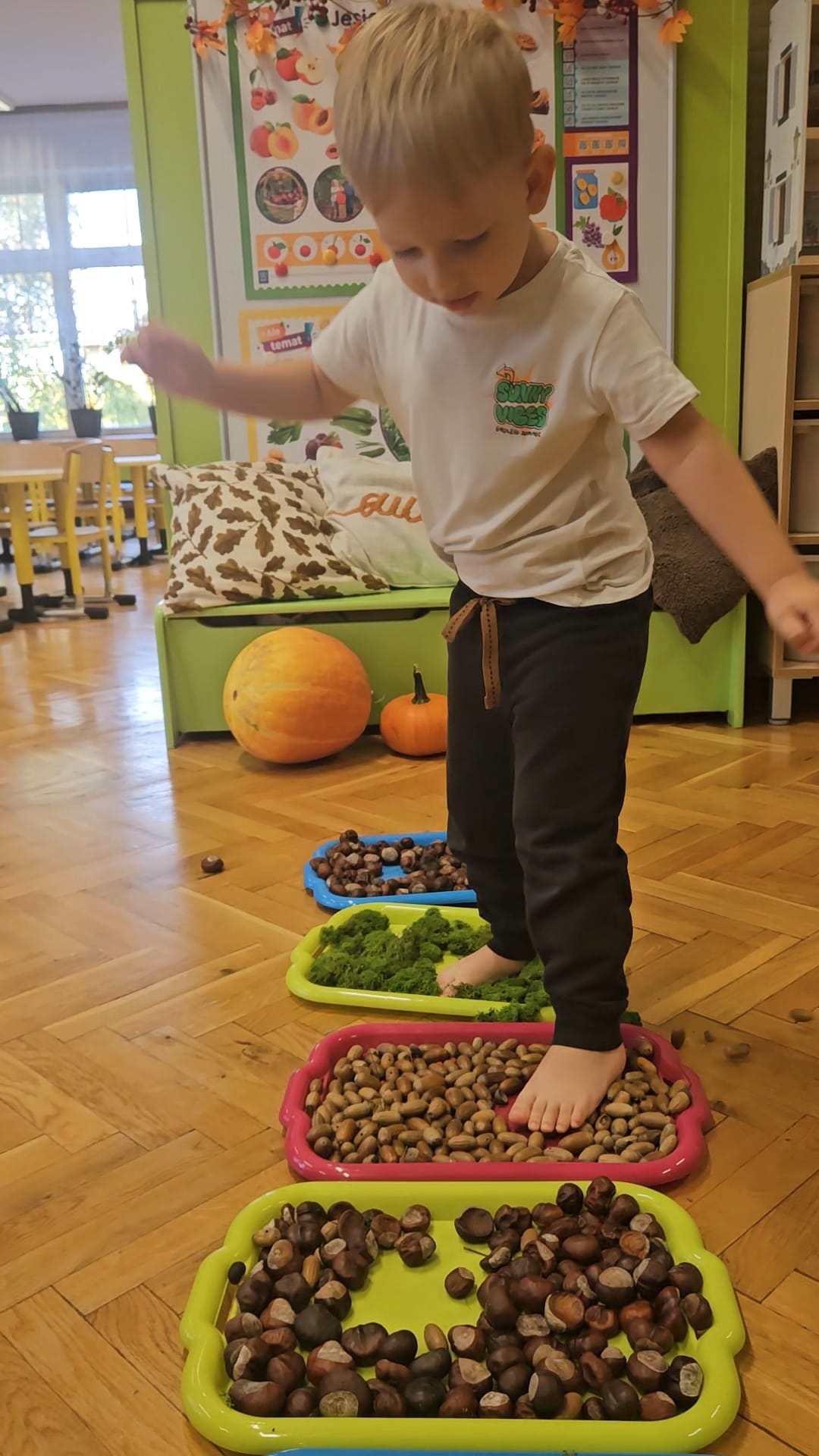 Przedszkolaki uczestniczyły w różnorodnych zabawach sensorycznych, dzięki którym mogły dotykać, wąchać, słuchać i obserwować zmiany zachodzące w przyrodzie. Dzieci badały fakturę liści, kasztanów, szyszek i żołędzi, słuchały odgłosów jesieni, , a także eksperymentowały z jesiennymi kolorami i materiałami przyrodniczymi. Zajęcia dostarczyły wszystkim mnóstwo radości, ciekawych wrażeń i nowych doświadczeń, rozwijając przy tym zmysły, kreatywność oraz umiejętność współpracy w grupie. Jesień może być naprawdę magiczna, gdy można jej dotknąć, posłuchać i poczuć!