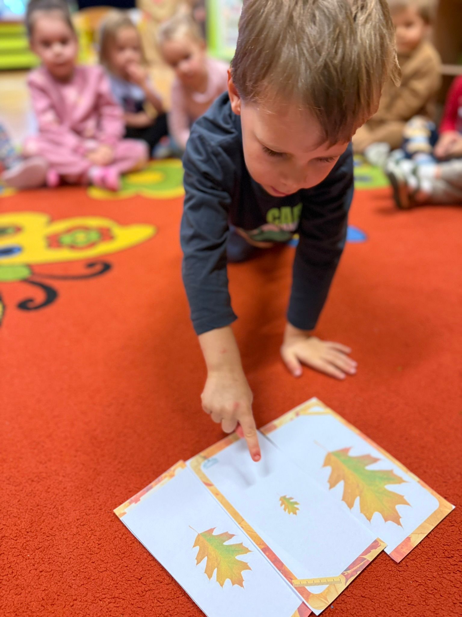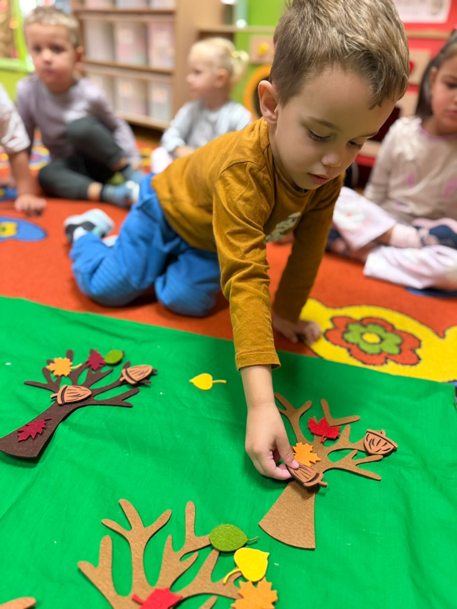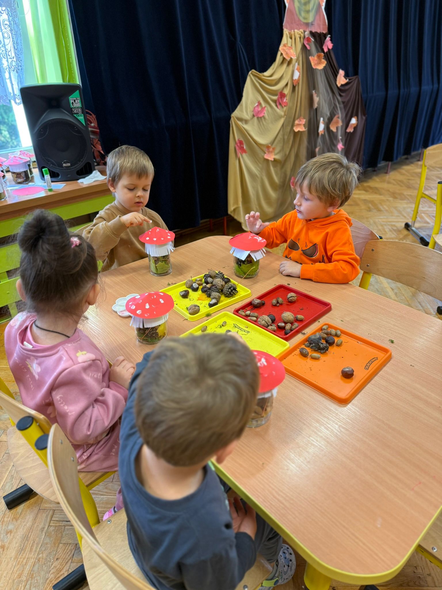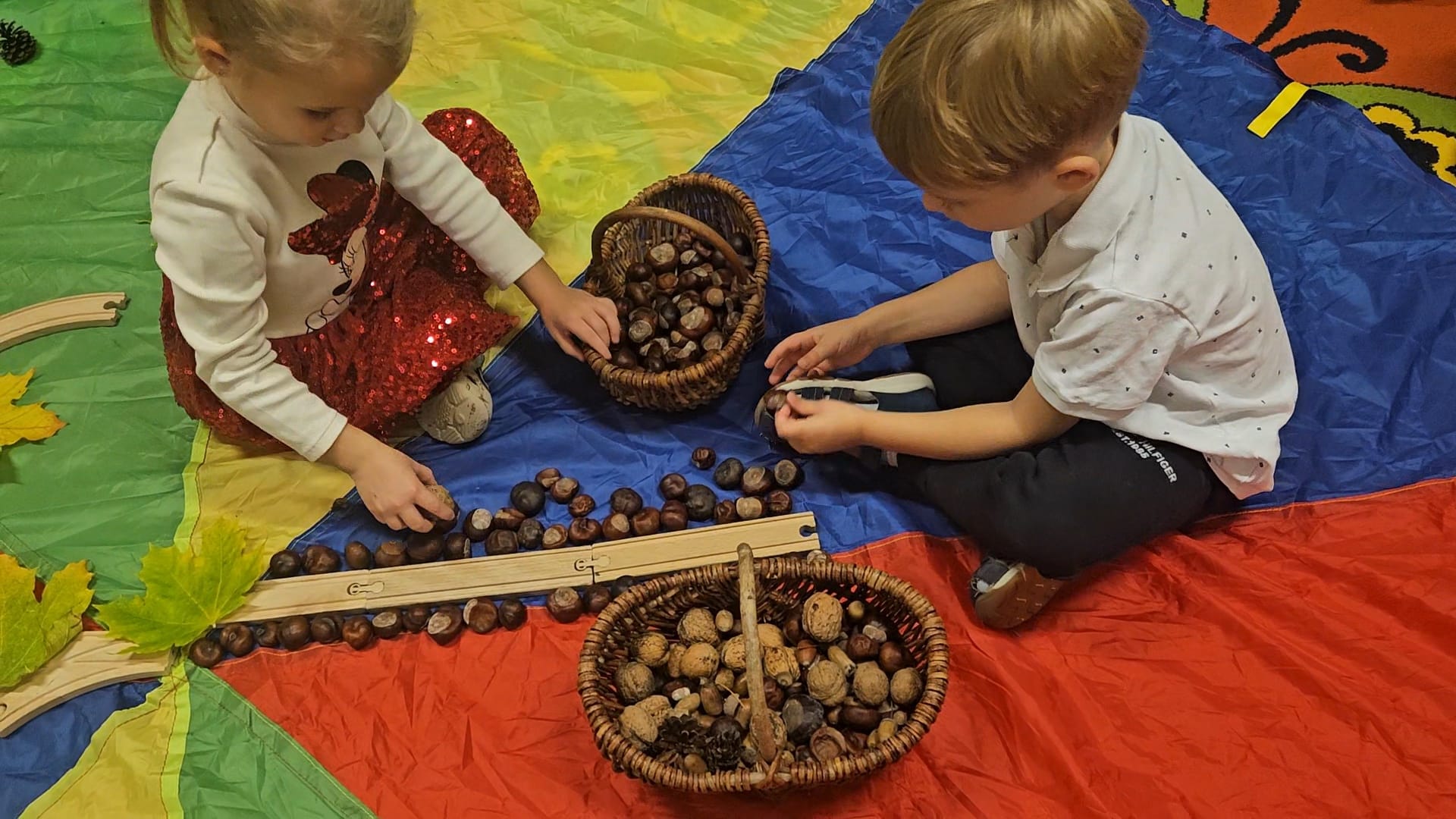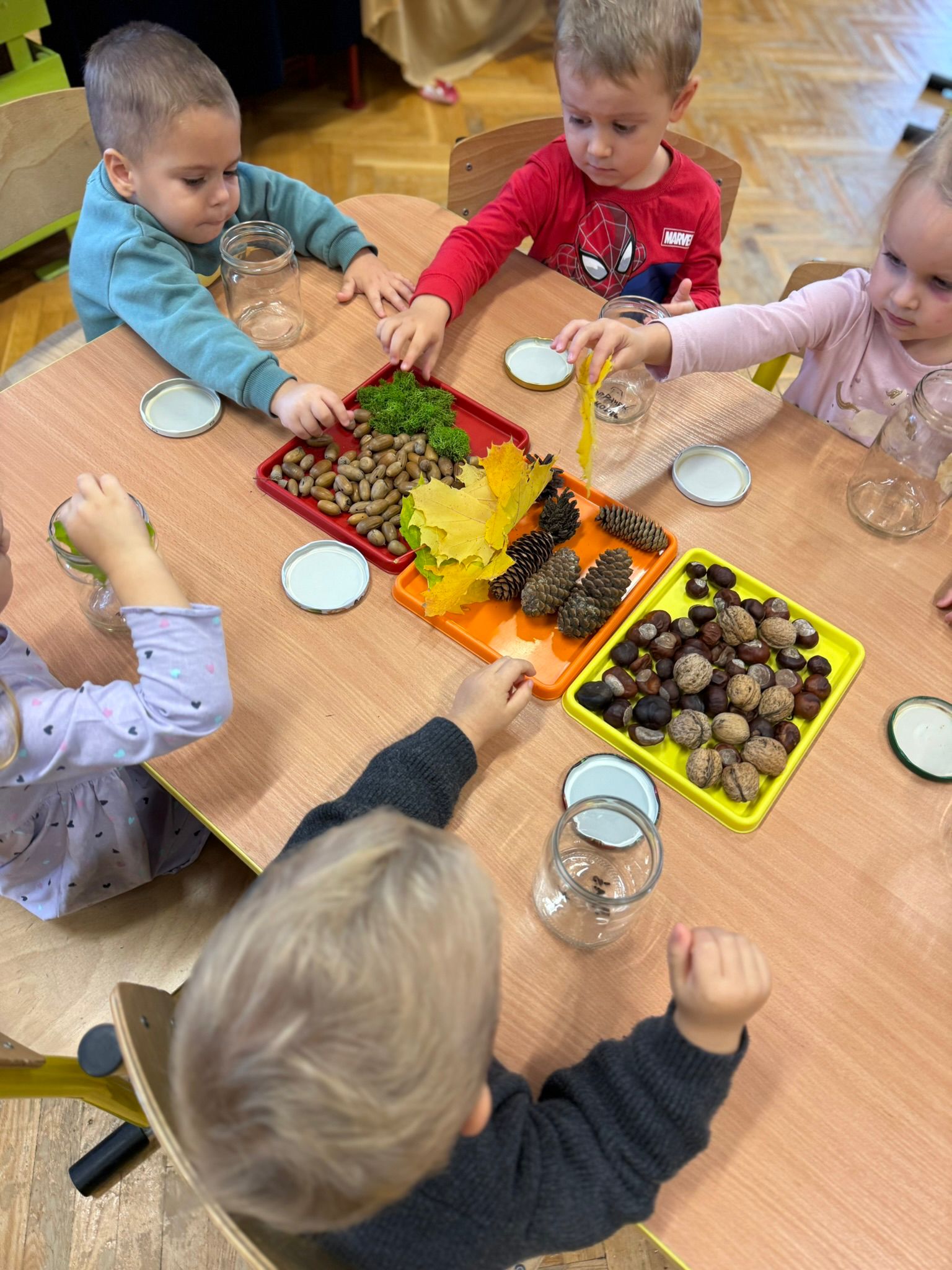 Przedszkolaki uczestniczyły w różnorodnych zabawach sensorycznych, dzięki którym mogły dotykać, wąchać, słuchać i obserwować zmiany zachodzące w przyrodzie. Dzieci badały fakturę liści, kasztanów, szyszek i żołędzi, słuchały odgłosów jesieni, , a także eksperymentowały z jesiennymi kolorami i materiałami przyrodniczymi. Zajęcia dostarczyły wszystkim mnóstwo radości, ciekawych wrażeń i nowych doświadczeń, rozwijając przy tym zmysły, kreatywność oraz umiejętność współpracy w grupie. Jesień może być naprawdę magiczna, gdy można jej dotknąć, posłuchać i poczuć!
