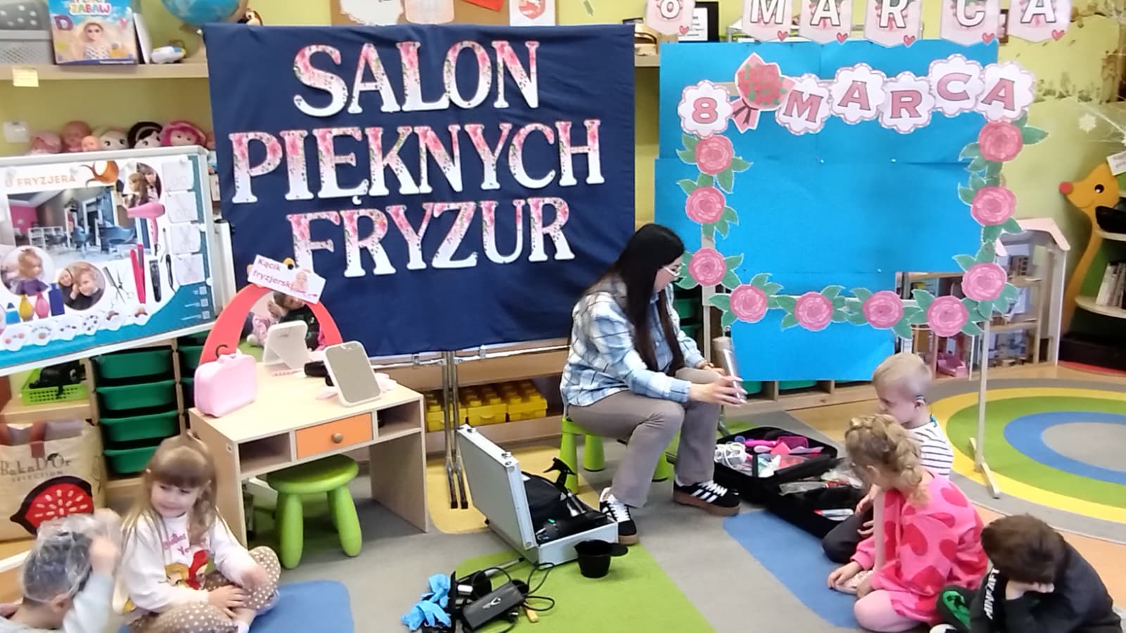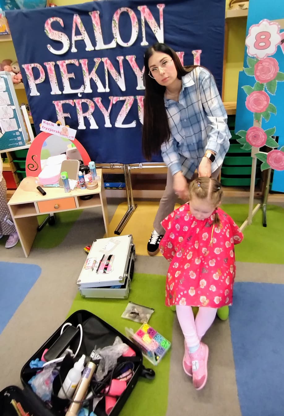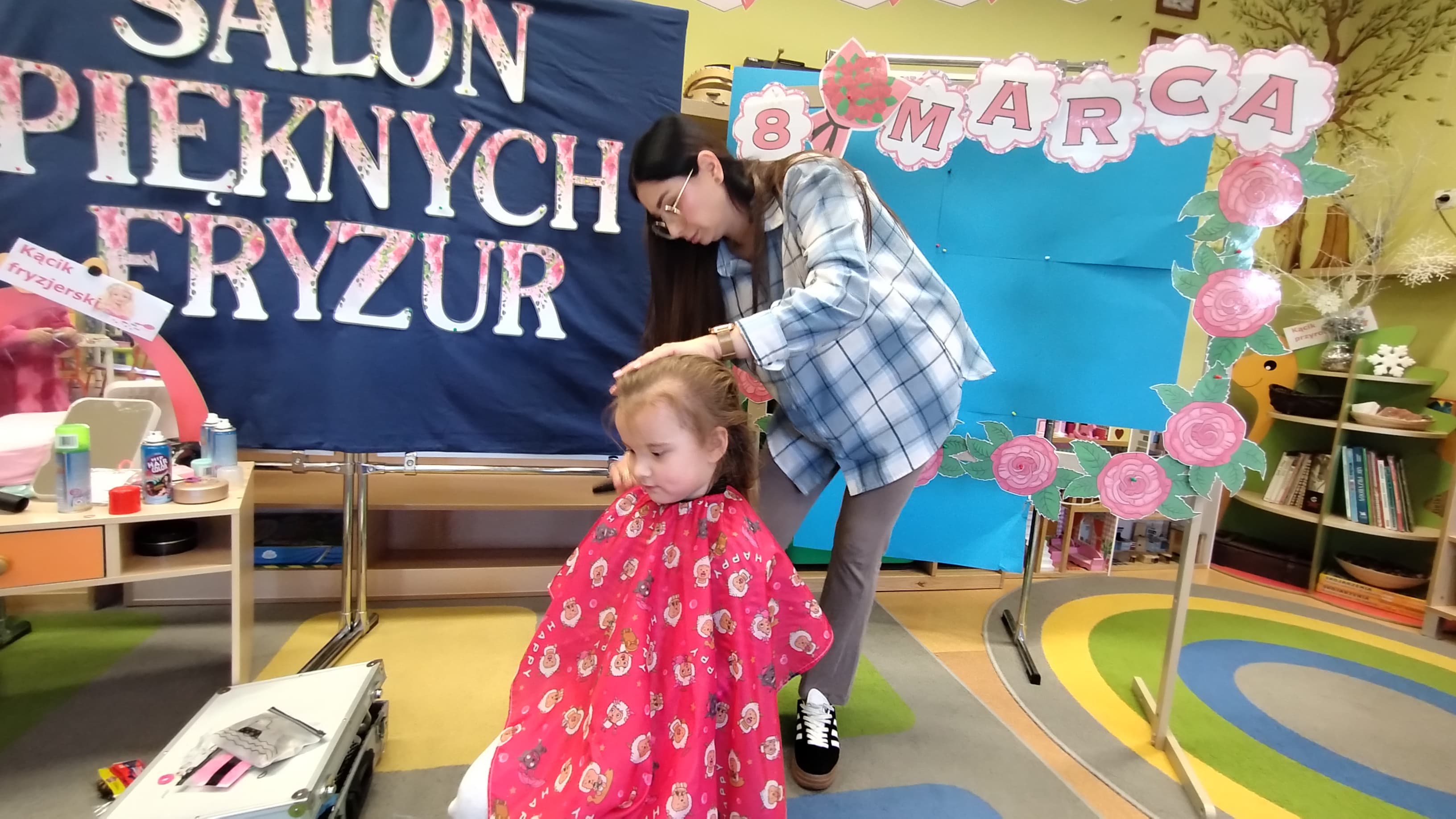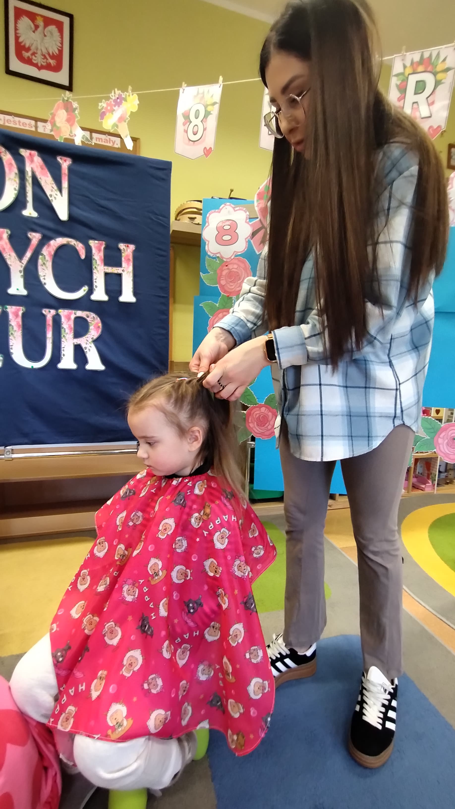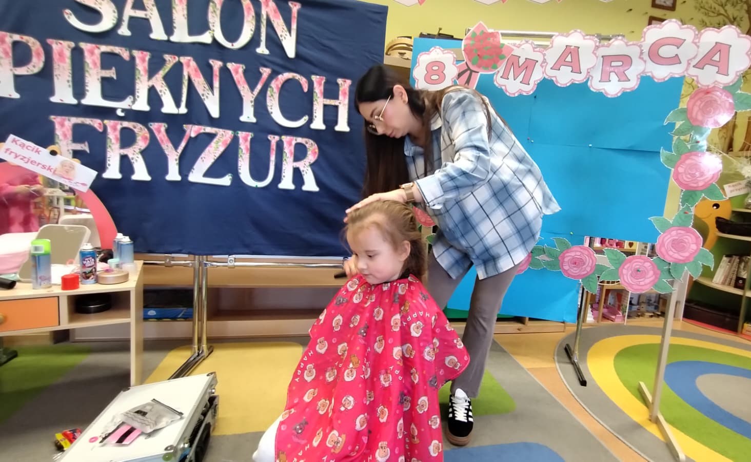 „ …. Być kobietą, być kobietą marzę ciągle będąc dzieckiem …” Która mała dziewczynka nie snuje wyobrażeń o byciu kobietą ??? Chyba każda, a celebrowanie Dnia Kobiet, na pewno pozwoliło przybliżyć te wyobrażenia. Choć Dzień Kobiet kojarzy nam się często z kwiatami, upominkami, których także nie zabrakło, to w grupie X tego dnia, dziewczynki mogły poczuć się, jak w prawdziwym salonie fryzjerskim, a to za sprawą spotkania z panią fryzjerką. Dnia 9. 03. 2026 odwiedziła nas mama Zuzi - pani Klaudia, której pasją i zawodem jest właśnie fryzjerstwo. I to dzięki pani Klaudii, dziewczynki mogły poczuć się tak wyjątkowo. Zanim jednak to nastąpiło, przedszkolaki miały wyjątkową okazję poznać zawód fryzjera! Podczas tej niezwykłej wizyty dzieci dowiedziały się, na czym polega praca fryzjera, jakie narzędzia są niezbędne w salonie fryzjerskim oraz jak prawidłowo dbać o włosy. Największą atrakcją spotkania był pokaz stylizacji fryzur, w którym modelkami zostały nasze dziewczynki oraz chłopcy. Dzieci z zaciekawieniem obserwowały, jak pani Klaudia - tworzy piękne upięcia, warkocze i loki, wykorzystując profesjonalne narzędzia. Same też mogły tworzyć fryzury na profesjonalnym manekinie fryzjerskim. Nie zabrakło również rozmów o różnych fryzjerskich trikach i porad na temat pielęgnacji włosów. Niespodzianka również czekała na chłopców …. „ kolorowy trik” na włosach. To spotkanie było nie tylko świetną zabawą, ale też cenną lekcją o jednym z ciekawszych, artystycznych zawodów. Kto wie, może wśród naszych przedszkolaków rośnie przyszła mistrzyni lub mistrz fryzjerstwa? Serdecznie dziękujemy naszemu gościowi za wizytę, za suuuper zabawę, wystrzałowe fryzury i poświęcony czas. Czekamy na kolejne inspirujące spotkania z naszymi rodzicami! A po obiadku nastąpił ciąg dalszy świętowania Dnia Kobiet w grupie X. Chłopcy wręczyli dziewczynkom upominki, po czym dzieci wspólnie rozpoczęły biesiadowanie przy słodkościach, o które zatroszczyli się niezawodni rodzice naszych przedszkolaków, za co serdecznie dziękujemy. To był naprawdę bardzo radosny, wypełniony wzajemnym szacunkiem i życzliwością dzień.