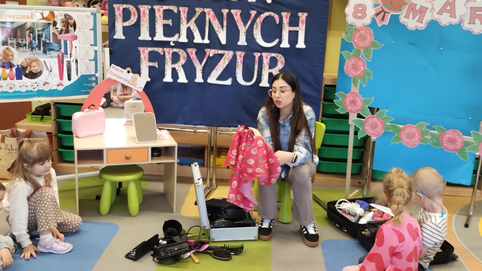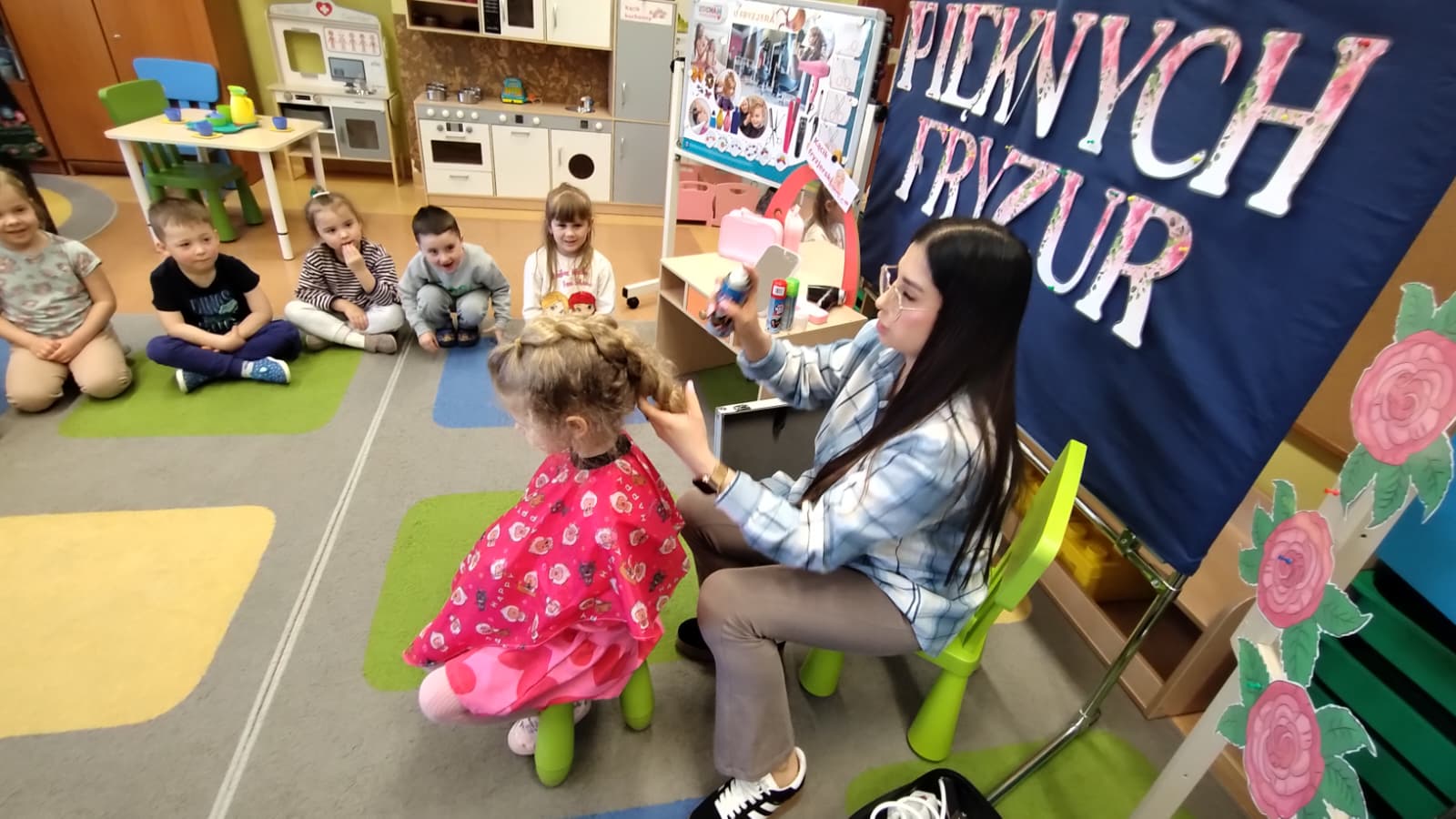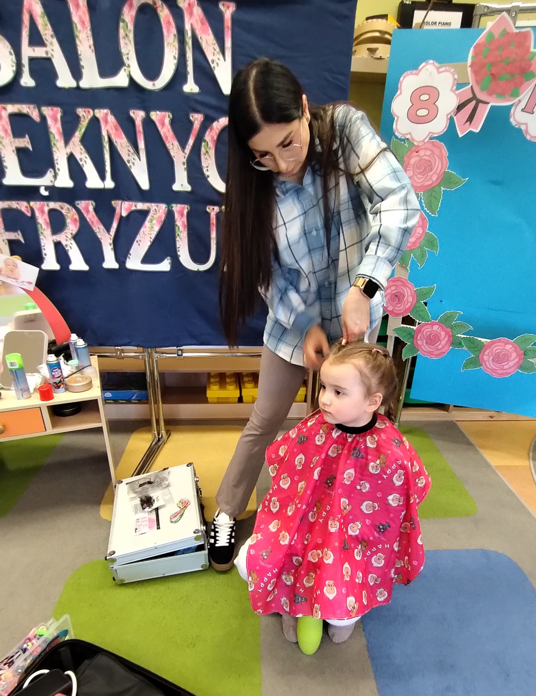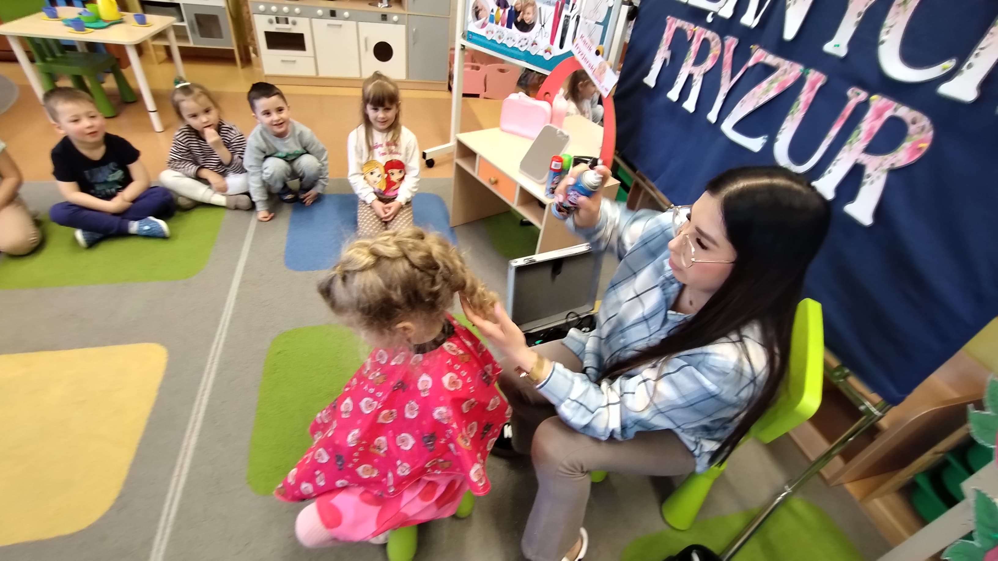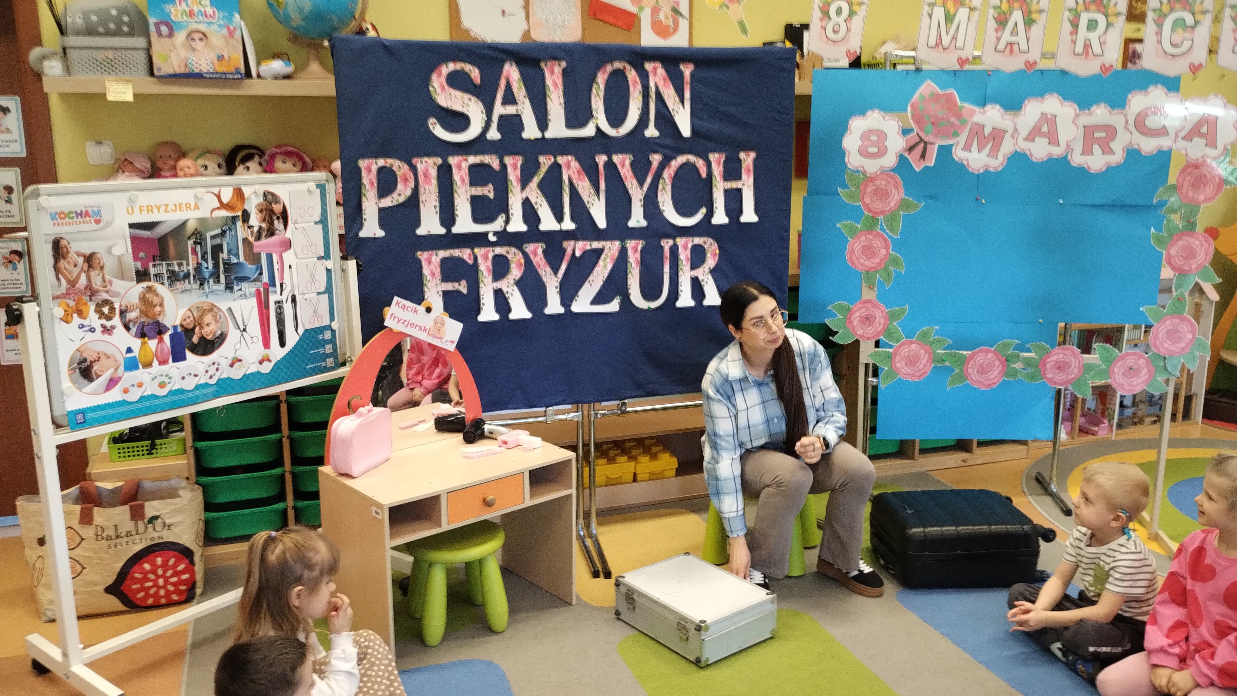 „ …. Być kobietą, być kobietą marzę ciągle będąc dzieckiem …” Która mała dziewczynka nie snuje wyobrażeń o byciu kobietą ??? Chyba każda, a celebrowanie Dnia Kobiet, na pewno pozwoliło przybliżyć te wyobrażenia. Choć Dzień Kobiet kojarzy nam się często z kwiatami, upominkami, których także nie zabrakło, to w grupie X tego dnia, dziewczynki mogły poczuć się, jak w prawdziwym salonie fryzjerskim, a to za sprawą spotkania z panią fryzjerką. Dnia 9. 03. 2026 odwiedziła nas mama Zuzi - pani Klaudia, której pasją i zawodem jest właśnie fryzjerstwo. I to dzięki pani Klaudii, dziewczynki mogły poczuć się tak wyjątkowo. Zanim jednak to nastąpiło, przedszkolaki miały wyjątkową okazję poznać zawód fryzjera! Podczas tej niezwykłej wizyty dzieci dowiedziały się, na czym polega praca fryzjera, jakie narzędzia są niezbędne w salonie fryzjerskim oraz jak prawidłowo dbać o włosy. Największą atrakcją spotkania był pokaz stylizacji fryzur, w którym modelkami zostały nasze dziewczynki oraz chłopcy. Dzieci z zaciekawieniem obserwowały, jak pani Klaudia - tworzy piękne upięcia, warkocze i loki, wykorzystując profesjonalne narzędzia. Same też mogły tworzyć fryzury na profesjonalnym manekinie fryzjerskim. Nie zabrakło również rozmów o różnych fryzjerskich trikach i porad na temat pielęgnacji włosów. Niespodzianka również czekała na chłopców …. „ kolorowy trik” na włosach. To spotkanie było nie tylko świetną zabawą, ale też cenną lekcją o jednym z ciekawszych, artystycznych zawodów. Kto wie, może wśród naszych przedszkolaków rośnie przyszła mistrzyni lub mistrz fryzjerstwa? Serdecznie dziękujemy naszemu gościowi za wizytę, za suuuper zabawę, wystrzałowe fryzury i poświęcony czas. Czekamy na kolejne inspirujące spotkania z naszymi rodzicami! A po obiadku nastąpił ciąg dalszy świętowania Dnia Kobiet w grupie X. Chłopcy wręczyli dziewczynkom upominki, po czym dzieci wspólnie rozpoczęły biesiadowanie przy słodkościach, o które zatroszczyli się niezawodni rodzice naszych przedszkolaków, za co serdecznie dziękujemy. To był naprawdę bardzo radosny, wypełniony wzajemnym szacunkiem i życzliwością dzień.