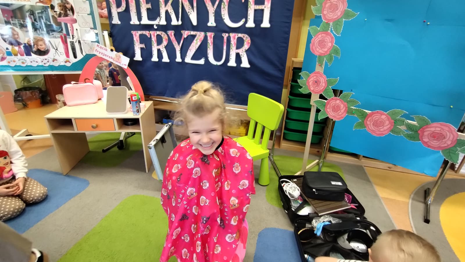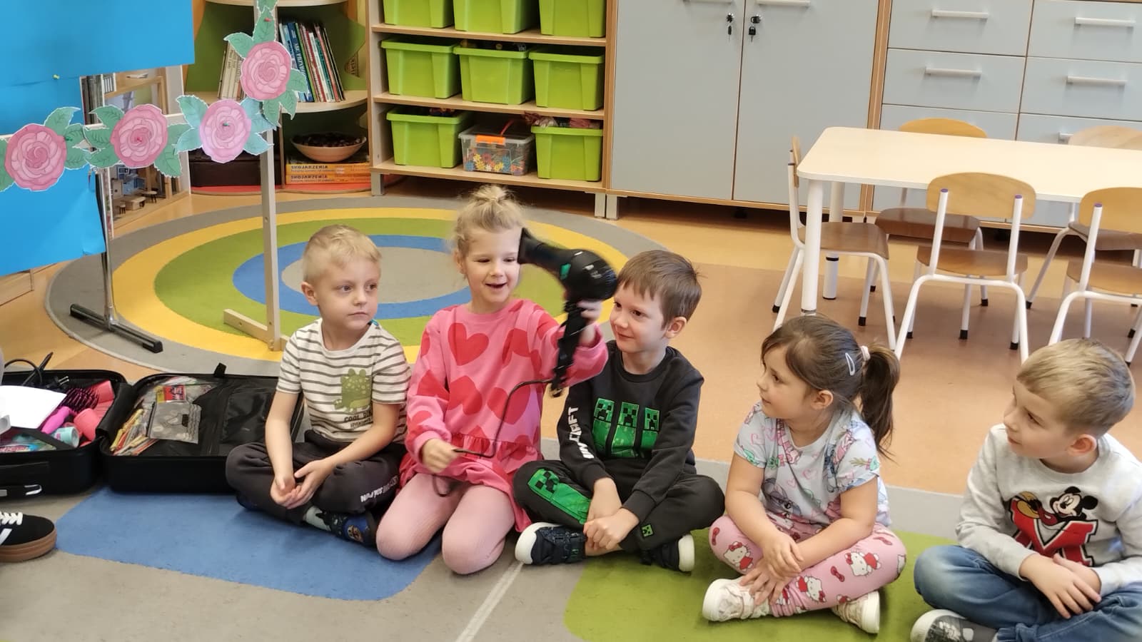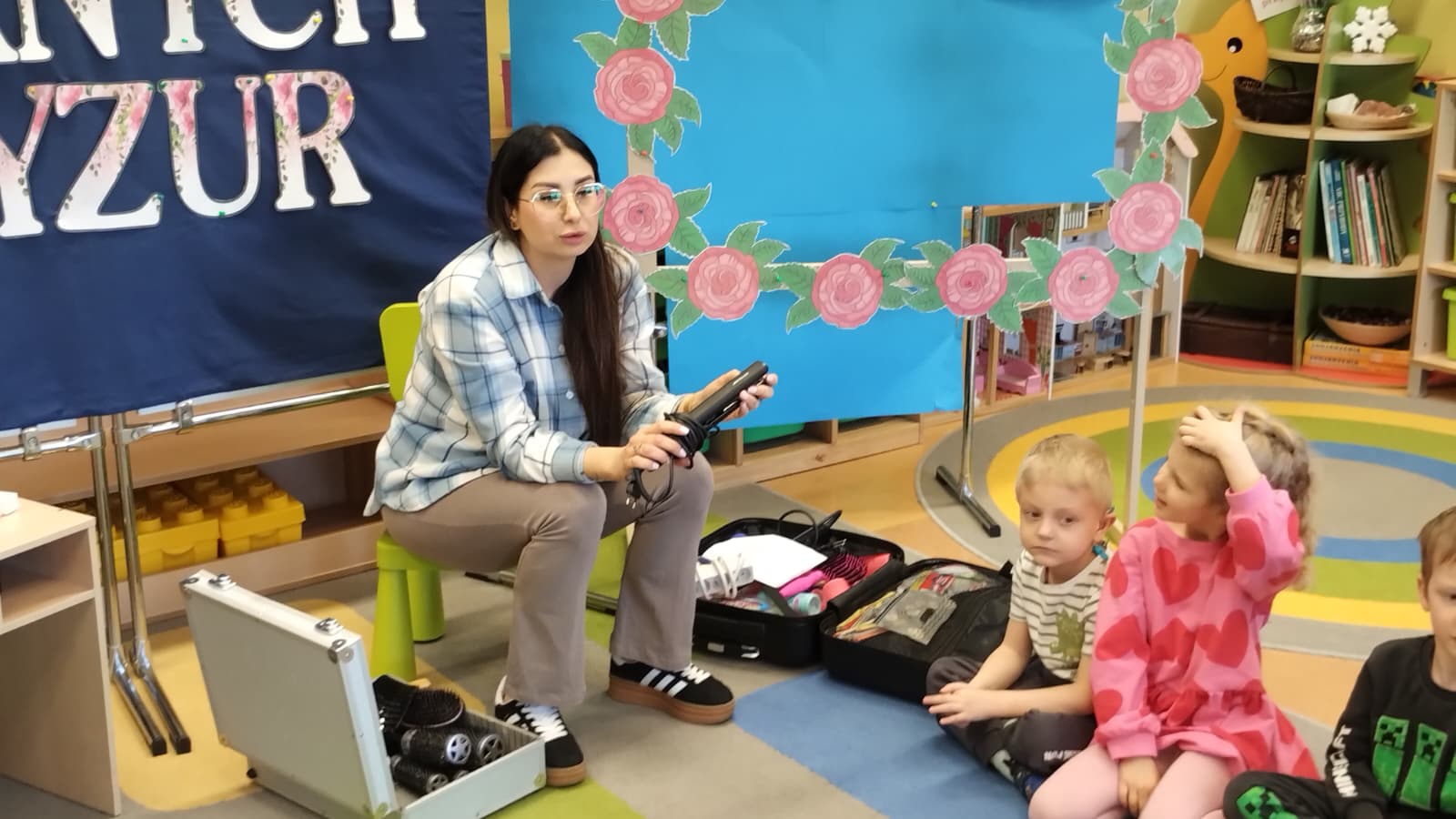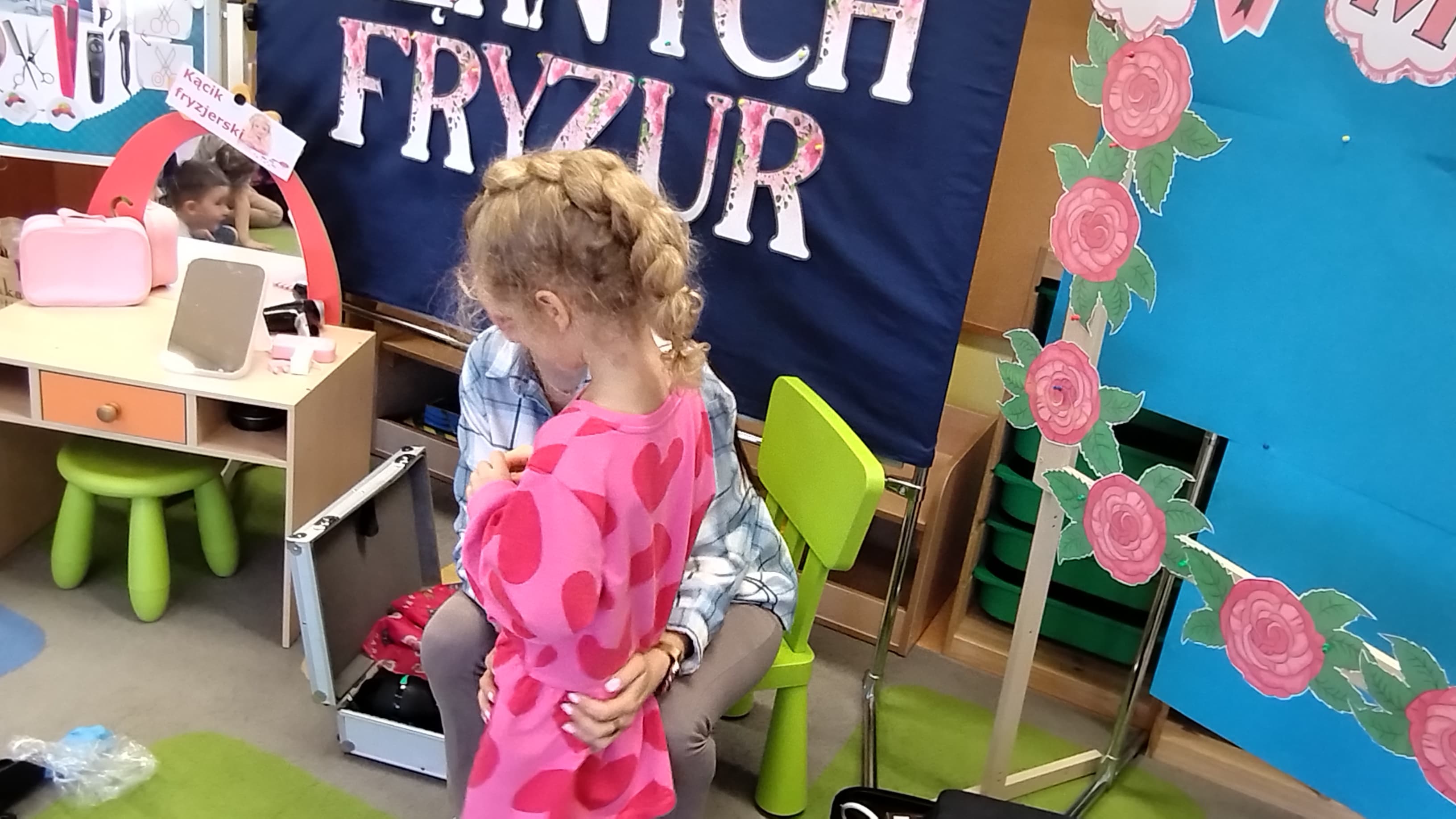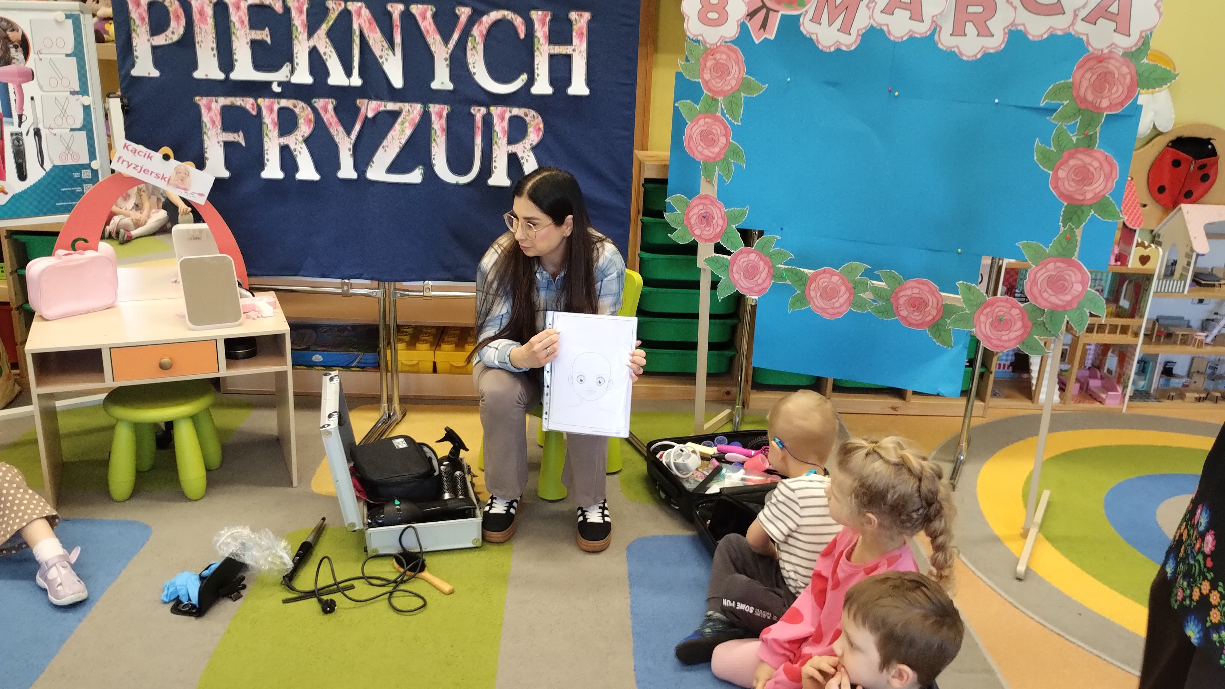„ …. Być kobietą, być kobietą marzę ciągle będąc dzieckiem …” Która mała dziewczynka nie snuje wyobrażeń o byciu kobietą ??? Chyba każda, a celebrowanie Dnia Kobiet, na pewno pozwoliło przybliżyć te wyobrażenia. Choć Dzień Kobiet kojarzy nam się często z kwiatami, upominkami, których także nie zabrakło, to w grupie X tego dnia, dziewczynki mogły poczuć się, jak w prawdziwym salonie fryzjerskim, a to za sprawą spotkania z panią fryzjerką. Dnia 9. 03. 2026 odwiedziła nas mama Zuzi - pani Klaudia, której pasją i zawodem jest właśnie fryzjerstwo. I to dzięki pani Klaudii, dziewczynki mogły poczuć się tak wyjątkowo. Zanim jednak to nastąpiło, przedszkolaki miały wyjątkową okazję poznać zawód fryzjera! Podczas tej niezwykłej wizyty dzieci dowiedziały się, na czym polega praca fryzjera, jakie narzędzia są niezbędne w salonie fryzjerskim oraz jak prawidłowo dbać o włosy. Największą atrakcją spotkania był pokaz stylizacji fryzur, w którym modelkami zostały nasze dziewczynki oraz chłopcy. Dzieci z zaciekawieniem obserwowały, jak pani Klaudia - tworzy piękne upięcia, warkocze i loki, wykorzystując profesjonalne narzędzia. Same też mogły tworzyć fryzury na profesjonalnym manekinie fryzjerskim. Nie zabrakło również rozmów o różnych fryzjerskich trikach i porad na temat pielęgnacji włosów. Niespodzianka również czekała na chłopców …. „ kolorowy trik” na włosach. To spotkanie było nie tylko świetną zabawą, ale też cenną lekcją o jednym z ciekawszych, artystycznych zawodów. Kto wie, może wśród naszych przedszkolaków rośnie przyszła mistrzyni lub mistrz fryzjerstwa? Serdecznie dziękujemy naszemu gościowi za wizytę, za suuuper zabawę, wystrzałowe fryzury i poświęcony czas. Czekamy na kolejne inspirujące spotkania z naszymi rodzicami! A po obiadku nastąpił ciąg dalszy świętowania Dnia Kobiet w grupie X. Chłopcy wręczyli dziewczynkom upominki, po czym dzieci wspólnie rozpoczęły biesiadowanie przy słodkościach, o które zatroszczyli się niezawodni rodzice naszych przedszkolaków, za co serdecznie dziękujemy. To był naprawdę bardzo radosny, wypełniony wzajemnym szacunkiem i życzliwością dzień.