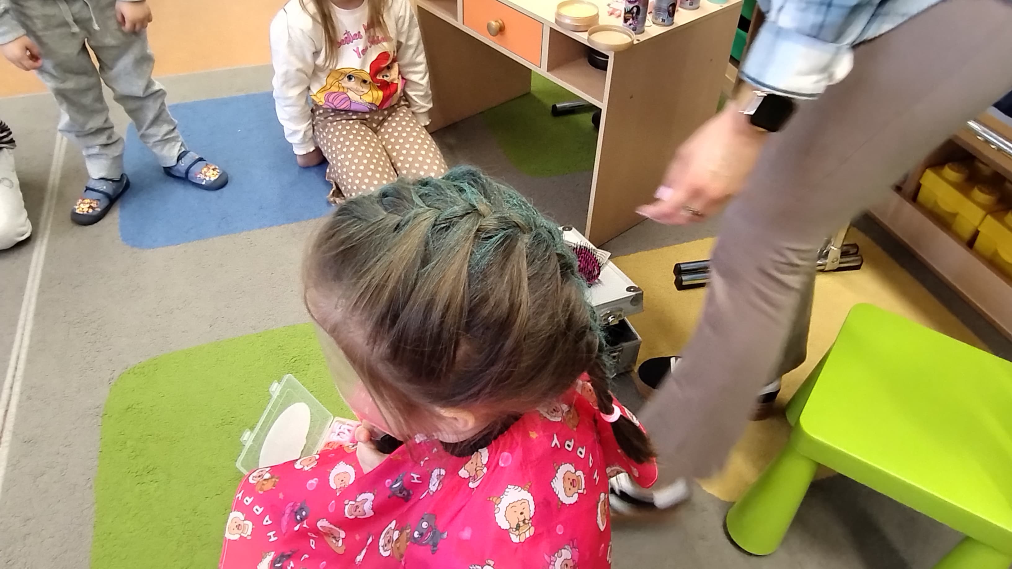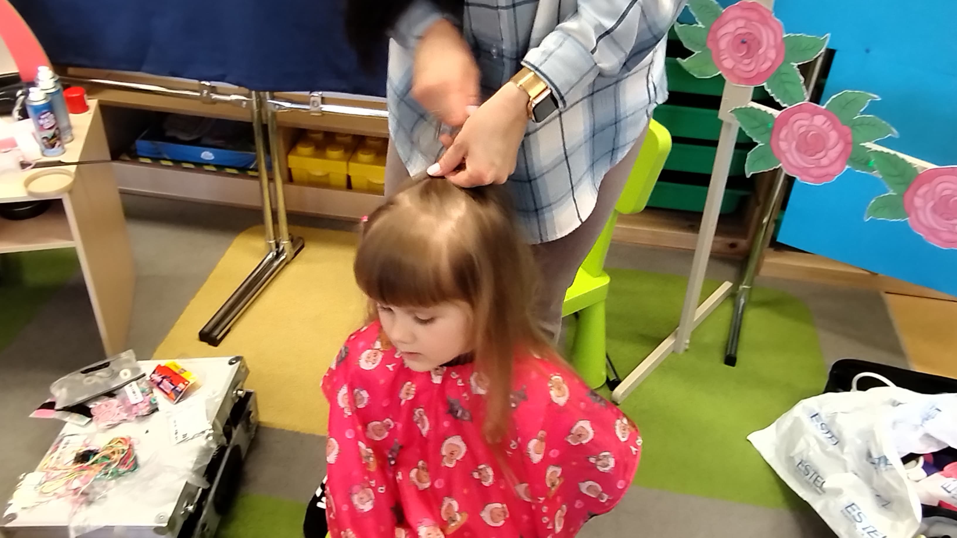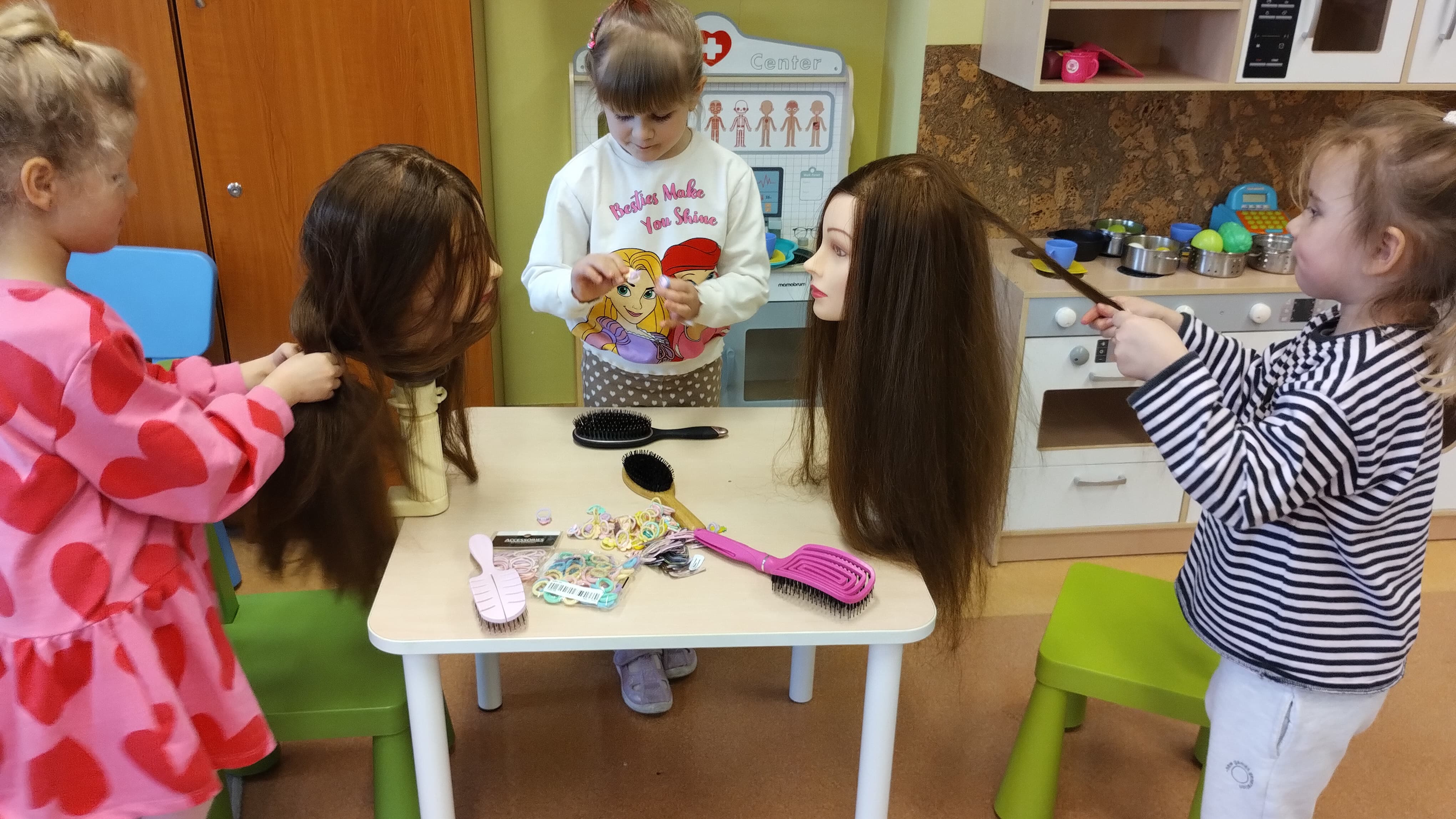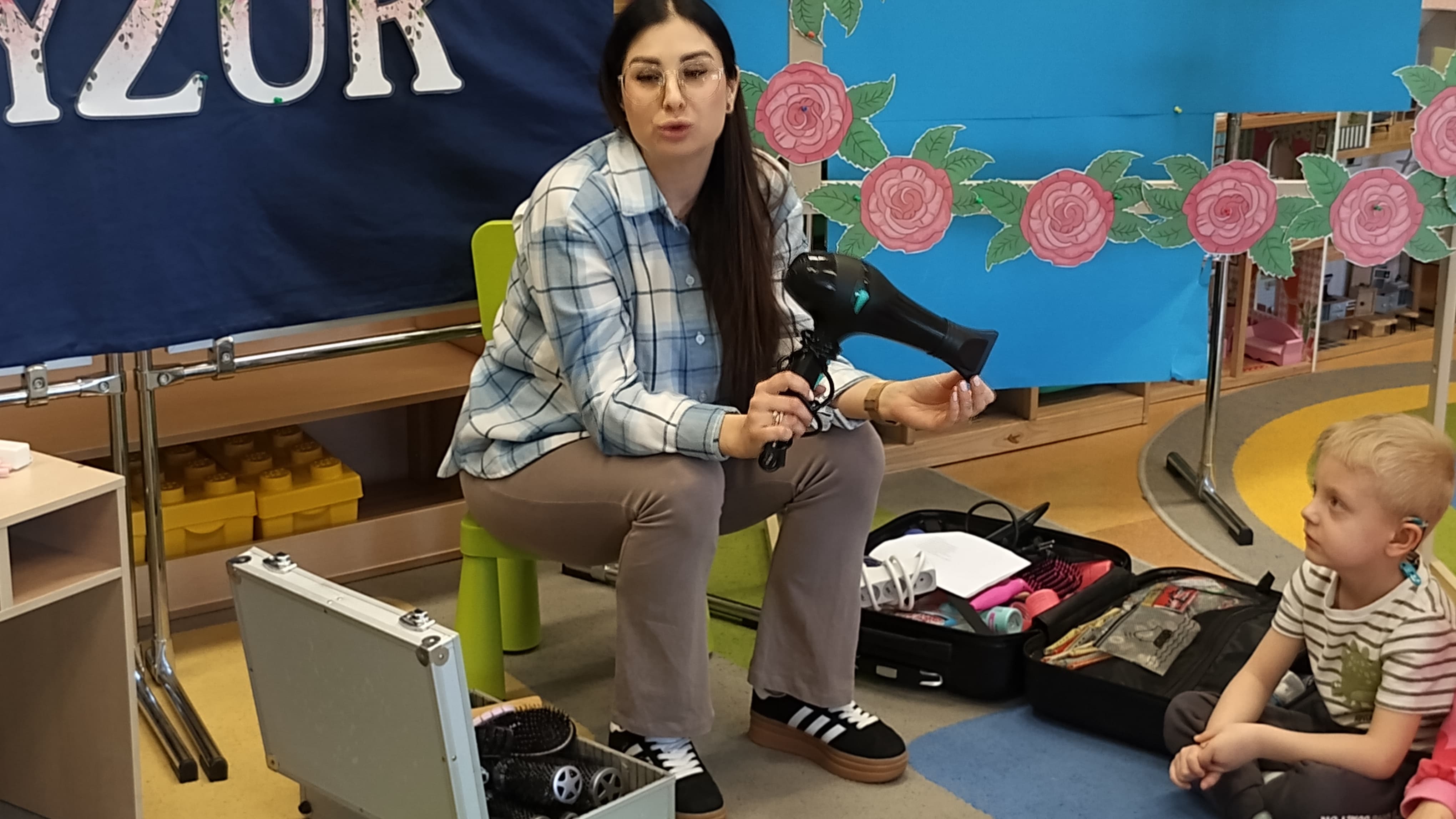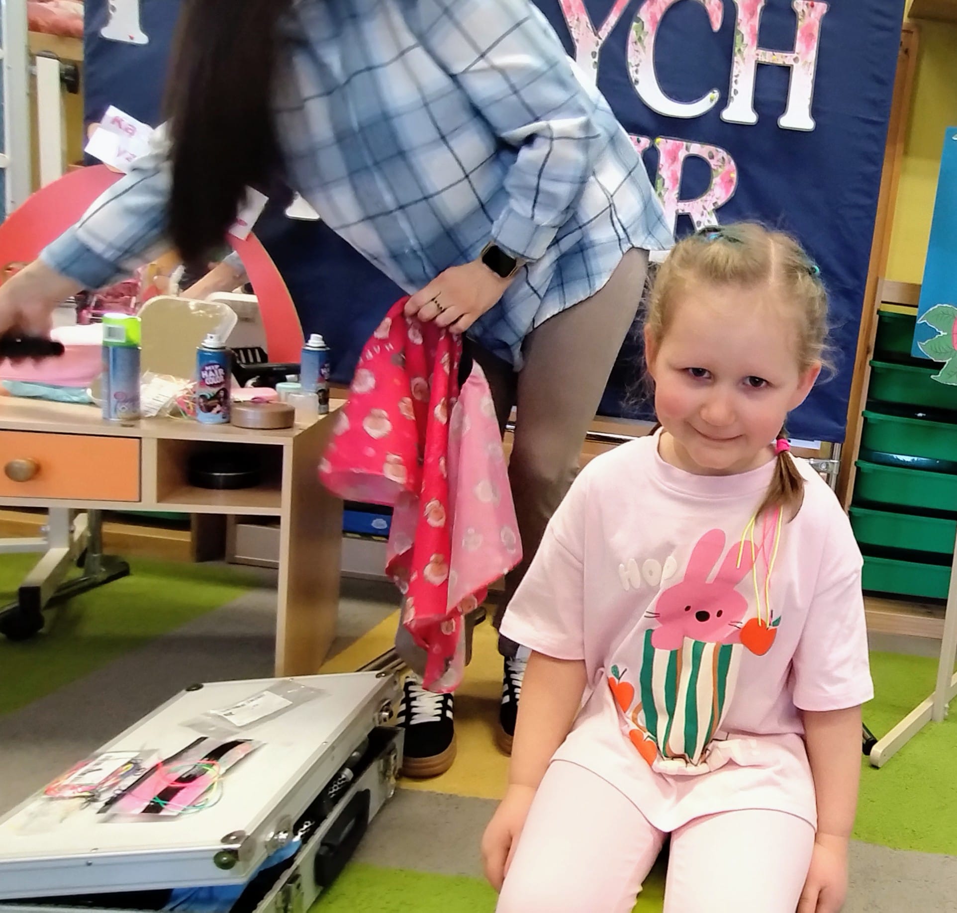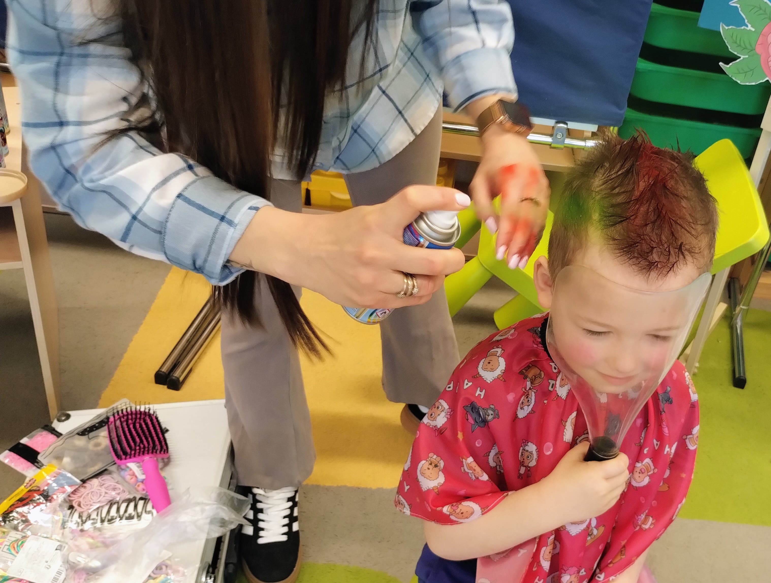 „ …. Być kobietą, być kobietą marzę ciągle będąc dzieckiem …” Która mała dziewczynka nie snuje wyobrażeń o byciu kobietą ??? Chyba każda, a celebrowanie Dnia Kobiet, na pewno pozwoliło przybliżyć te wyobrażenia. Choć Dzień Kobiet kojarzy nam się często z kwiatami, upominkami, których także nie zabrakło, to w grupie X tego dnia, dziewczynki mogły poczuć się, jak w prawdziwym salonie fryzjerskim, a to za sprawą spotkania z panią fryzjerką. Dnia 9. 03. 2026 odwiedziła nas mama Zuzi - pani Klaudia, której pasją i zawodem jest właśnie fryzjerstwo. I to dzięki pani Klaudii, dziewczynki mogły poczuć się tak wyjątkowo. Zanim jednak to nastąpiło, przedszkolaki miały wyjątkową okazję poznać zawód fryzjera! Podczas tej niezwykłej wizyty dzieci dowiedziały się, na czym polega praca fryzjera, jakie narzędzia są niezbędne w salonie fryzjerskim oraz jak prawidłowo dbać o włosy. Największą atrakcją spotkania był pokaz stylizacji fryzur, w którym modelkami zostały nasze dziewczynki oraz chłopcy. Dzieci z zaciekawieniem obserwowały, jak pani Klaudia - tworzy piękne upięcia, warkocze i loki, wykorzystując profesjonalne narzędzia. Same też mogły tworzyć fryzury na profesjonalnym manekinie fryzjerskim. Nie zabrakło również rozmów o różnych fryzjerskich trikach i porad na temat pielęgnacji włosów. Niespodzianka również czekała na chłopców …. „ kolorowy trik” na włosach. To spotkanie było nie tylko świetną zabawą, ale też cenną lekcją o jednym z ciekawszych, artystycznych zawodów. Kto wie, może wśród naszych przedszkolaków rośnie przyszła mistrzyni lub mistrz fryzjerstwa? Serdecznie dziękujemy naszemu gościowi za wizytę, za suuuper zabawę, wystrzałowe fryzury i poświęcony czas. Czekamy na kolejne inspirujące spotkania z naszymi rodzicami! A po obiadku nastąpił ciąg dalszy świętowania Dnia Kobiet w grupie X. Chłopcy wręczyli dziewczynkom upominki, po czym dzieci wspólnie rozpoczęły biesiadowanie przy słodkościach, o które zatroszczyli się niezawodni rodzice naszych przedszkolaków, za co serdecznie dziękujemy. To był naprawdę bardzo radosny, wypełniony wzajemnym szacunkiem i życzliwością dzień.