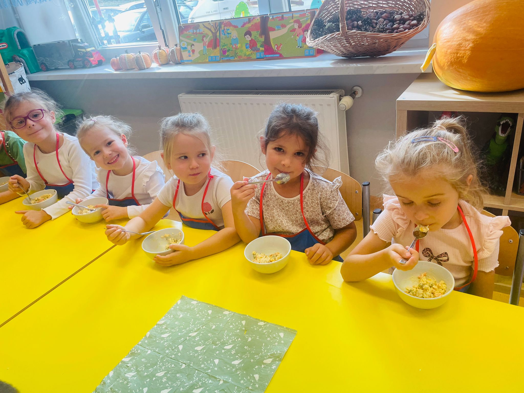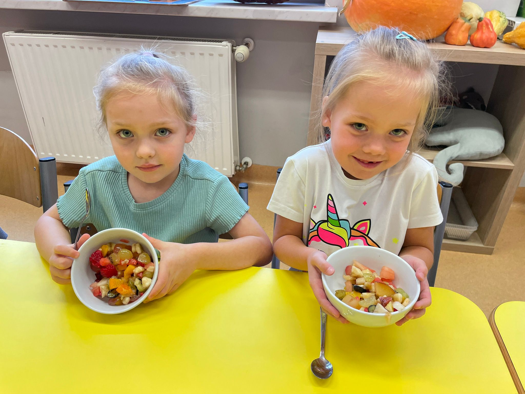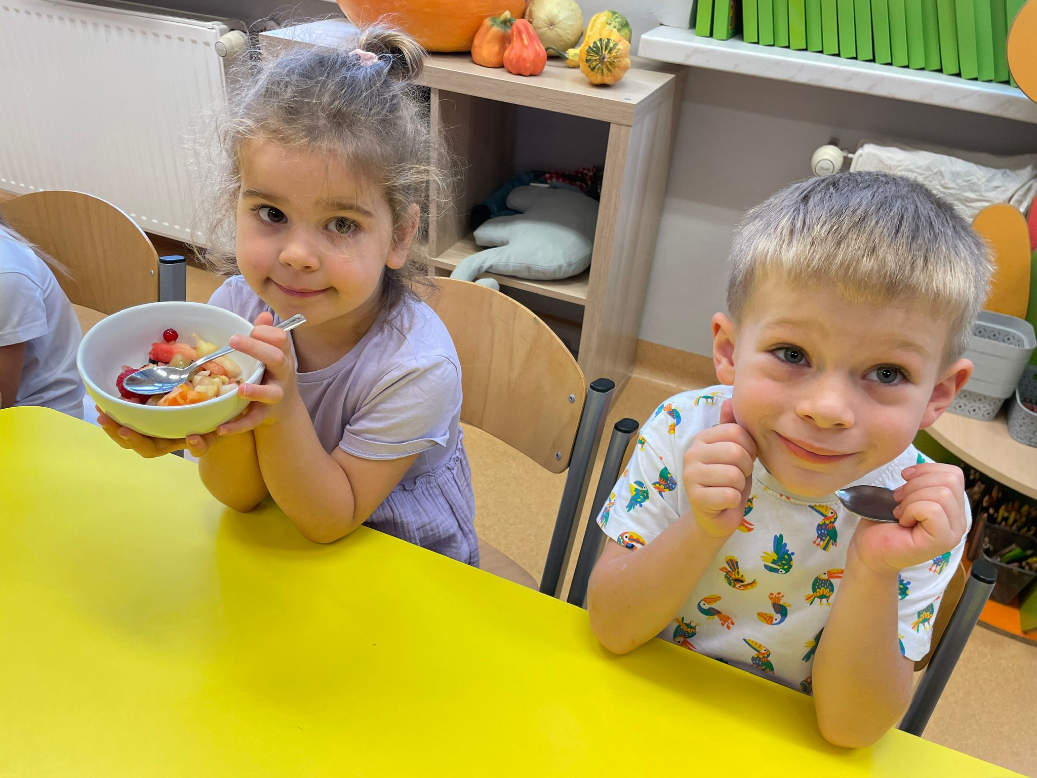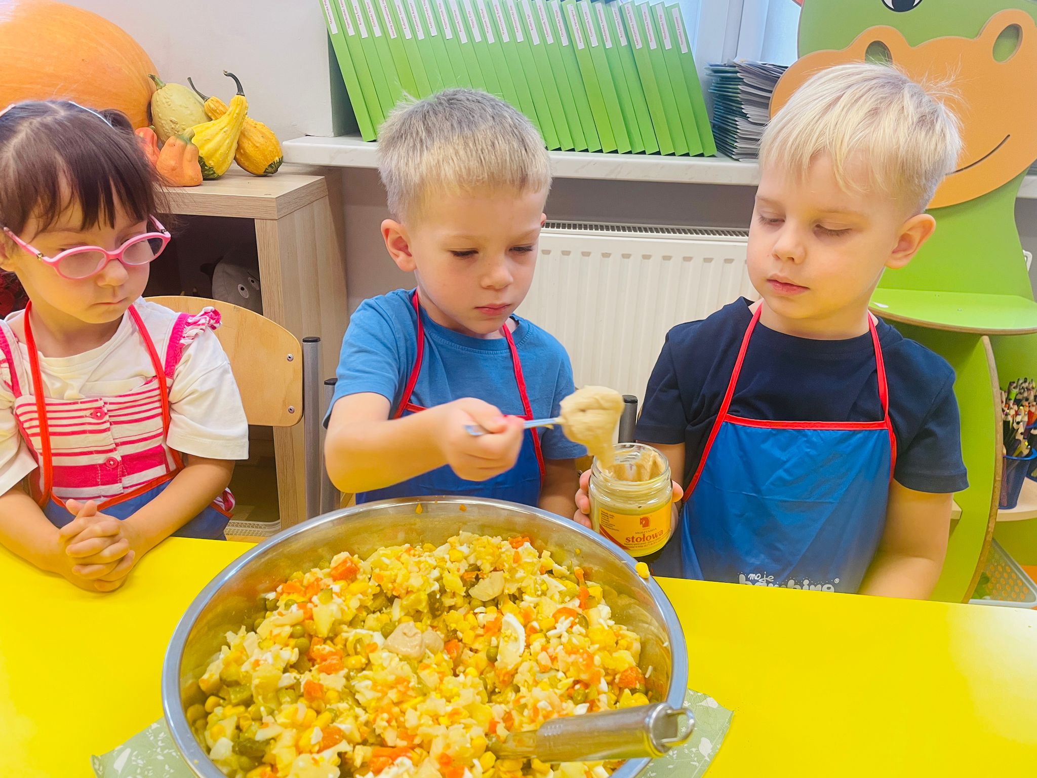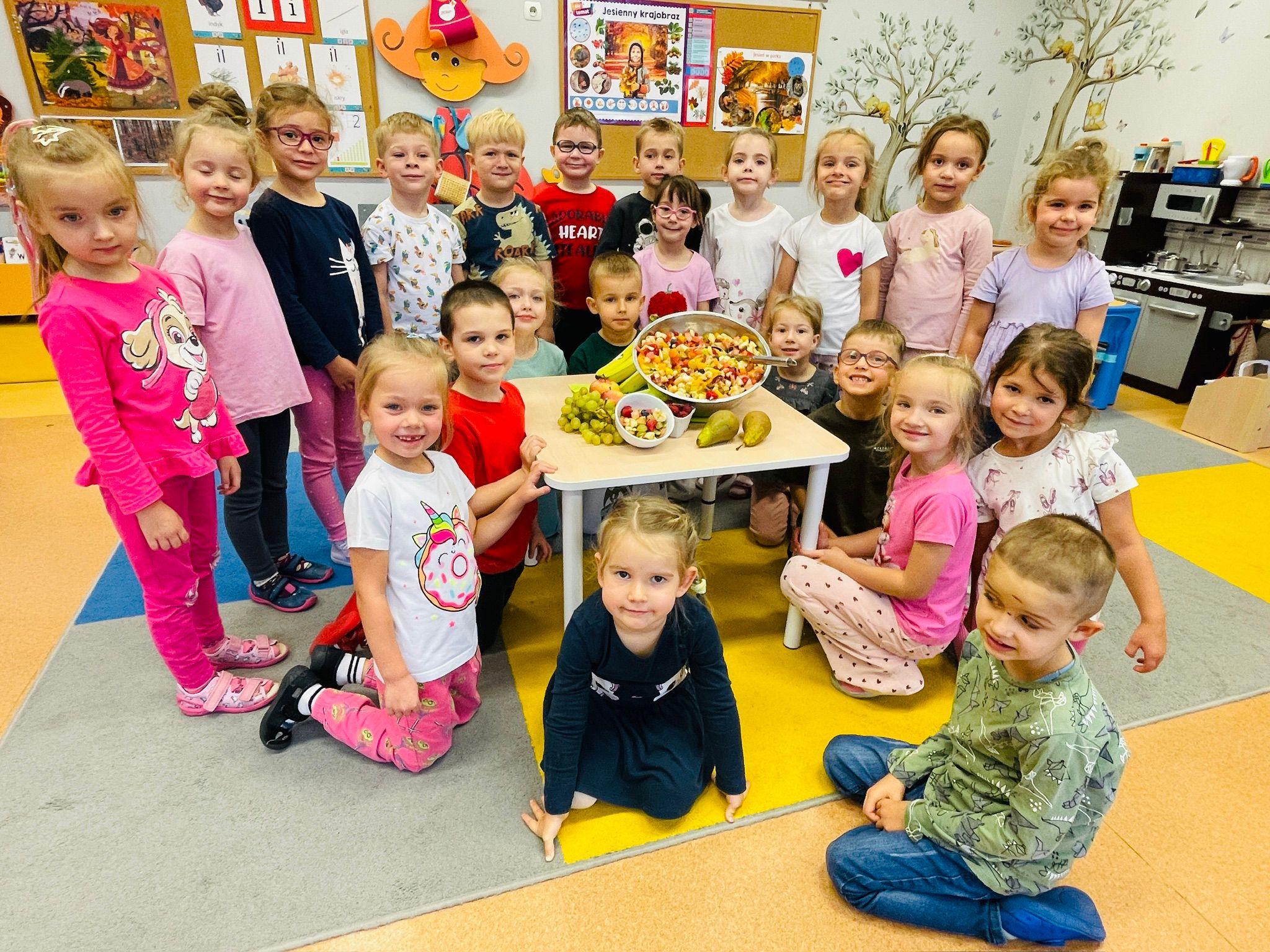 Jesień wielu kojarzy się z deszczową pogodą i szarugą. Ale w naszym przedszkolu udowodniliśmy już wiele razy, że ta pora roku potrafi być również niezwykle kolorowa. A co, jeśli kolory miałyby również smak i zapach? Realizując projekt edukacyjny „Smaki jesieni” , podczas jesiennych atrakcji kulinarnych w gr. XI przedszkolaki sprawdziły, że kolorowe warzywa i owoce, również te sezonowe, smakują i pachną wyśmienicie. Szczególnie jeśli się je ze sobą połączy. Wszyscy podkreślaliśmy walory zdrowotne owoców i warzyw. W ten oto sposób powstały zdrowe sałatki pełne pięknych barw, które przedszkolaki mogły samodzielnie spałaszować.