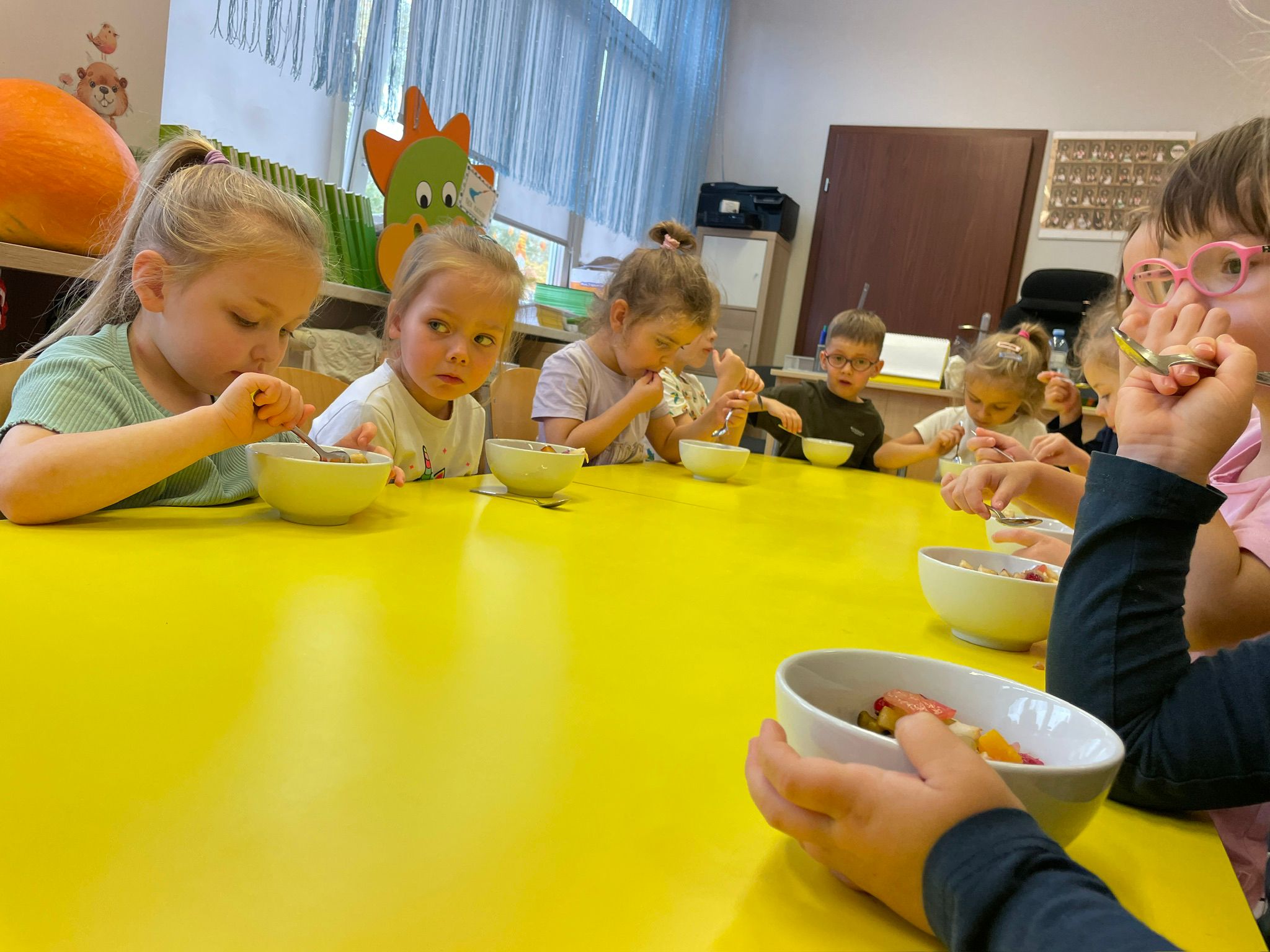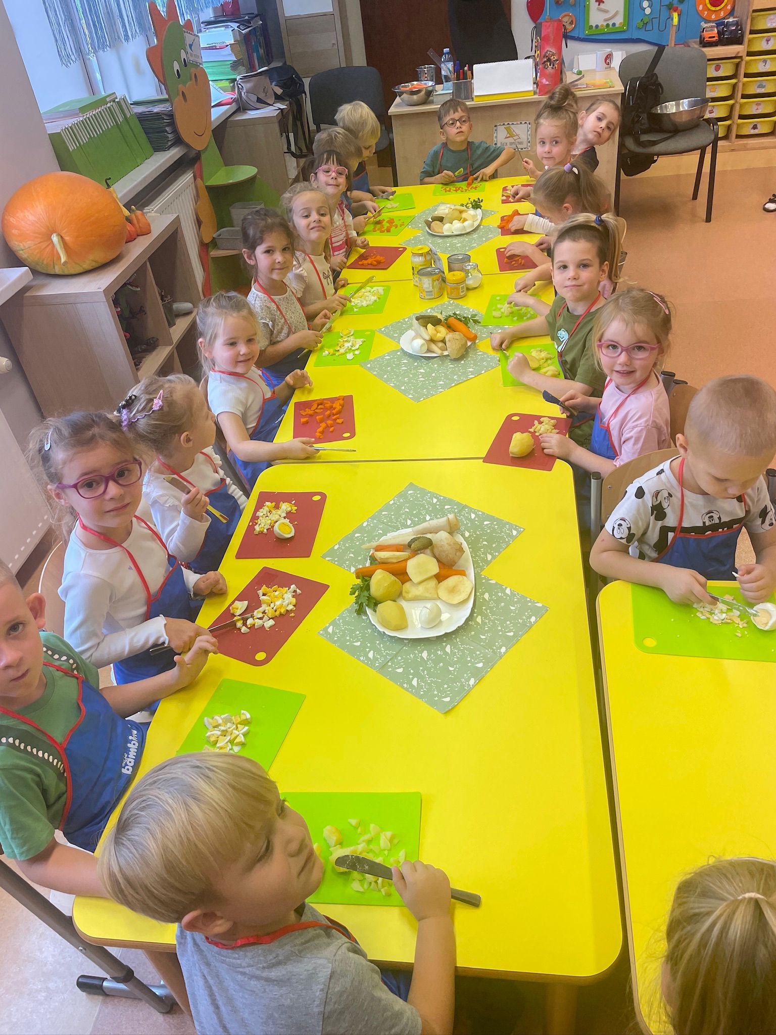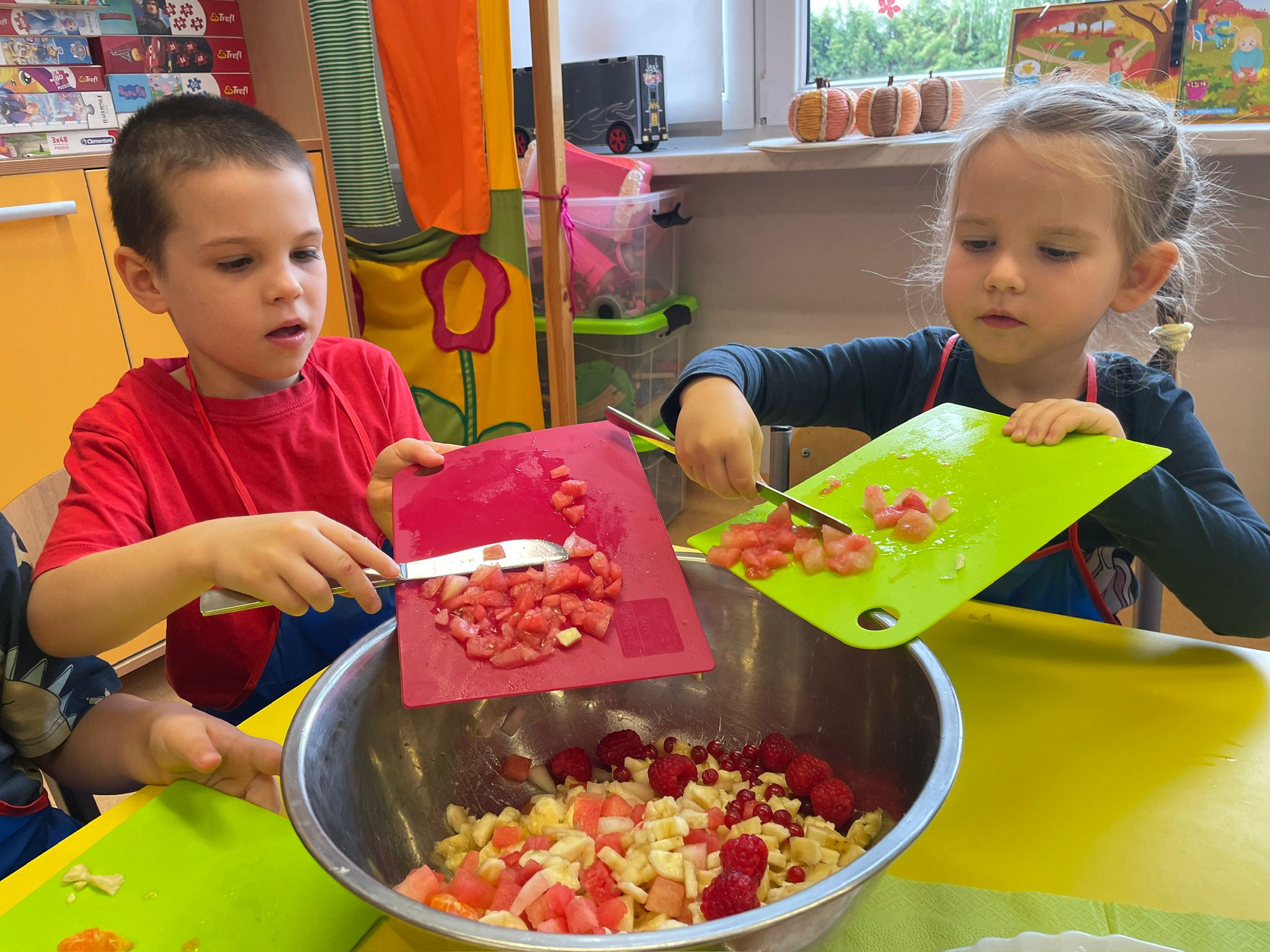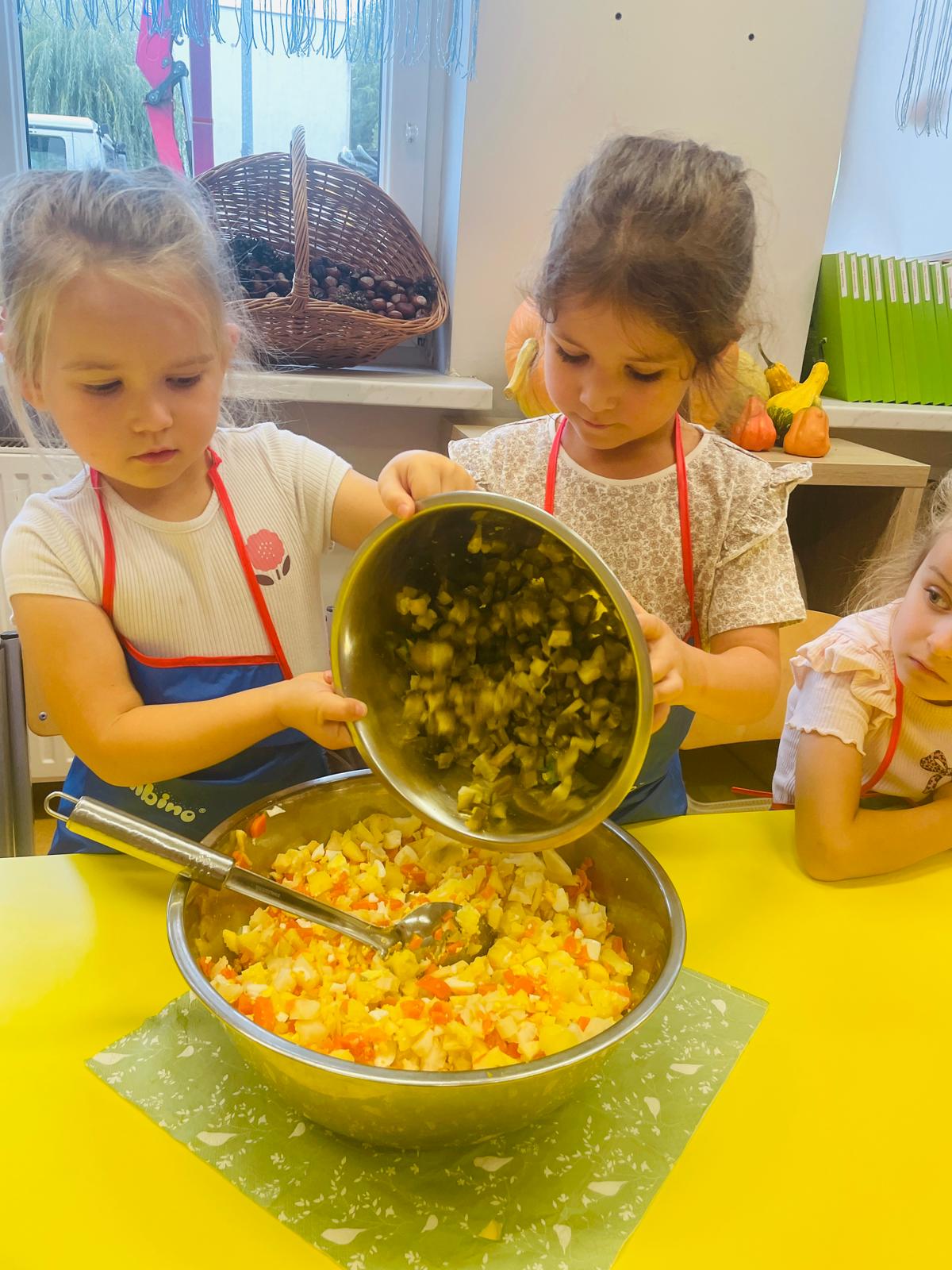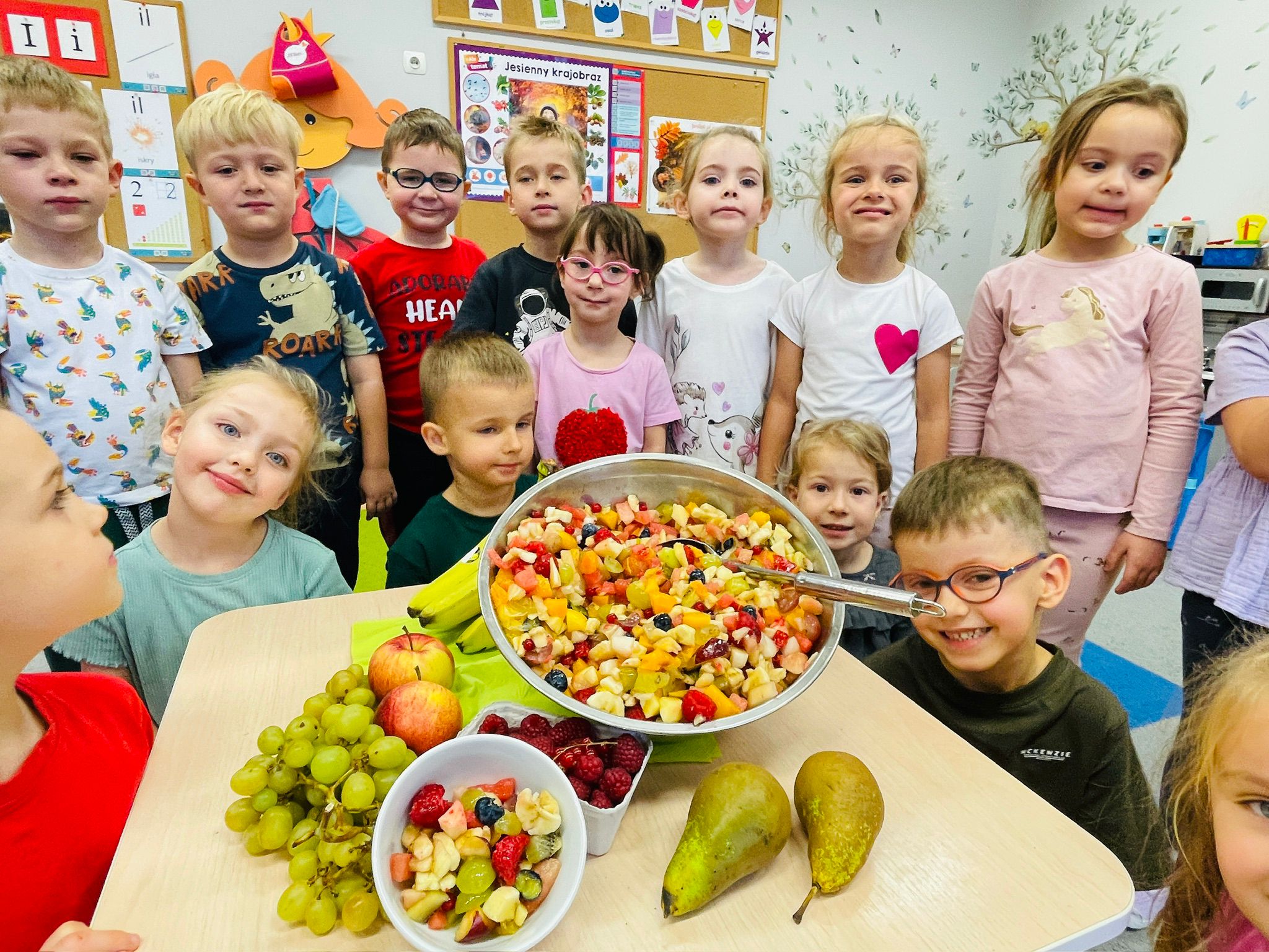 Jesień wielu kojarzy się z deszczową pogodą i szarugą. Ale w naszym przedszkolu udowodniliśmy już wiele razy, że ta pora roku potrafi być również niezwykle kolorowa. A co, jeśli kolory miałyby również smak i zapach? Realizując projekt edukacyjny „Smaki jesieni” , podczas jesiennych atrakcji kulinarnych w gr. XI przedszkolaki sprawdziły, że kolorowe warzywa i owoce, również te sezonowe, smakują i pachną wyśmienicie. Szczególnie jeśli się je ze sobą połączy. Wszyscy podkreślaliśmy walory zdrowotne owoców i warzyw. W ten oto sposób powstały zdrowe sałatki pełne pięknych barw, które przedszkolaki mogły samodzielnie spałaszować.