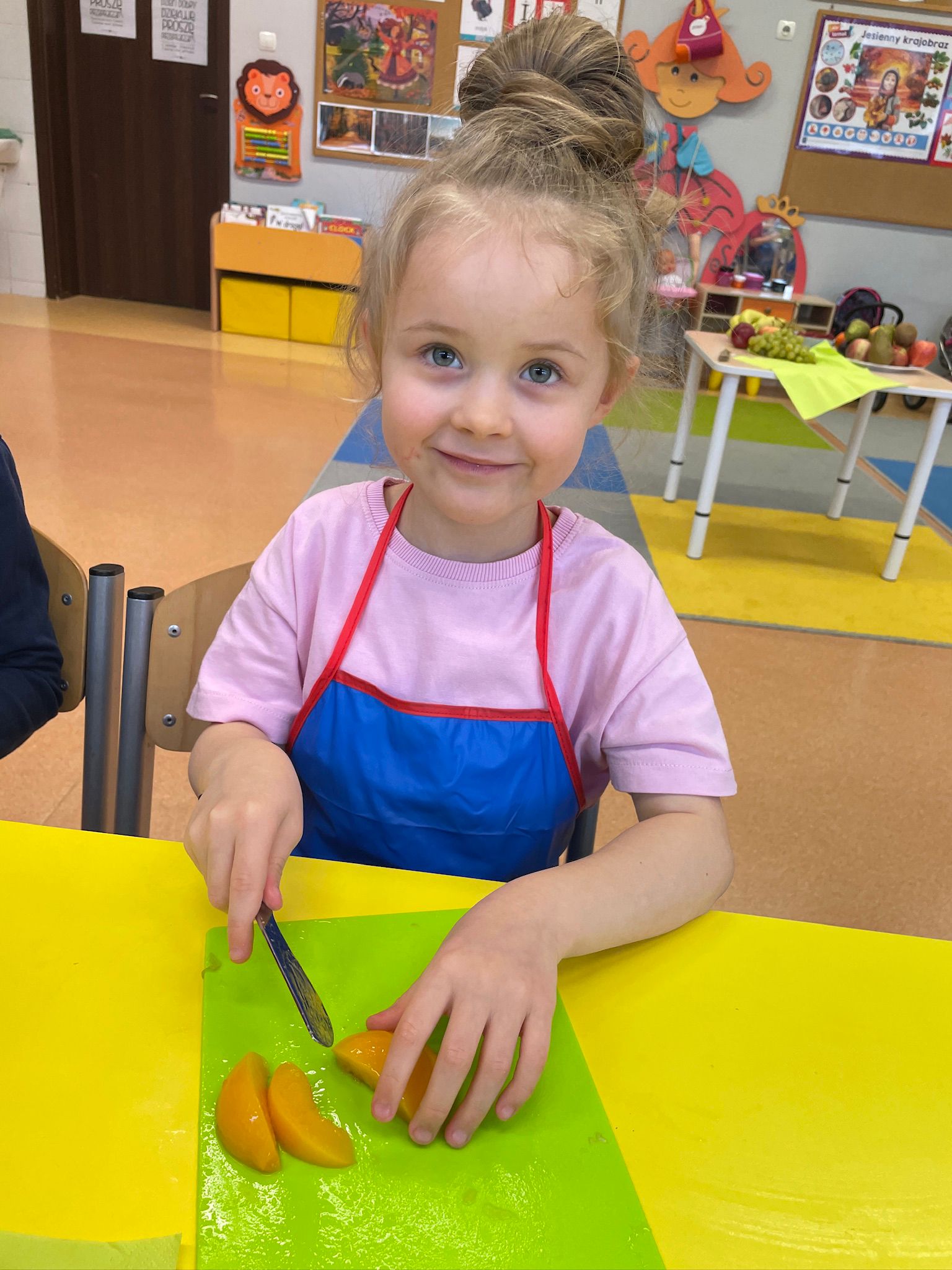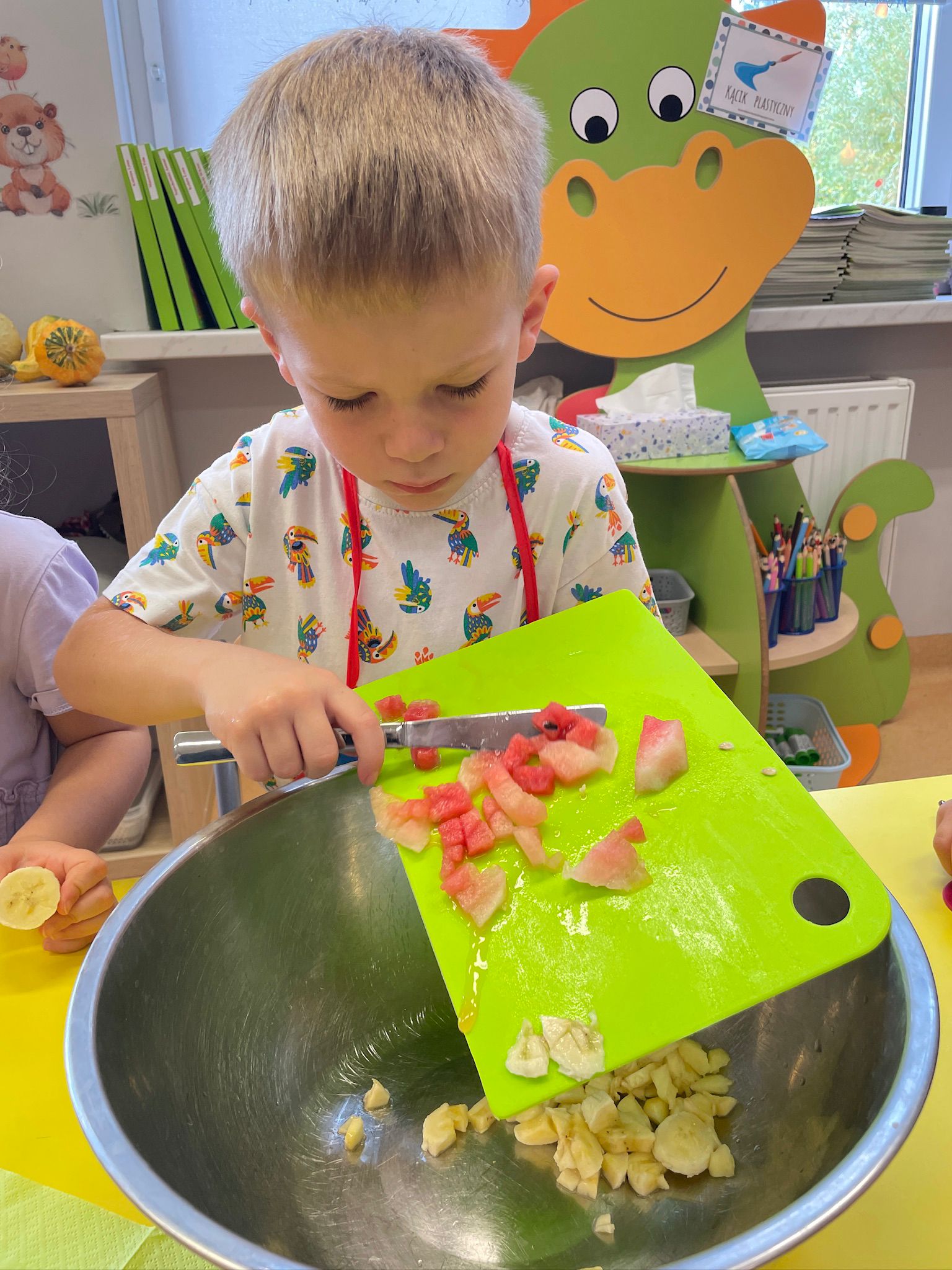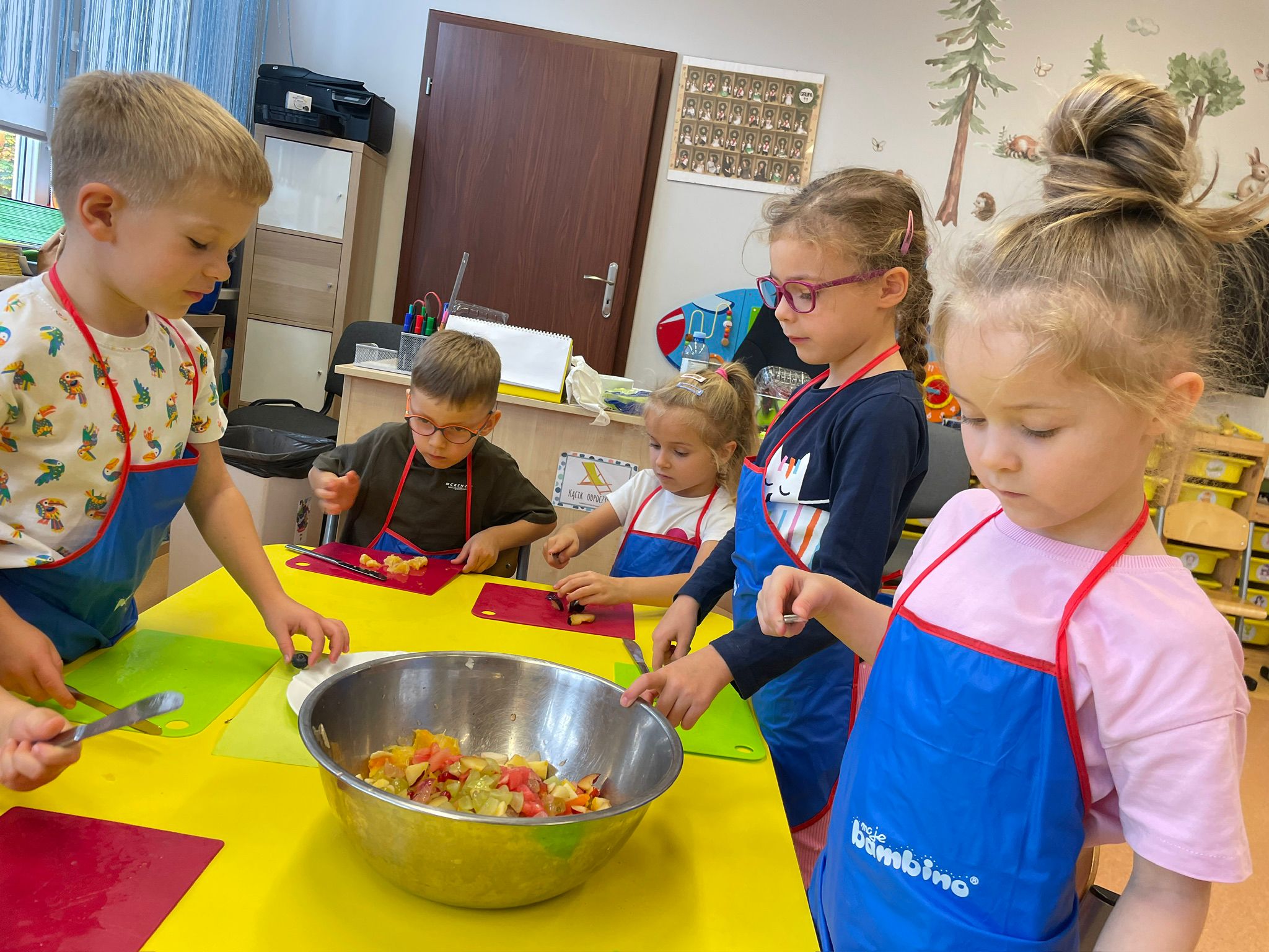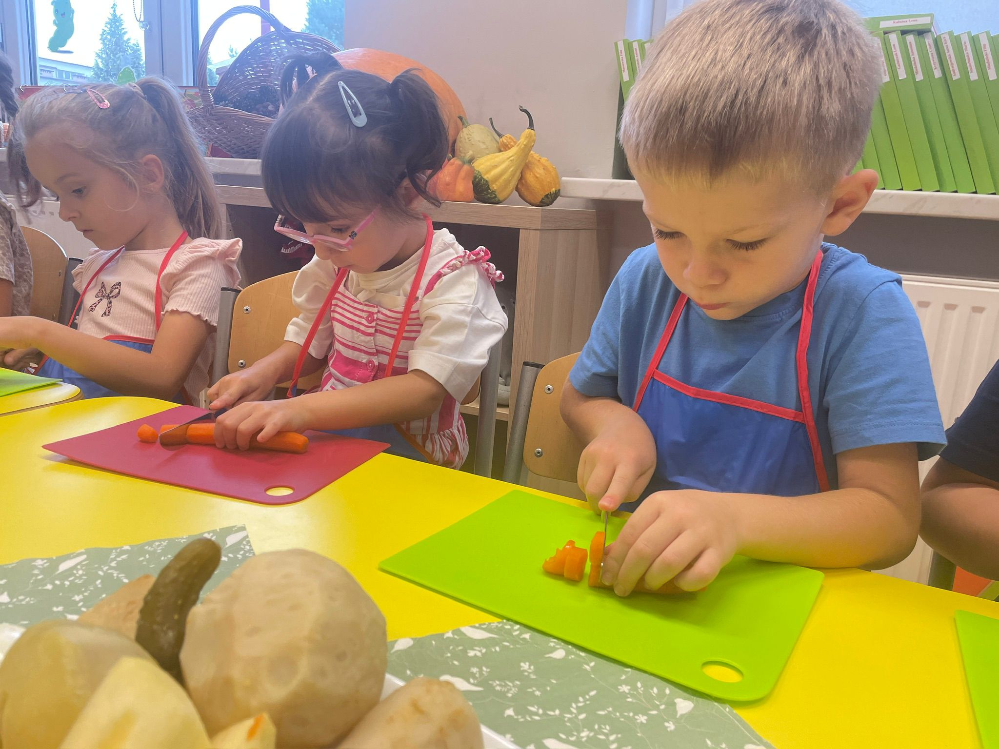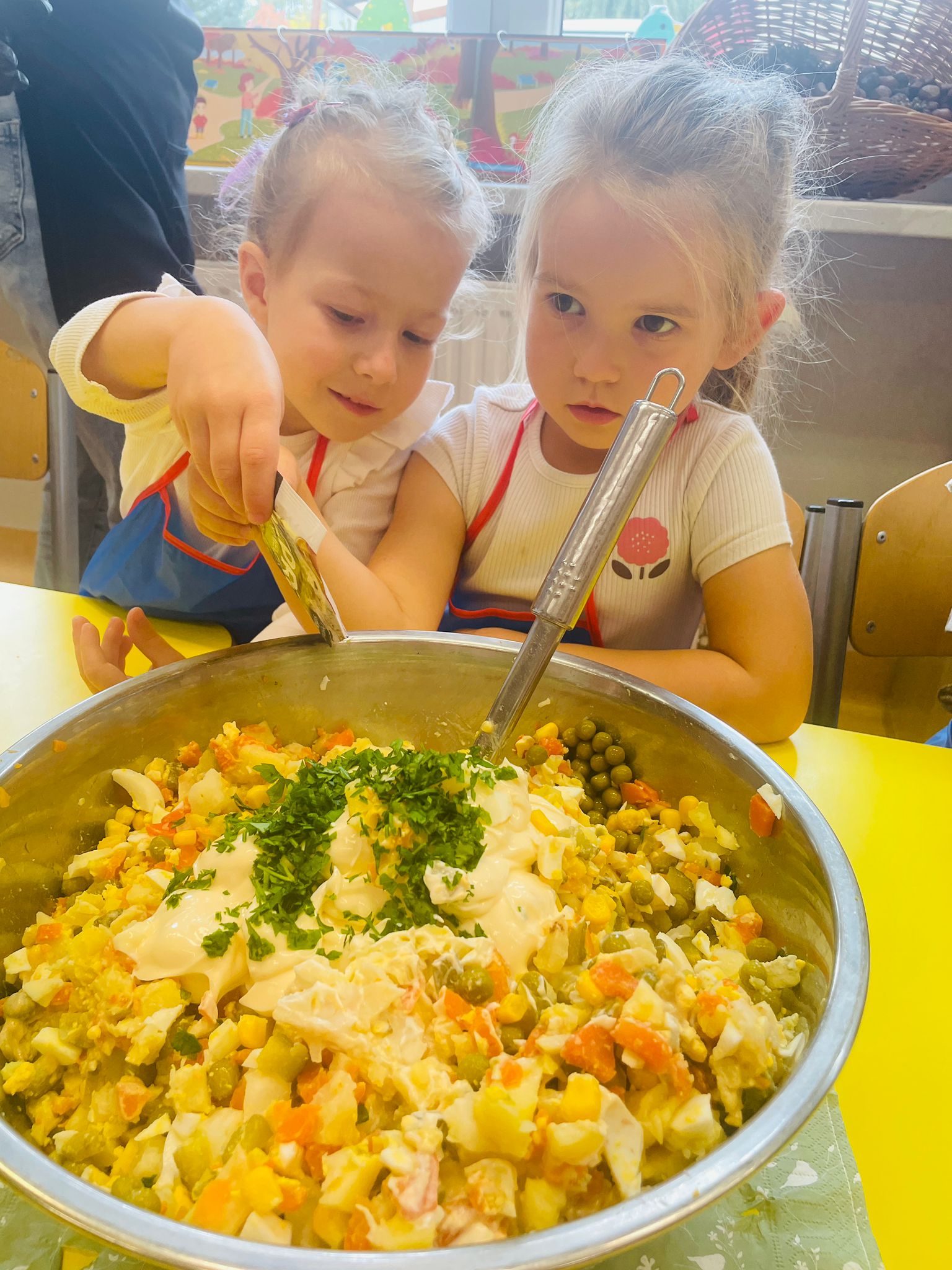 Jesień wielu kojarzy się z deszczową pogodą i szarugą. Ale w naszym przedszkolu udowodniliśmy już wiele razy, że ta pora roku potrafi być również niezwykle kolorowa. A co, jeśli kolory miałyby również smak i zapach? Realizując projekt edukacyjny „Smaki jesieni” , podczas jesiennych atrakcji kulinarnych w gr. XI przedszkolaki sprawdziły, że kolorowe warzywa i owoce, również te sezonowe, smakują i pachną wyśmienicie. Szczególnie jeśli się je ze sobą połączy. Wszyscy podkreślaliśmy walory zdrowotne owoców i warzyw. W ten oto sposób powstały zdrowe sałatki pełne pięknych barw, które przedszkolaki mogły samodzielnie spałaszować.