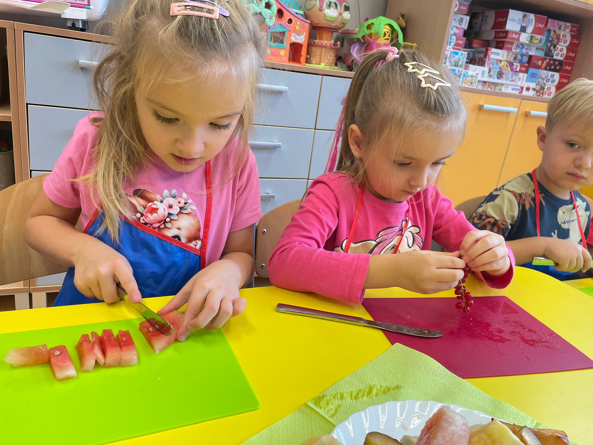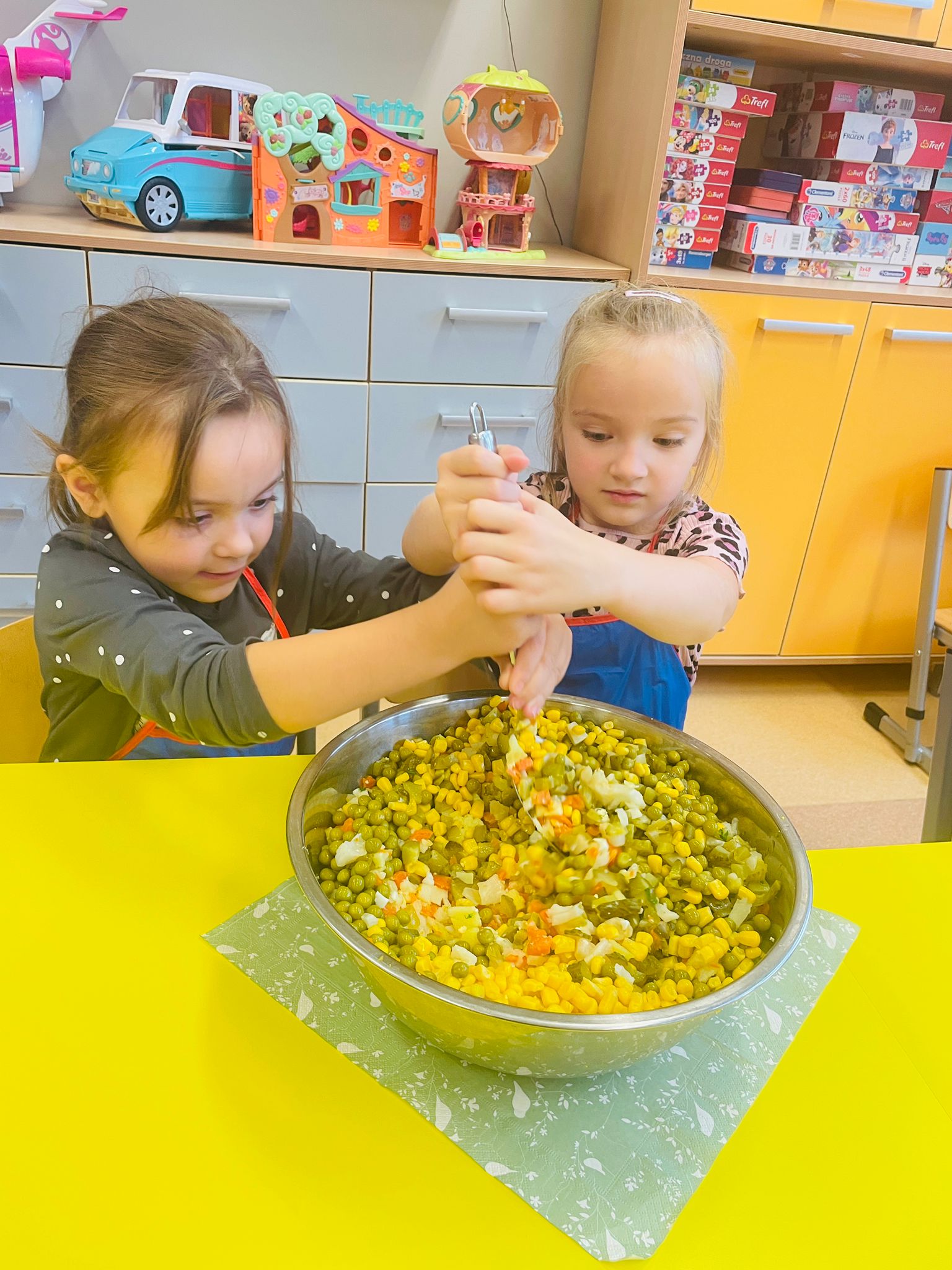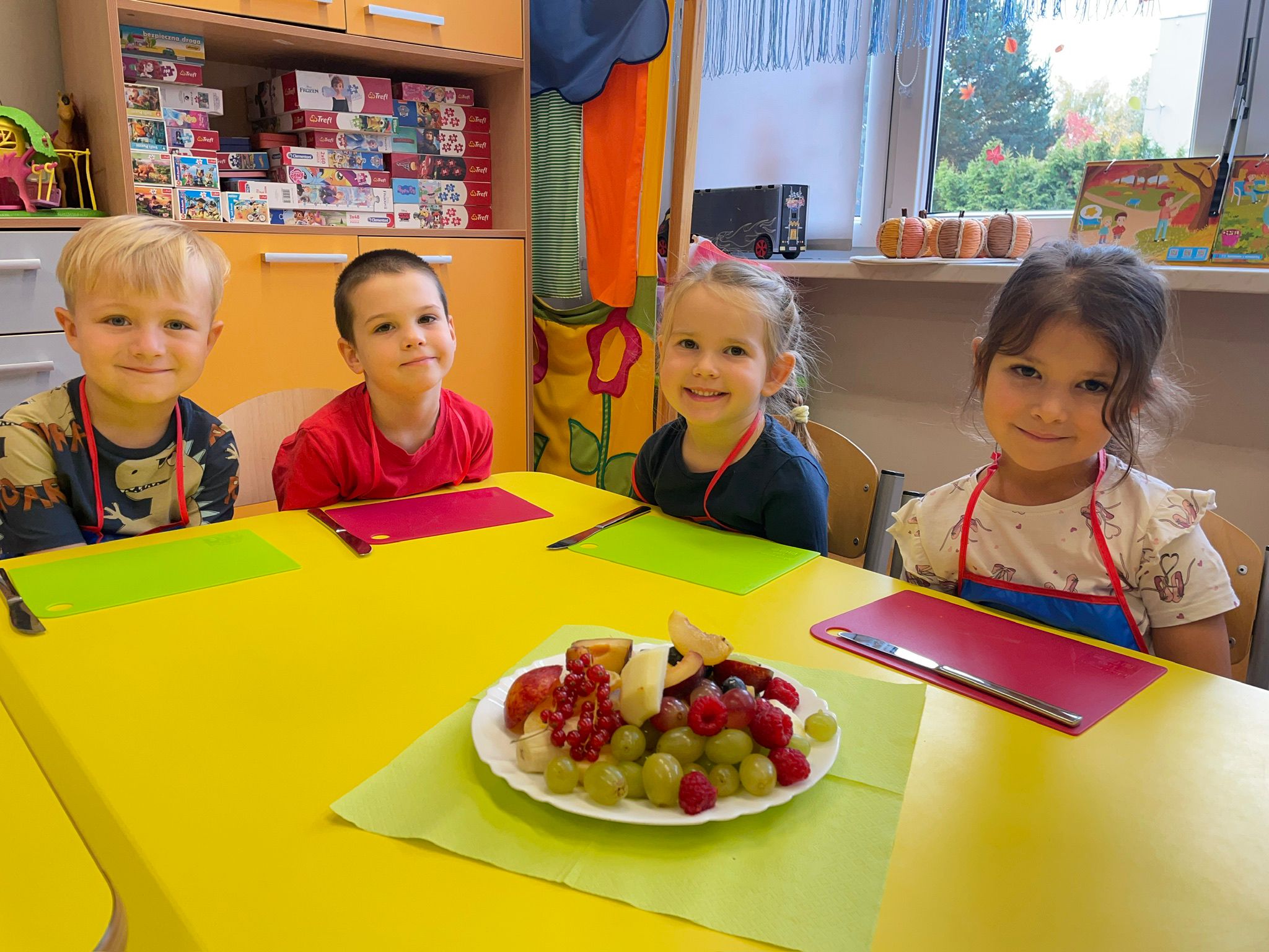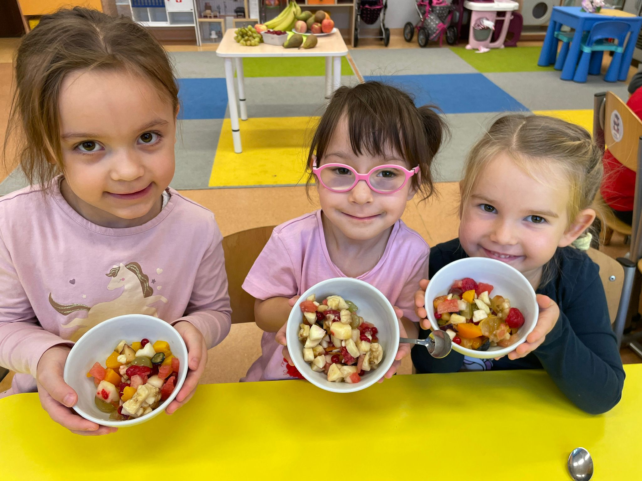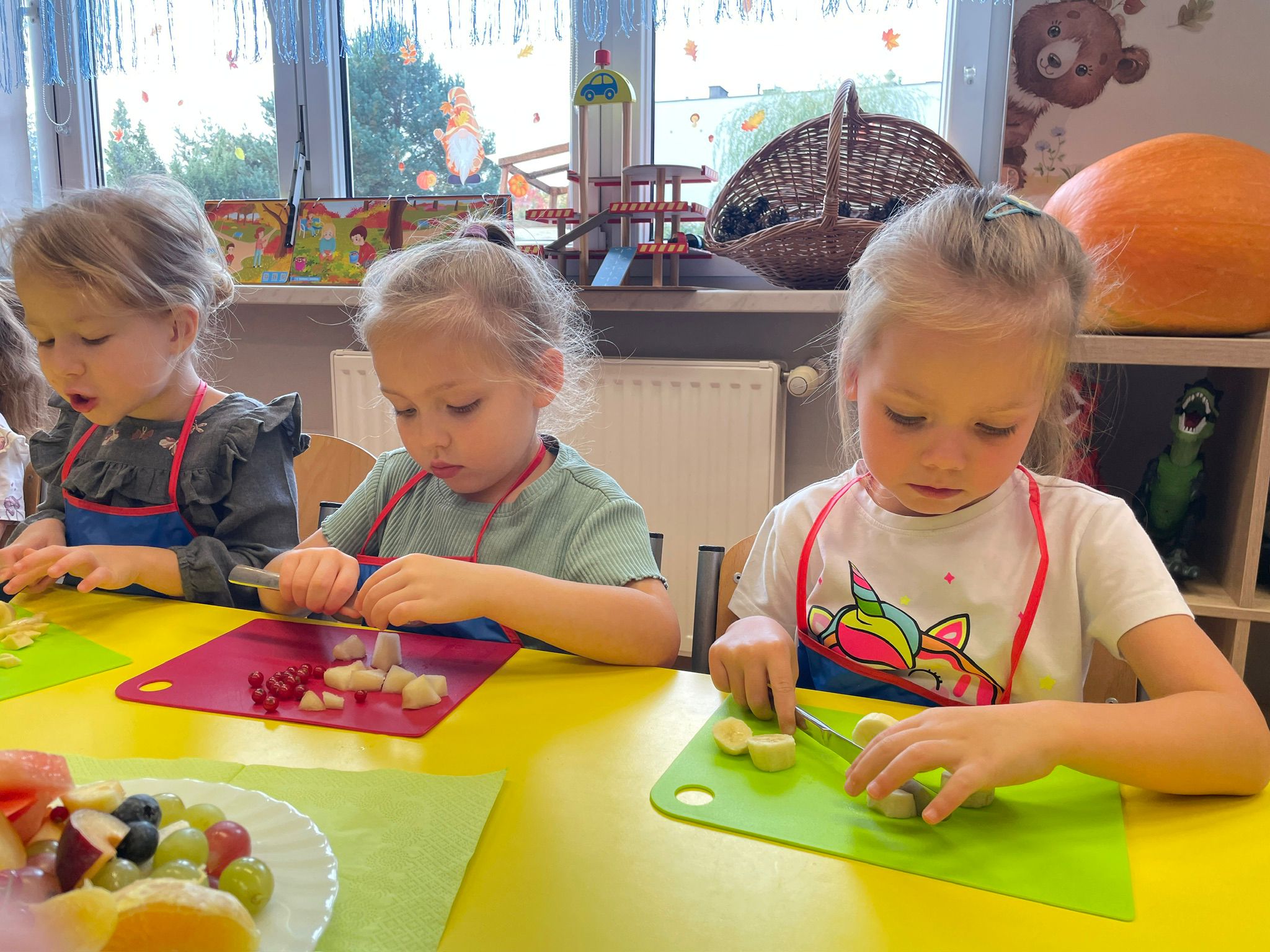 Jesień wielu kojarzy się z deszczową pogodą i szarugą. Ale w naszym przedszkolu udowodniliśmy już wiele razy, że ta pora roku potrafi być również niezwykle kolorowa. A co, jeśli kolory miałyby również smak i zapach? Realizując projekt edukacyjny „Smaki jesieni” , podczas jesiennych atrakcji kulinarnych w gr. XI przedszkolaki sprawdziły, że kolorowe warzywa i owoce, również te sezonowe, smakują i pachną wyśmienicie. Szczególnie jeśli się je ze sobą połączy. Wszyscy podkreślaliśmy walory zdrowotne owoców i warzyw. W ten oto sposób powstały zdrowe sałatki pełne pięknych barw, które przedszkolaki mogły samodzielnie spałaszować.