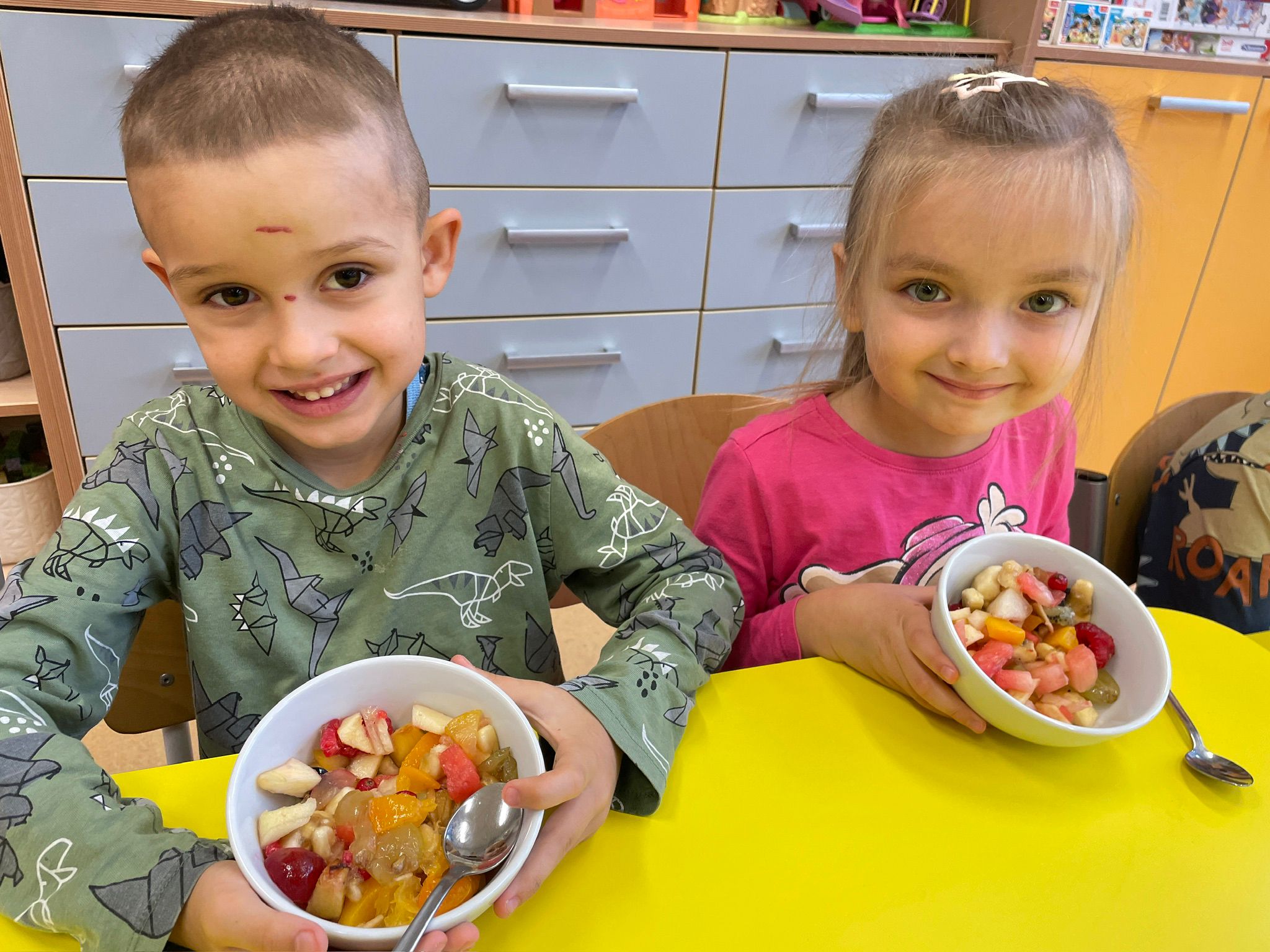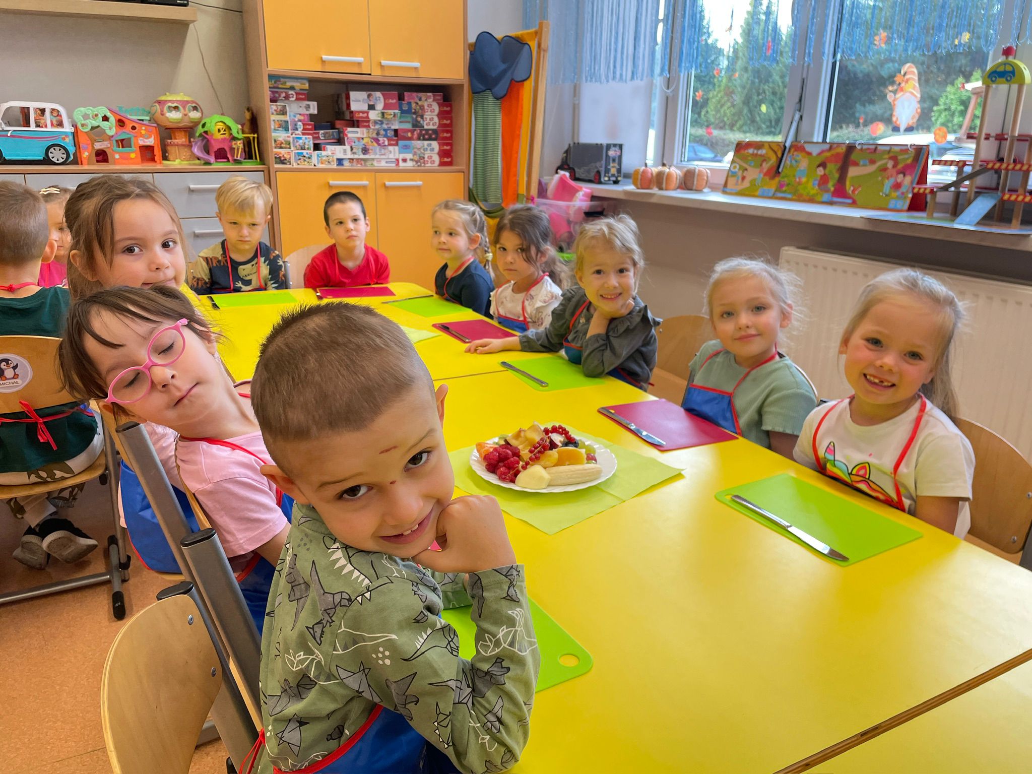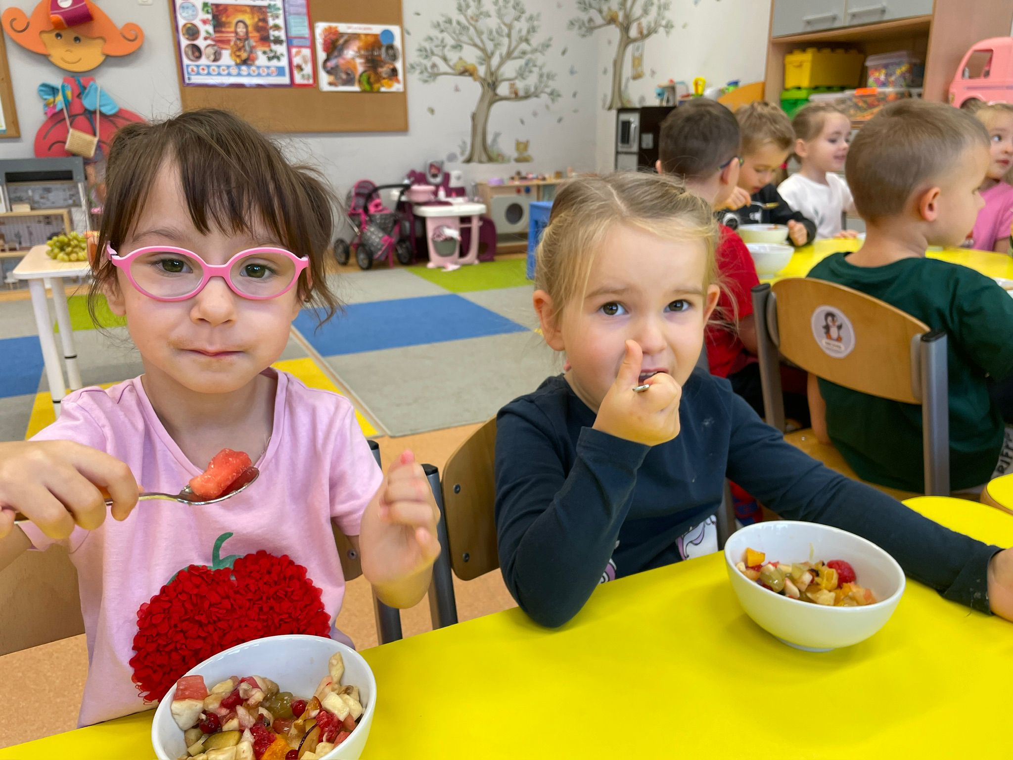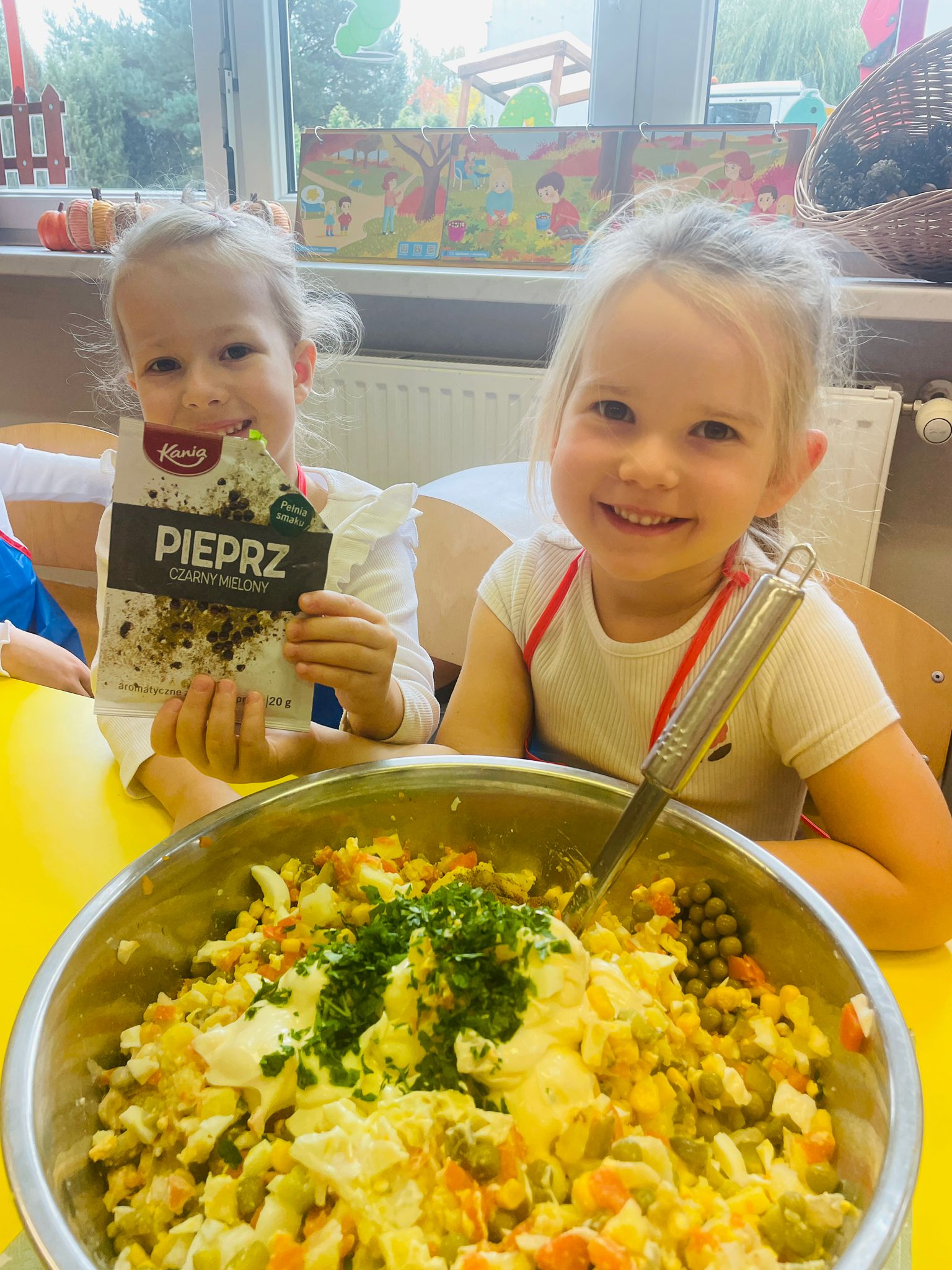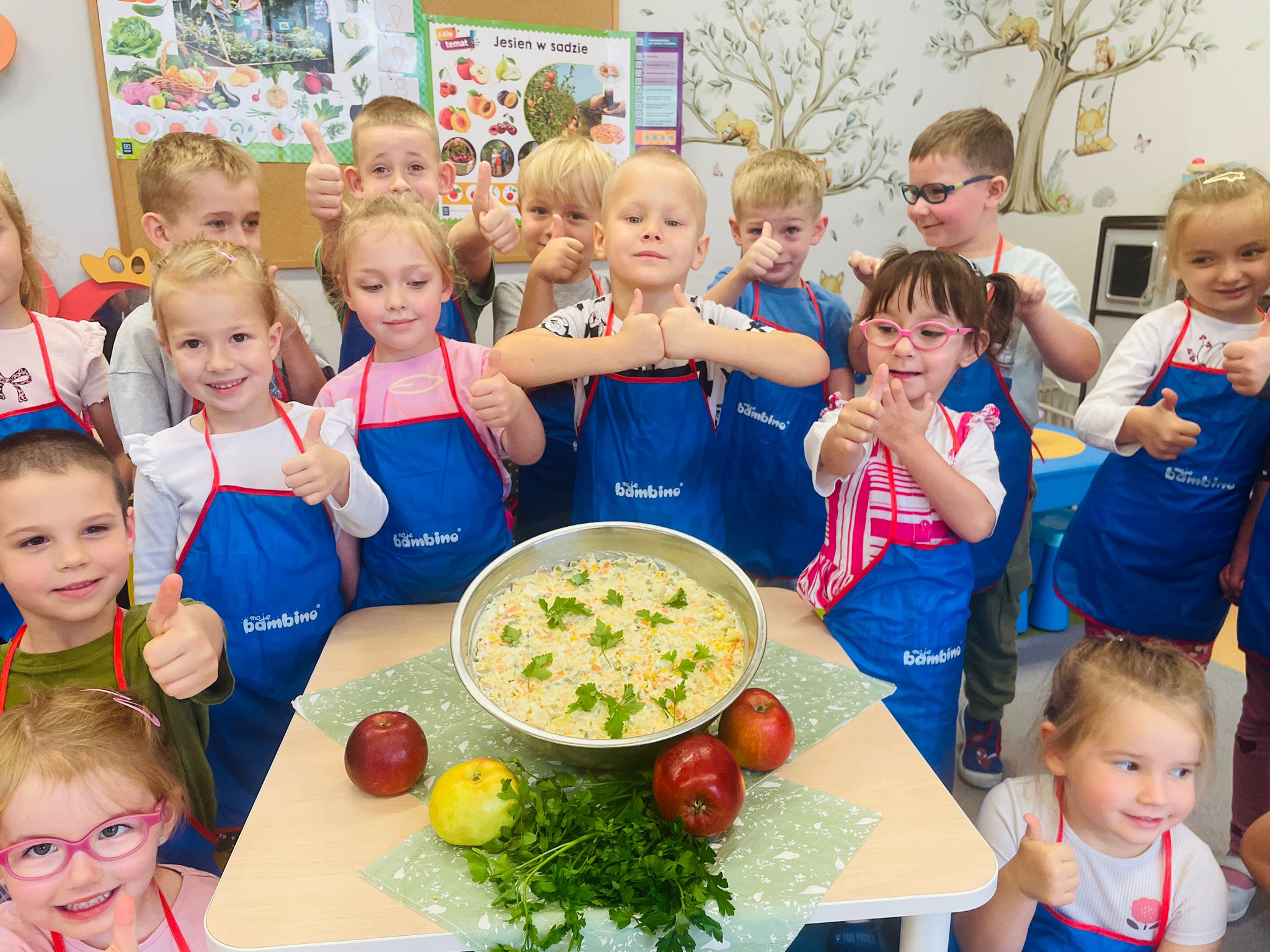 Jesień wielu kojarzy się z deszczową pogodą i szarugą. Ale w naszym przedszkolu udowodniliśmy już wiele razy, że ta pora roku potrafi być również niezwykle kolorowa. A co, jeśli kolory miałyby również smak i zapach? Realizując projekt edukacyjny „Smaki jesieni” , podczas jesiennych atrakcji kulinarnych w gr. XI przedszkolaki sprawdziły, że kolorowe warzywa i owoce, również te sezonowe, smakują i pachną wyśmienicie. Szczególnie jeśli się je ze sobą połączy. Wszyscy podkreślaliśmy walory zdrowotne owoców i warzyw. W ten oto sposób powstały zdrowe sałatki pełne pięknych barw, które przedszkolaki mogły samodzielnie spałaszować.