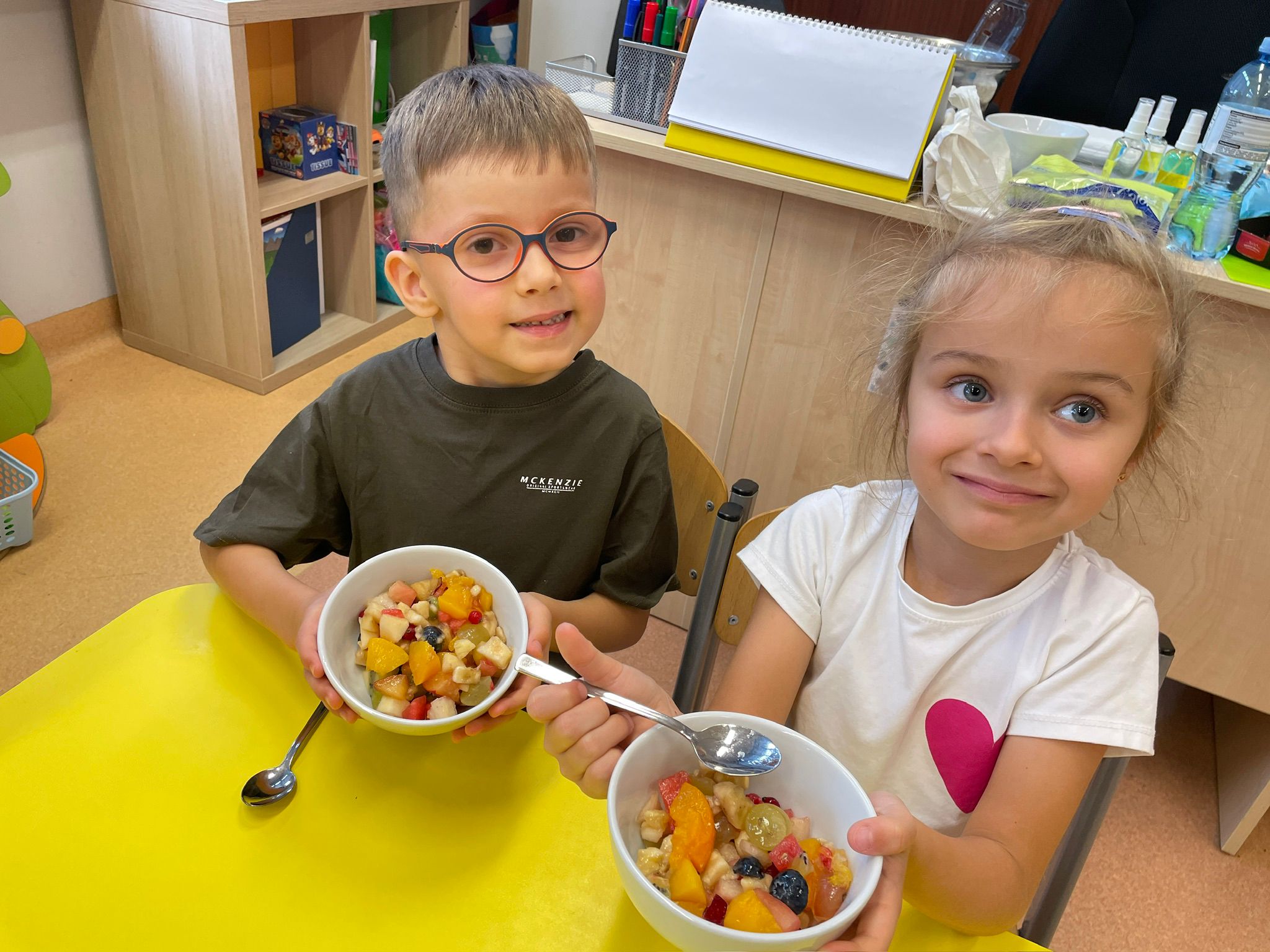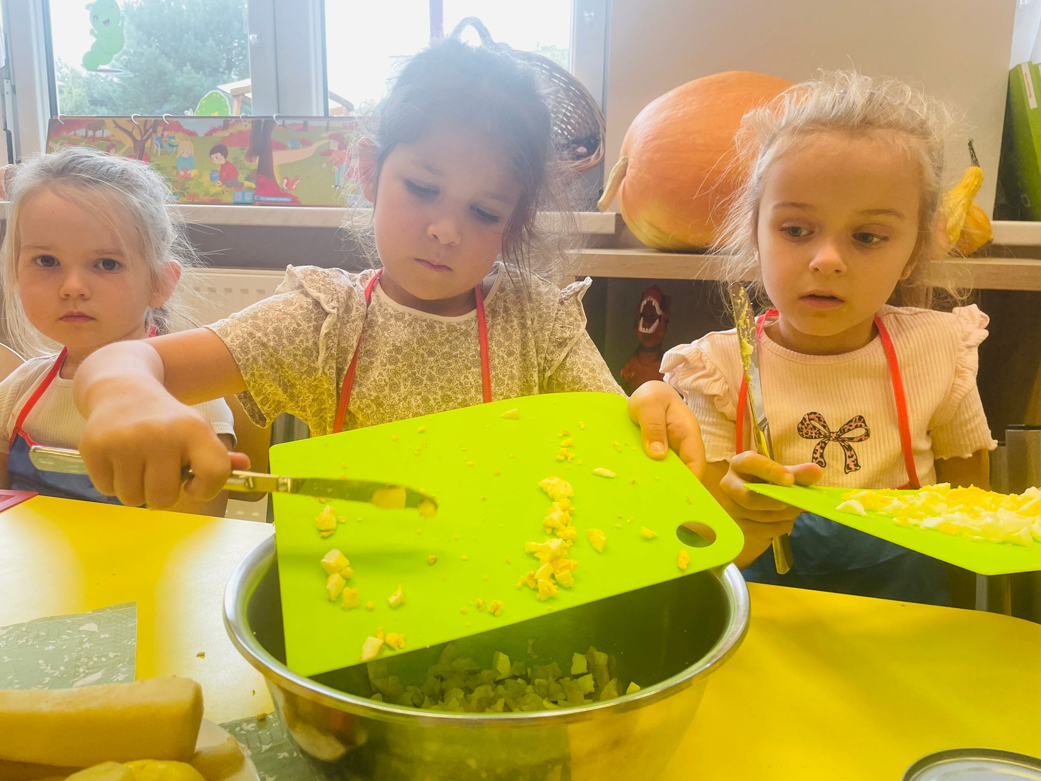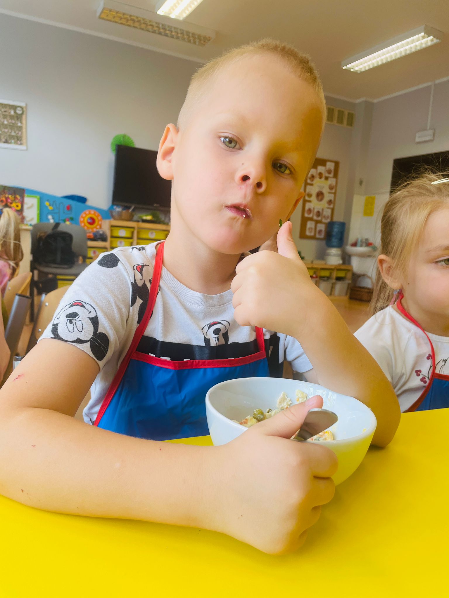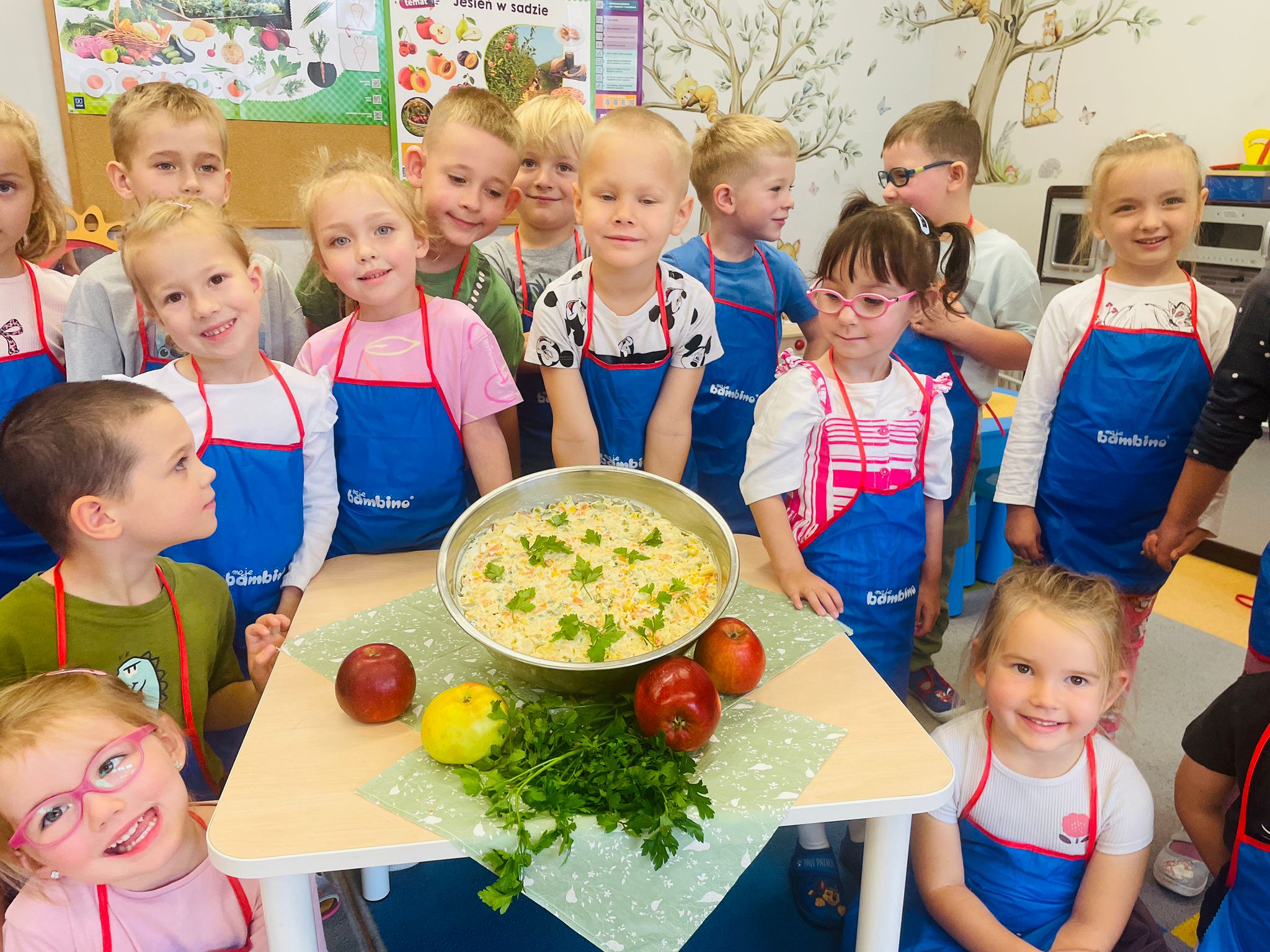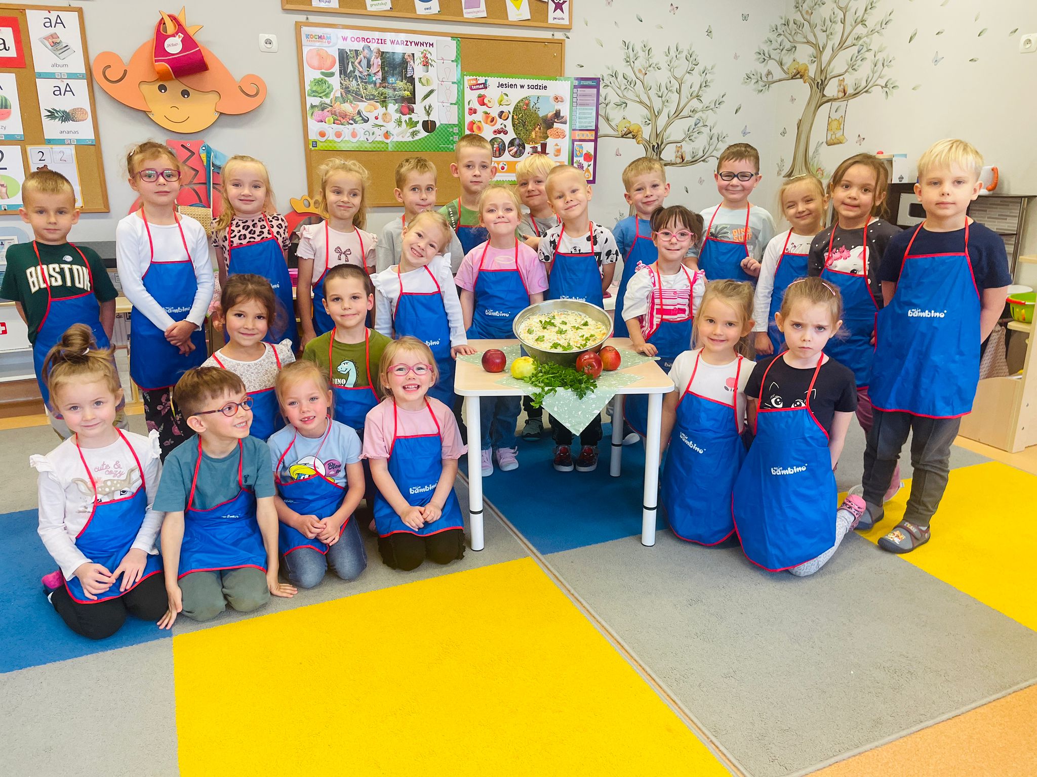 Jesień wielu kojarzy się z deszczową pogodą i szarugą. Ale w naszym przedszkolu udowodniliśmy już wiele razy, że ta pora roku potrafi być również niezwykle kolorowa. A co, jeśli kolory miałyby również smak i zapach? Realizując projekt edukacyjny „Smaki jesieni” , podczas jesiennych atrakcji kulinarnych w gr. XI przedszkolaki sprawdziły, że kolorowe warzywa i owoce, również te sezonowe, smakują i pachną wyśmienicie. Szczególnie jeśli się je ze sobą połączy. Wszyscy podkreślaliśmy walory zdrowotne owoców i warzyw. W ten oto sposób powstały zdrowe sałatki pełne pięknych barw, które przedszkolaki mogły samodzielnie spałaszować.