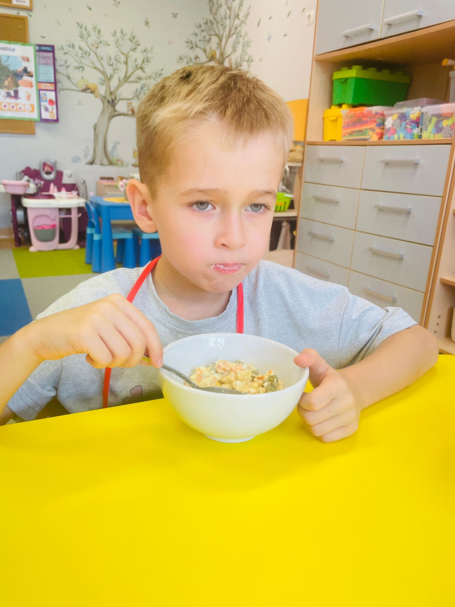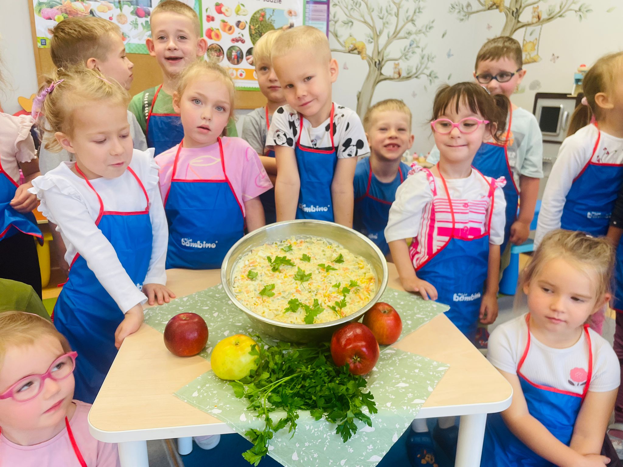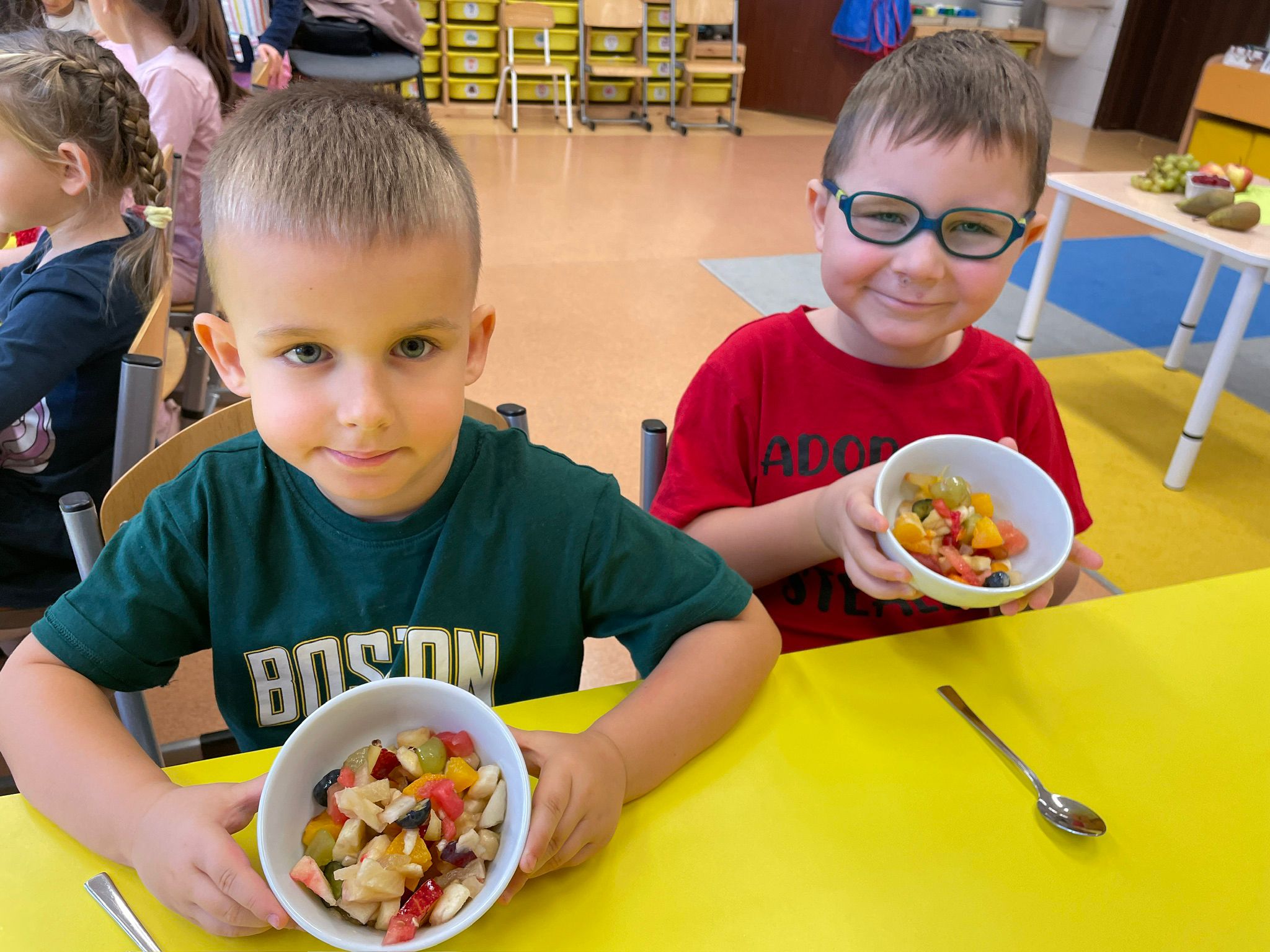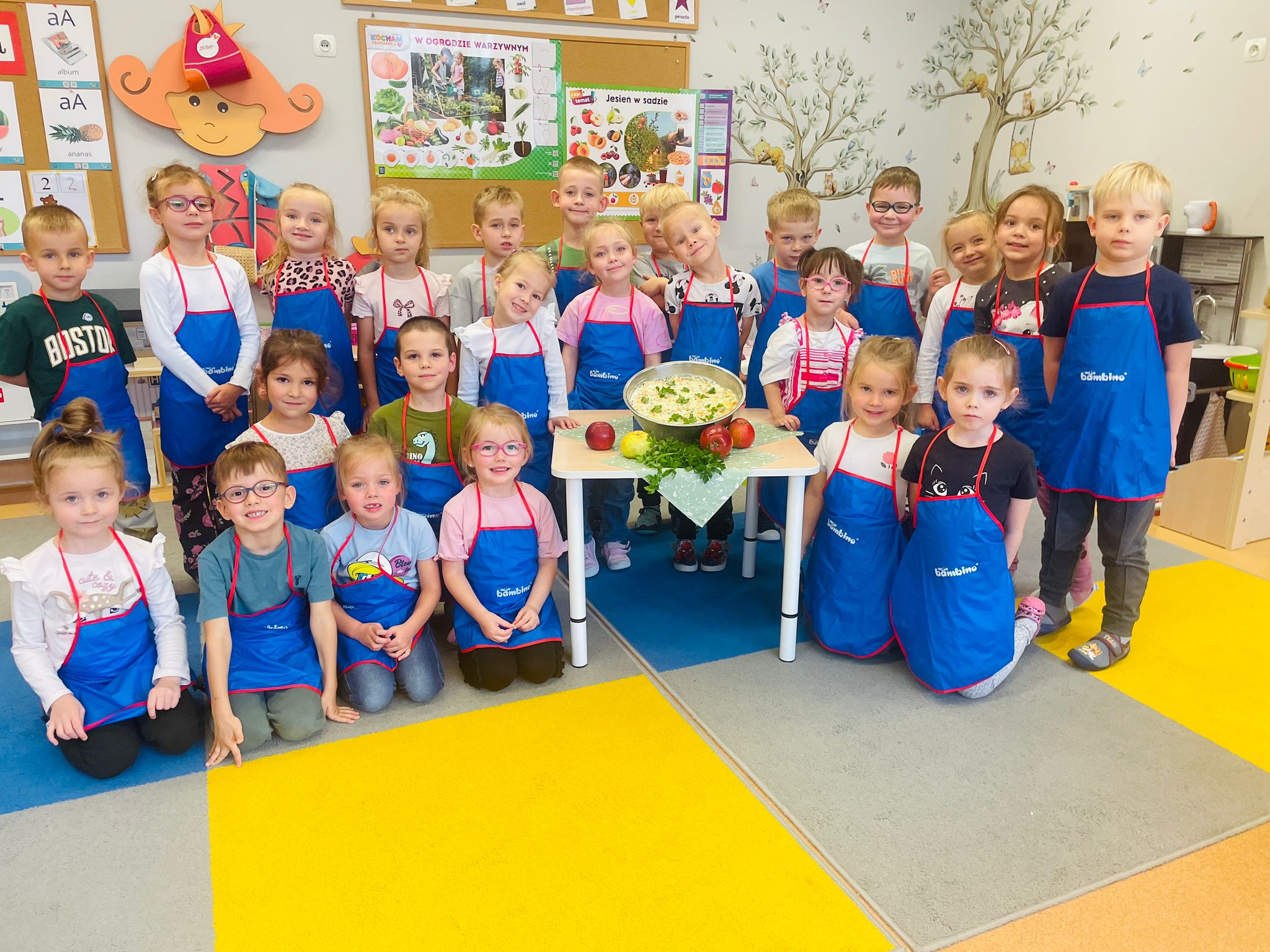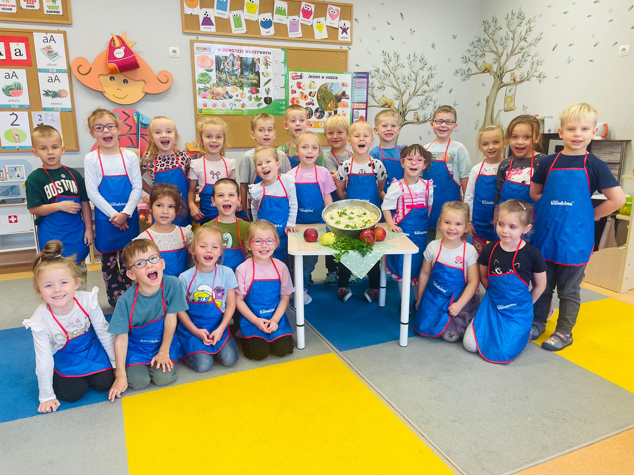 Jesień wielu kojarzy się z deszczową pogodą i szarugą. Ale w naszym przedszkolu udowodniliśmy już wiele razy, że ta pora roku potrafi być również niezwykle kolorowa. A co, jeśli kolory miałyby również smak i zapach? Realizując projekt edukacyjny „Smaki jesieni” , podczas jesiennych atrakcji kulinarnych w gr. XI przedszkolaki sprawdziły, że kolorowe warzywa i owoce, również te sezonowe, smakują i pachną wyśmienicie. Szczególnie jeśli się je ze sobą połączy. Wszyscy podkreślaliśmy walory zdrowotne owoców i warzyw. W ten oto sposób powstały zdrowe sałatki pełne pięknych barw, które przedszkolaki mogły samodzielnie spałaszować.