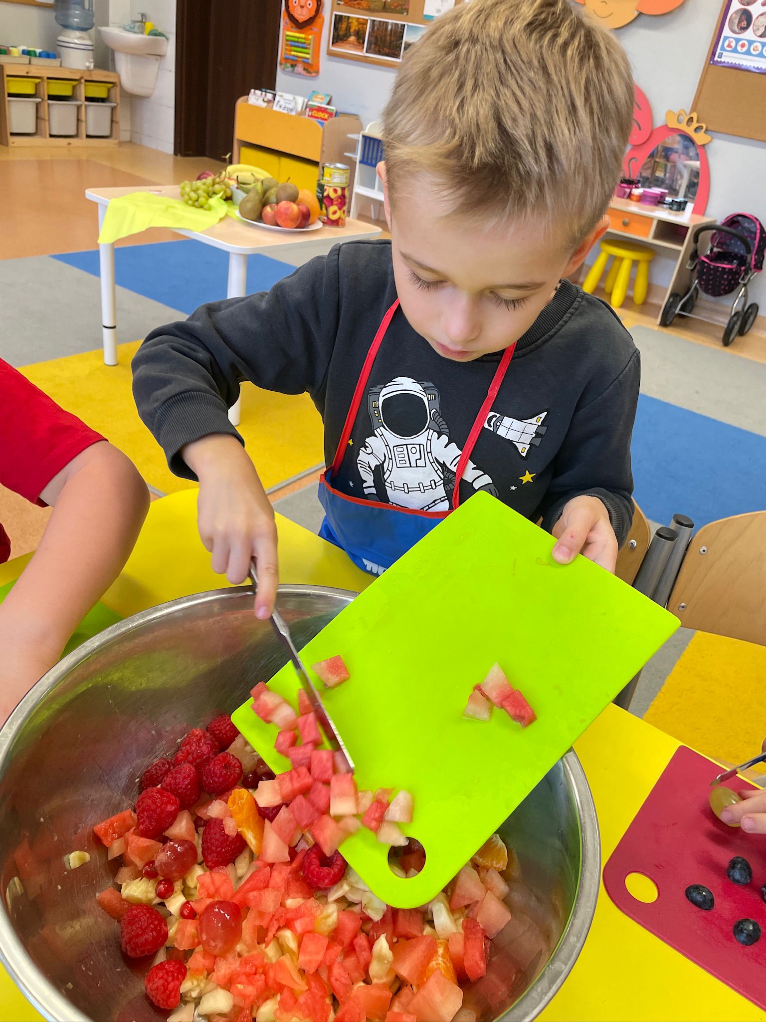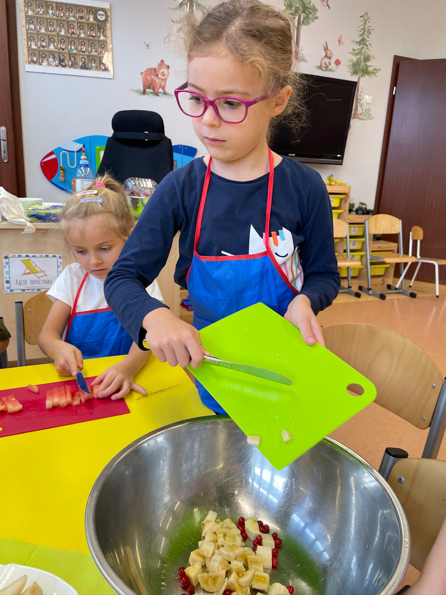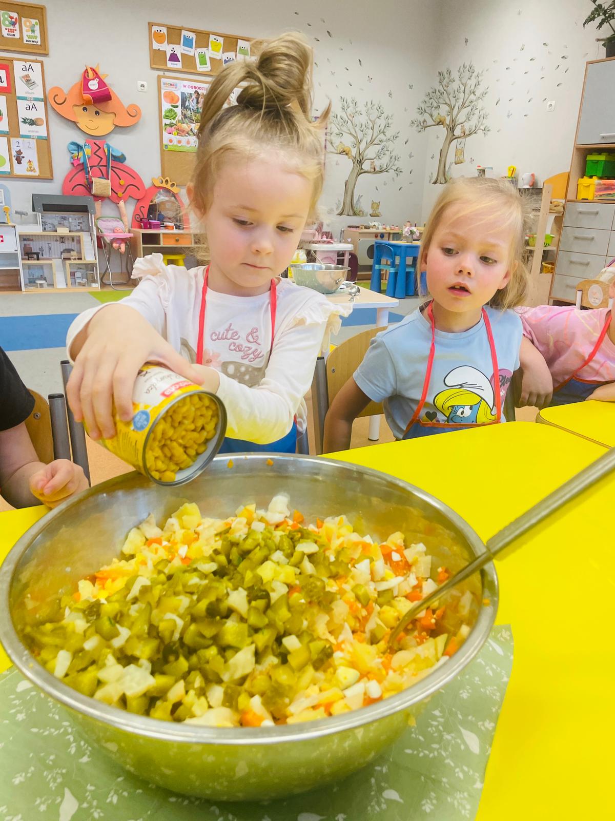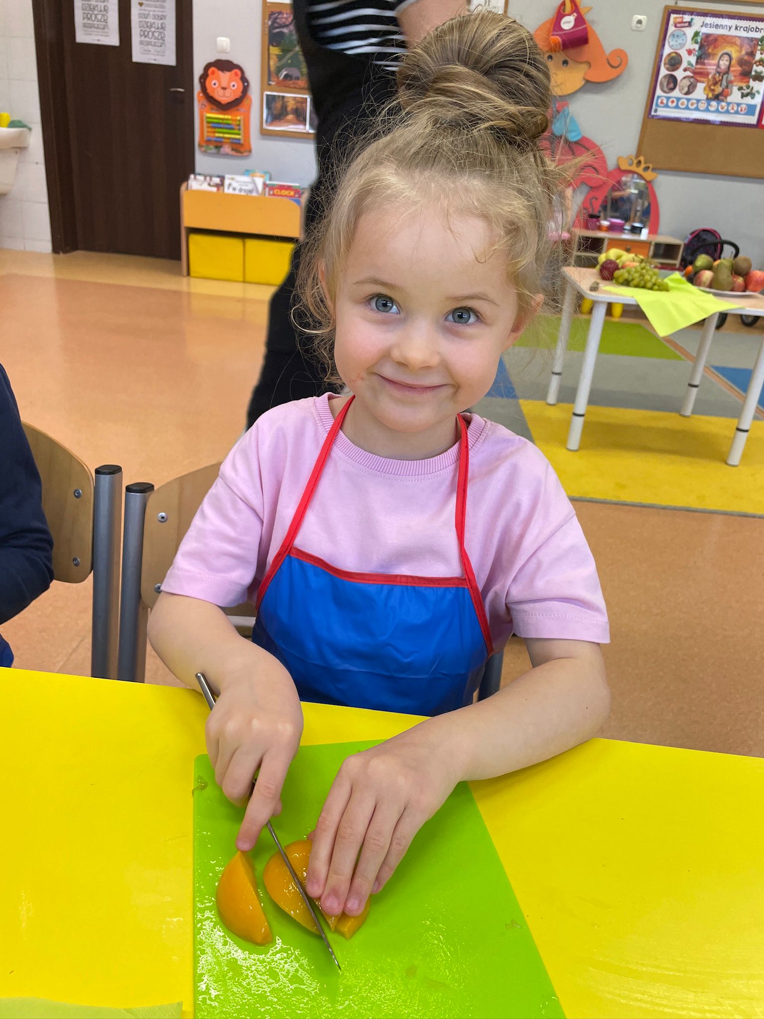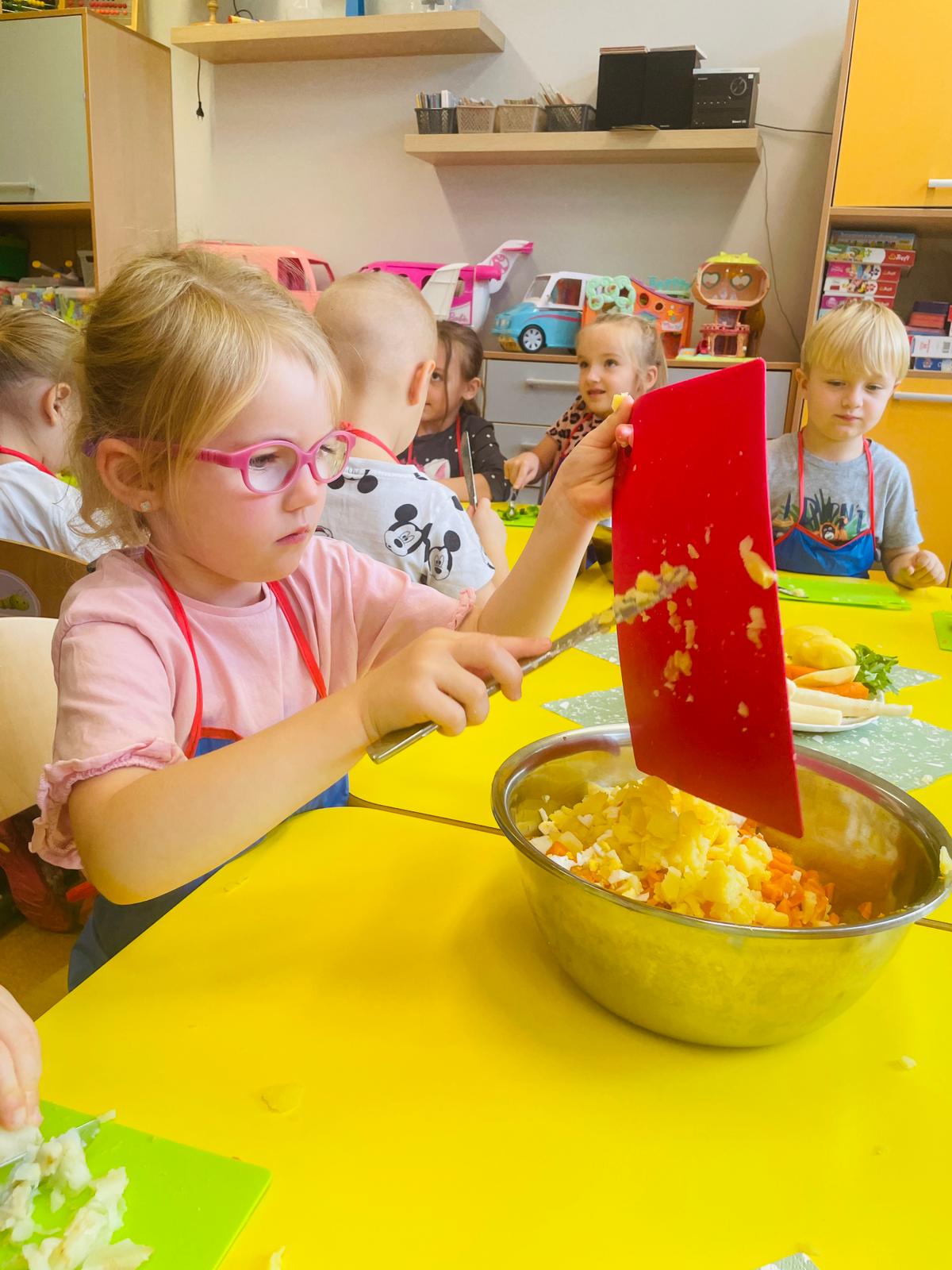 Jesień wielu kojarzy się z deszczową pogodą i szarugą. Ale w naszym przedszkolu udowodniliśmy już wiele razy, że ta pora roku potrafi być również niezwykle kolorowa. A co, jeśli kolory miałyby również smak i zapach? Realizując projekt edukacyjny „Smaki jesieni” , podczas jesiennych atrakcji kulinarnych w gr. XI przedszkolaki sprawdziły, że kolorowe warzywa i owoce, również te sezonowe, smakują i pachną wyśmienicie. Szczególnie jeśli się je ze sobą połączy. Wszyscy podkreślaliśmy walory zdrowotne owoców i warzyw. W ten oto sposób powstały zdrowe sałatki pełne pięknych barw, które przedszkolaki mogły samodzielnie spałaszować.