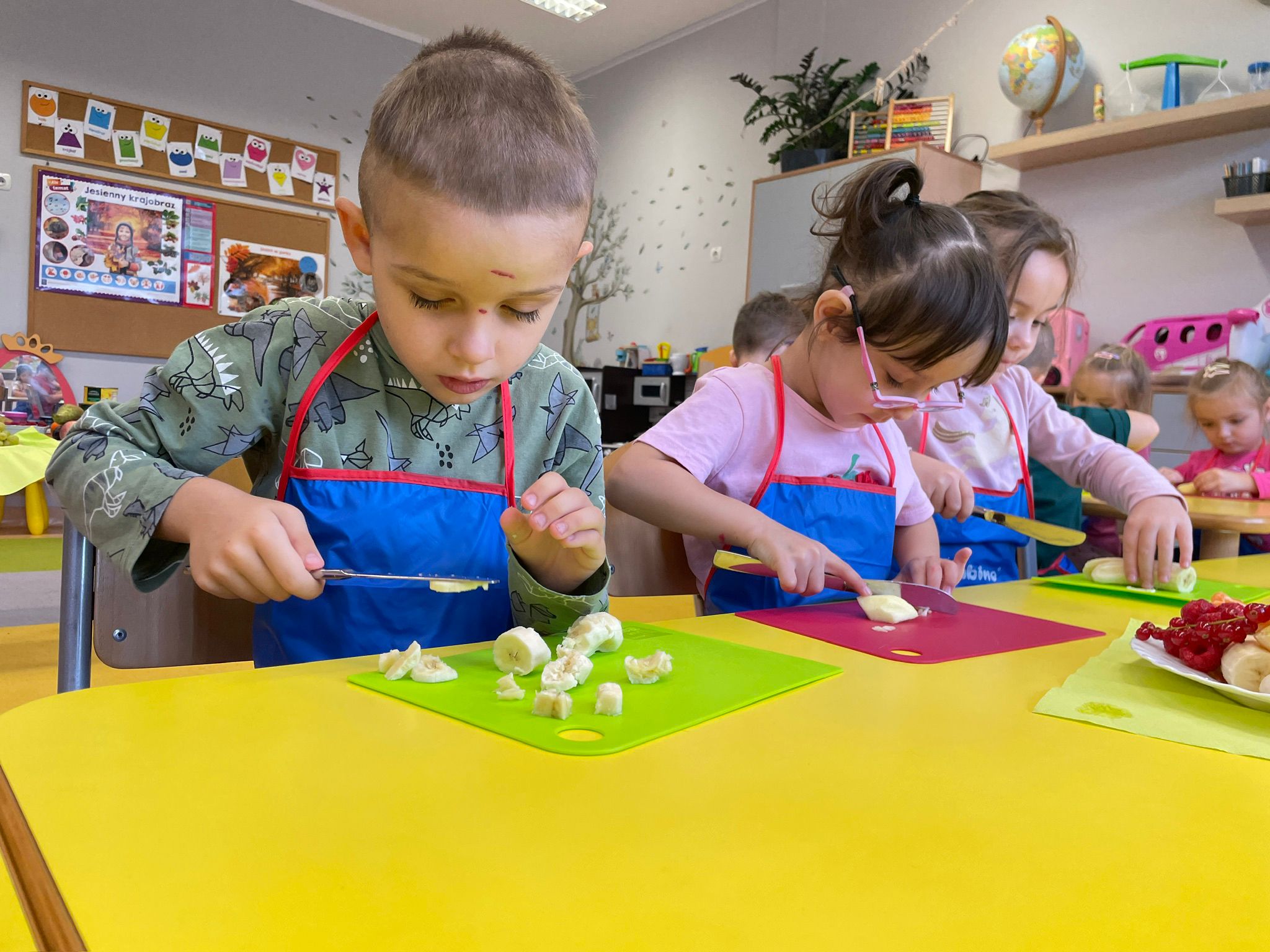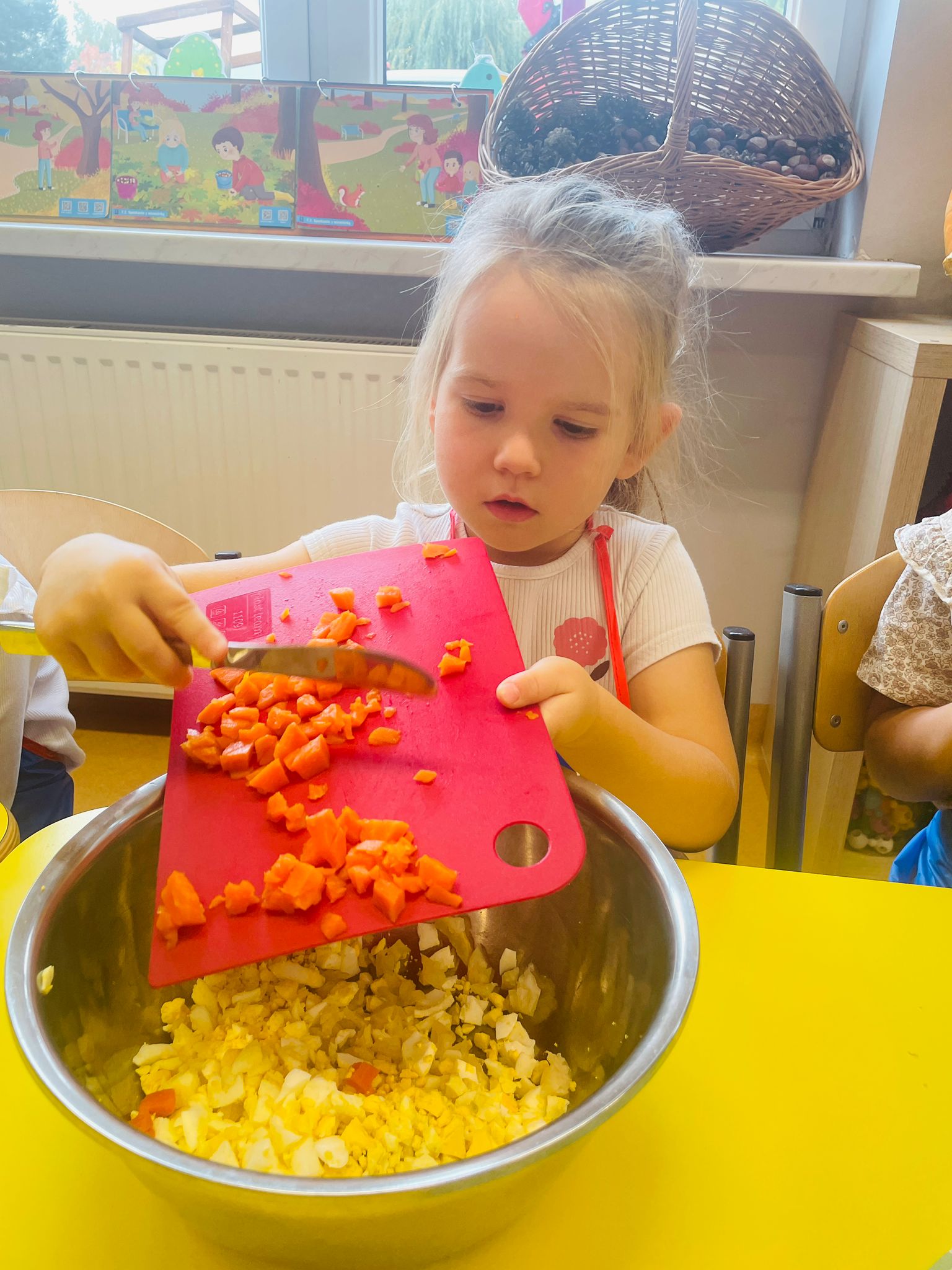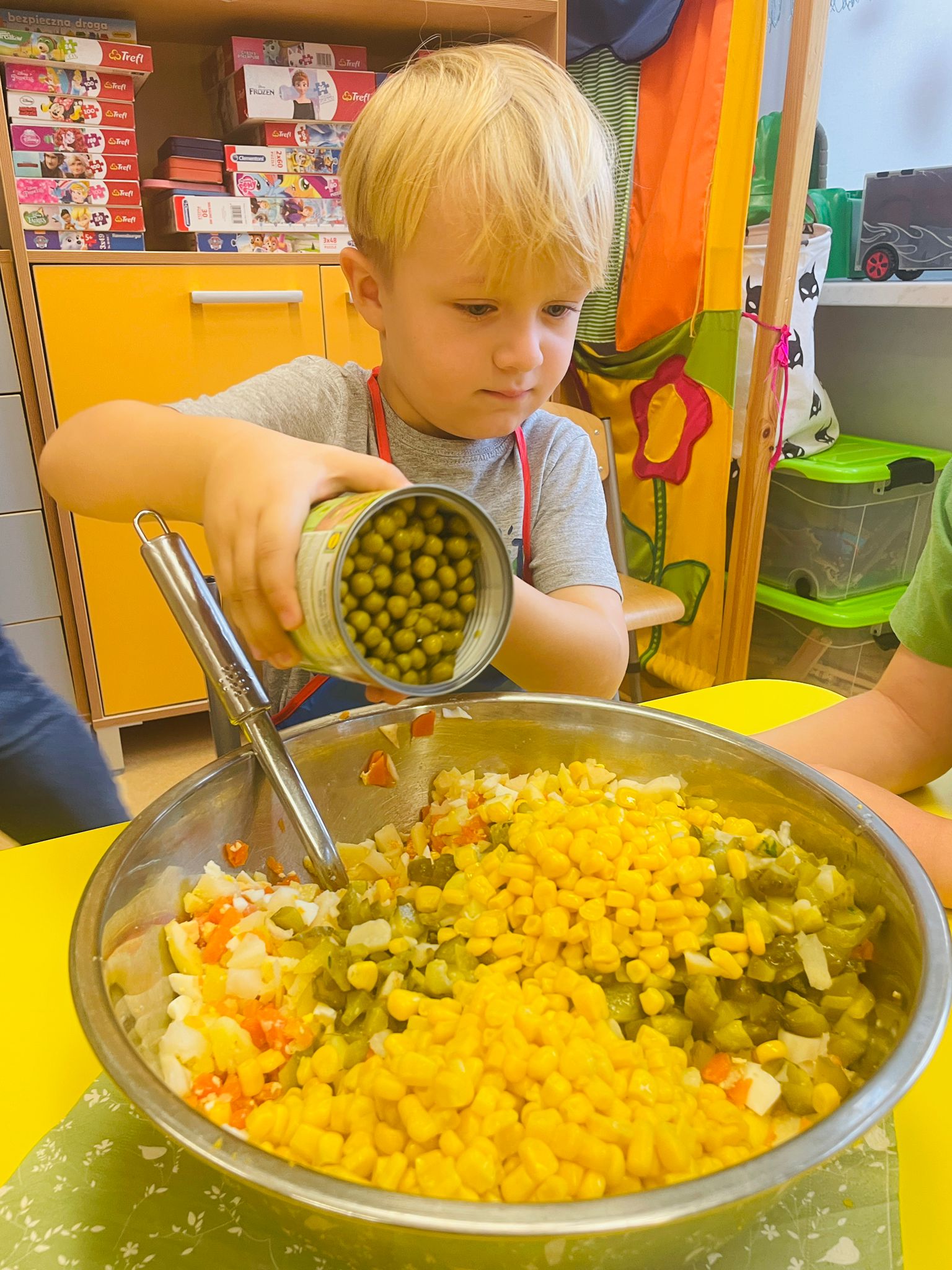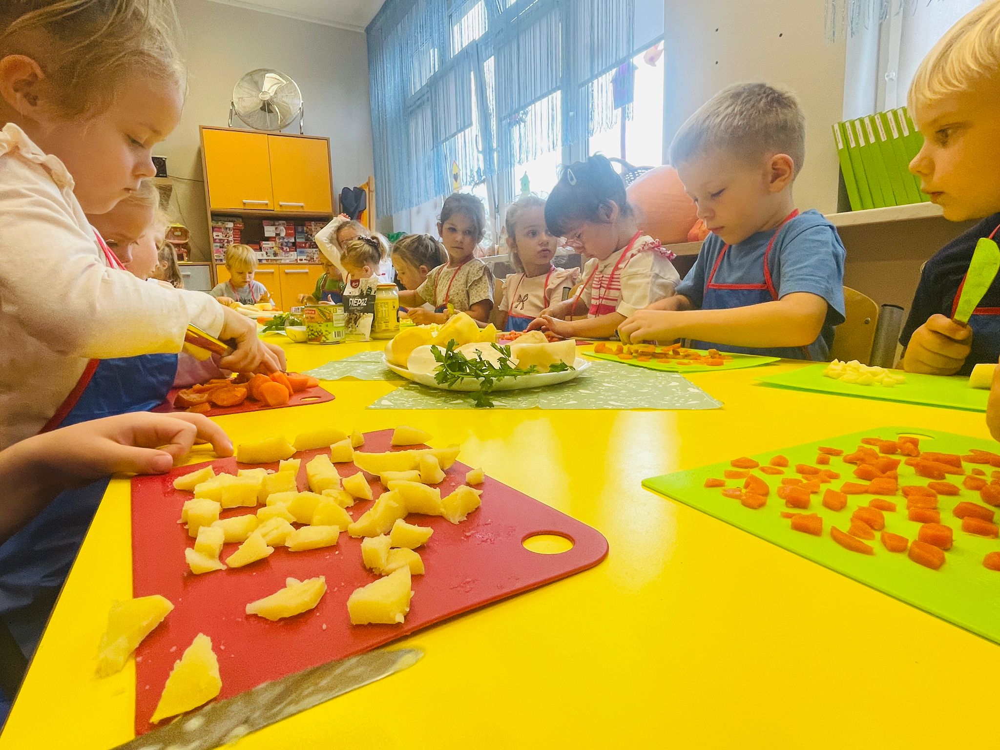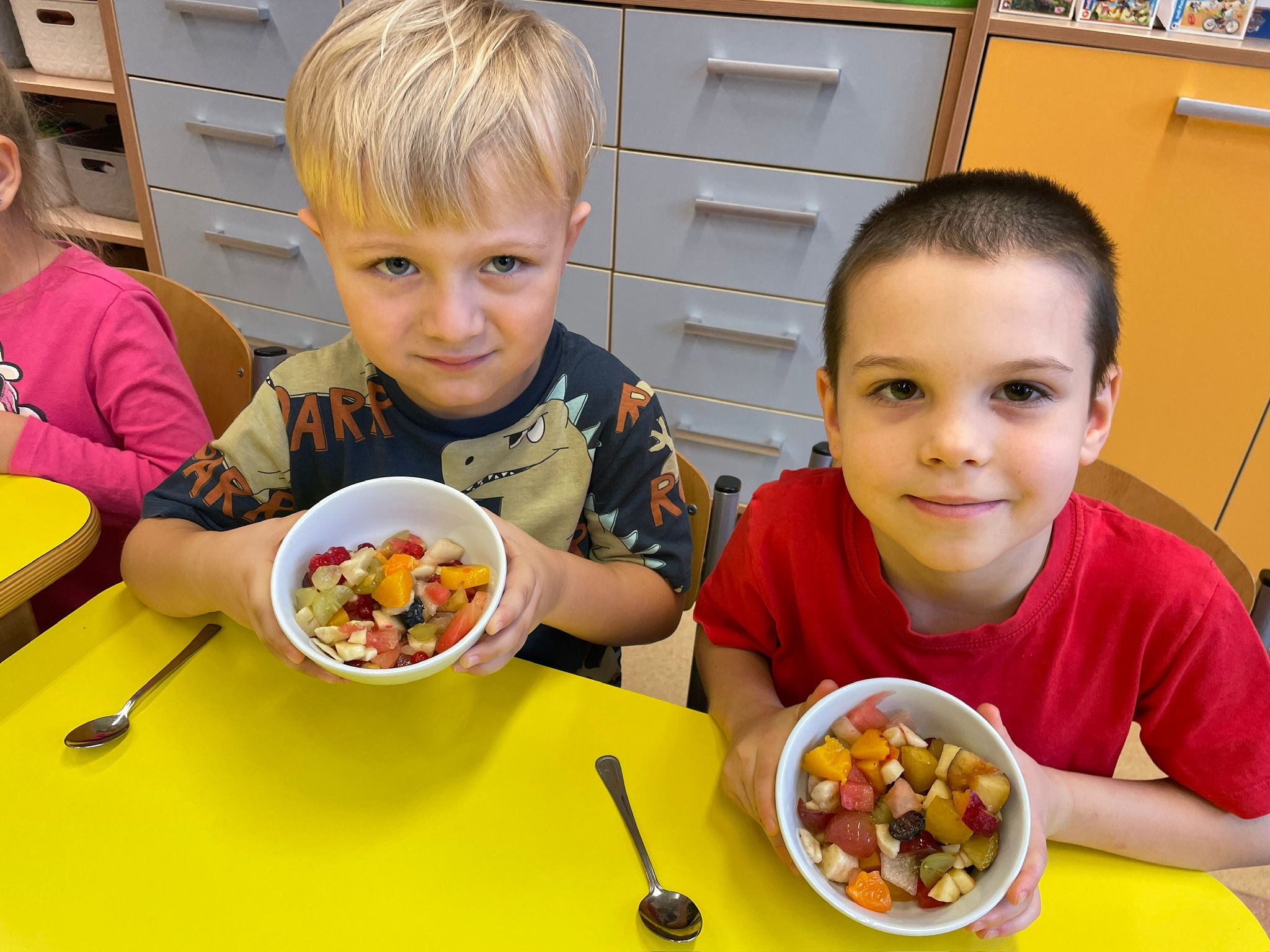 Jesień wielu kojarzy się z deszczową pogodą i szarugą. Ale w naszym przedszkolu udowodniliśmy już wiele razy, że ta pora roku potrafi być również niezwykle kolorowa. A co, jeśli kolory miałyby również smak i zapach? Realizując projekt edukacyjny „Smaki jesieni” , podczas jesiennych atrakcji kulinarnych w gr. XI przedszkolaki sprawdziły, że kolorowe warzywa i owoce, również te sezonowe, smakują i pachną wyśmienicie. Szczególnie jeśli się je ze sobą połączy. Wszyscy podkreślaliśmy walory zdrowotne owoców i warzyw. W ten oto sposób powstały zdrowe sałatki pełne pięknych barw, które przedszkolaki mogły samodzielnie spałaszować.