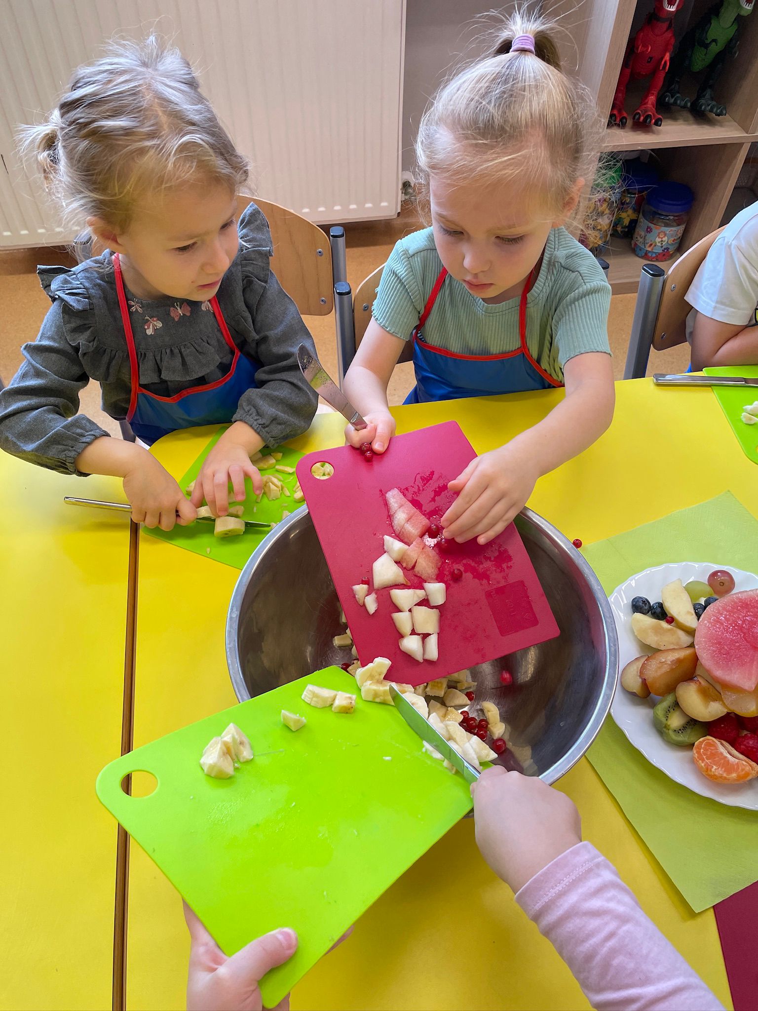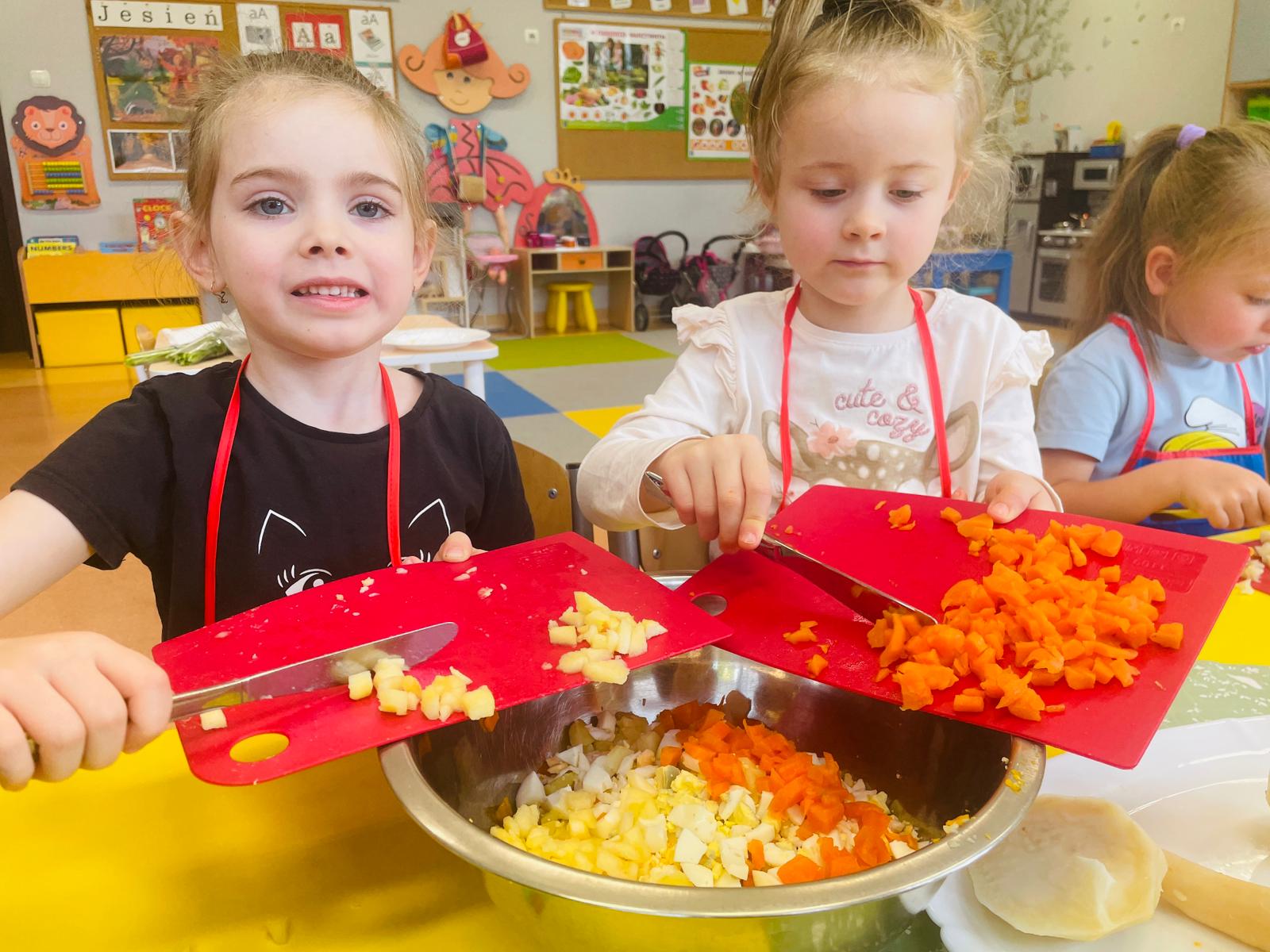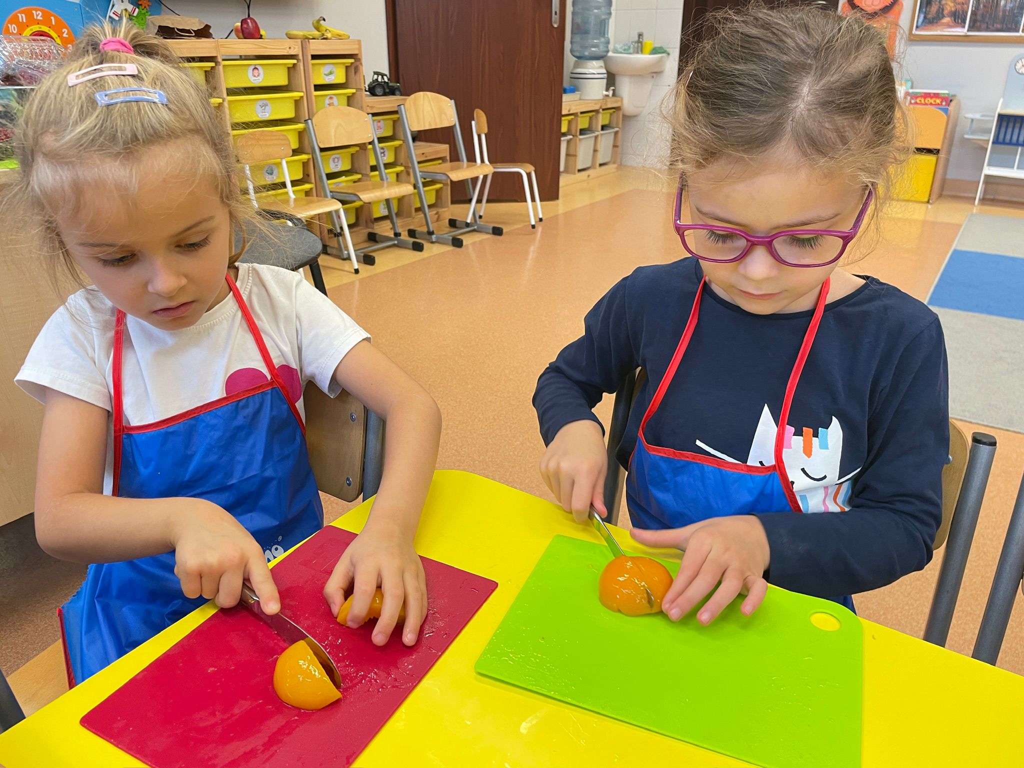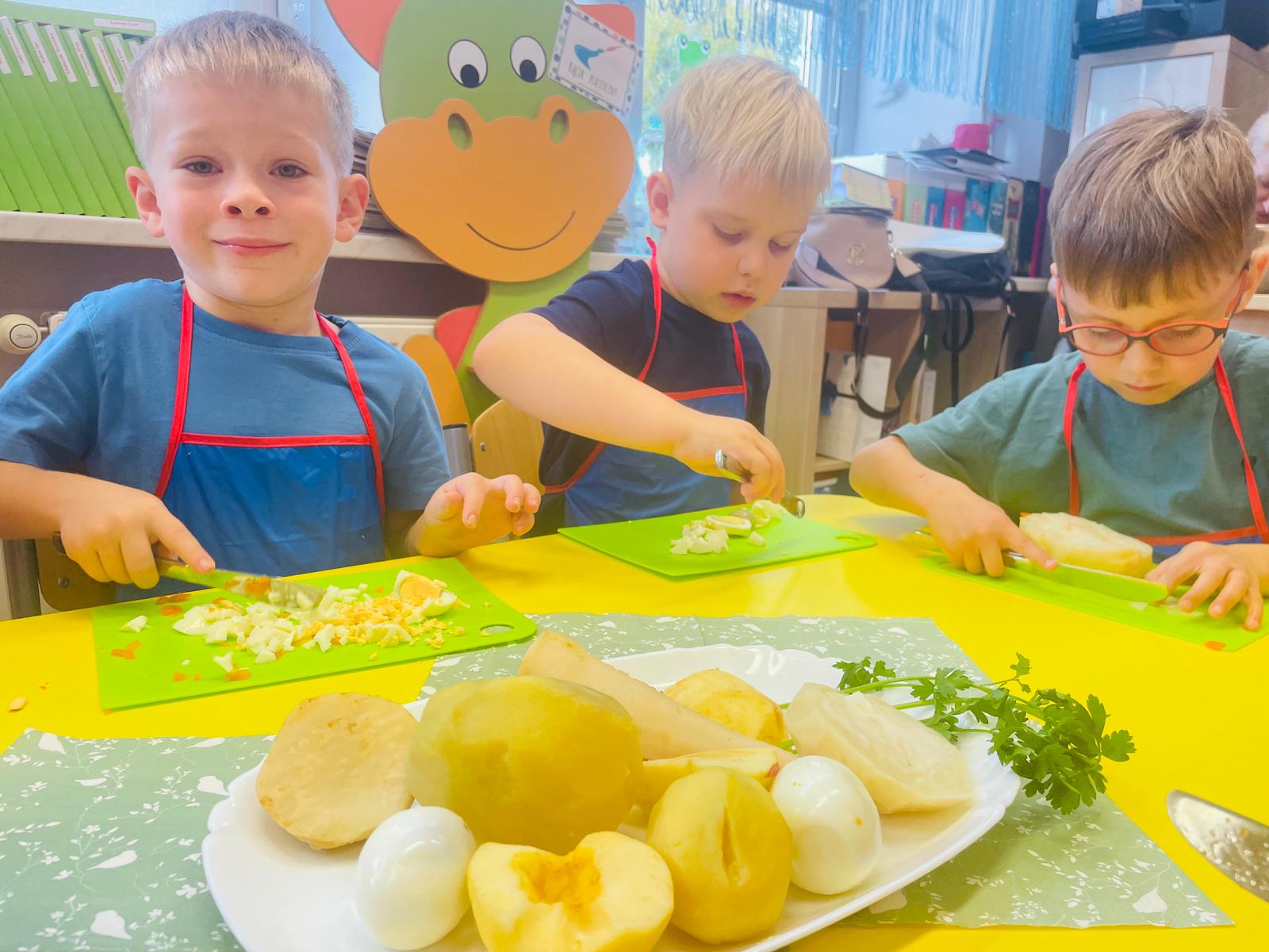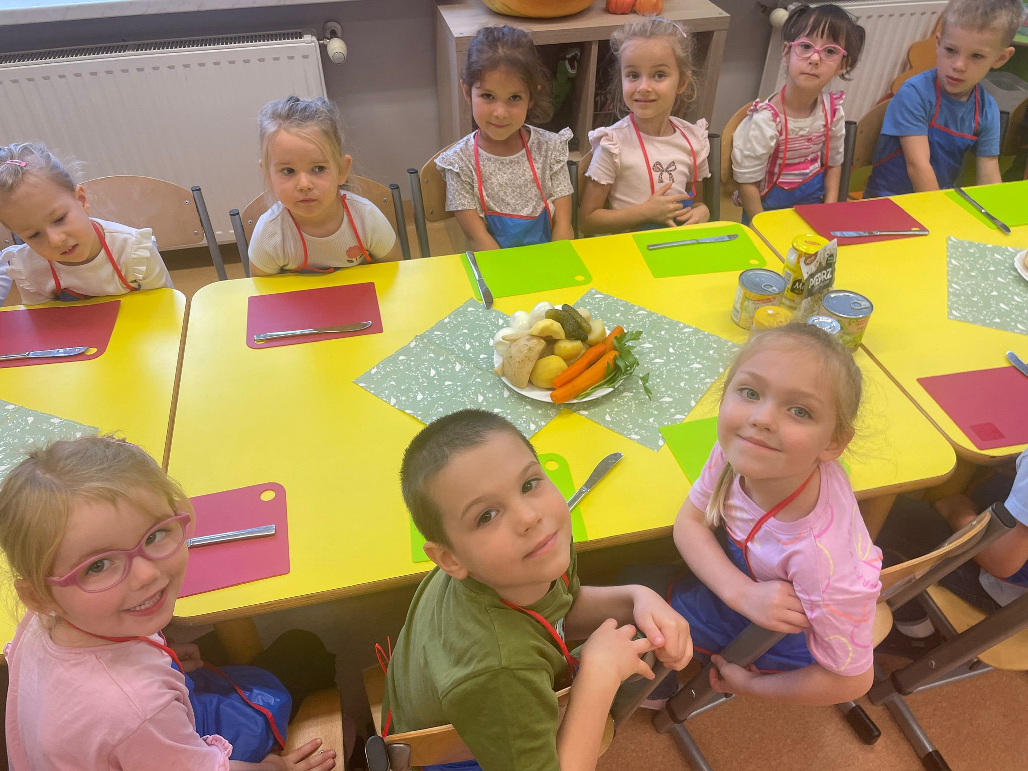 Jesień wielu kojarzy się z deszczową pogodą i szarugą. Ale w naszym przedszkolu udowodniliśmy już wiele razy, że ta pora roku potrafi być również niezwykle kolorowa. A co, jeśli kolory miałyby również smak i zapach? Realizując projekt edukacyjny „Smaki jesieni” , podczas jesiennych atrakcji kulinarnych w gr. XI przedszkolaki sprawdziły, że kolorowe warzywa i owoce, również te sezonowe, smakują i pachną wyśmienicie. Szczególnie jeśli się je ze sobą połączy. Wszyscy podkreślaliśmy walory zdrowotne owoców i warzyw. W ten oto sposób powstały zdrowe sałatki pełne pięknych barw, które przedszkolaki mogły samodzielnie spałaszować.