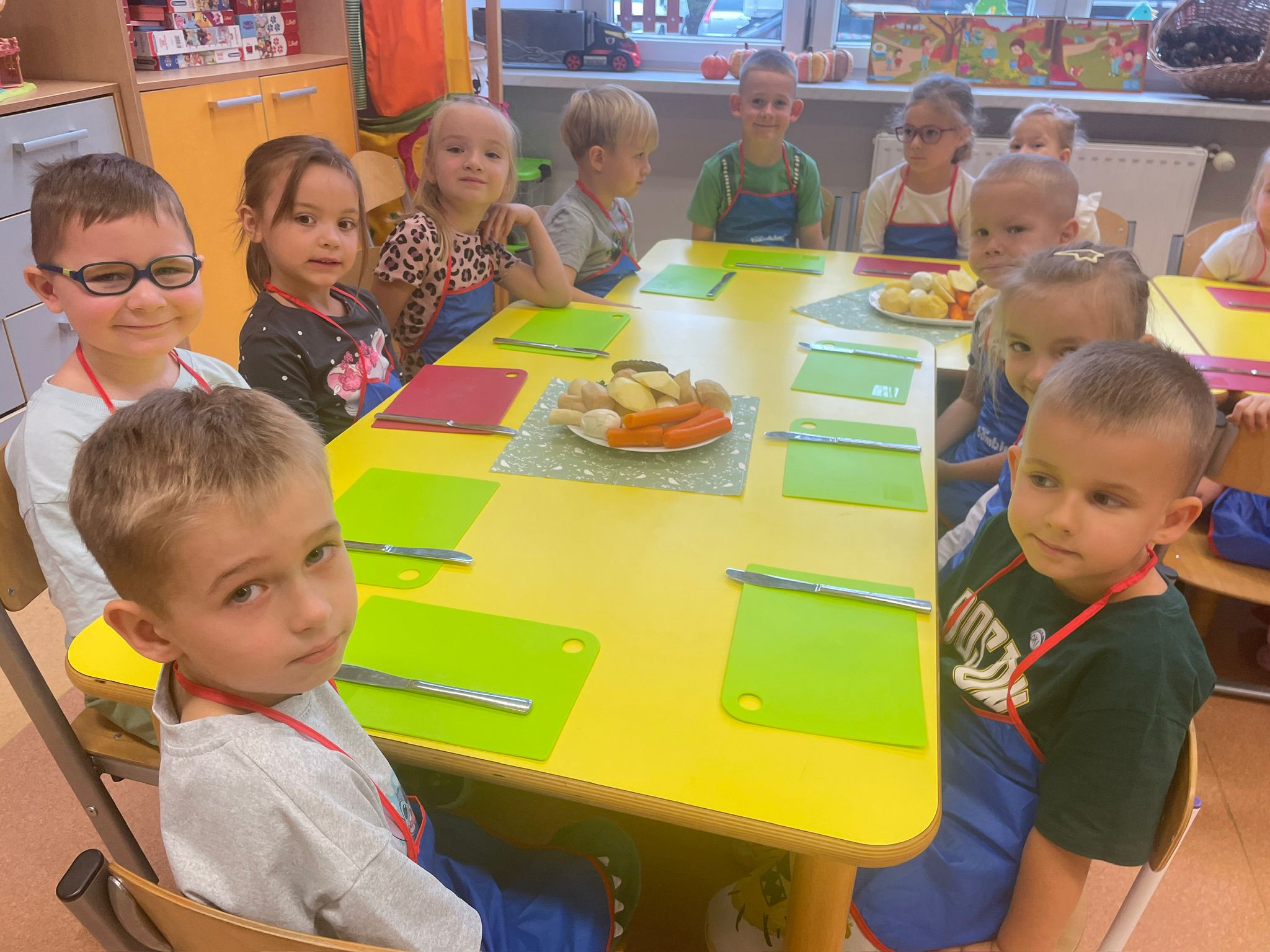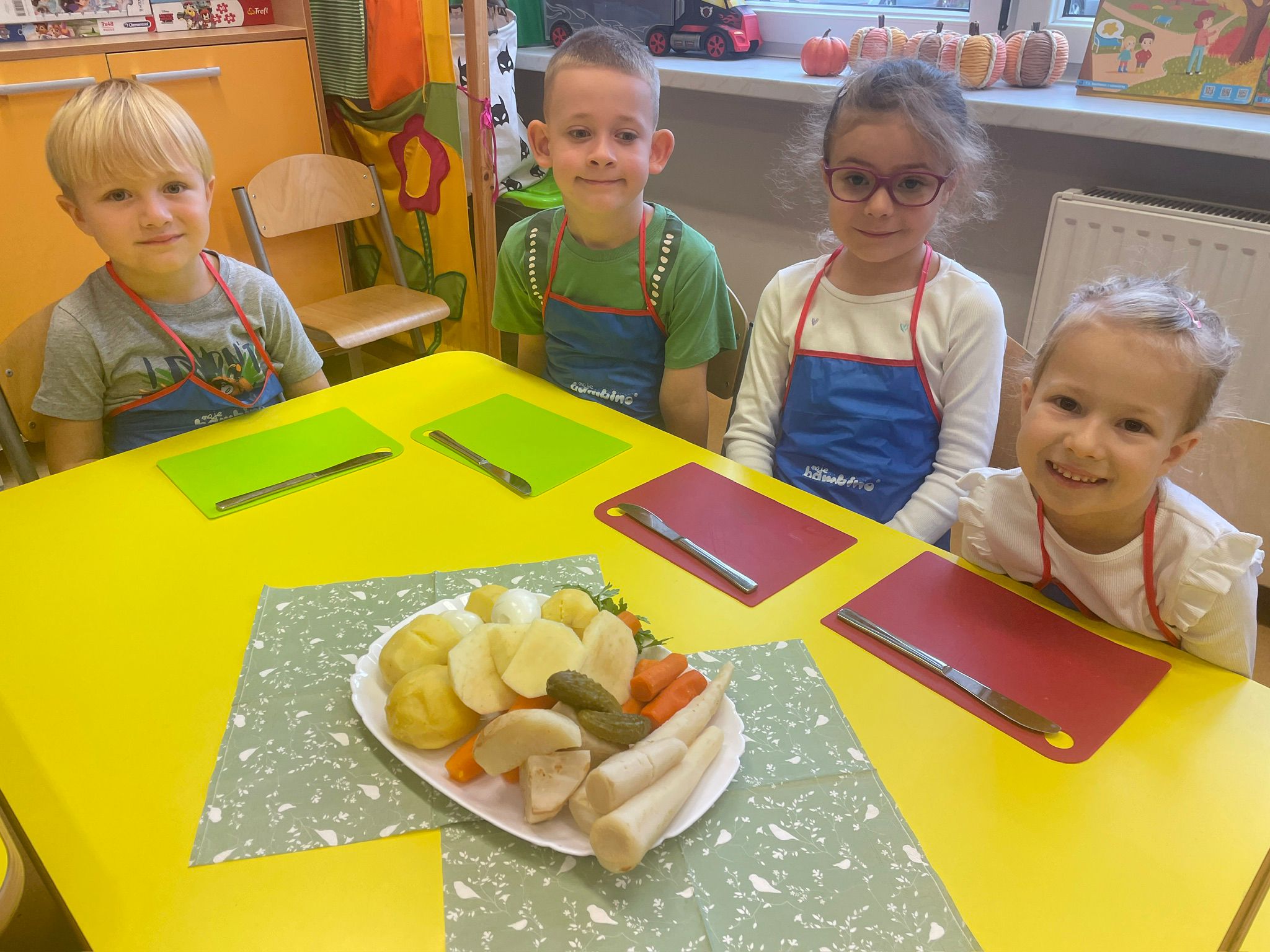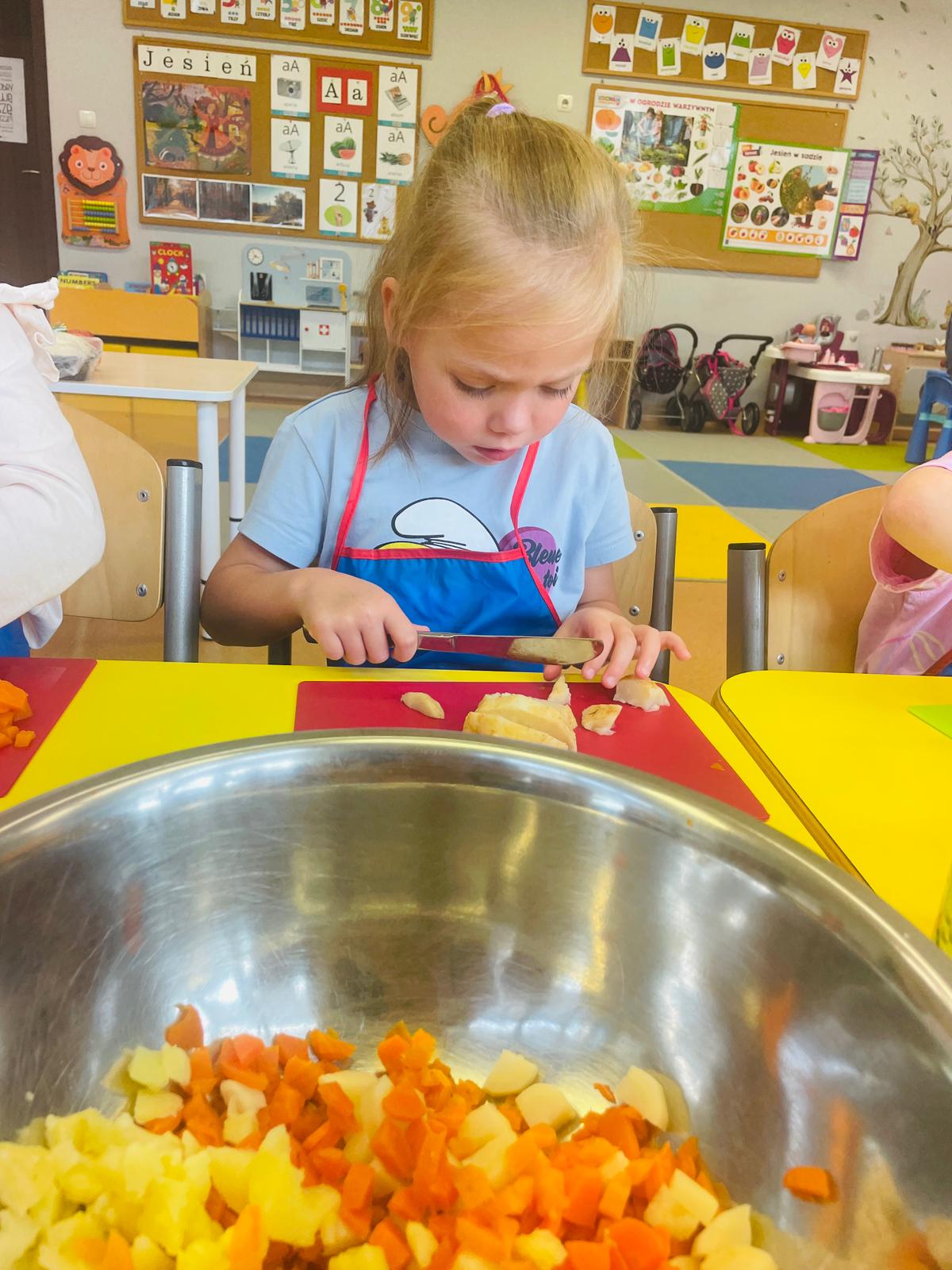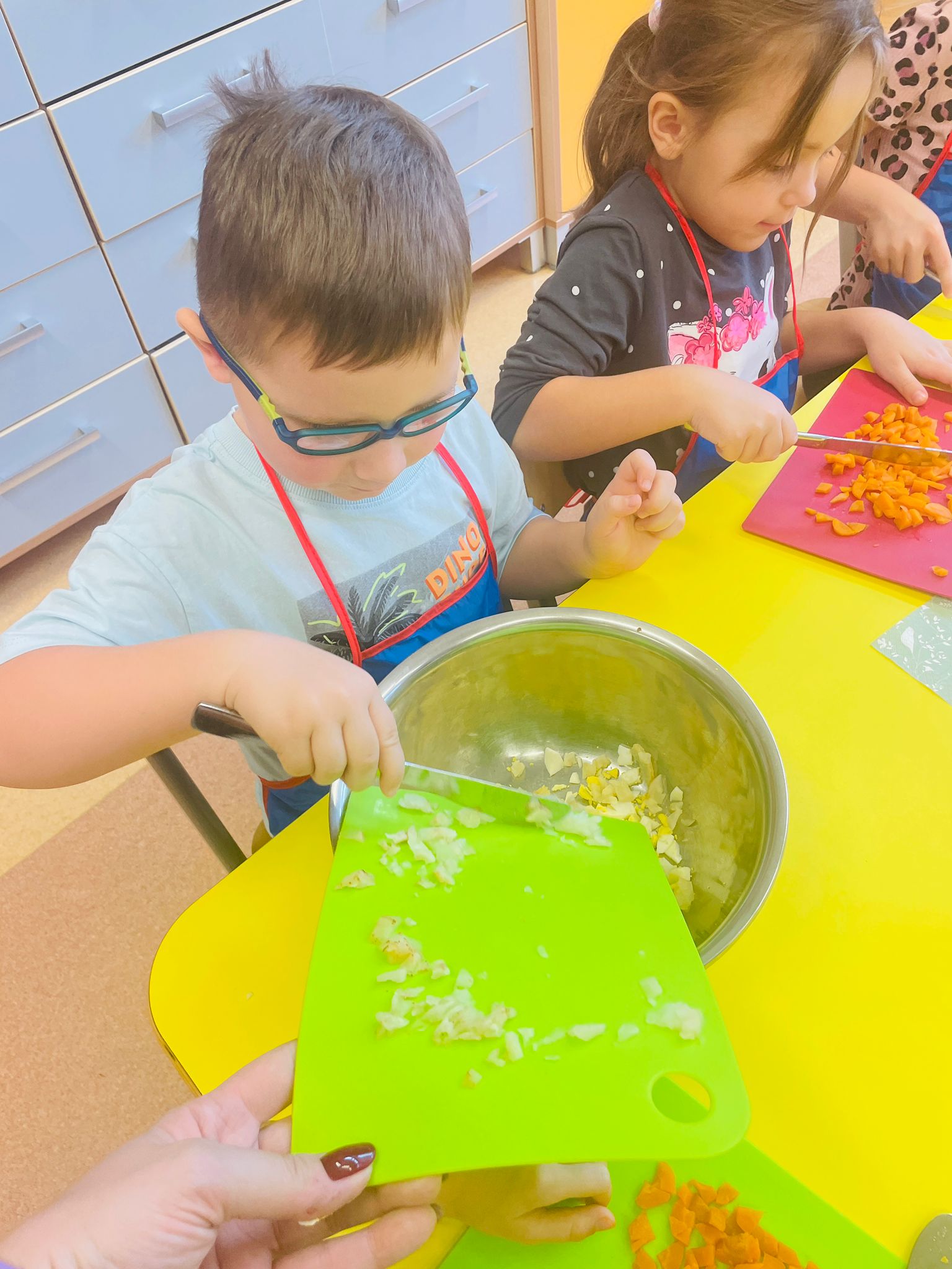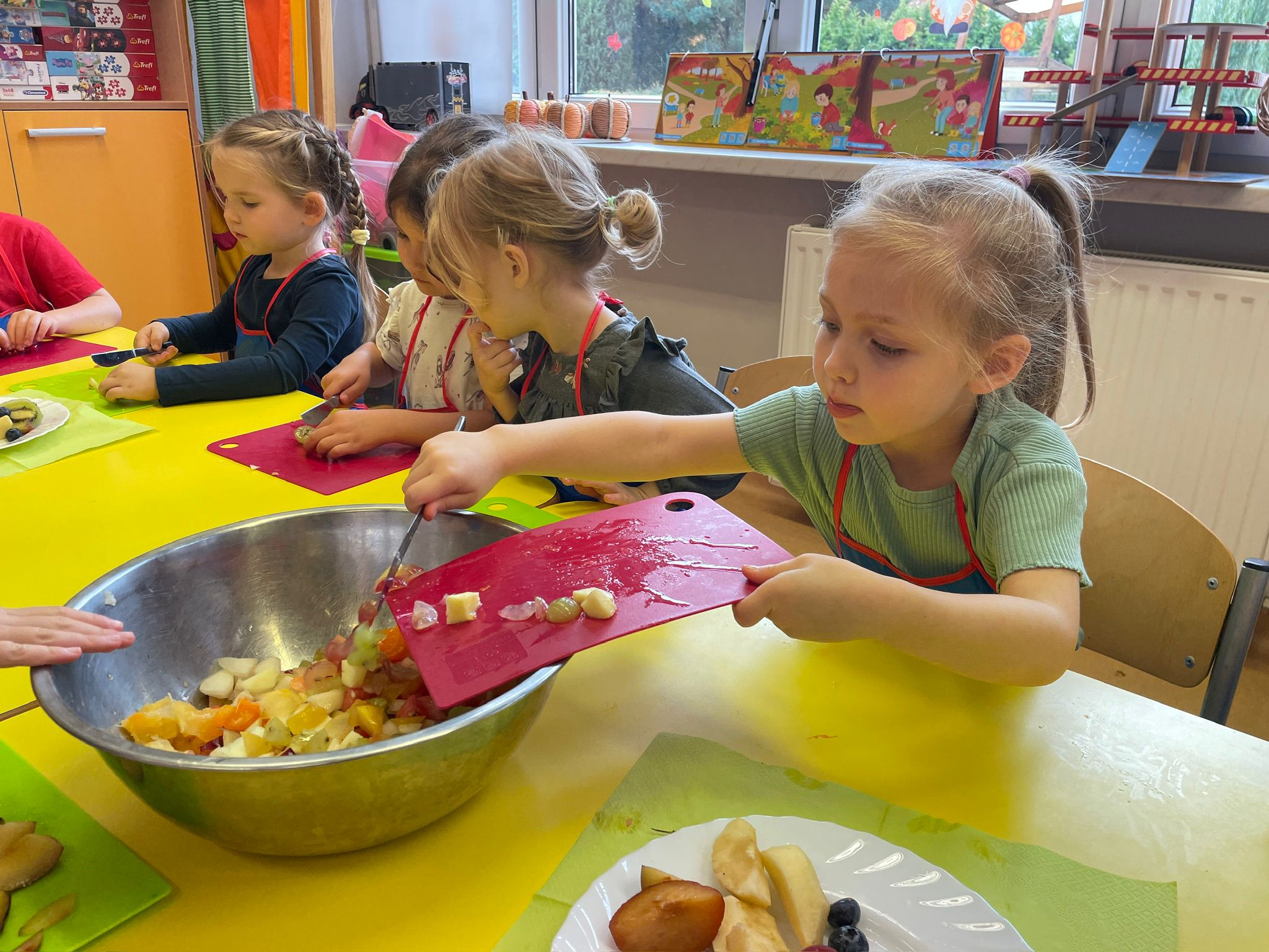 Jesień wielu kojarzy się z deszczową pogodą i szarugą. Ale w naszym przedszkolu udowodniliśmy już wiele razy, że ta pora roku potrafi być również niezwykle kolorowa. A co, jeśli kolory miałyby również smak i zapach? Realizując projekt edukacyjny „Smaki jesieni” , podczas jesiennych atrakcji kulinarnych w gr. XI przedszkolaki sprawdziły, że kolorowe warzywa i owoce, również te sezonowe, smakują i pachną wyśmienicie. Szczególnie jeśli się je ze sobą połączy. Wszyscy podkreślaliśmy walory zdrowotne owoców i warzyw. W ten oto sposób powstały zdrowe sałatki pełne pięknych barw, które przedszkolaki mogły samodzielnie spałaszować.
