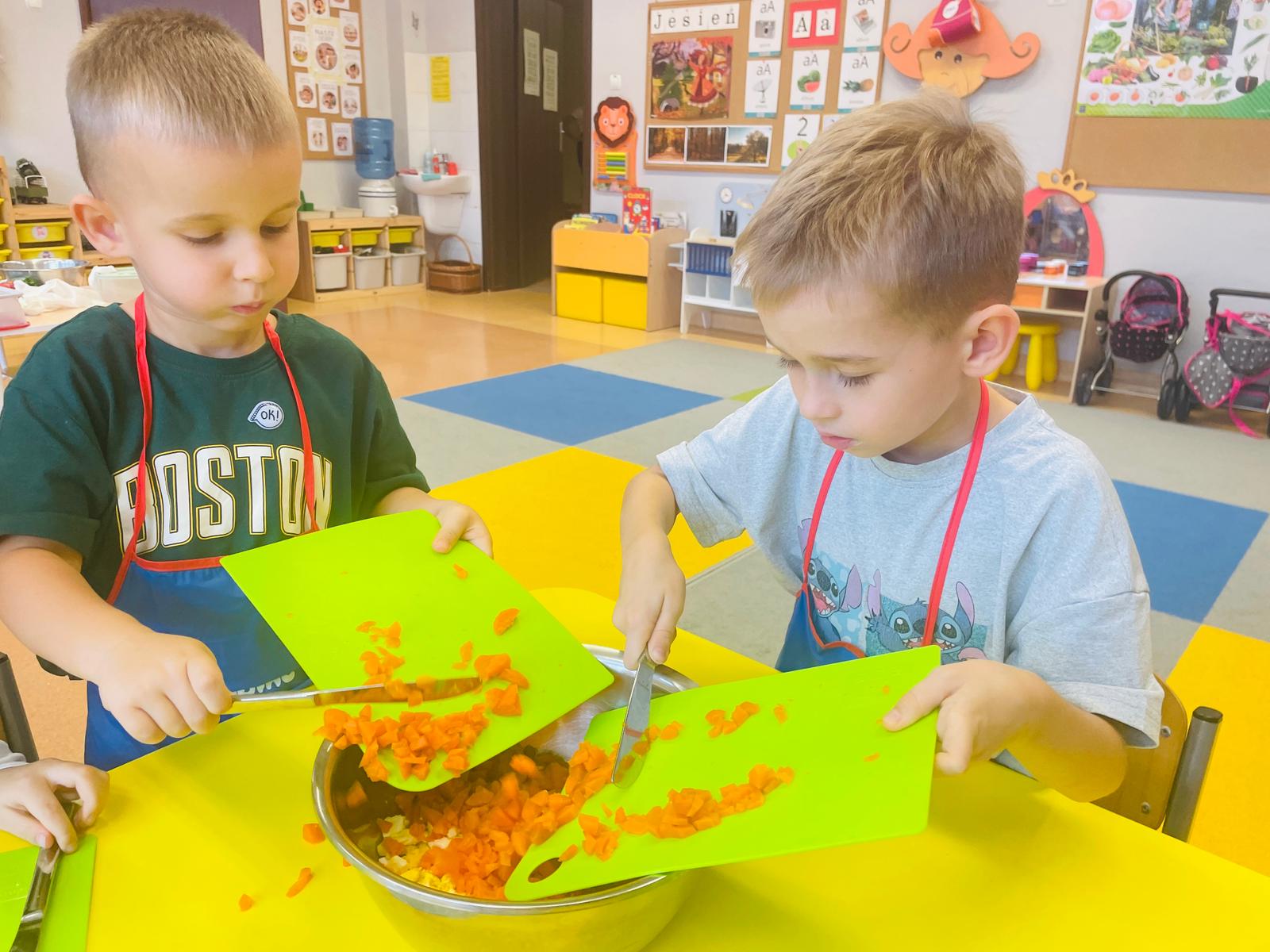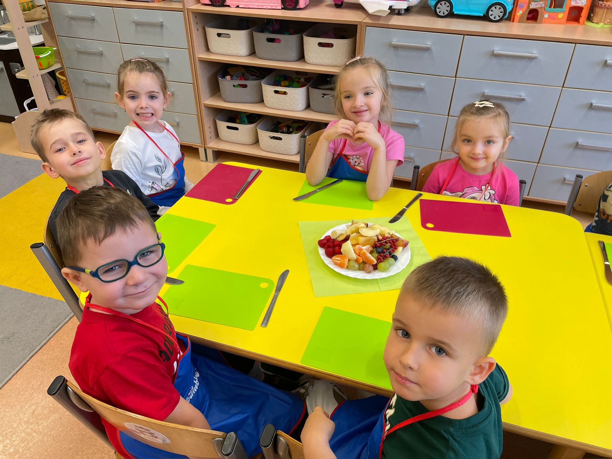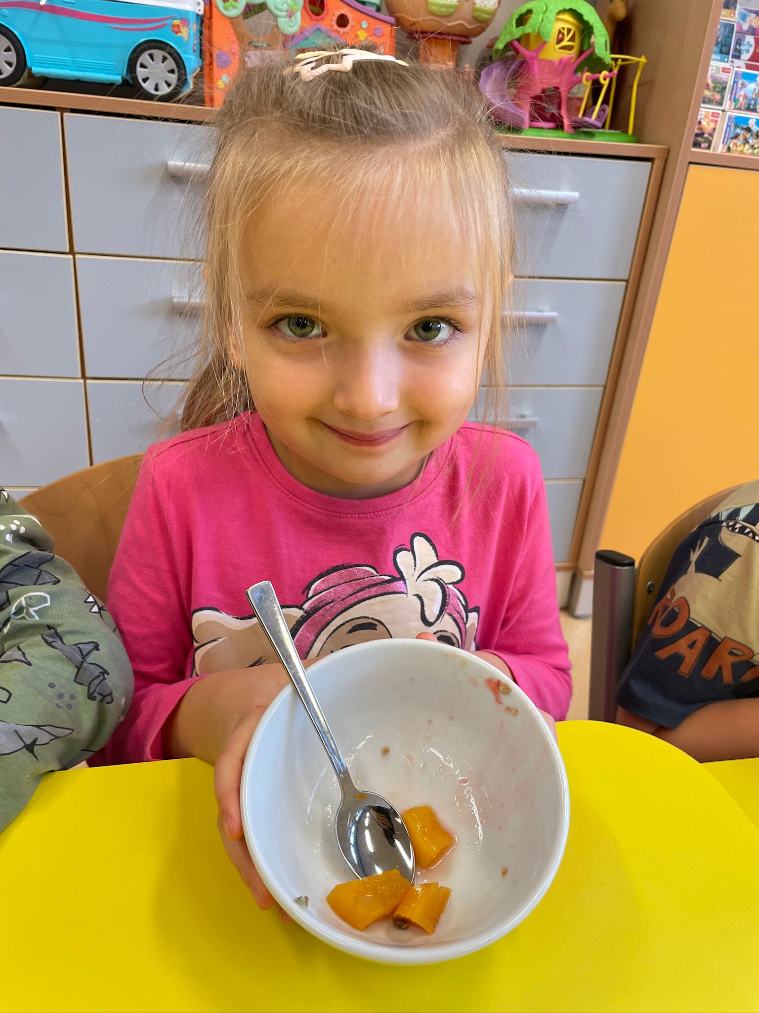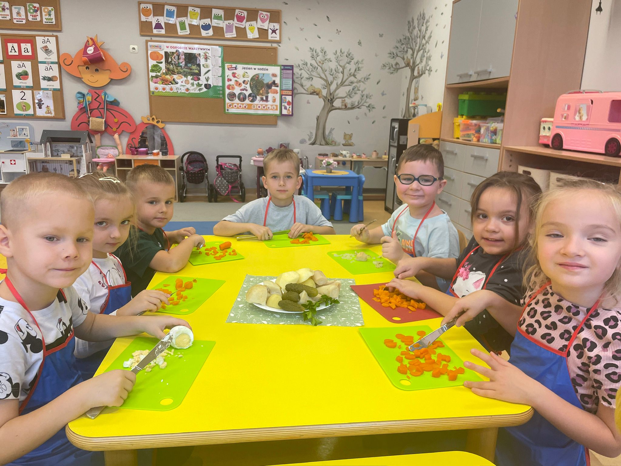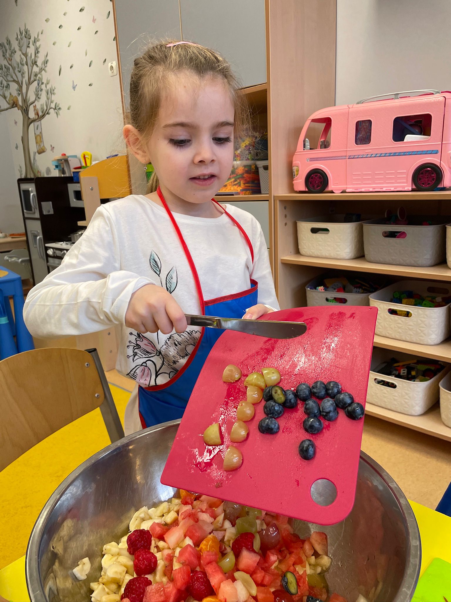 Jesień wielu kojarzy się z deszczową pogodą i szarugą. Ale w naszym przedszkolu udowodniliśmy już wiele razy, że ta pora roku potrafi być również niezwykle kolorowa. A co, jeśli kolory miałyby również smak i zapach? Realizując projekt edukacyjny „Smaki jesieni” , podczas jesiennych atrakcji kulinarnych w gr. XI przedszkolaki sprawdziły, że kolorowe warzywa i owoce, również te sezonowe, smakują i pachną wyśmienicie. Szczególnie jeśli się je ze sobą połączy. Wszyscy podkreślaliśmy walory zdrowotne owoców i warzyw. W ten oto sposób powstały zdrowe sałatki pełne pięknych barw, które przedszkolaki mogły samodzielnie spałaszować.